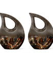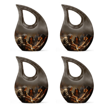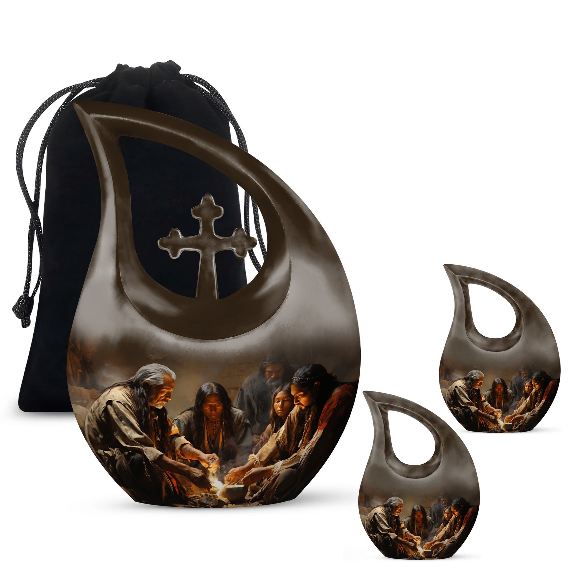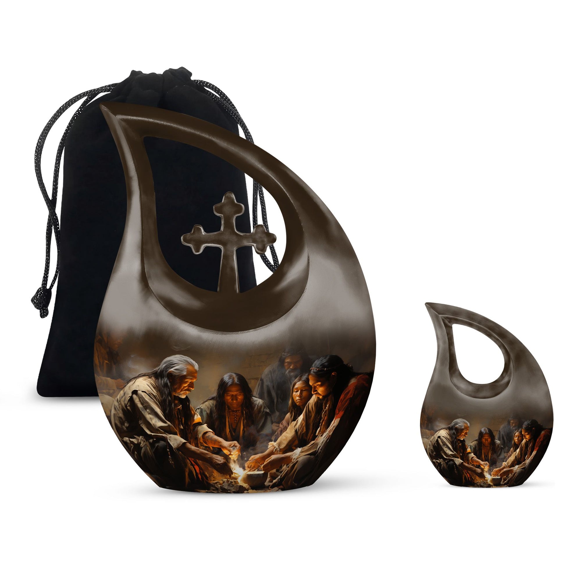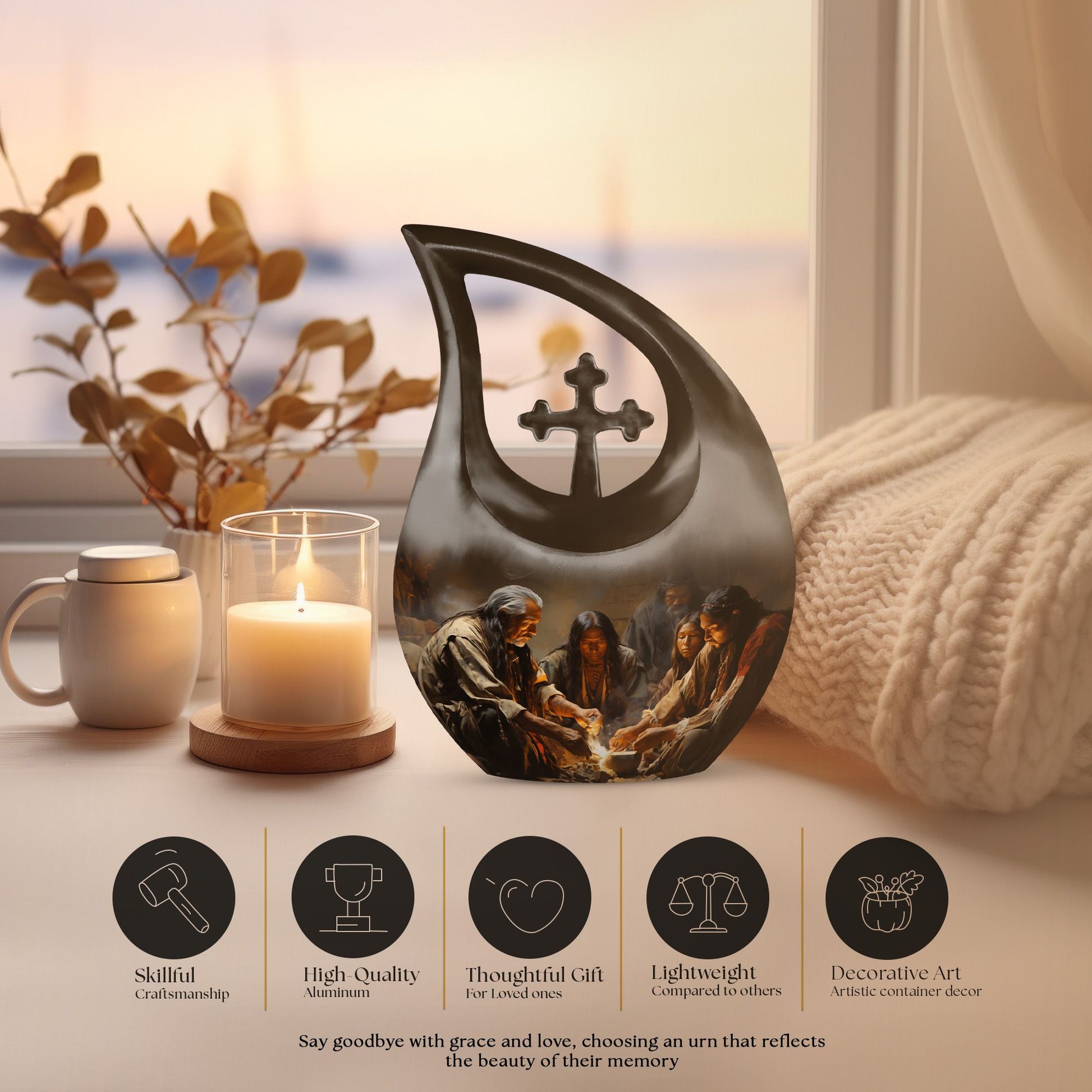 Crafted from durable aluminum, this urn features an intricate family-inspired Native American motif symbolizing strength, legacy, and togetherness. Its secure screw-top lid ensures long-term protection, making it ideal for those needing adult urns for women, funeral urns for men, or an urn for human ashes adult men. The artistic detailing creates a warm and reverent look, suitable for display or remembrance ceremonies. Families who prefer smaller memorials can pair this design with small urns for women human ashes or companion keepsakes.