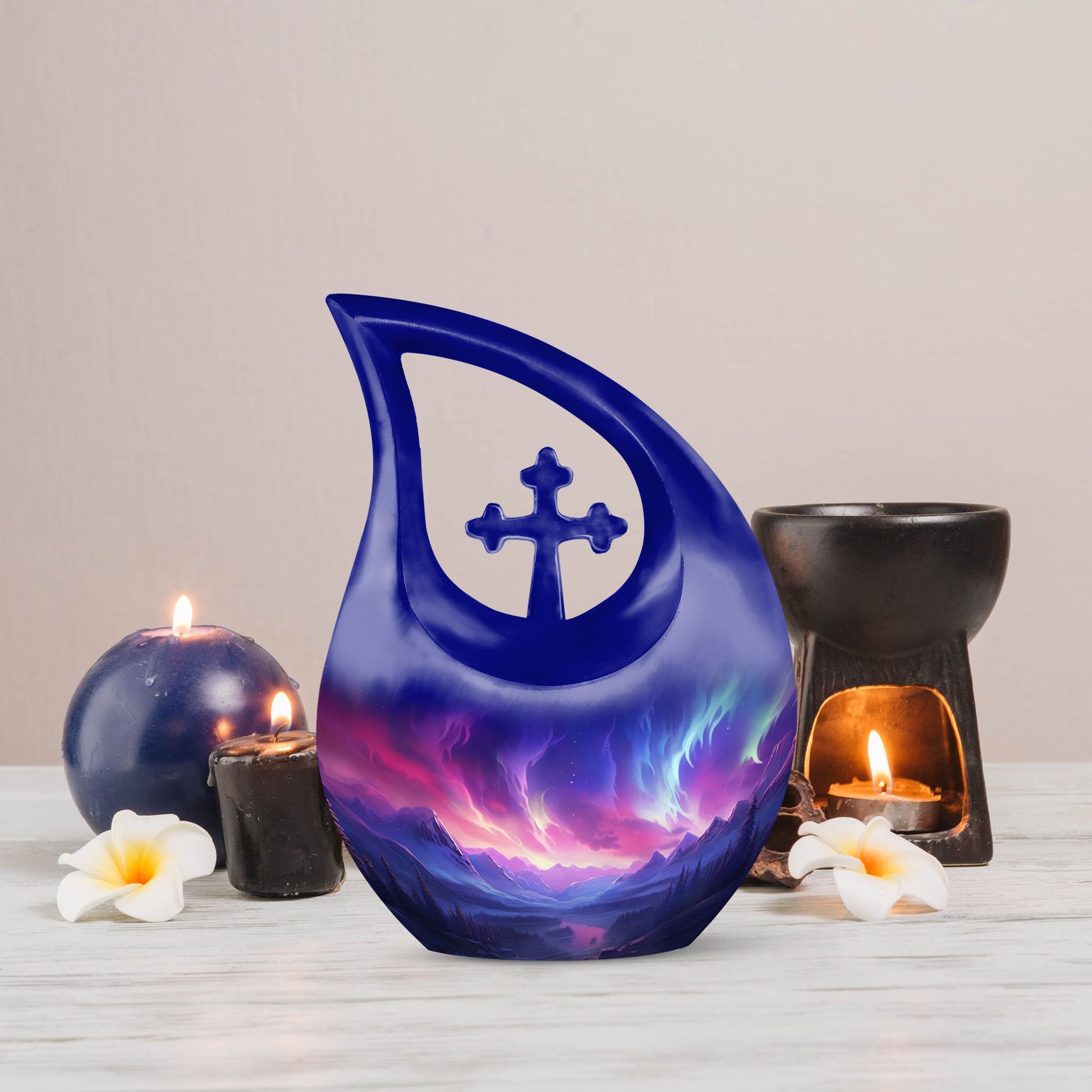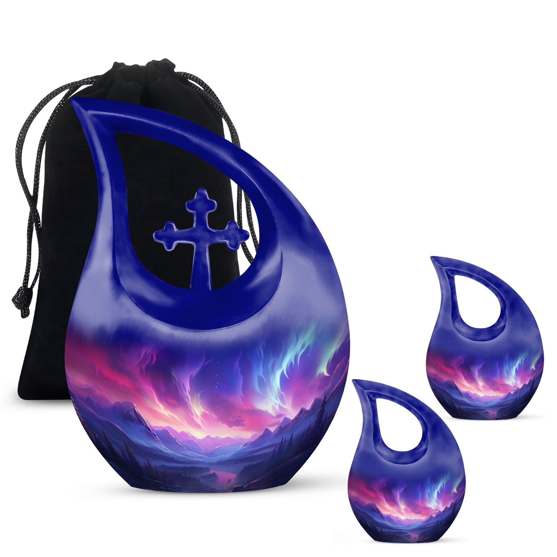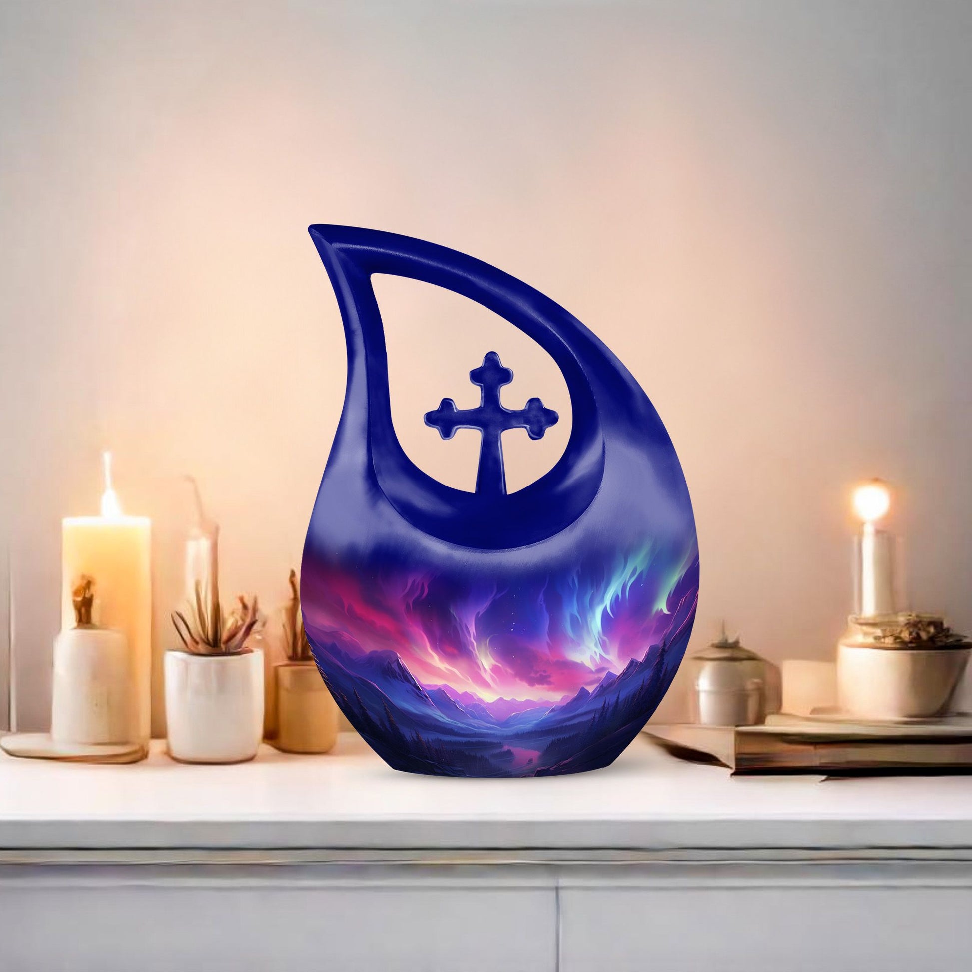 The Aurora Northern Lights Elegant Cross Drop Design Large Memorial Urn is a heartfelt tribute to a life cherished and remembered. Designed for families seeking urns for adult female mom or urns for human ashes adult female small size, this memorial piece reflects peace, faith, and eternal love. Its radiant design captures the ethereal beauty of the northern lights, symbolizing hope and everlasting connection beyond the stars.