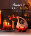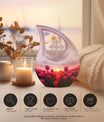 Celebrate the light of dawn and the whisper of eternal love with the Dawn's Crimson Kiss Urn, a beautiful memorial keepsake cherished not only for its aesthetic appeal but for its meaningful symbolism. Crafted from durable aluminium, this substantial 10-inch urn, with a weight of 3.3 pounds, is designed to inspire faith and peace with its exquisite 'Cross Drop' theme. Large in size and boasting a capacity of 200 cubic inches, this urn offers an ample space for preserving the ashes of your dearly departed. Additional allure comes with the ability to personalize the urn with engraved names, making each piece truly one-of-a-kind. The urn comes complete with a velvet pouch, exuding an extra touch of elegance and care in the containment of ashes. Ideal for adults and seniors looking for 'Biodegradable Cremation Urns', 'Cremation Urns For Two', or an 'Extra Large Urns For Two', this product aptly caters to a variety of memorial needs. Reflect the undying glow of your love and respect with the Dawn's Crimson Kiss Urn.