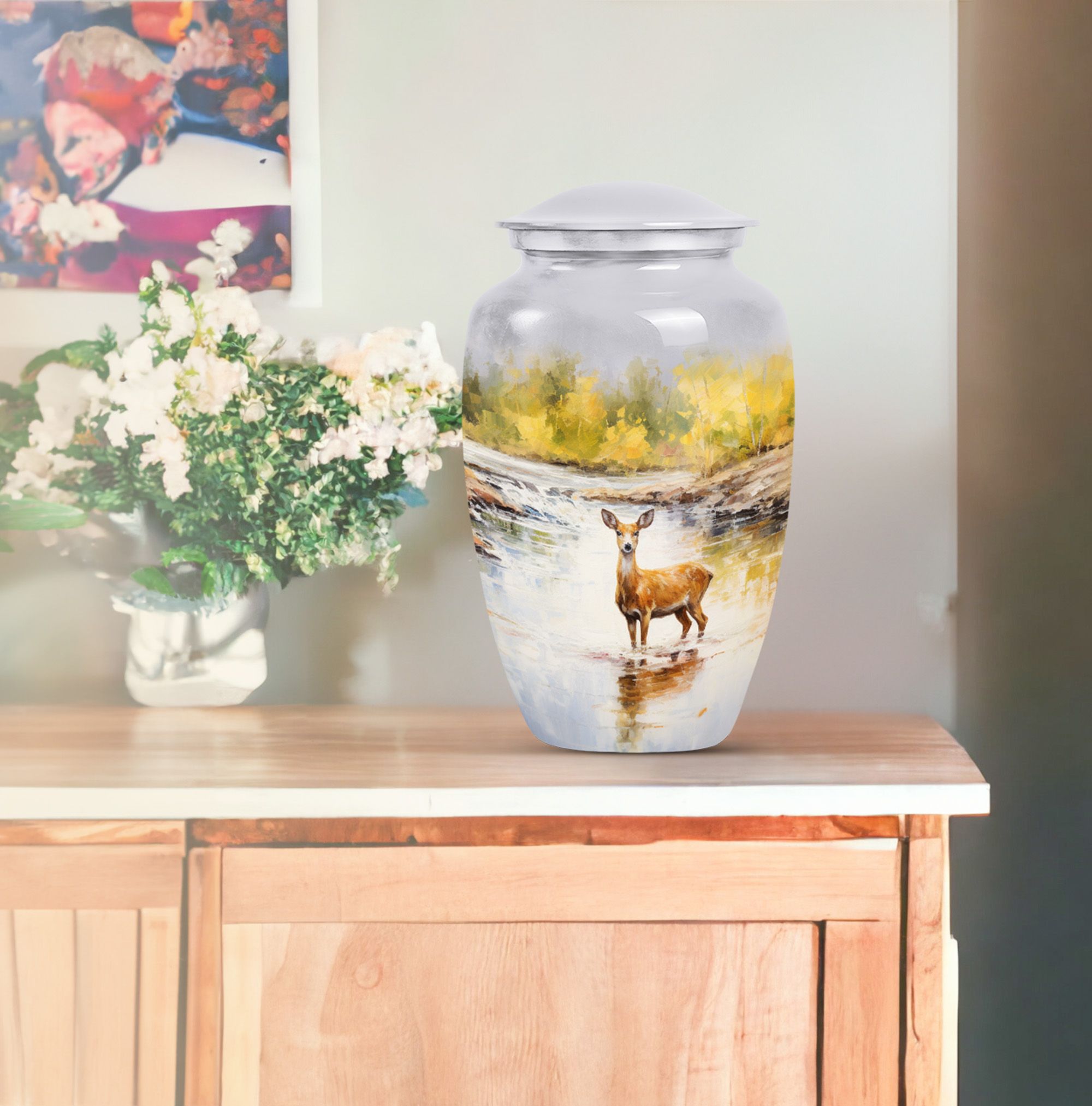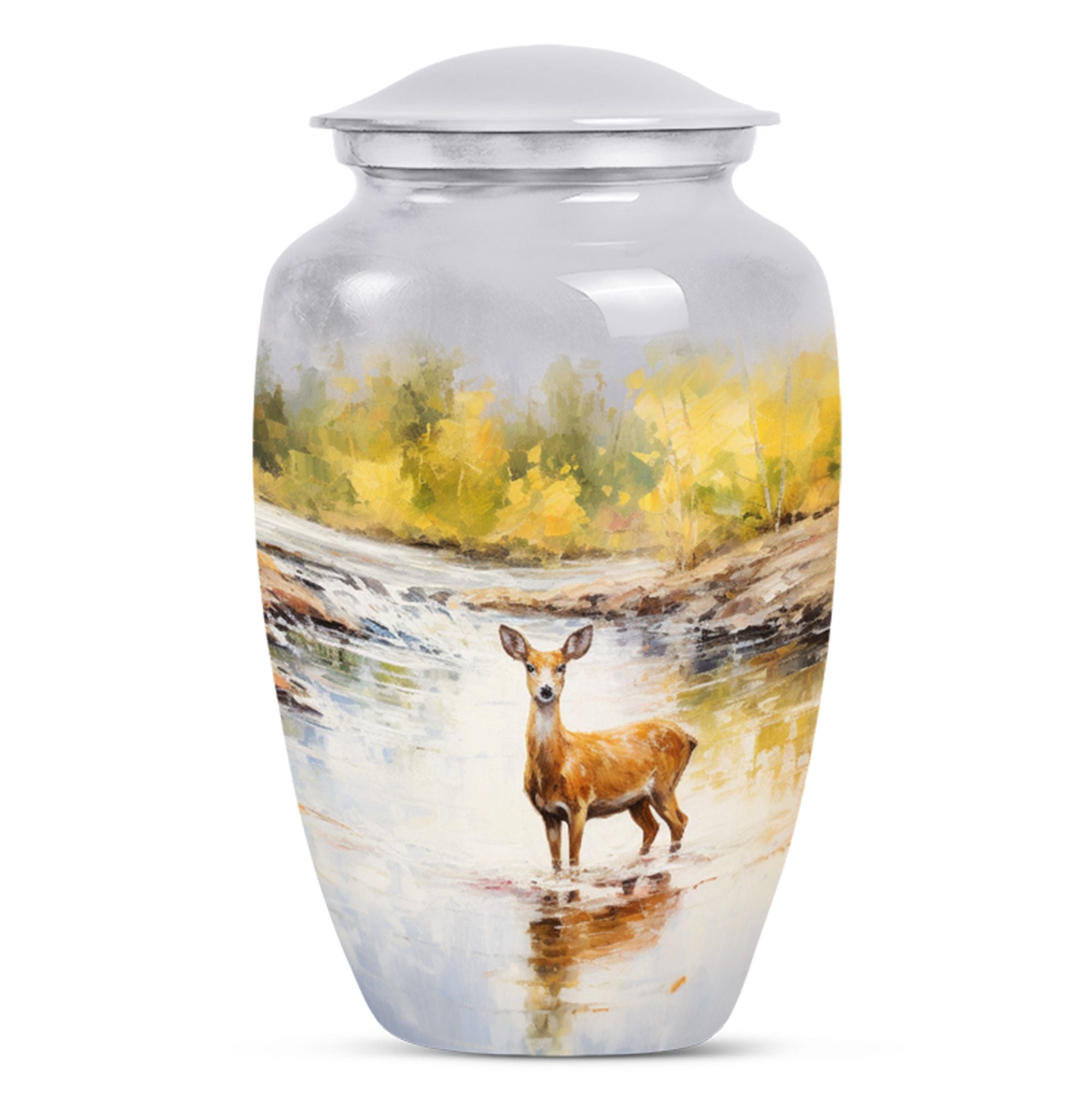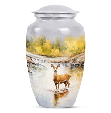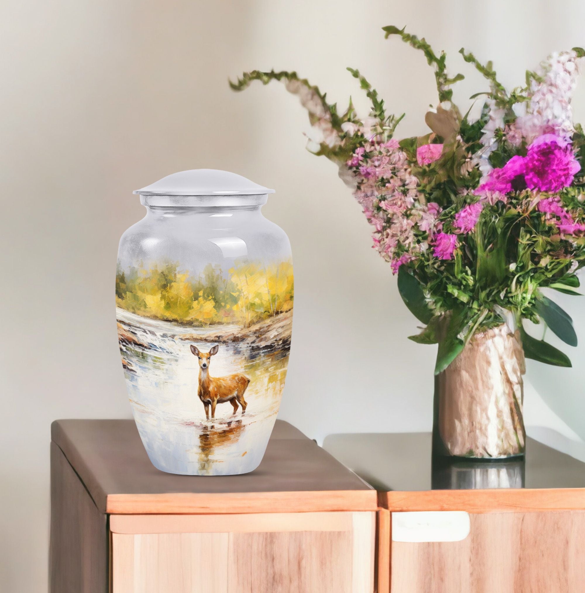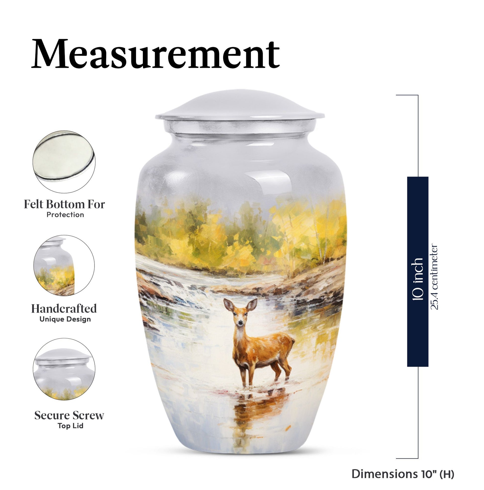 A tribute to life beautifully lived and cherished memories, our elegantly crafted 10-inch Deer Urn is a profound symbol of everlasting respect for your loved ones. With a size of 10 inches and a capacity of 200 cubic inches, this substantial and durable funeral urn for ashes for women and adult males is not just a memorial urn but a special place for their final rest. The urn, fashioned from premium aluminium, weighs a solid 3.3 pounds, ensuring stability and longevity. A sublime harmonization of aesthetics and practicality, it serves as a heart-touching commemoration of the soul's journey. Included in the package is a velvet pouch for gentle and respectful containment of the ashes. As every life story is unique, personalize this urn with engraved names, making it an authentic, sentimental keepsake. Crafted in memorial of your dear ones, this urn acknowledges the importance of individuality just as much as it respects the universality of loss. Surpassing the ordinary, this timeless large urn themed with a classic gramophone will perpetually resonate with the symphony of love and life, creating a meaningful narrative for future generations. While commonly utilized for mom or an adult male, its design and essence make it suitable to honor any significant individual in your life. A beacon of peace, rememberance and hope, let this urn be a dignified testament of a life well-celebrated.