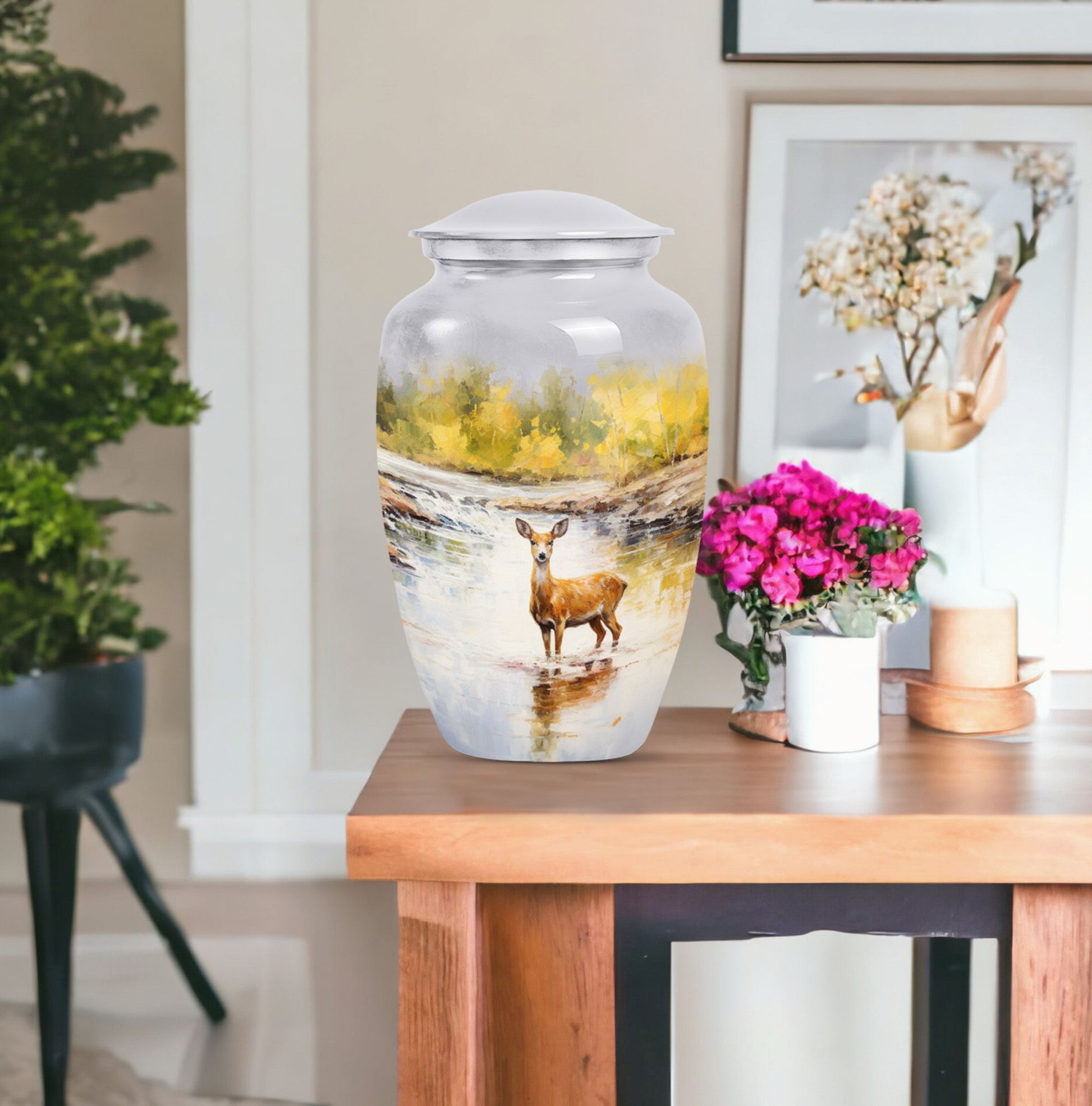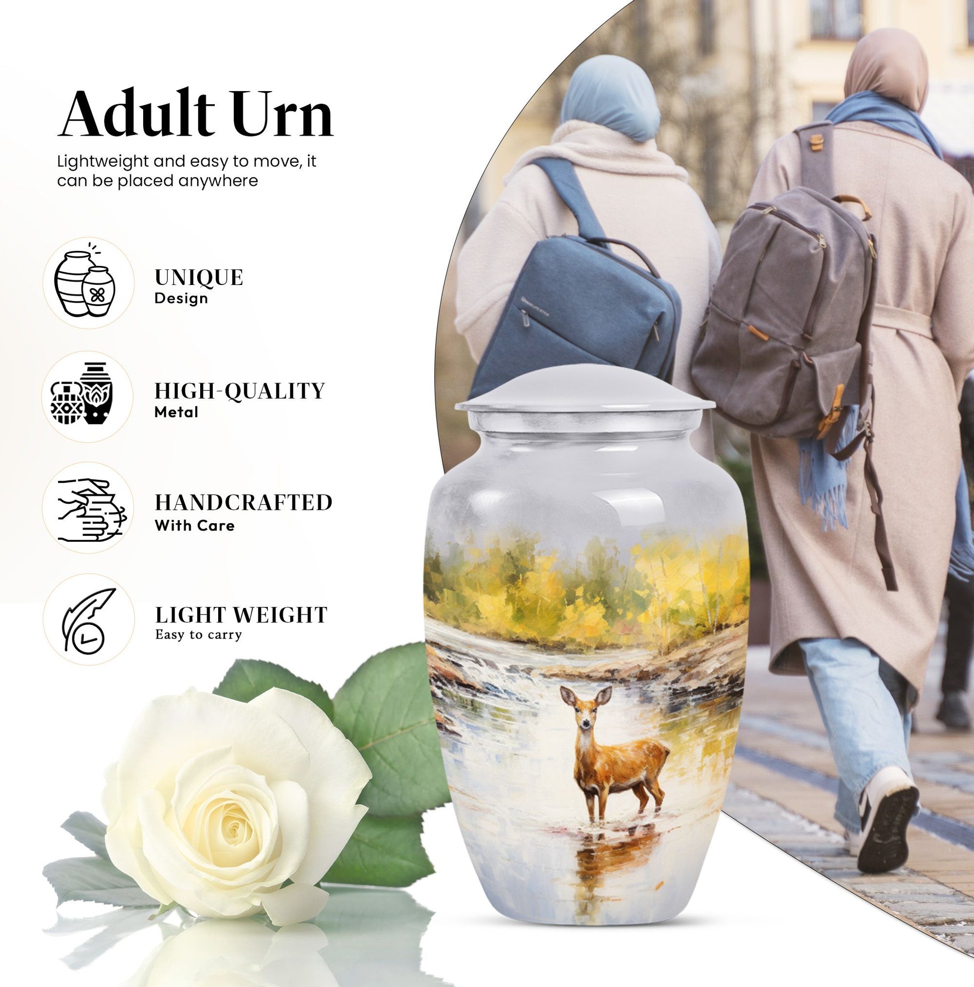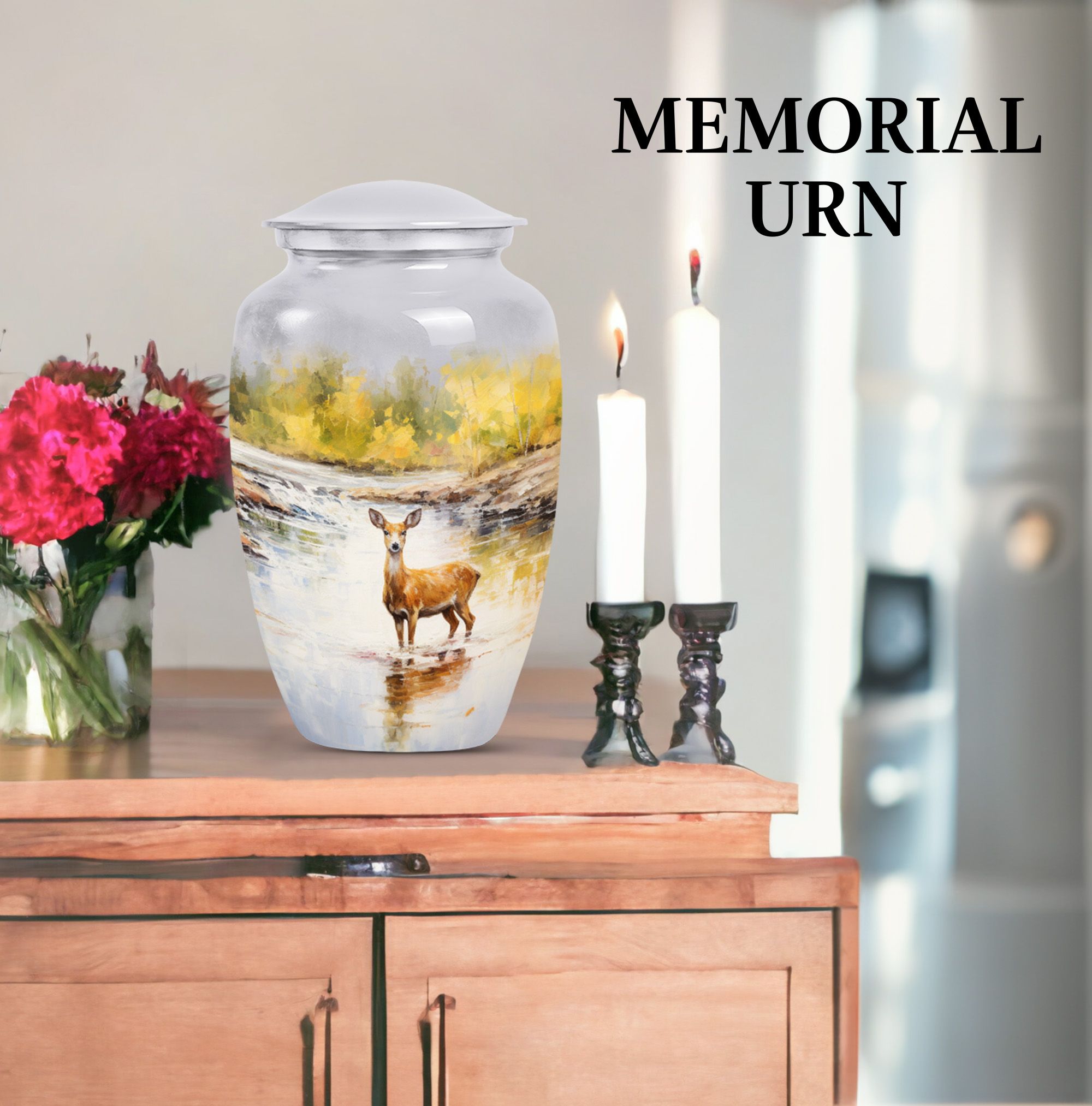A tribute to life beautifully lived and cherished memories, our elegantly crafted 10-inch Deer Urn is a profound symbol of everlasting respect for your loved ones. With a size of 10 inches and a capacity of 200 cubic inches, this substantial and durable funeral urn for ashes for women and adult males is not just a memorial urn but a special place for their final rest. The urn, fashioned from premium aluminium, weighs a solid 3.3 pounds, ensuring stability and longevity. A sublime harmonization of aesthetics and practicality, it serves as a heart-touching commemoration of the soul's journey. Included in the package is a velvet pouch for gentle and respectful containment of the ashes. As every life story is unique, personalize this urn with engraved names, making it an authentic, sentimental keepsake. Crafted in memorial of your dear ones, this urn acknowledges the importance of individuality just as much as it respects the universality of loss. Surpassing the ordinary, this timeless large urn themed with a classic gramophone will perpetually resonate with the symphony of love and life, creating a meaningful narrative for future generations. While commonly utilized for mom or an adult male, its design and essence make it suitable to honor any significant individual in your life. A beacon of peace, rememberance and hope, let this urn be a dignified testament of a life well-celebrated.