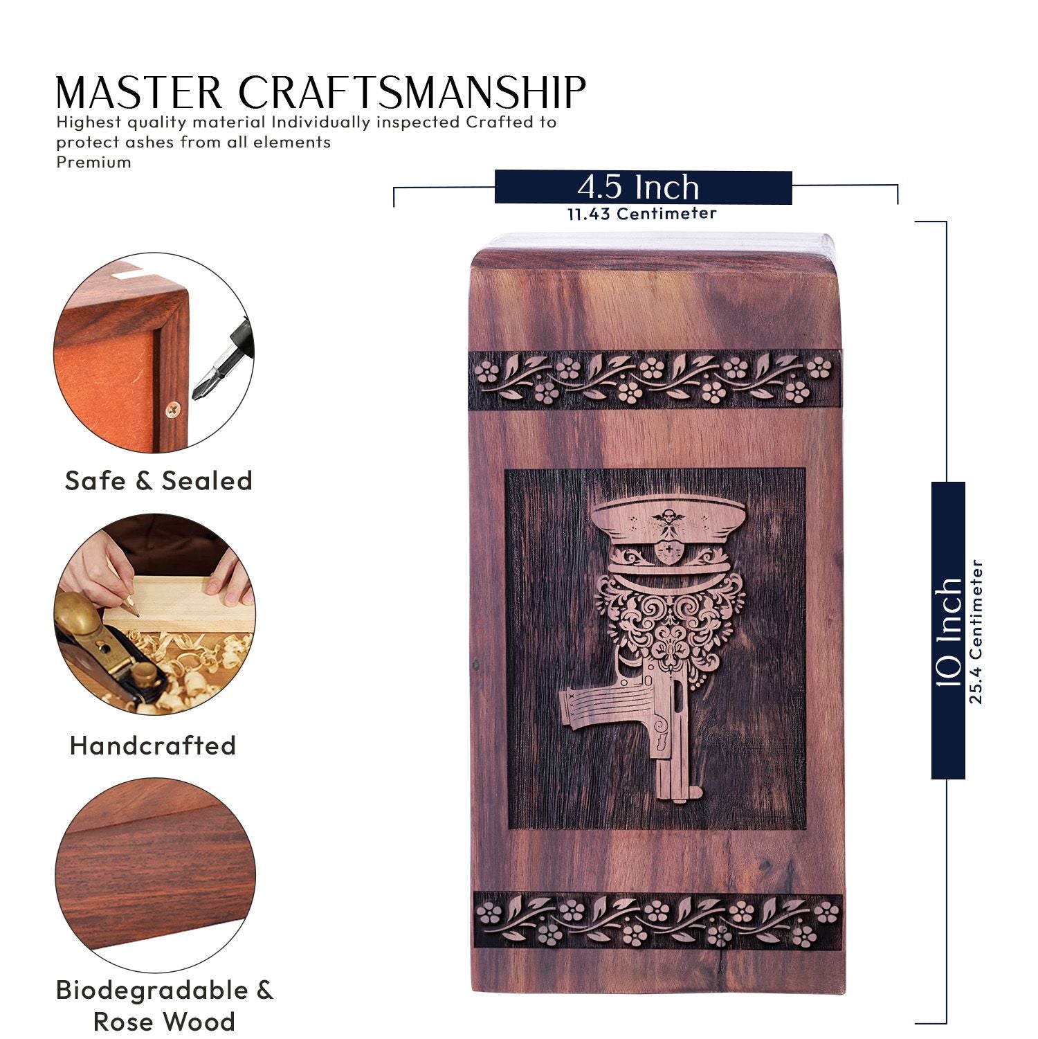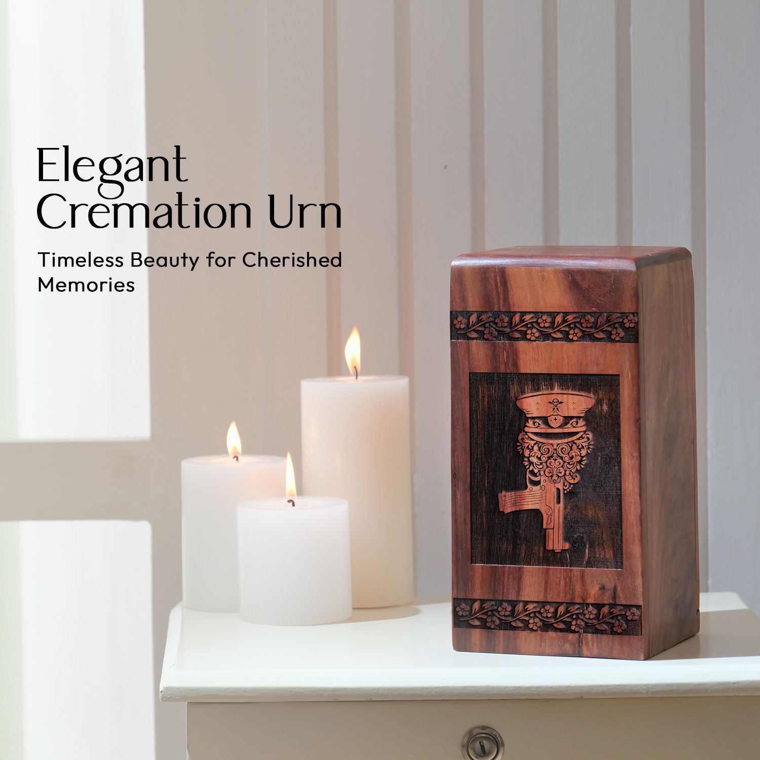 Imbued with a profound sense of reverence and solemnity, this 'Urn For Ashes' is designed to create a peaceful final resting place for your beloved ones. Uniquely crafted with an exquisite wooden veneer, our cremation urn not only holds poignant memories of your departed loved ones but also adds a touch of timeless elegance to your abode. Its bespoke design perfectly fits in your palms, ideal for both adult males and females, breathing life into those quiet moments of reminiscence. This decorative urn is ideal for those seeking to honor their loved ones while maintaining a delicate balance between beauty and practicality. These urns for burial will add an evocative, tangible layer to your in-house tribute, ethereal enough to complement nostalgic moods, durable enough to withstand the passage of time. Contentment and tranquility, forged together in this urn, will ensure the memories aren't far from your heart. It's more than just an urn; it's a timeless saga of love, memory, and respect.