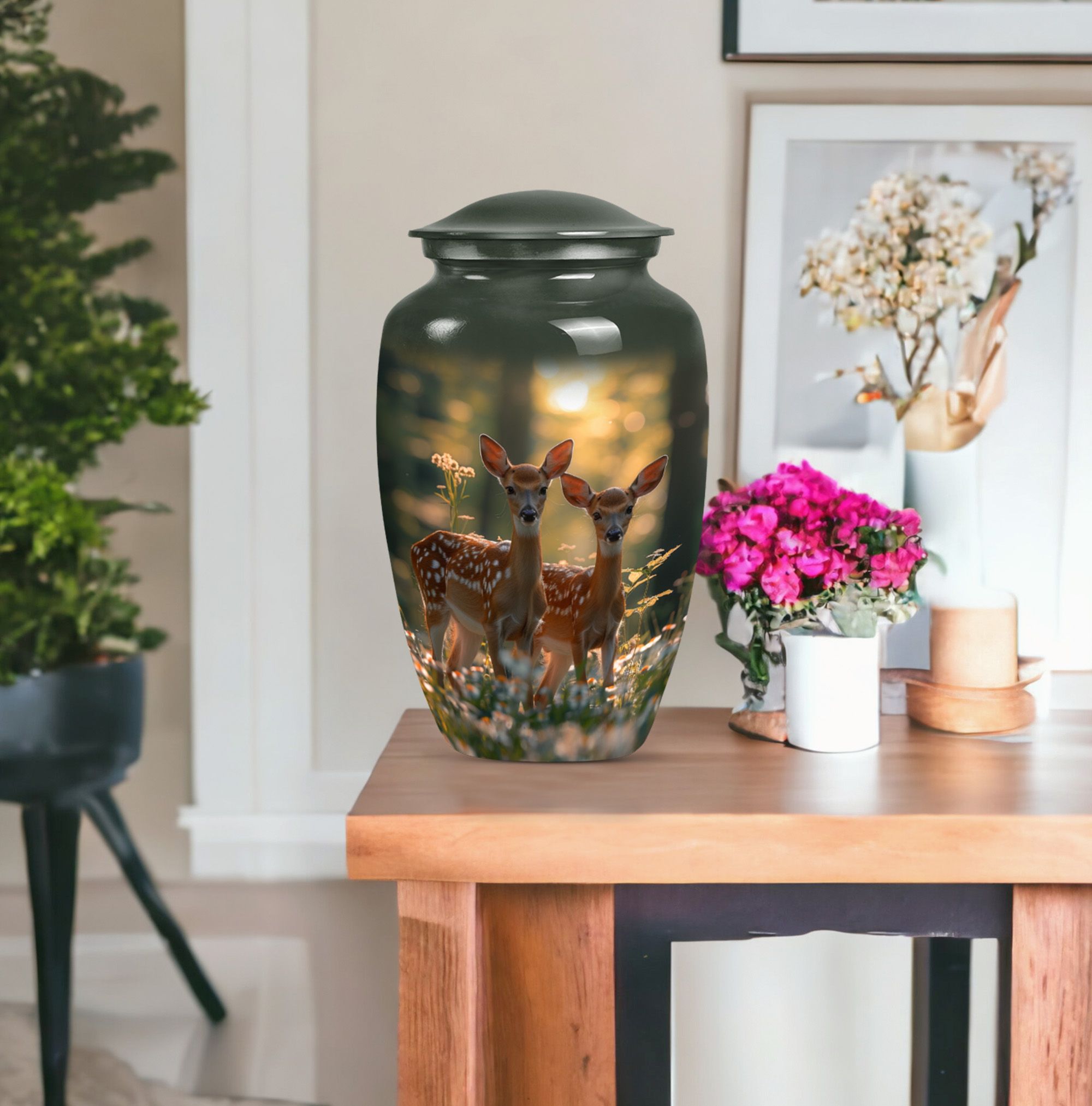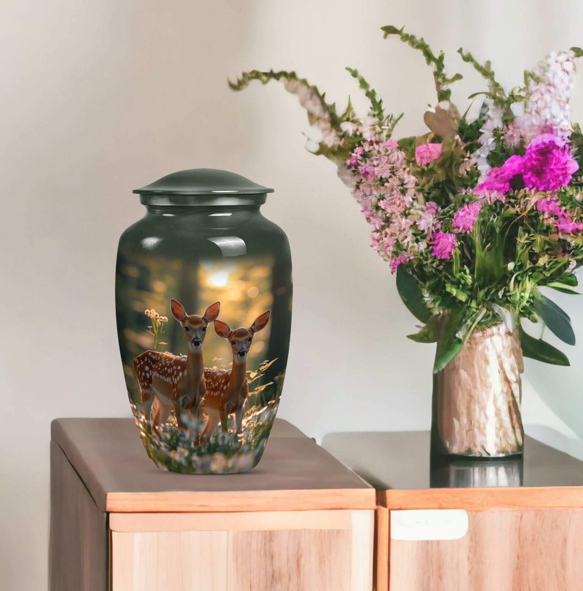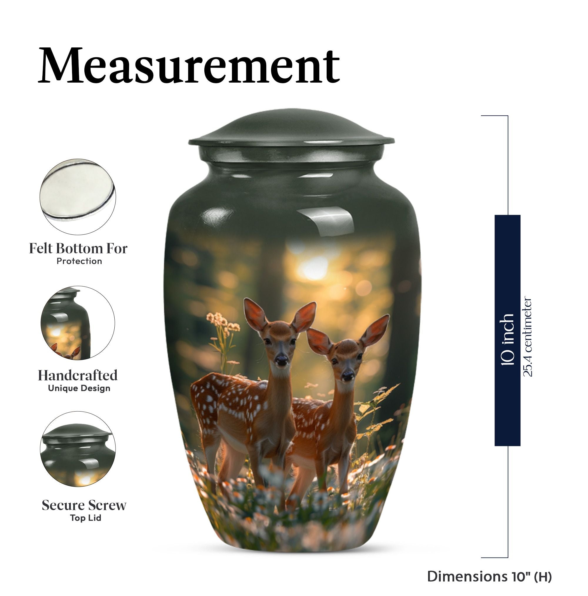 Discover an elegant solution to preserve the cherished memories of your loved ones with our 10-inch deer urn. Crafted from enduring aluminium, this burial ashes urn profiles a tasteful 'Gramophone' theme for a touch of classical nostalgia. Weighing a sturdy 3.3 pounds, our cremation funeral urns are designed to secure 200 cubic inches of cremation ashes, making them suitable for adult ashes. Each package is accompanied by a delicate velvet pouch for adequate containment and respect of the ashes. Make it personal and warm with our customization options; you can now craft and engrave names on your chosen urn to create a one-of-a-kind memorial. Fusing function with finesse, our large urns offer a dignified way to honor life and pass on memories. Ideal for those looking for urns for cremation ashes, our urn human ash humans makes a fitting tribute to a life well-lived. Embrace the process of remembrance with a sophisticated touch with our classic 10-inch memorial urn.