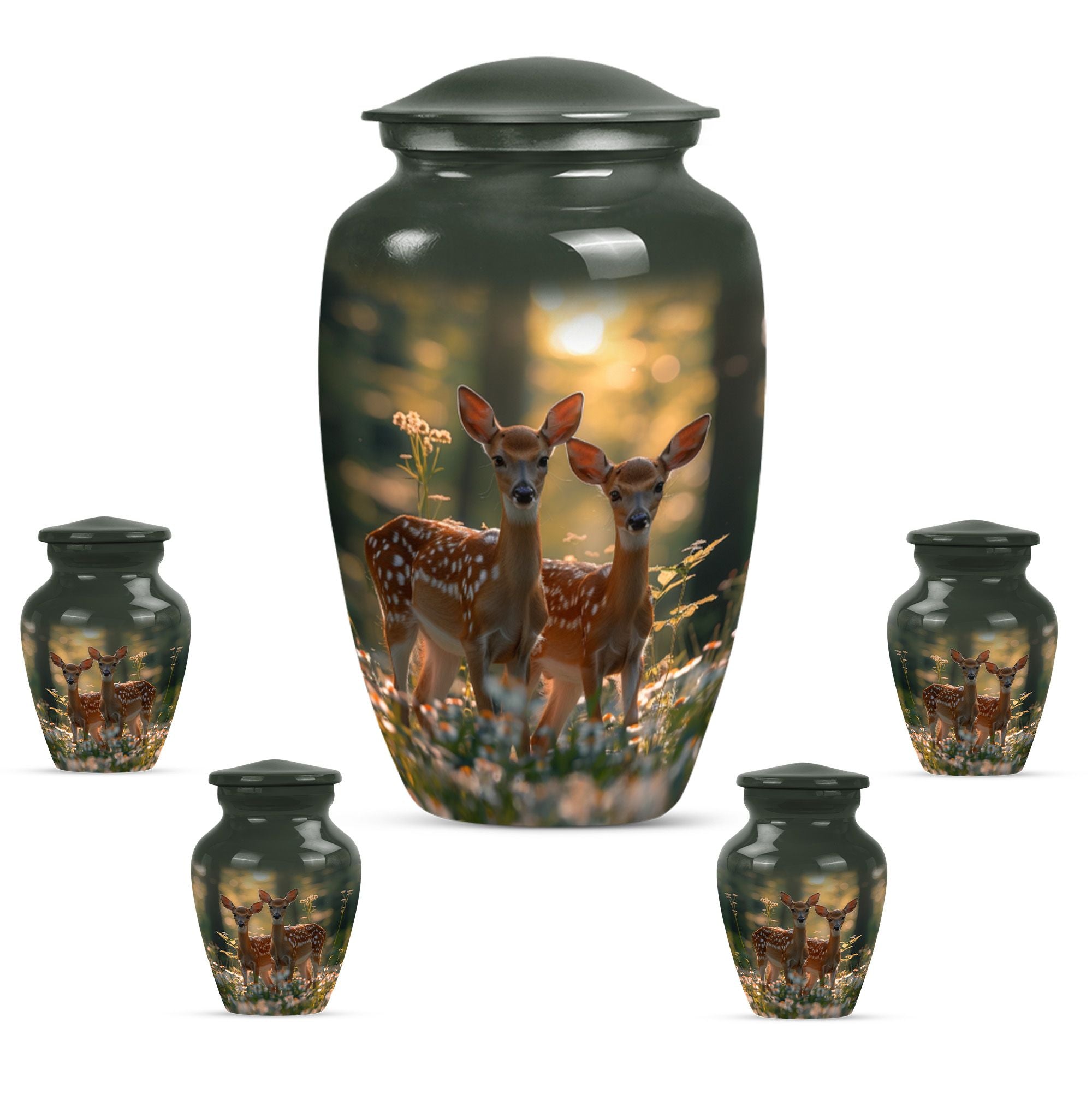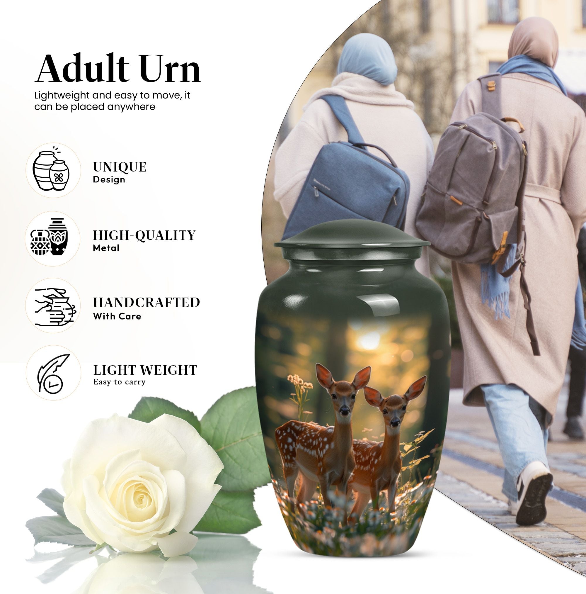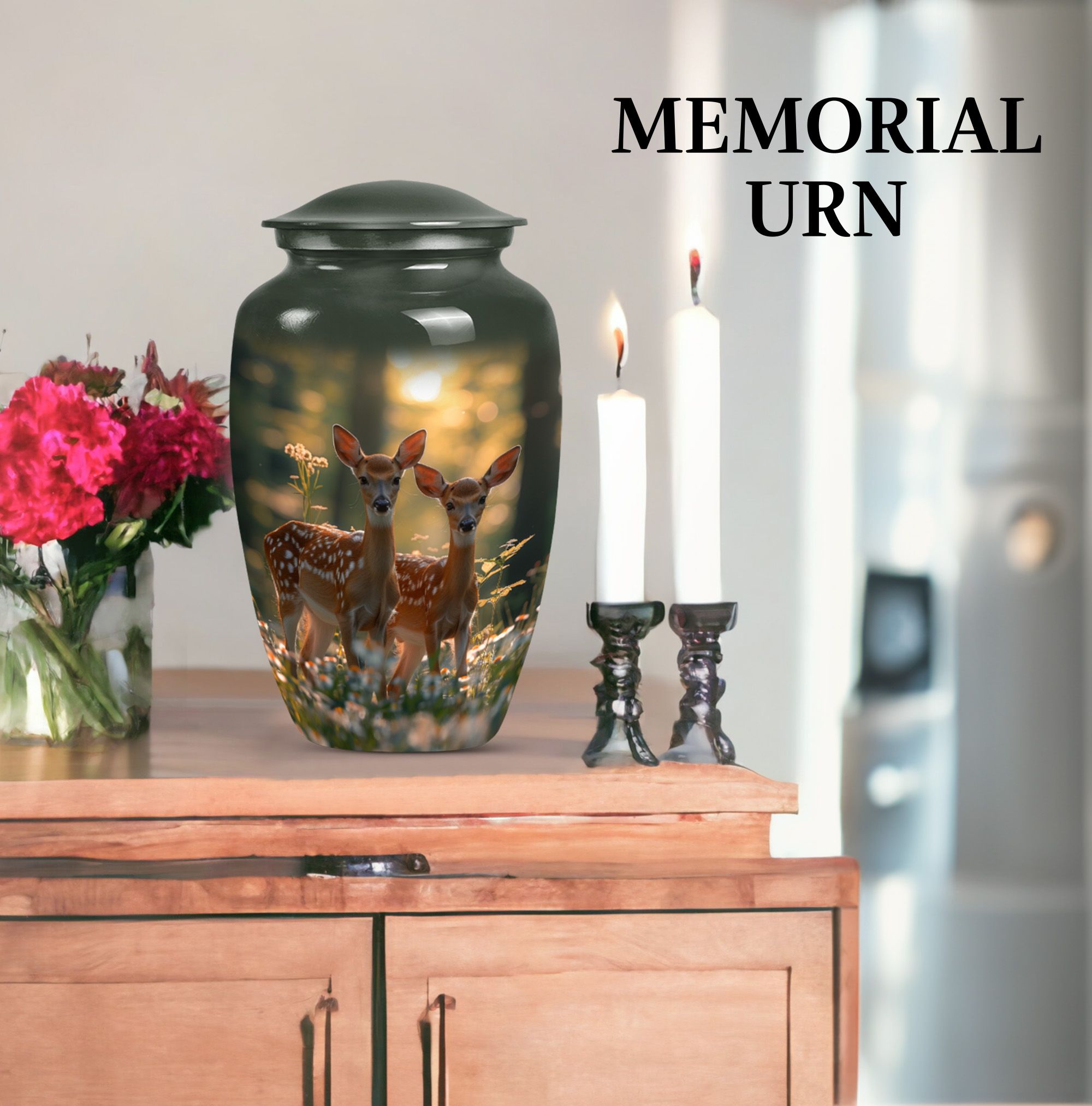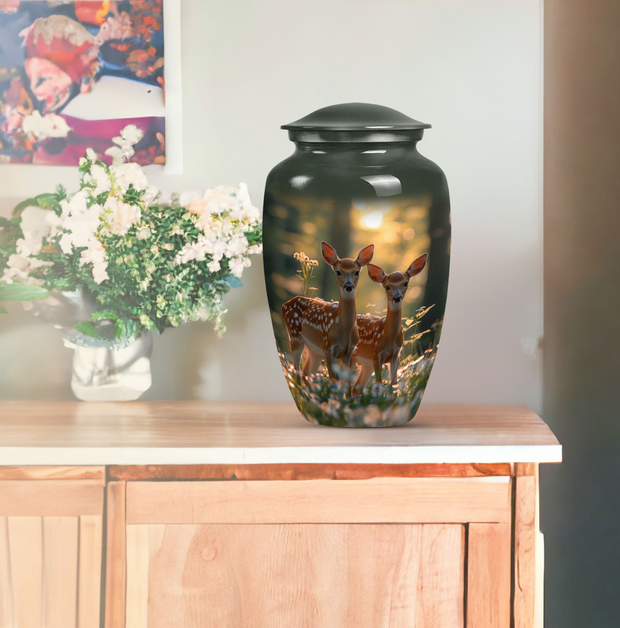 Discover an elegant solution to preserve the cherished memories of your loved ones with our 10-inch deer urn. Crafted from enduring aluminium, this burial ashes urn profiles a tasteful 'Gramophone' theme for a touch of classical nostalgia. Weighing a sturdy 3.3 pounds, our cremation funeral urns are designed to secure 200 cubic inches of cremation ashes, making them suitable for adult ashes. Each package is accompanied by a delicate velvet pouch for adequate containment and respect of the ashes. Make it personal and warm with our customization options; you can now craft and engrave names on your chosen urn to create a one-of-a-kind memorial. Fusing function with finesse, our large urns offer a dignified way to honor life and pass on memories. Ideal for those looking for urns for cremation ashes, our urn human ash humans makes a fitting tribute to a life well-lived. Embrace the process of remembrance with a sophisticated touch with our classic 10-inch memorial urn.