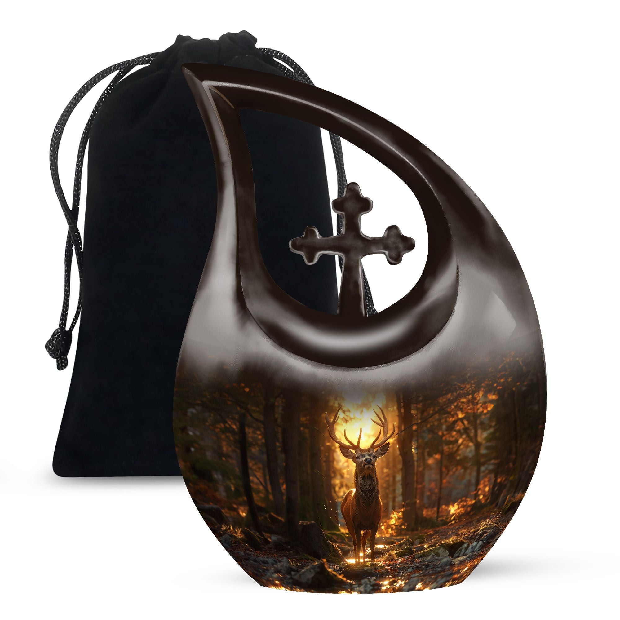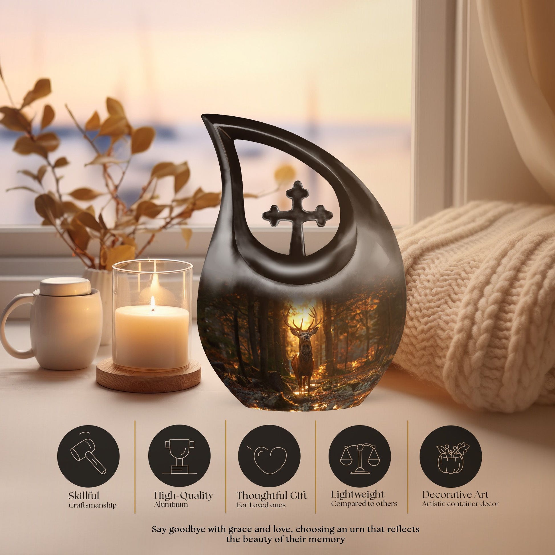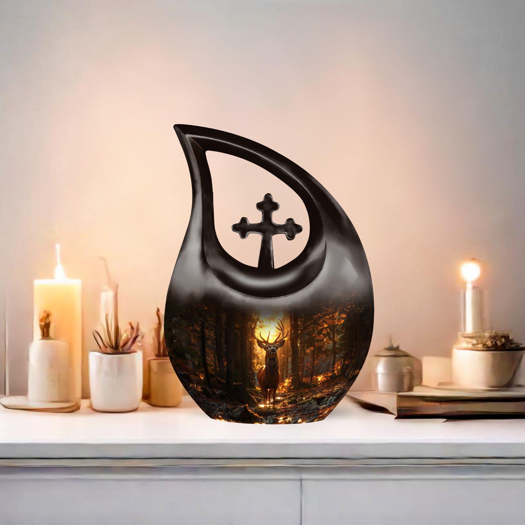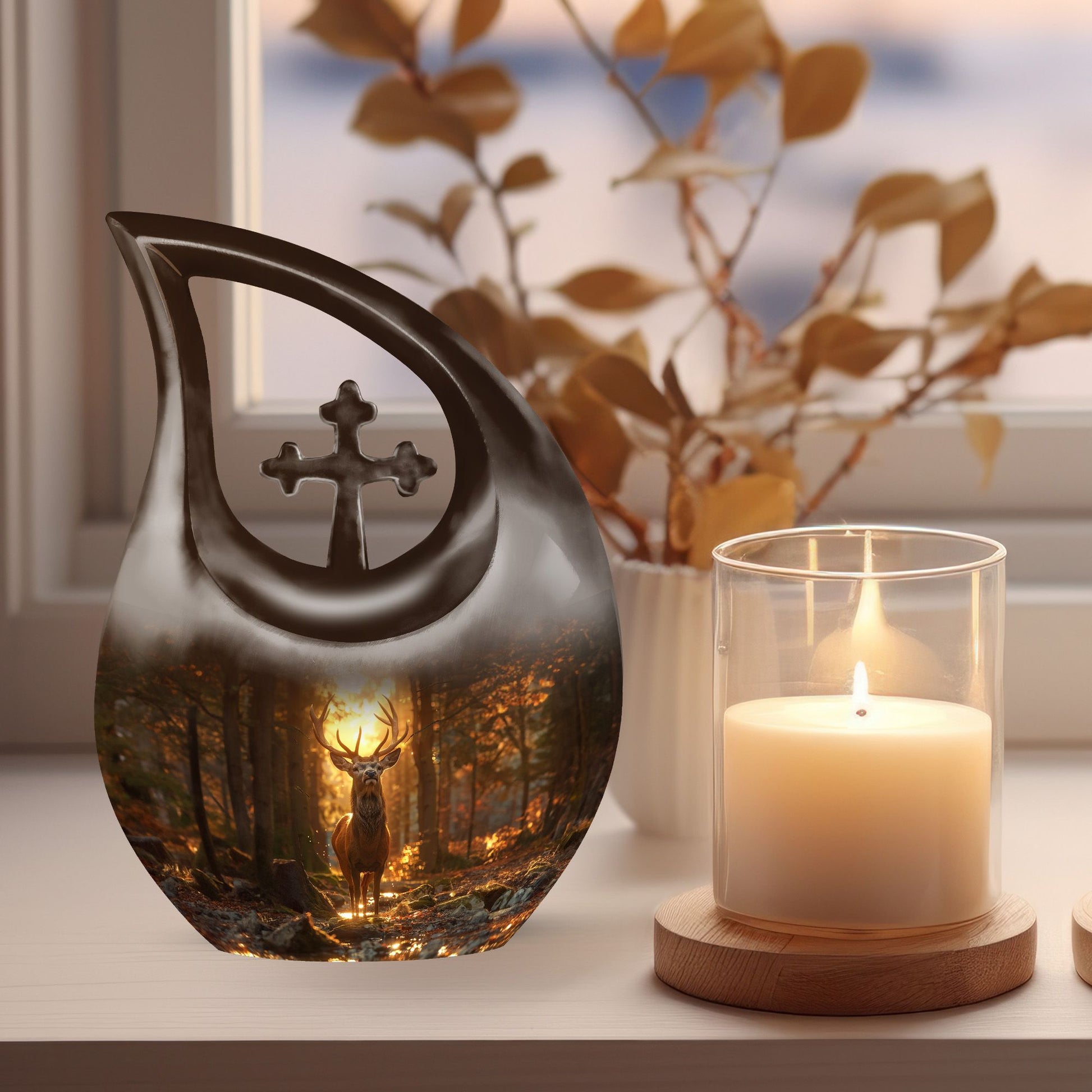 Symbolize your eternal love and respect for your dearly departed with our large Deer Urn. Expertly crafted from high quality aluminium, this cremation box showcases a delicately detailed 'Cross Drop' theme that is both touching and timeless. Measuring at a substantial 10 inches in height and weighing a solid 3.3 pounds, this urn has the capacity to hold up to 200 cubic inches of ashes. The urn comes with a plush velvet pouch, providing a secure and respectful containment for the precious ashes. Moreover, this Deer Urn offers the unique opportunity for customization. Personalize it with engraved names, adding an intimate and personal touch to this already special item. This urn is notable in the realm of memorial urns, not just for its substantial size but also for its engaging theme and valuable customization options. It successfully captures the essence of remembering a loved one with dignity and honor. This eye-catching piece serves not only as a vessel for ashes but also a captivating work of art. Expertly merge the aesthetics of design with profound symbolism with this large Deer Urn.