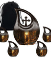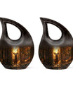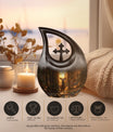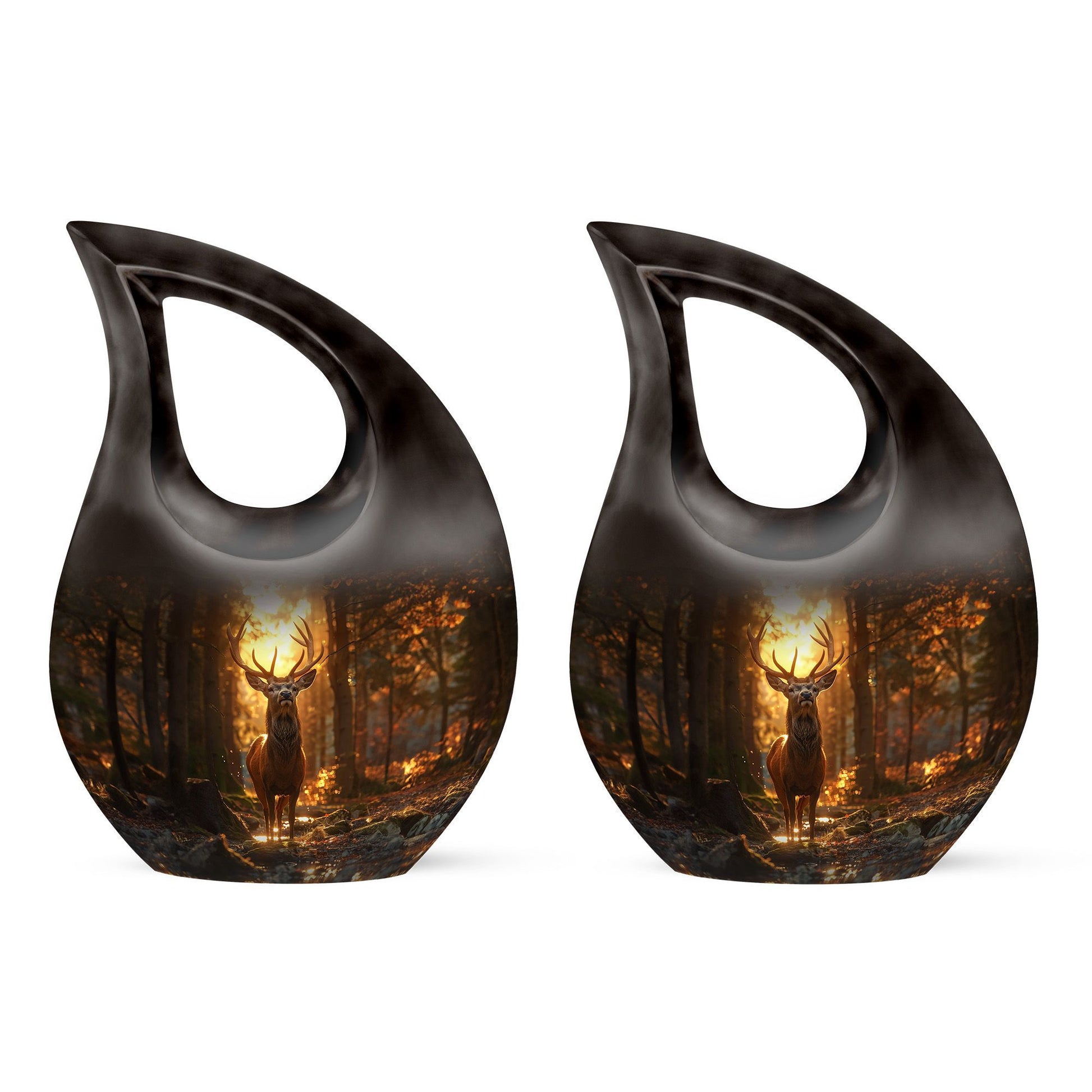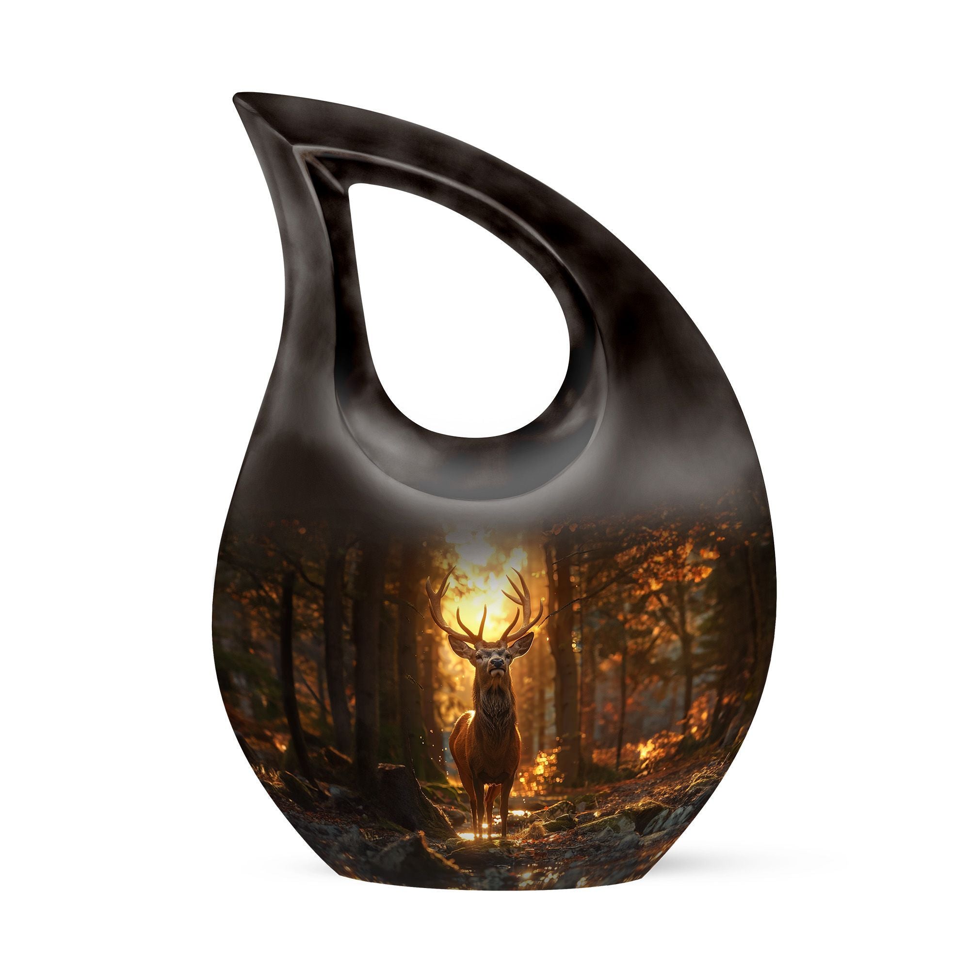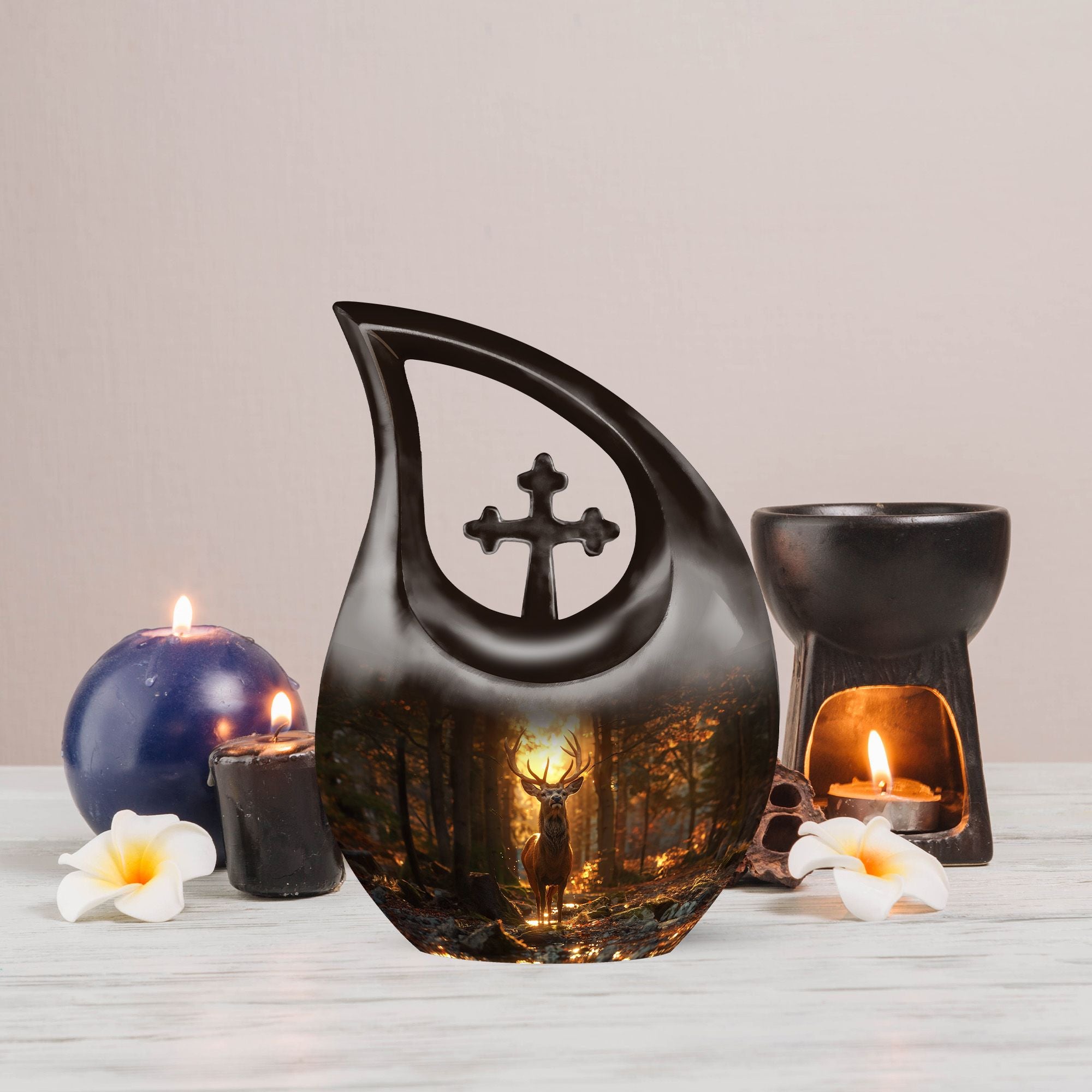 Symbolize your eternal love and respect for your dearly departed with our large Deer Urn. Expertly crafted from high quality aluminium, this cremation box showcases a delicately detailed 'Cross Drop' theme that is both touching and timeless. Measuring at a substantial 10 inches in height and weighing a solid 3.3 pounds, this urn has the capacity to hold up to 200 cubic inches of ashes. The urn comes with a plush velvet pouch, providing a secure and respectful containment for the precious ashes. Moreover, this Deer Urn offers the unique opportunity for customization. Personalize it with engraved names, adding an intimate and personal touch to this already special item. This urn is notable in the realm of memorial urns, not just for its substantial size but also for its engaging theme and valuable customization options. It successfully captures the essence of remembering a loved one with dignity and honor. This eye-catching piece serves not only as a vessel for ashes but also a captivating work of art. Expertly merge the aesthetics of design with profound symbolism with this large Deer Urn.