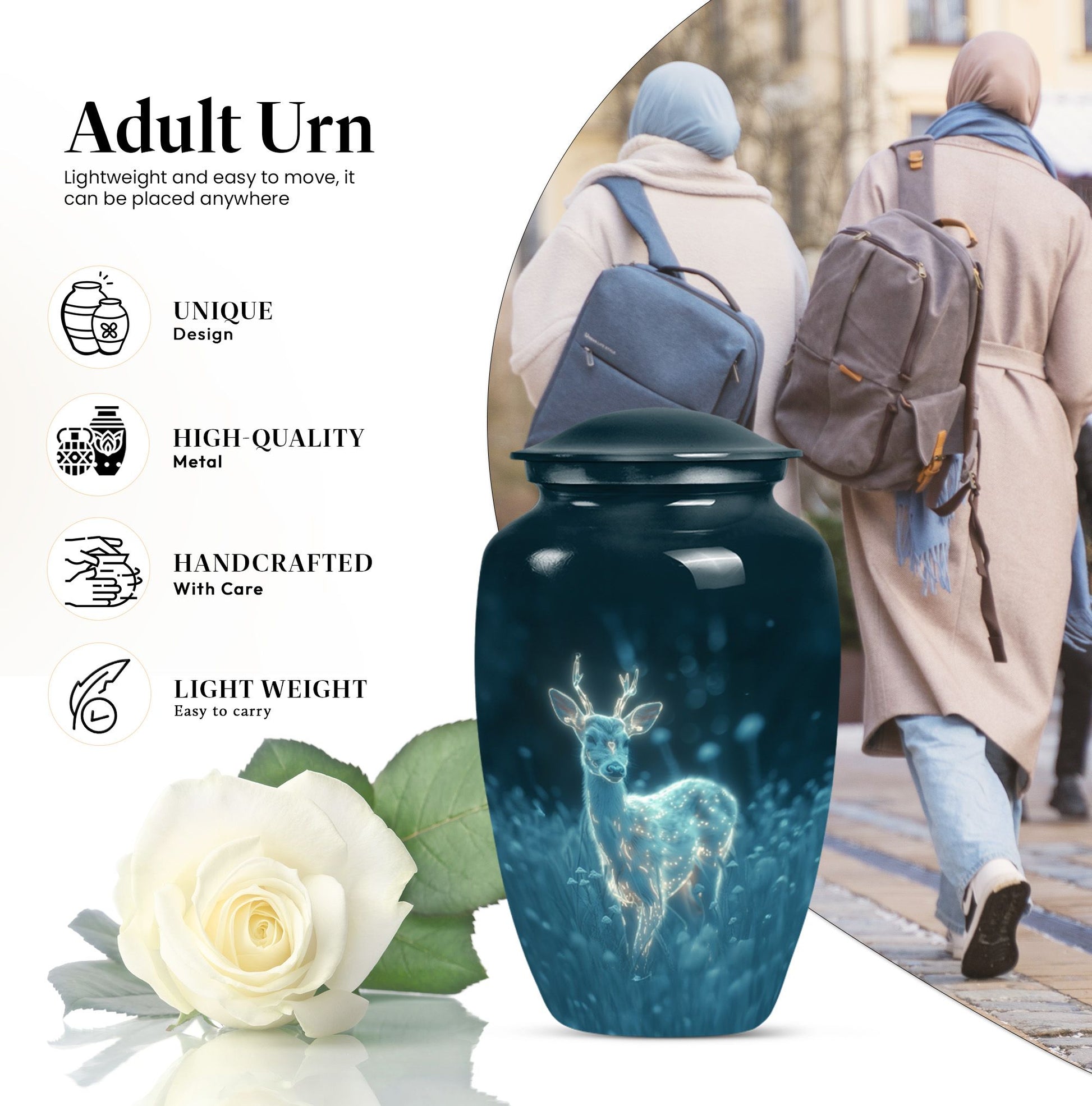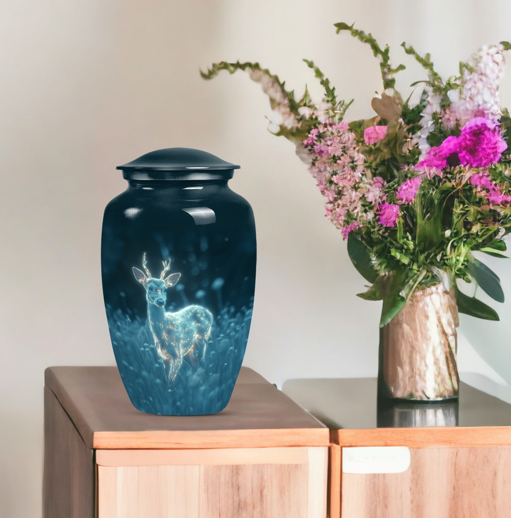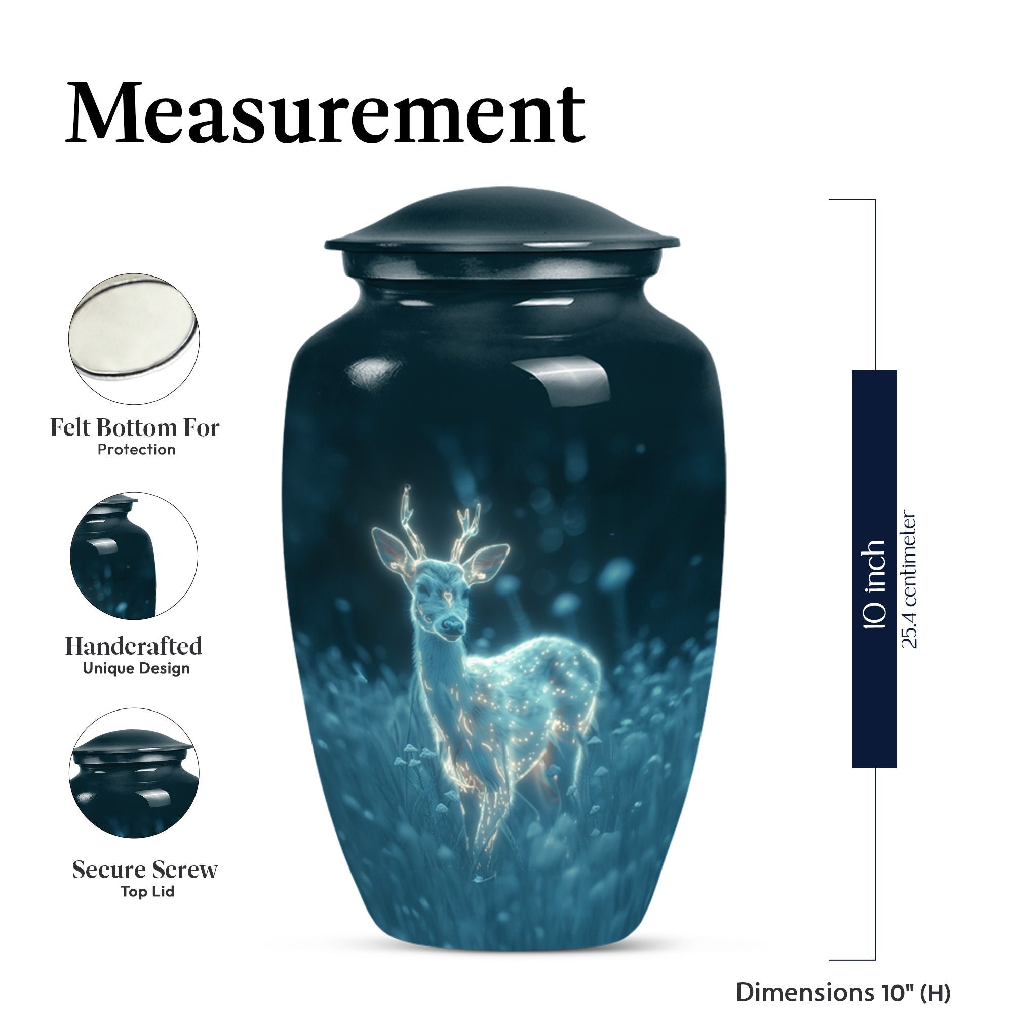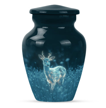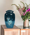 Experience serenity with this exquisite 10 Inch deer Urn from our Memorial Ceremony Supplies. Crafted from durable Aluminium material, this large urn holds a significant capacity of 200 cubic inches, making it an ideal choice for burial urns for cremation ashes or as a loving homely memorial. The package includes a velvet pouch for containment of ashes, maintaining the elegance and respect that your loved ones deserve. Enriched with a unique 'Gramophone' theme, this cremation urn weighs just 3.3 pounds and can easily complement your Urban Homes decor owing to its compact design. Add a personal touch by customizing it with engraved names of your dear departed. Suitable for both men and women, disregard the concept of a typical 'man metal cremation urn'. This product caters well to adults and seniors looking for a graceful, timeless memorial to cherish and hold. Explore the world of tranquillity and remembrance with this beautiful deer urn.
