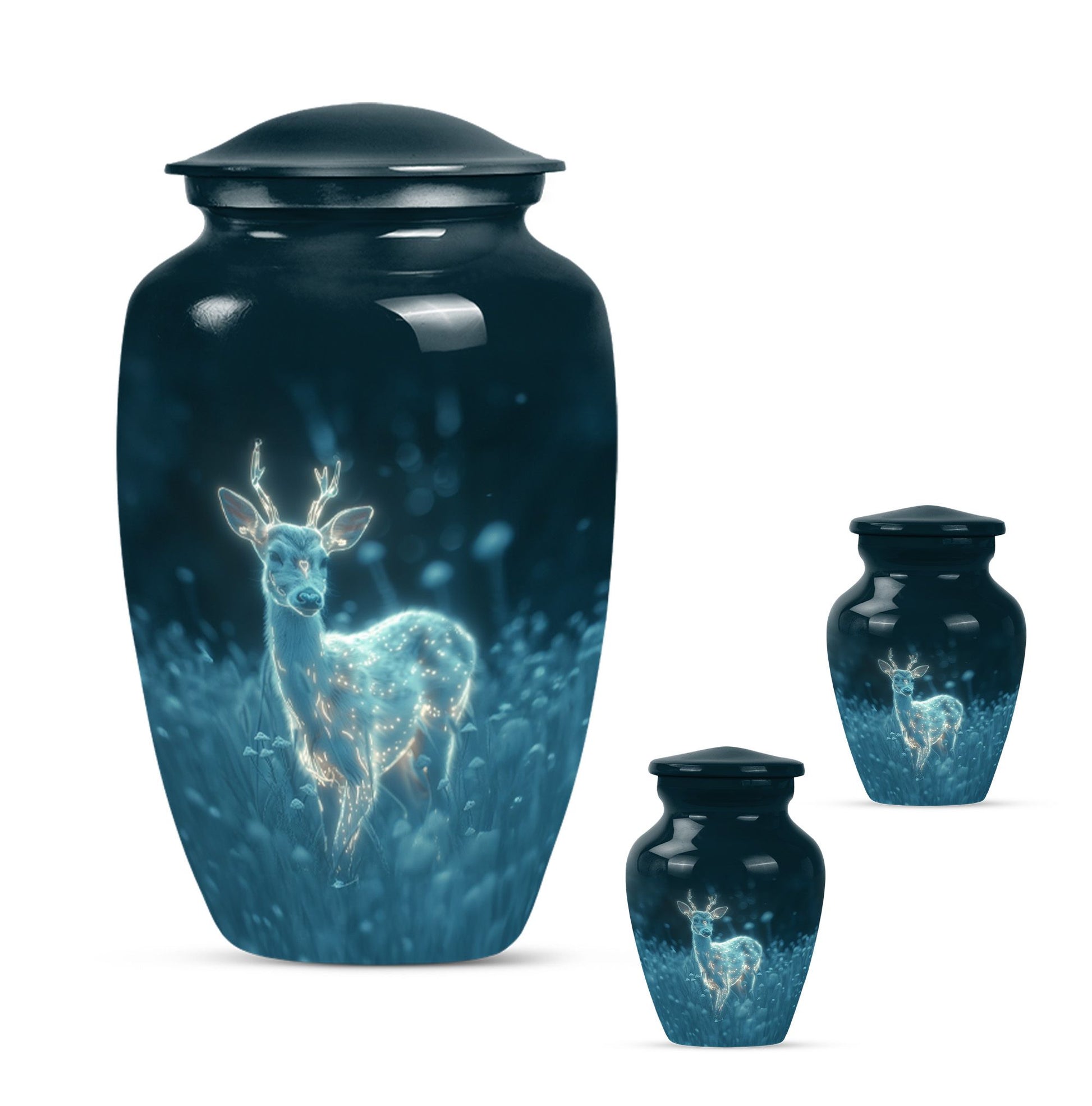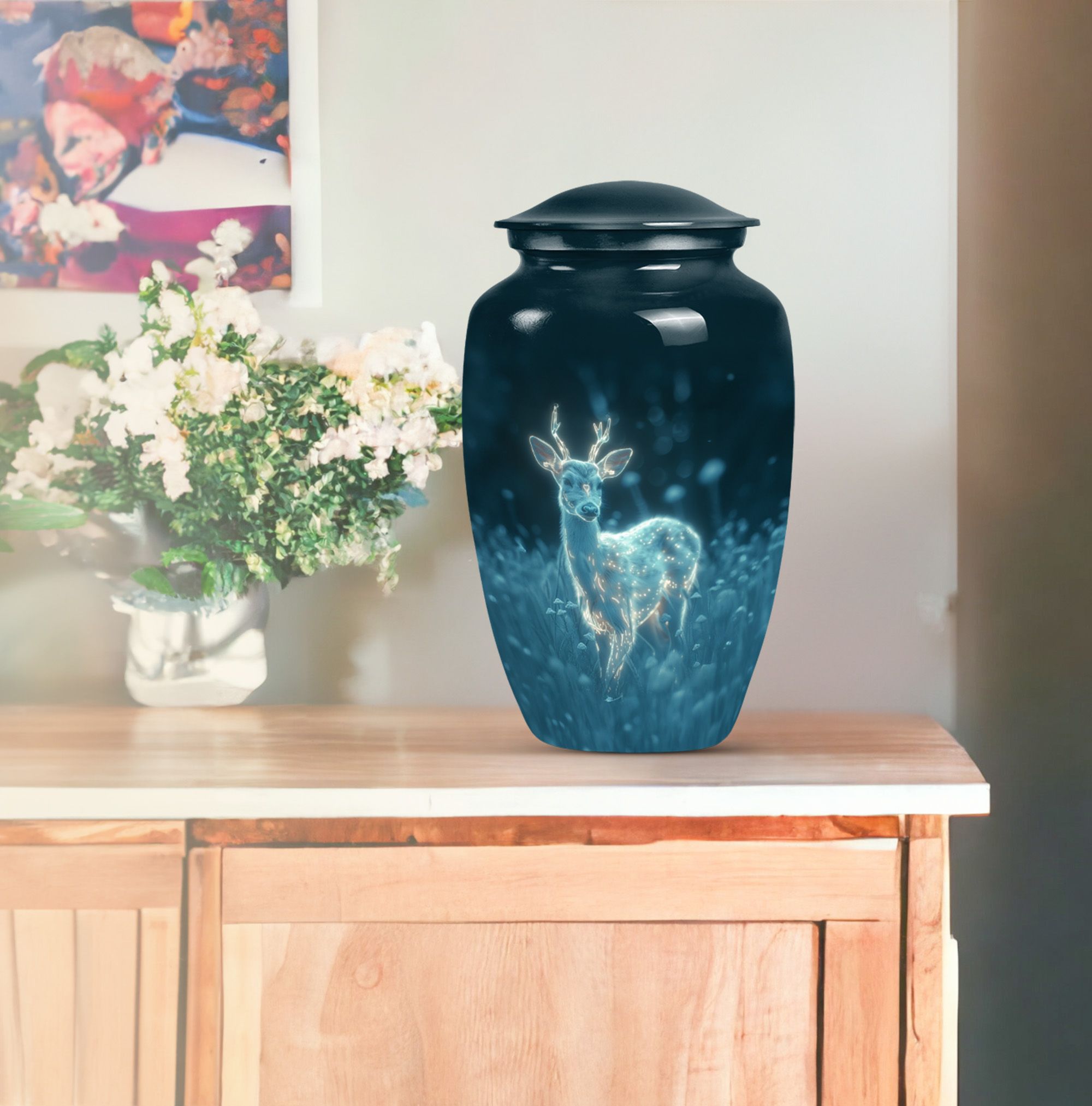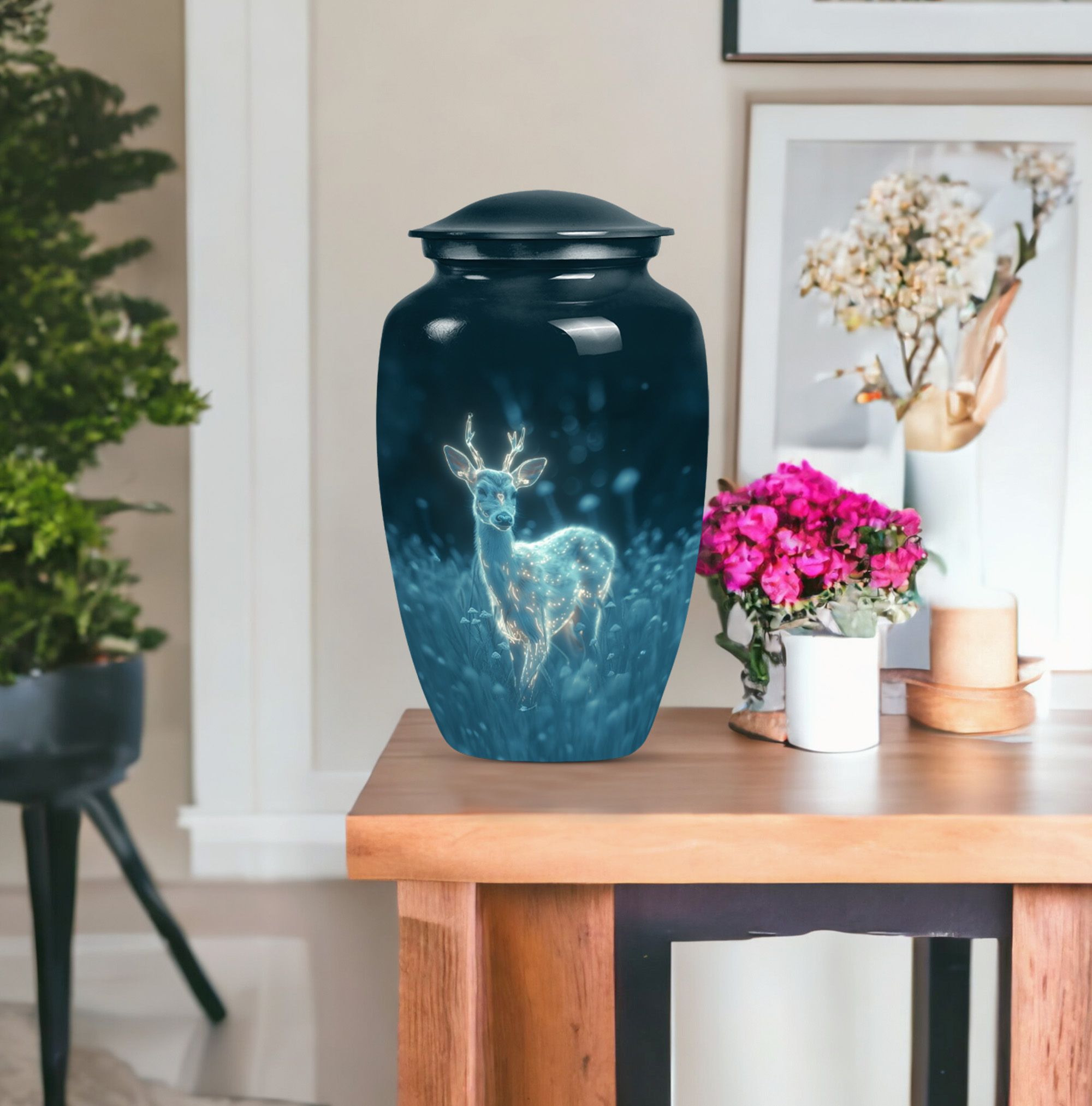 Experience serenity with this exquisite 10 Inch deer Urn from our Memorial Ceremony Supplies. Crafted from durable Aluminium material, this large urn holds a significant capacity of 200 cubic inches, making it an ideal choice for burial urns for cremation ashes or as a loving homely memorial. The package includes a velvet pouch for containment of ashes, maintaining the elegance and respect that your loved ones deserve. Enriched with a unique 'Gramophone' theme, this cremation urn weighs just 3.3 pounds and can easily complement your Urban Homes decor owing to its compact design. Add a personal touch by customizing it with engraved names of your dear departed. Suitable for both men and women, disregard the concept of a typical 'man metal cremation urn'. This product caters well to adults and seniors looking for a graceful, timeless memorial to cherish and hold. Explore the world of tranquillity and remembrance with this beautiful deer urn.
