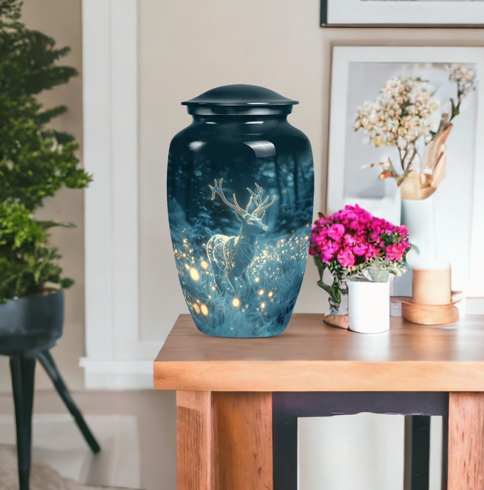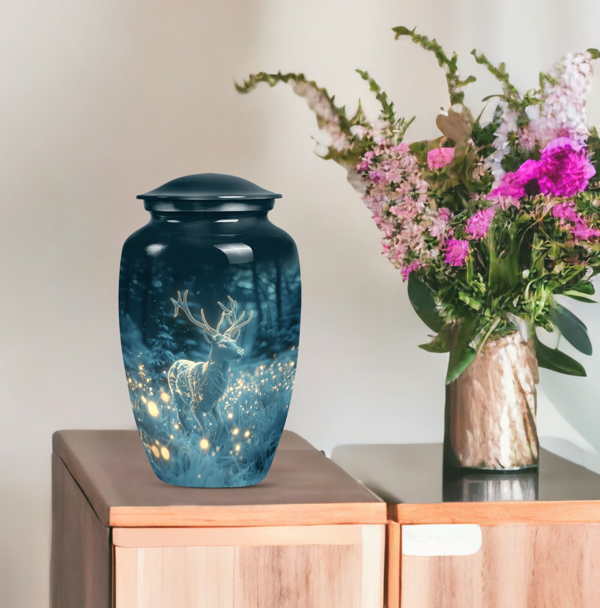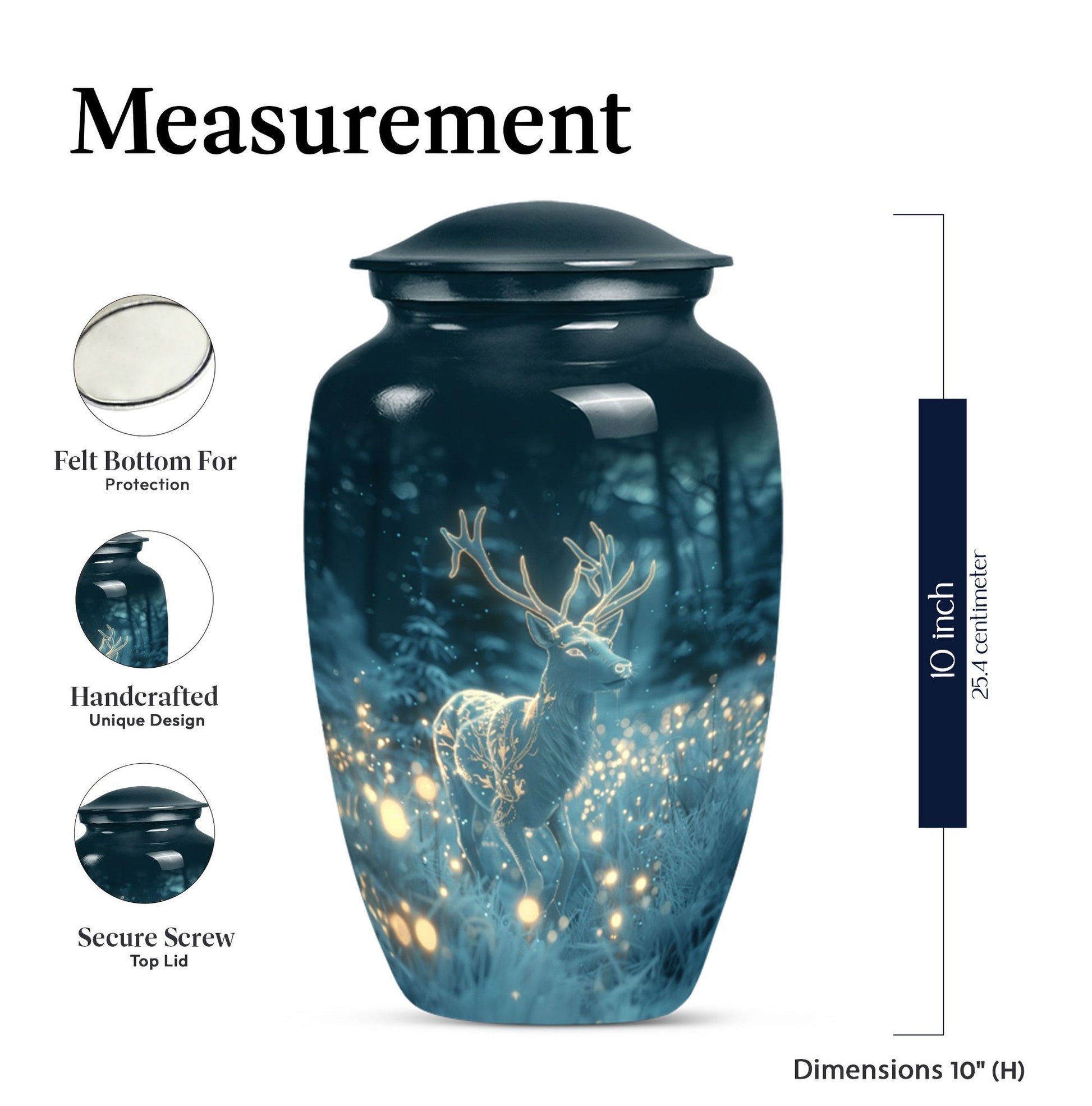 Immerse yourself in remembrance with our divine 10-inch Classic Urn, crafted meticulously in fascinating Aluminium and designed with an intricate Gramophone theme. Weighing a solid 3.3 pounds and standing a proud 10 inches tall, this large urn promises 200 cubic inches of capacity, signifying an unwavering bond with the departed soul encapsulated within. This cremation urn is accompanied by a luxury velvet pouch, providing a dignified containment for the precious ashes. Embellished with the resilience of deer and sentimental value of handcrafted design, this funeral urn serves as an expressive testament to your beloved. For an extra touch of personalization, the urn can be engraved with names, ensuring that your cherished memories are etched in forever. This elegant urn is an ideal memorial large urn for ashes, resonating with women's souls and artistic spirits, ensuring the remembrance is as unique as the life lived.