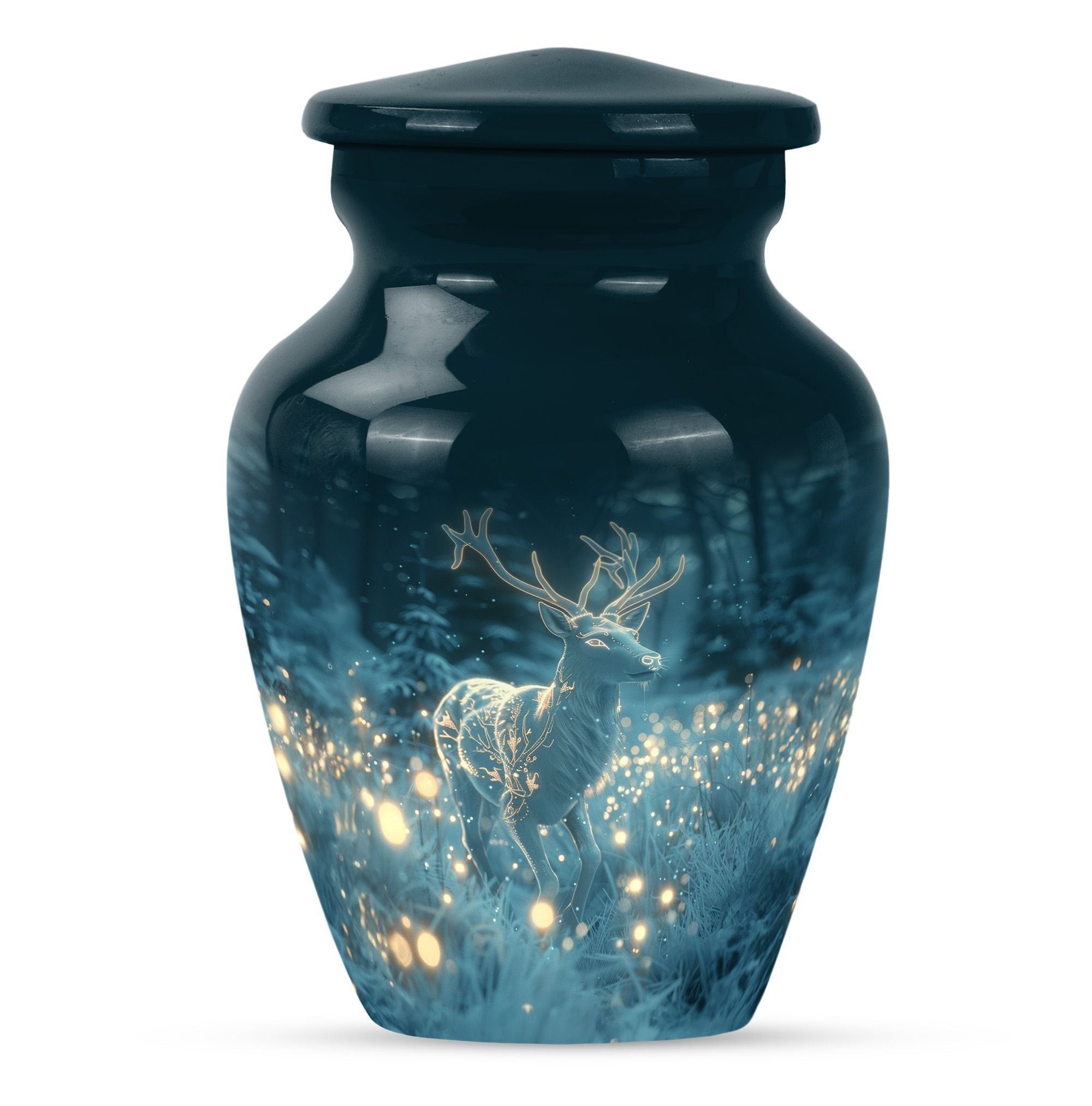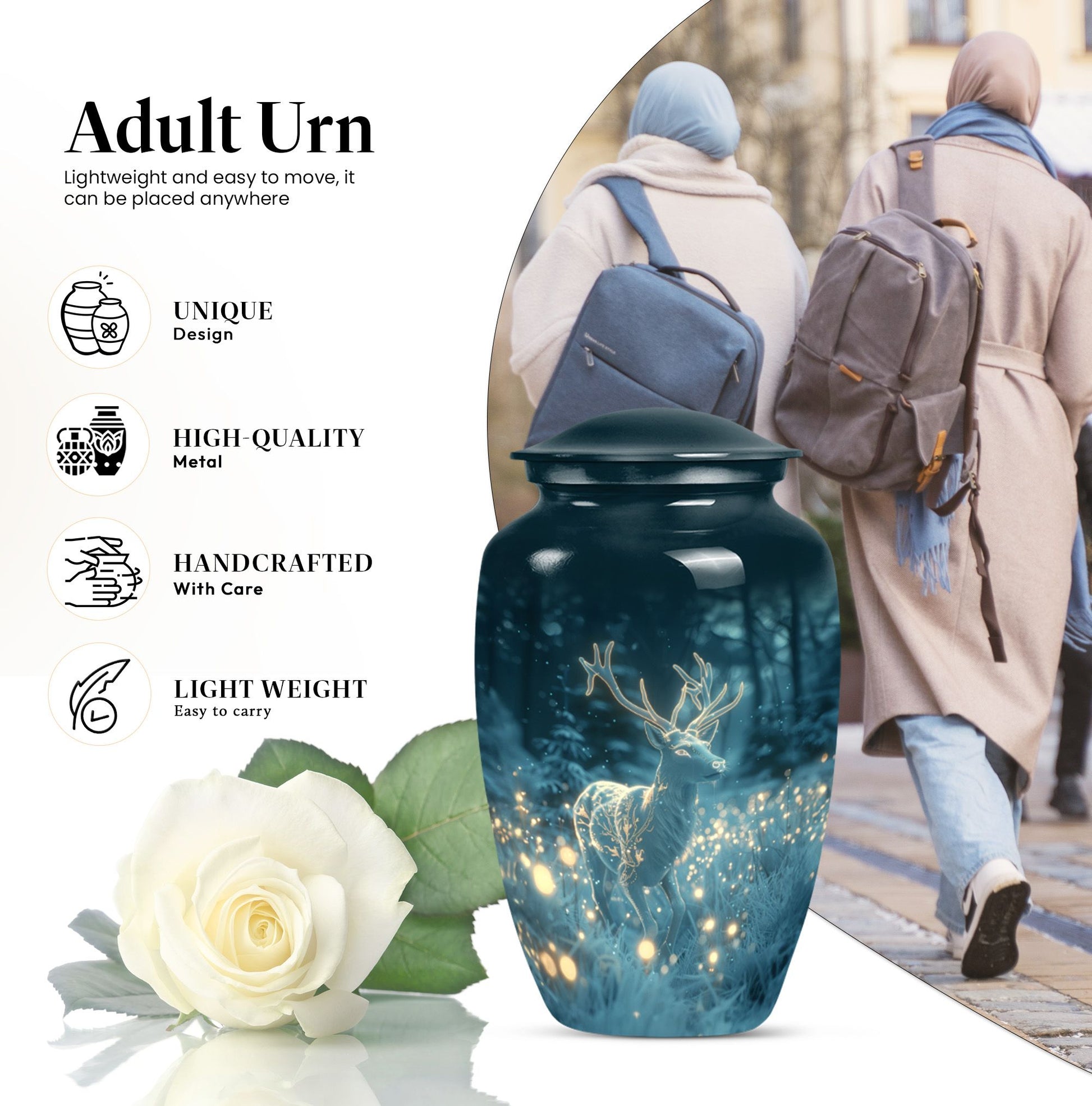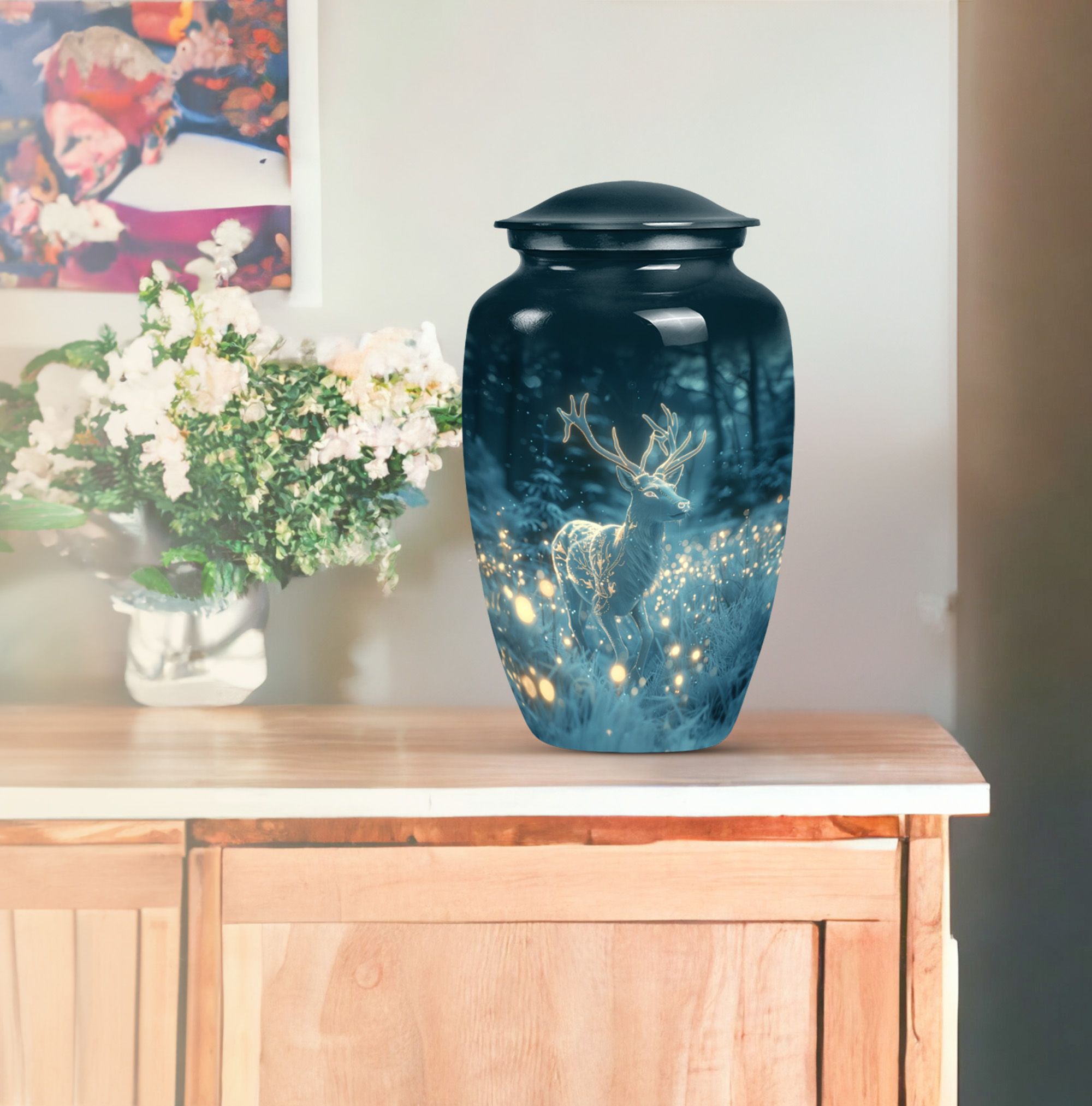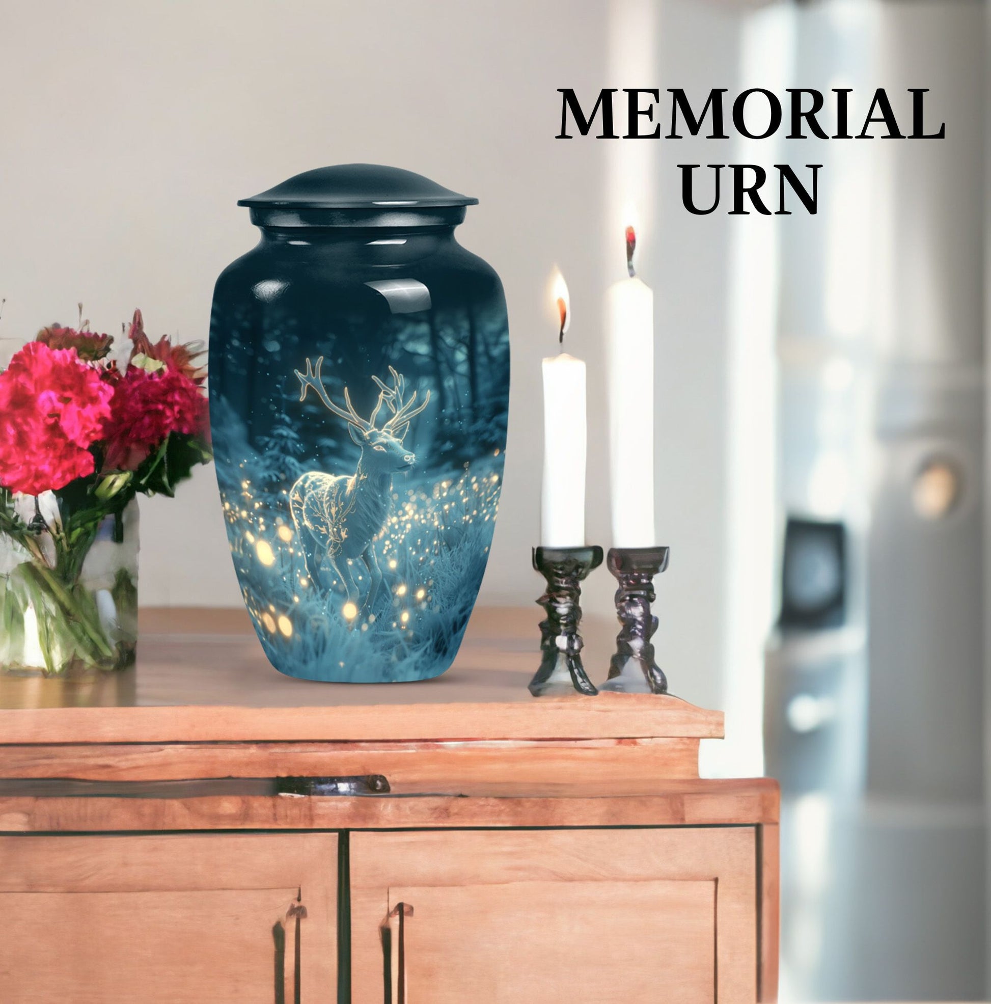Immerse yourself in remembrance with our divine 10-inch Classic Urn, crafted meticulously in fascinating Aluminium and designed with an intricate Gramophone theme. Weighing a solid 3.3 pounds and standing a proud 10 inches tall, this large urn promises 200 cubic inches of capacity, signifying an unwavering bond with the departed soul encapsulated within. This cremation urn is accompanied by a luxury velvet pouch, providing a dignified containment for the precious ashes. Embellished with the resilience of deer and sentimental value of handcrafted design, this funeral urn serves as an expressive testament to your beloved. For an extra touch of personalization, the urn can be engraved with names, ensuring that your cherished memories are etched in forever. This elegant urn is an ideal memorial large urn for ashes, resonating with women's souls and artistic spirits, ensuring the remembrance is as unique as the life lived.