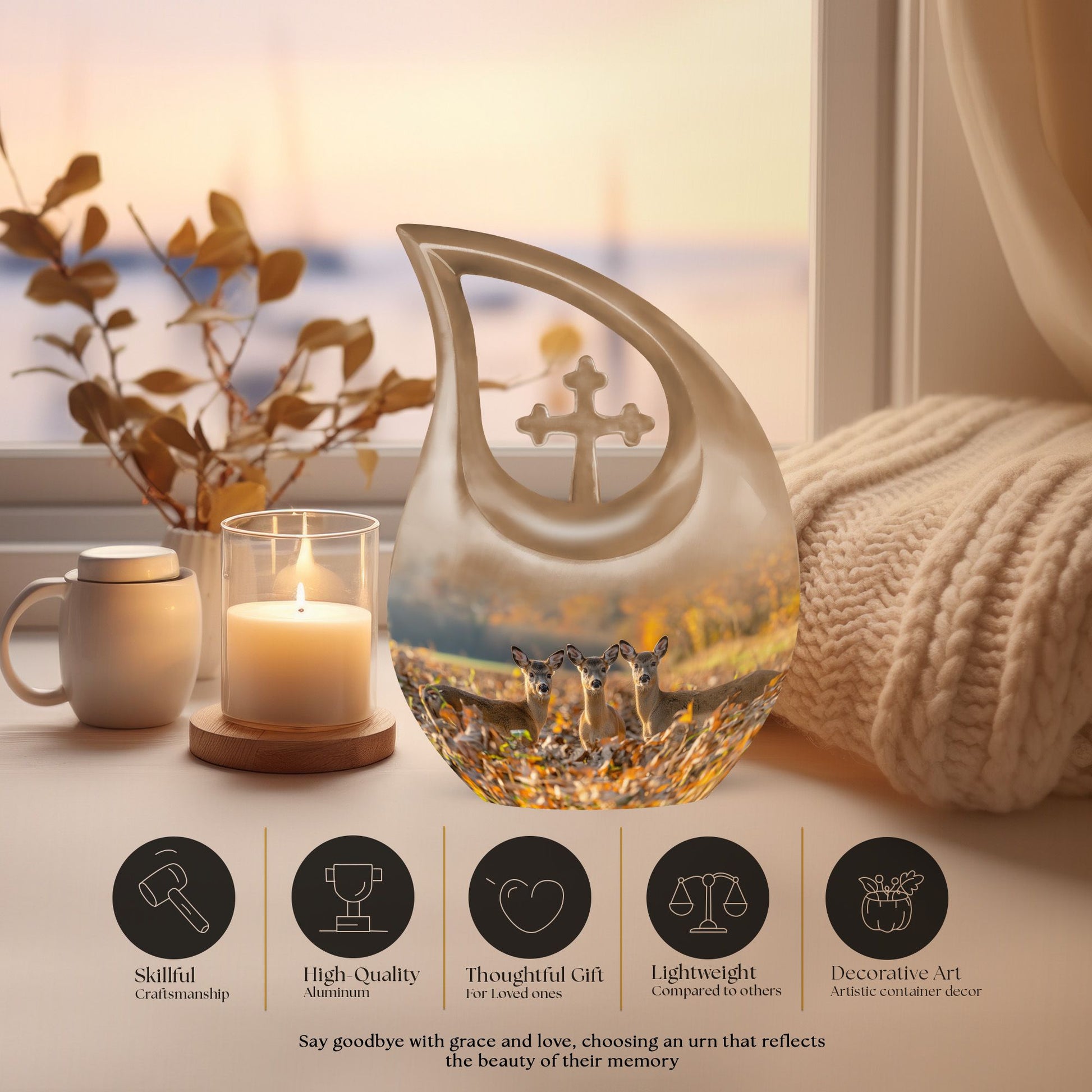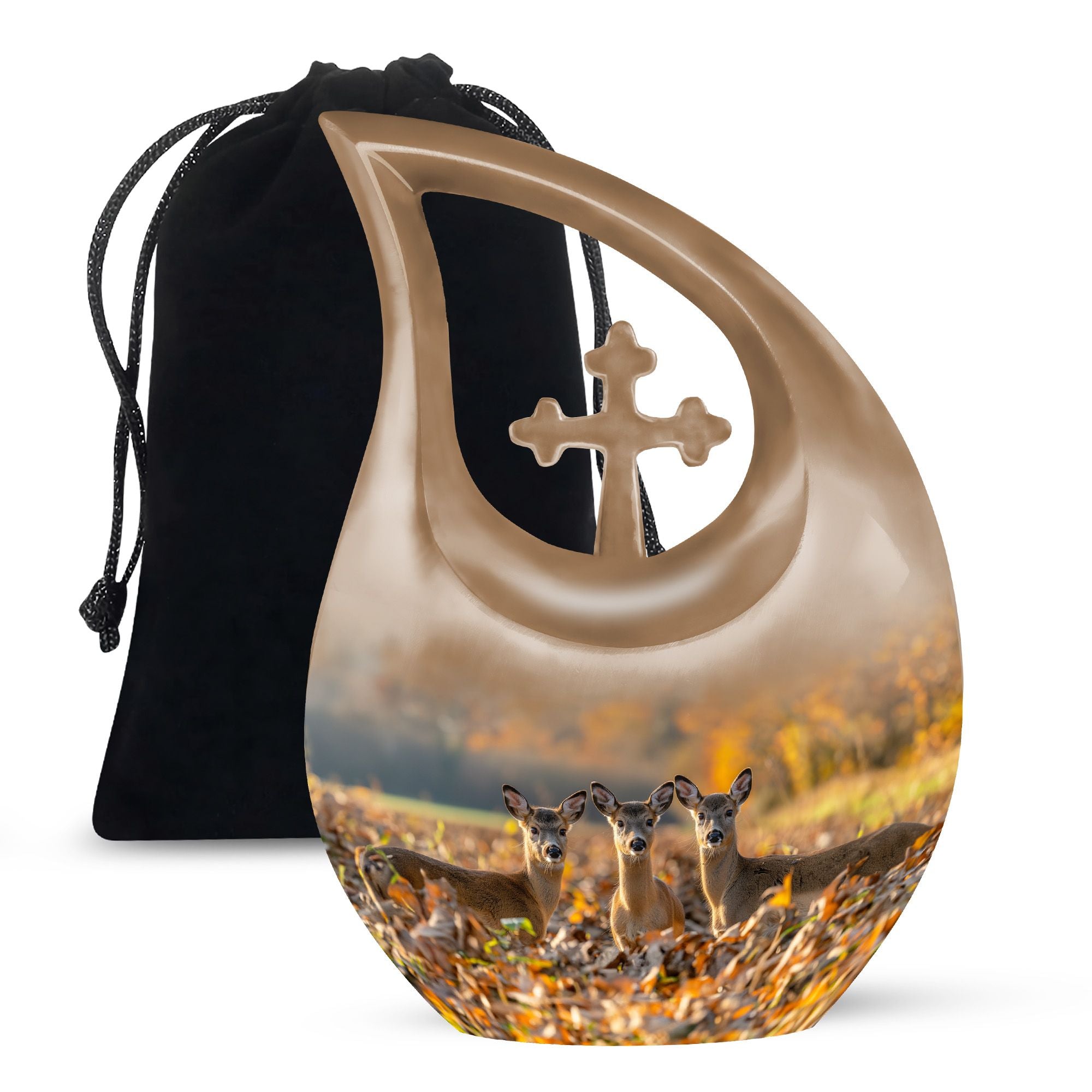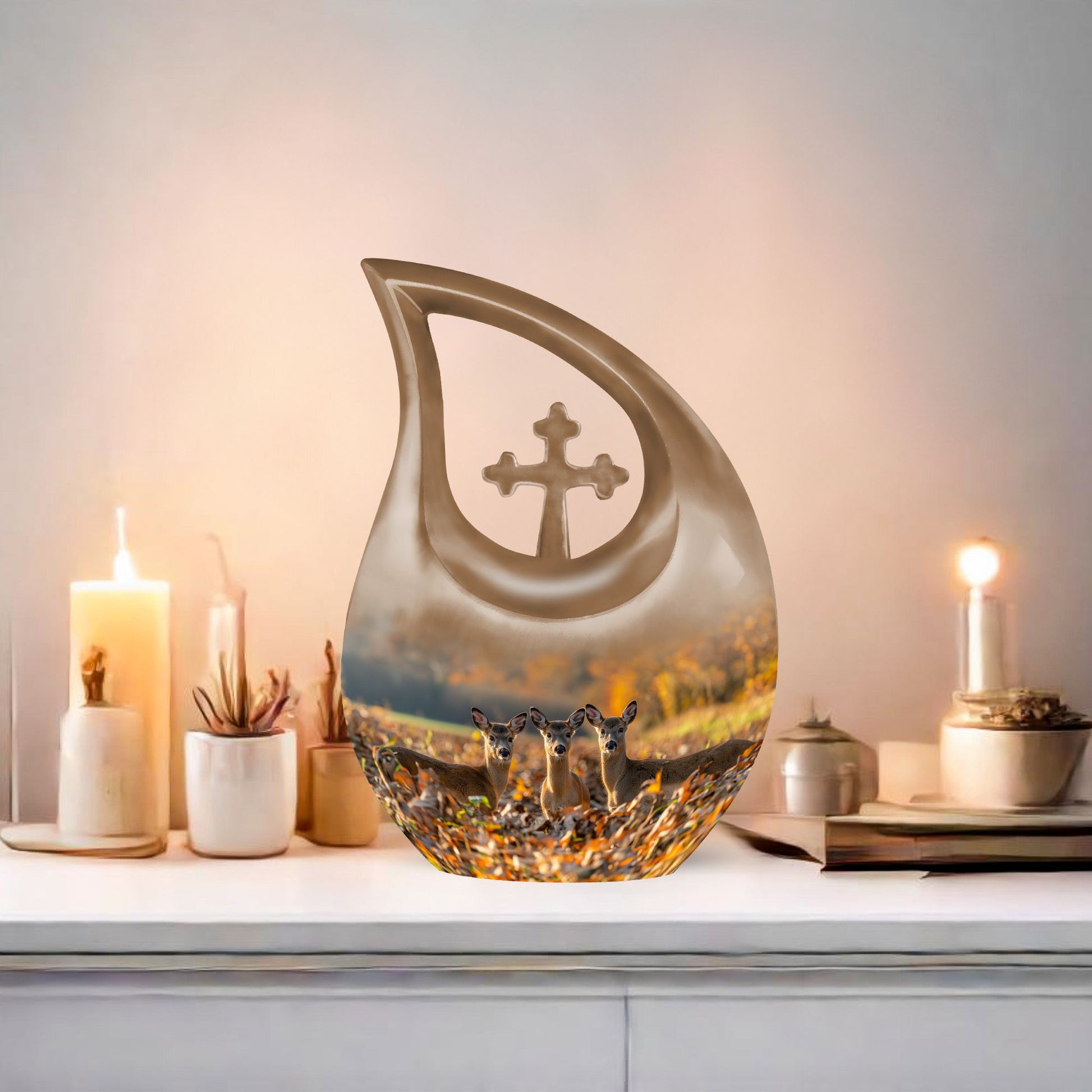 Honor your cherished one with this Deer Family Urn, a profound symbol of tranquility and togetherness. Crafted meticulously from sturdy aluminum, this Large Urn is designed to safely guard ashes with a capacity of 200 cubic inches. The intriguing Cross Drop theme, a unique tribute to the resilience of faith and family, bestows an unusual aesthetic that resonates with the heart. Furthermore, each urn comes with a velvet pouch, adding an extra layer of protection to the sacred contents. The urn stands as a full-size memorial, measuring 10 inches in height and weighing 3.3 pounds, offering a substantial and secure sanctuary. We also provide the provision to customize the urn by engraving names for an endearing, personal touch. The Deer Family Urn, an amalgamation of beauty and durability makes it one of the thoughtful memorial urns option for your precious loved ones. An item perfect for home memorial or burial, fitting seamlessly for any memorial ceremony.