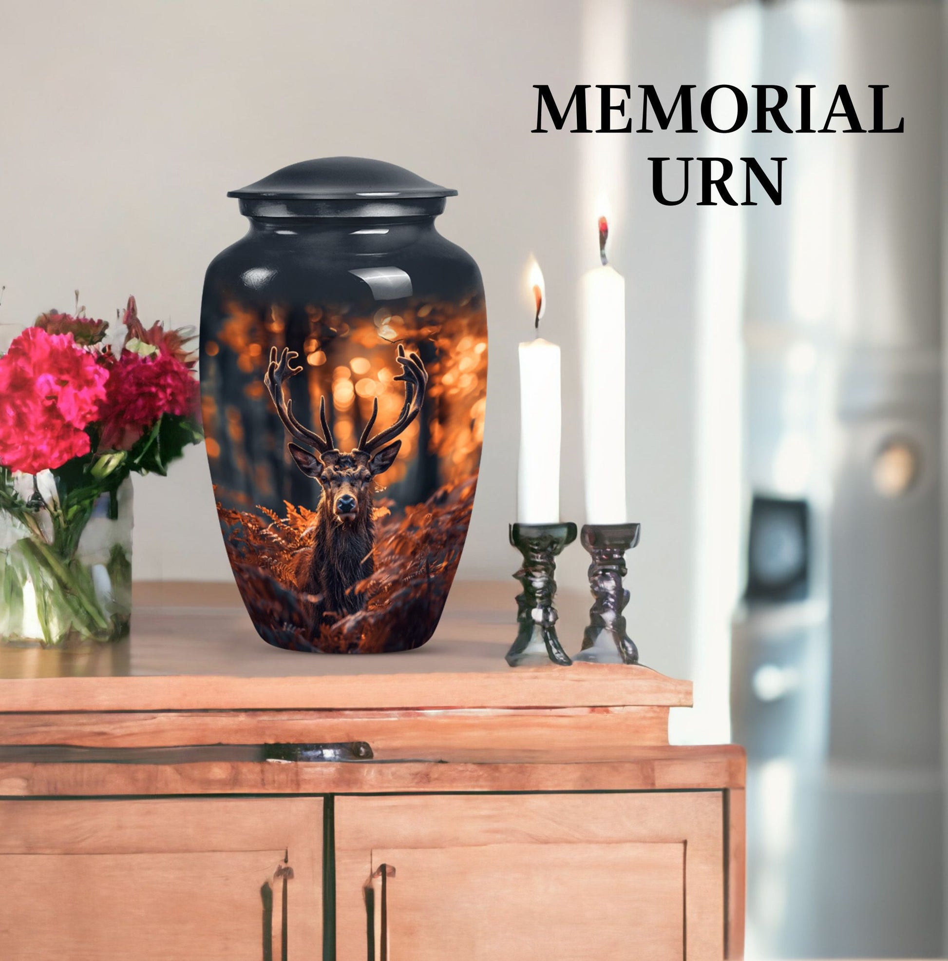 Memorize your loved ones and pay homage with our exquisite deer urn, an impressive piece of memorial ceremony supplies. This cremation urn is carefully crafted from sturdy aluminium to stand as a resilient, caring memorial to the departed. It is a Large Urn that stands at 10 inches and carries a significant 200 cubic inches capacity, making it an ideal cremation urn for adult ashes. Weighing just 3.3 pounds, this burial urn for cremation is easy to handle. Alongside the urn, you'll receive a velvet pouch, serving as a respectful containment for the ashes. Advancing its uniqueness, our multipurpose urn offers a unique Gramophone theme and allows for personalized engravings of names to keep the memories alive. Let this funeral urn lovingly reflect the personality and essence of your loved one. Please note that the design does not come into play in the product description, focusing instead on quality and the sentiment it embodies.