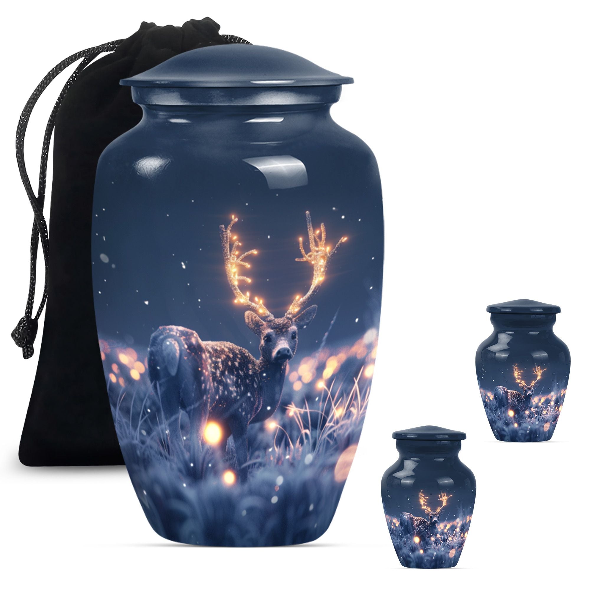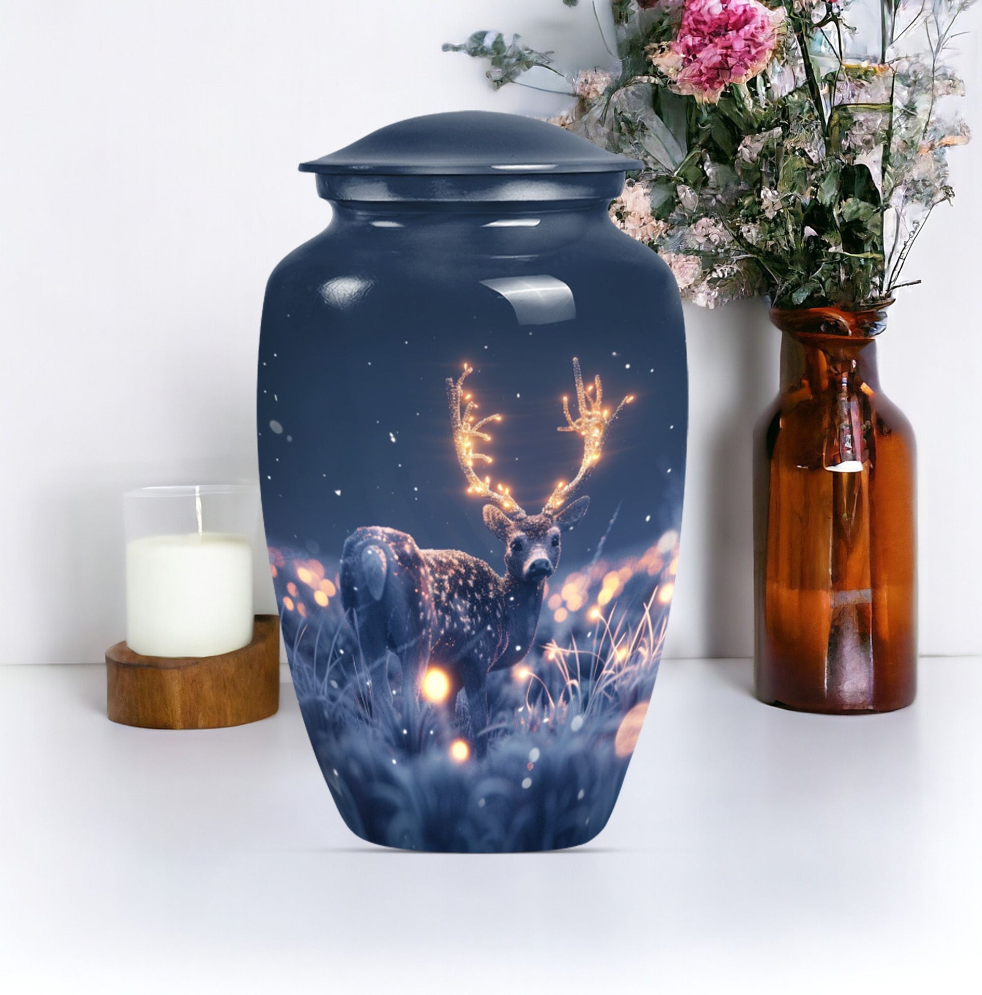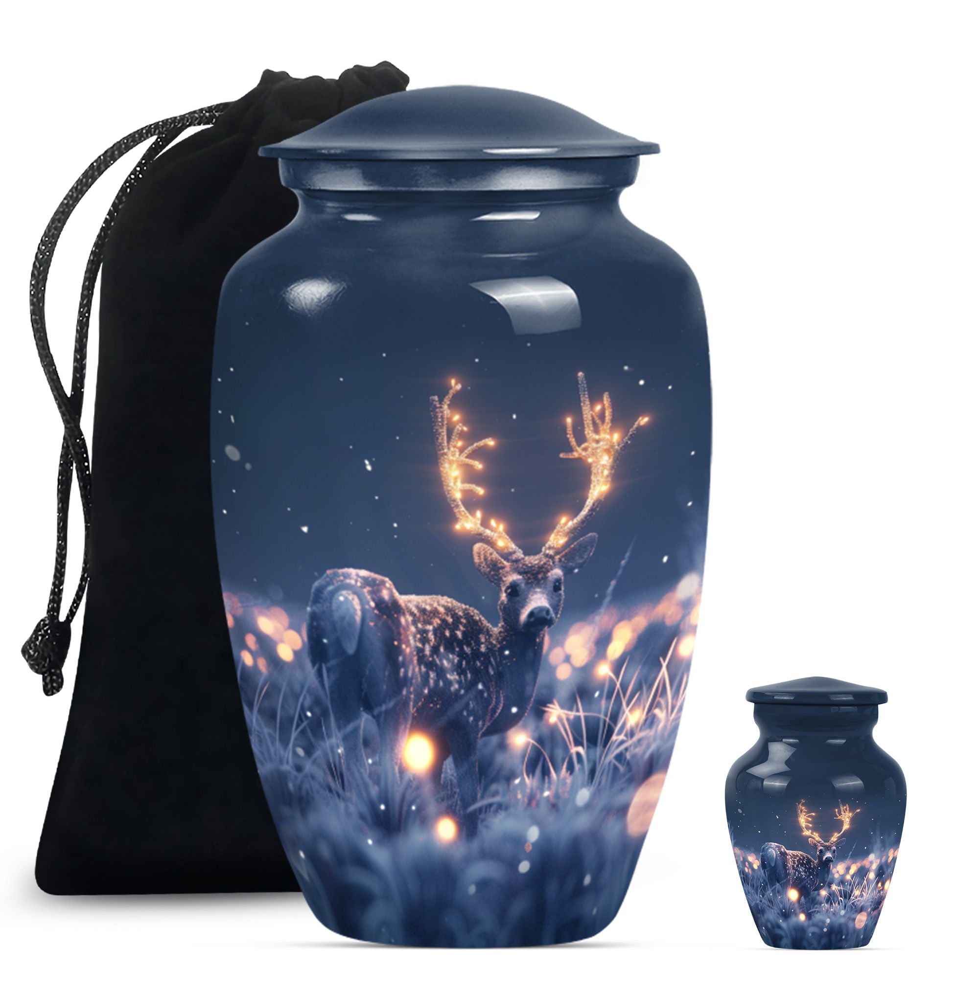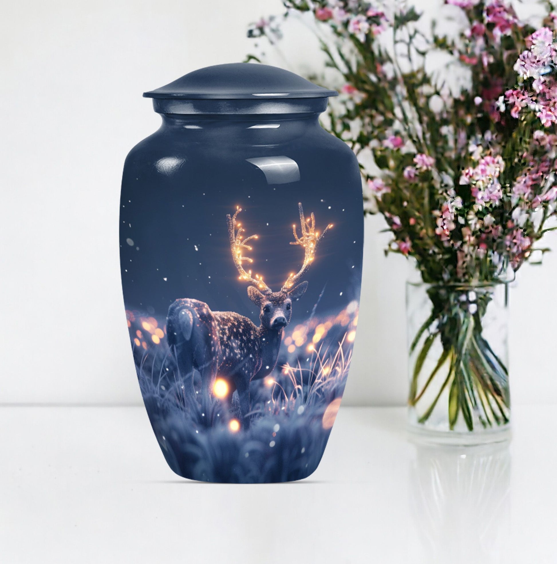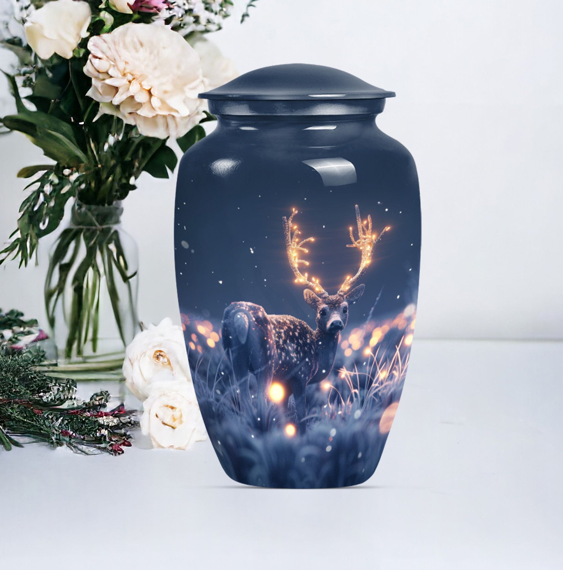 Embrace the serene beauty of our 'Wolf Howling' Deer Urn. This large, aluminium 10-inch urn is specifically designed for the ideal memorialization of your loved ones. Weighing in at a solid 3.3 pounds, it has a remarkable capacity of 200 cubic inches, suitable for the containment of adult ashes. Apart from its impressive stature, what makes this burial cremation urn unique is the thematic depiction of a wolf howling, symbolizing a deep, spiritual call, a touching tribute to a departed life. The urn includes a complimenting velvet pouch serving as a safe, respectful space to hold the ashes. Not just a container, this urn allows you to personalize your tribute with engraved names, adding to the intimacy of the memento. It's more than just one among women's cremation urns, it’s an encapsulation of love, respect and remembrance. This 'Wolf Howling' urn asserts its presence with dignity and grace, seamlessly capturing the essence of an eternal resting place.