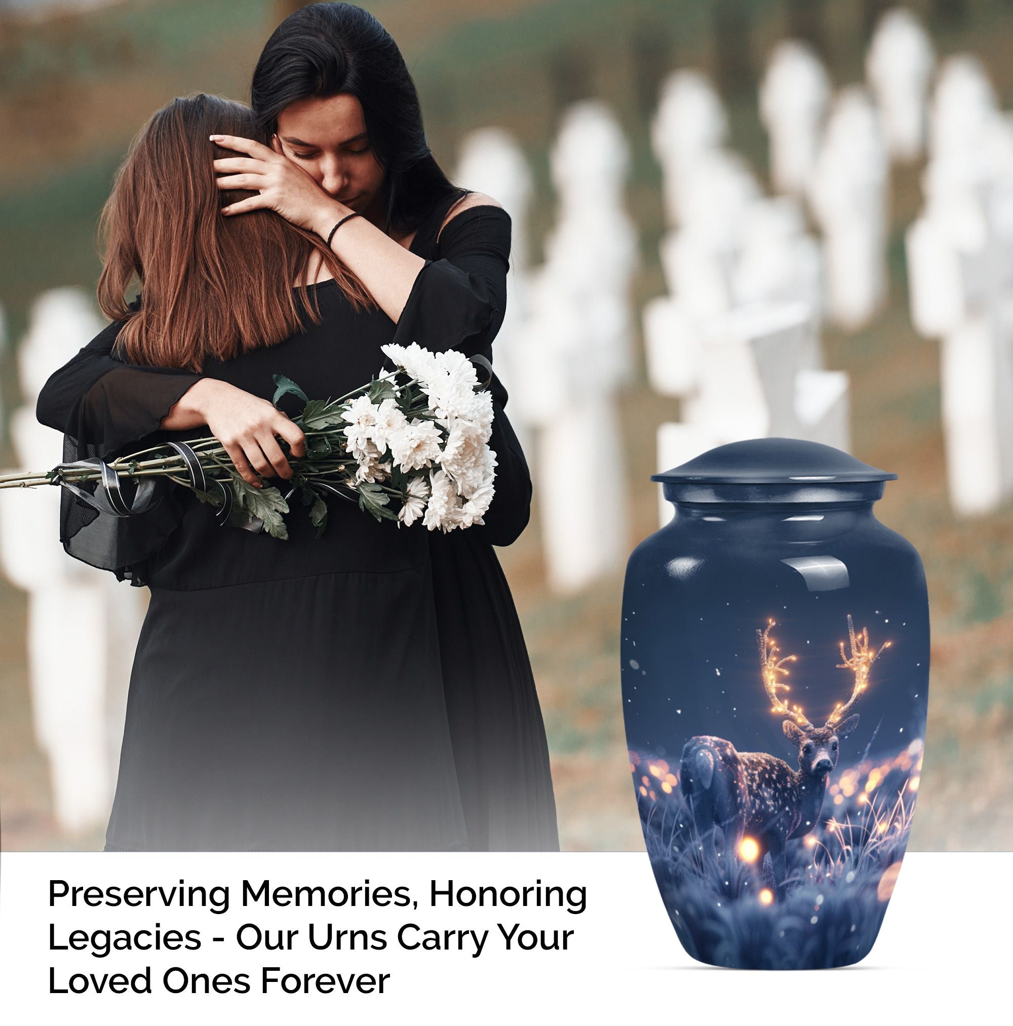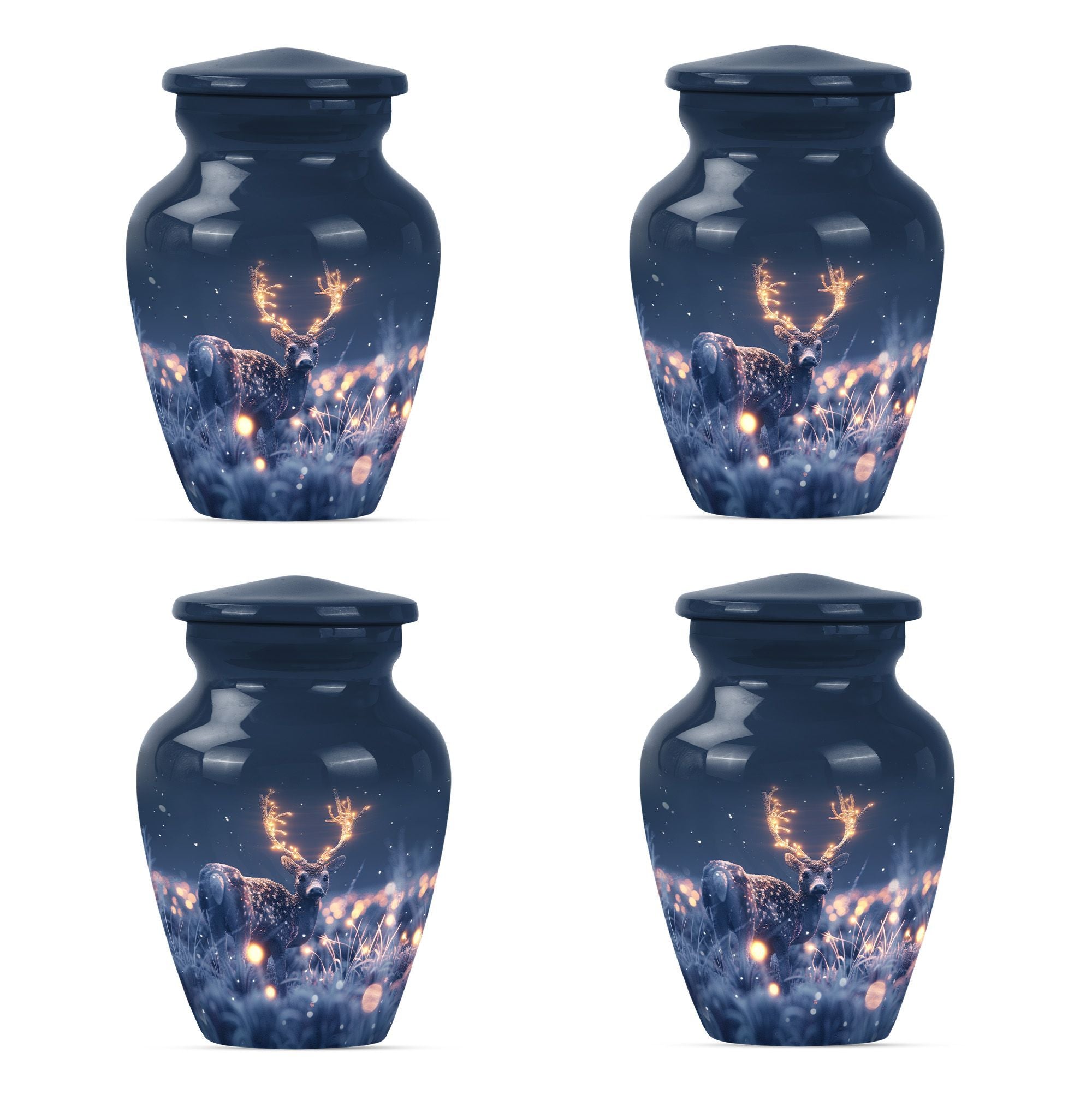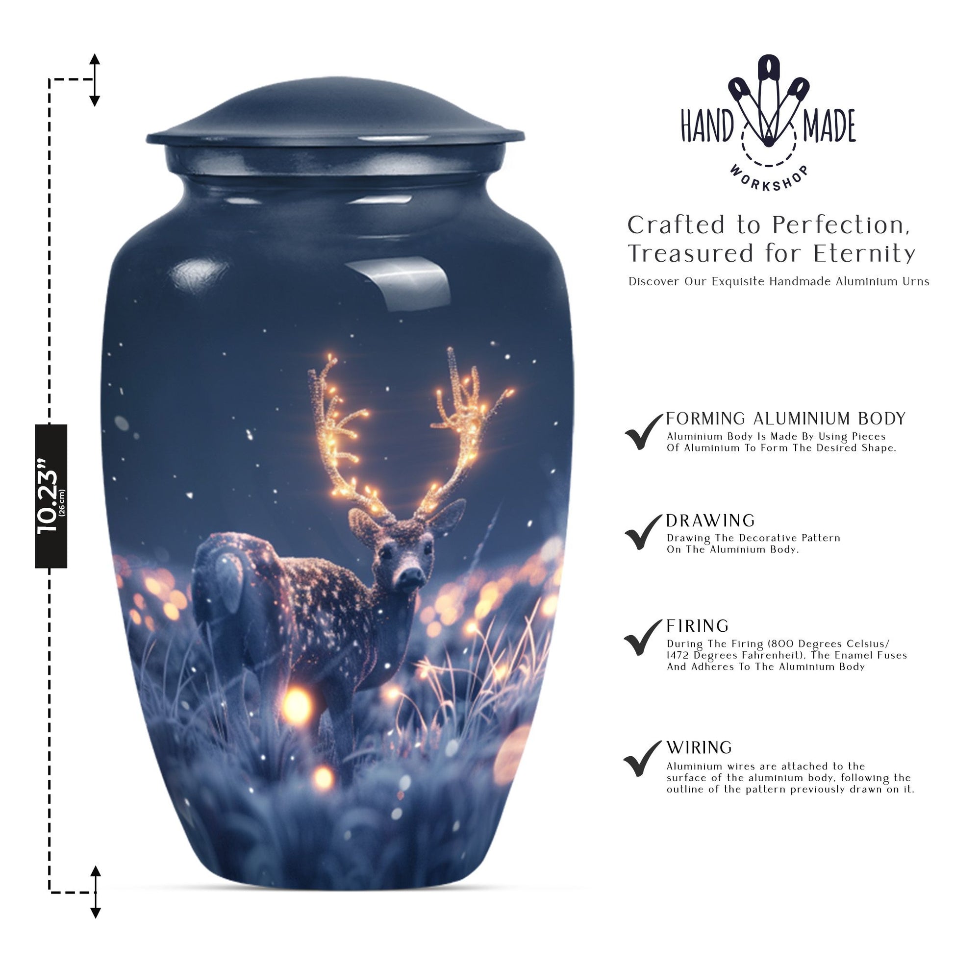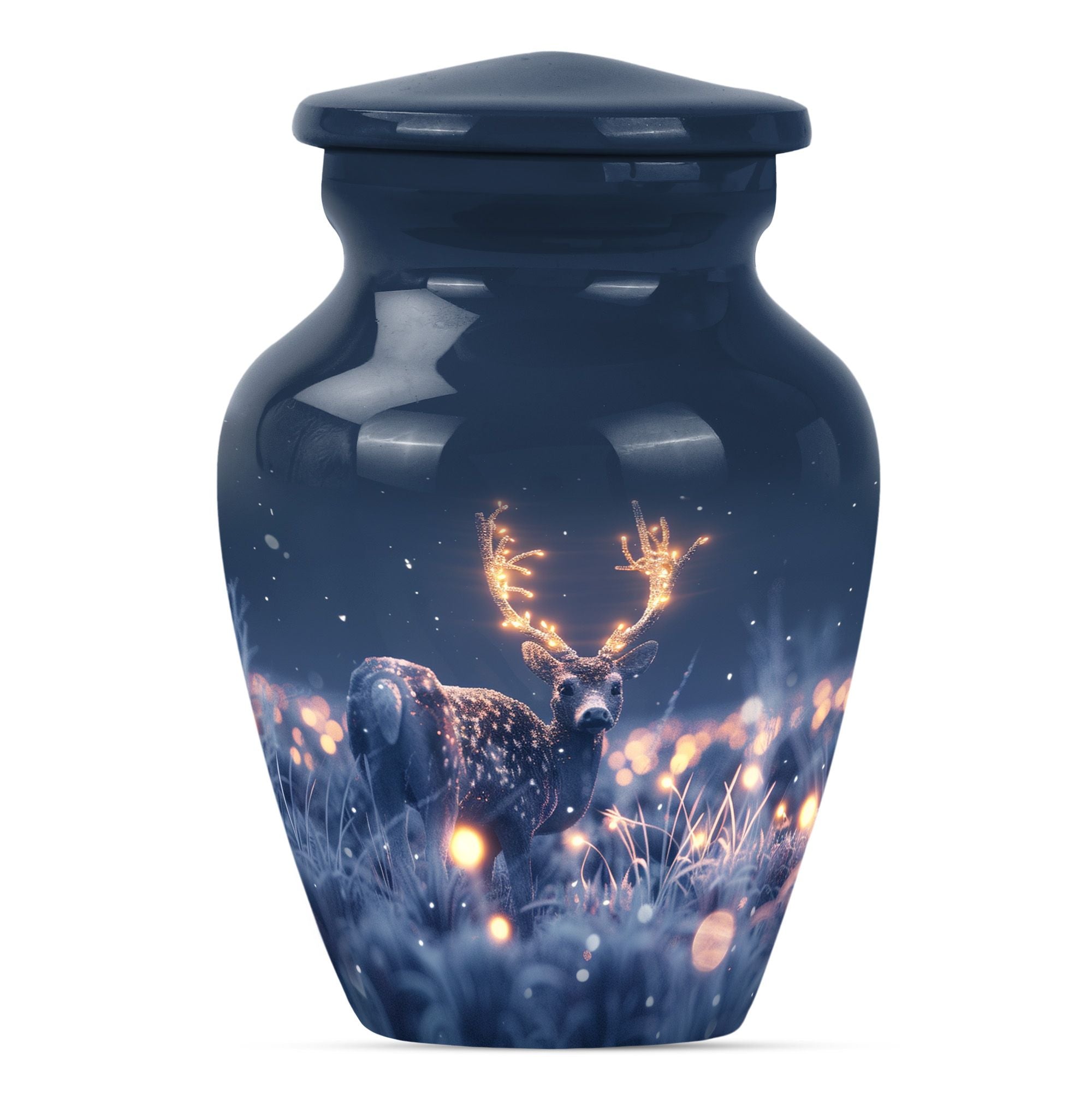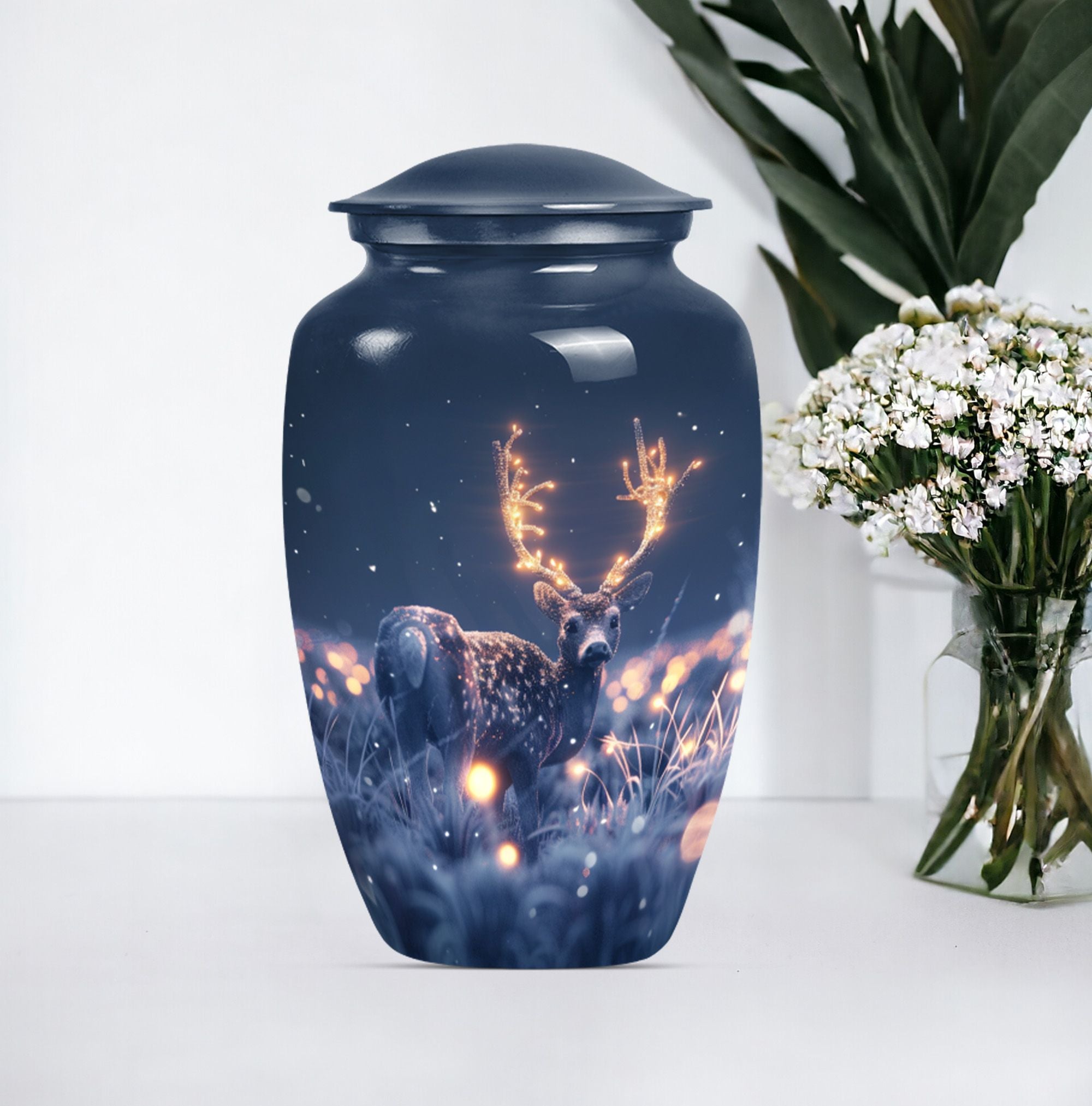 Embrace the serene beauty of our 'Wolf Howling' Deer Urn. This large, aluminium 10-inch urn is specifically designed for the ideal memorialization of your loved ones. Weighing in at a solid 3.3 pounds, it has a remarkable capacity of 200 cubic inches, suitable for the containment of adult ashes. Apart from its impressive stature, what makes this burial cremation urn unique is the thematic depiction of a wolf howling, symbolizing a deep, spiritual call, a touching tribute to a departed life. The urn includes a complimenting velvet pouch serving as a safe, respectful space to hold the ashes. Not just a container, this urn allows you to personalize your tribute with engraved names, adding to the intimacy of the memento. It's more than just one among women's cremation urns, it’s an encapsulation of love, respect and remembrance. This 'Wolf Howling' urn asserts its presence with dignity and grace, seamlessly capturing the essence of an eternal resting place.
