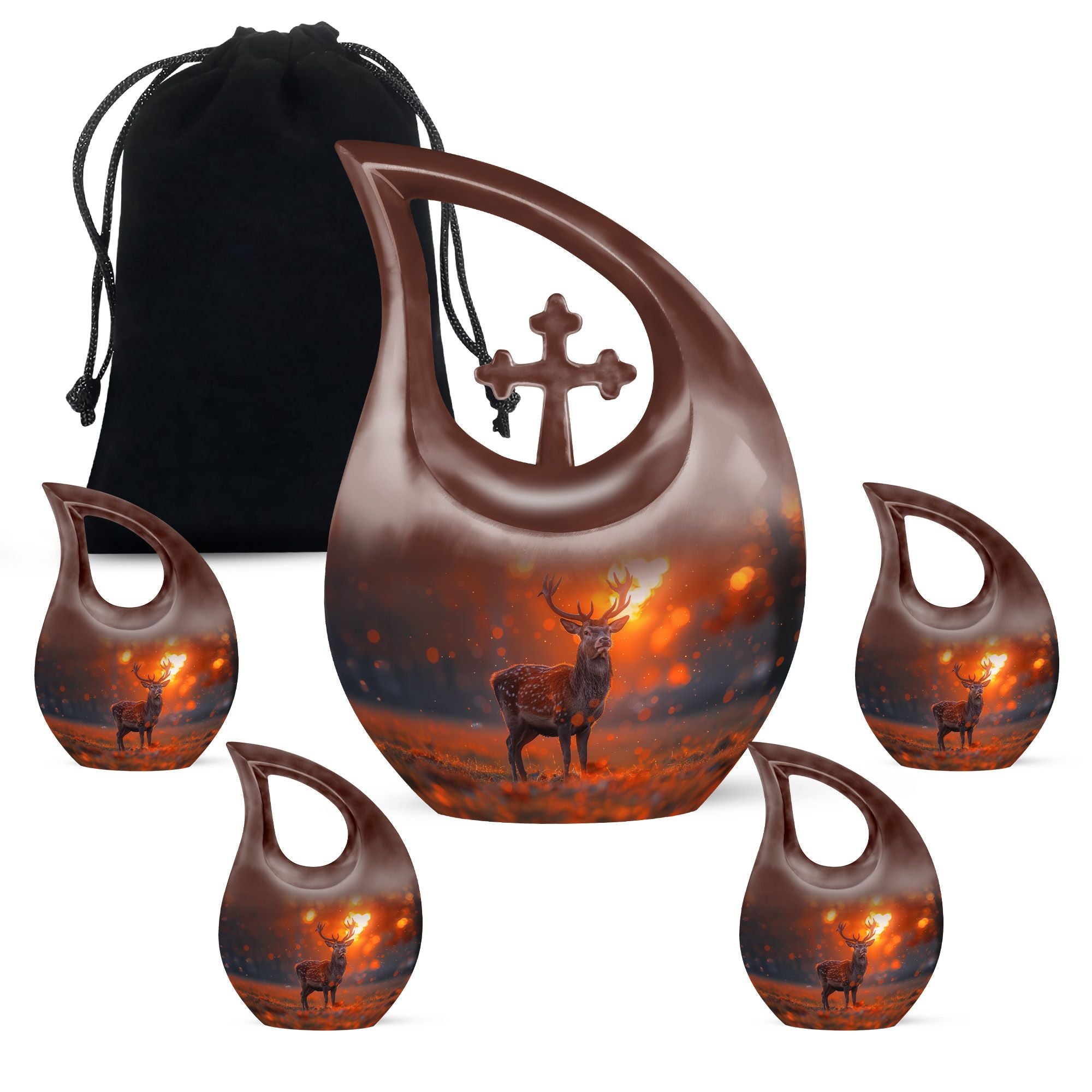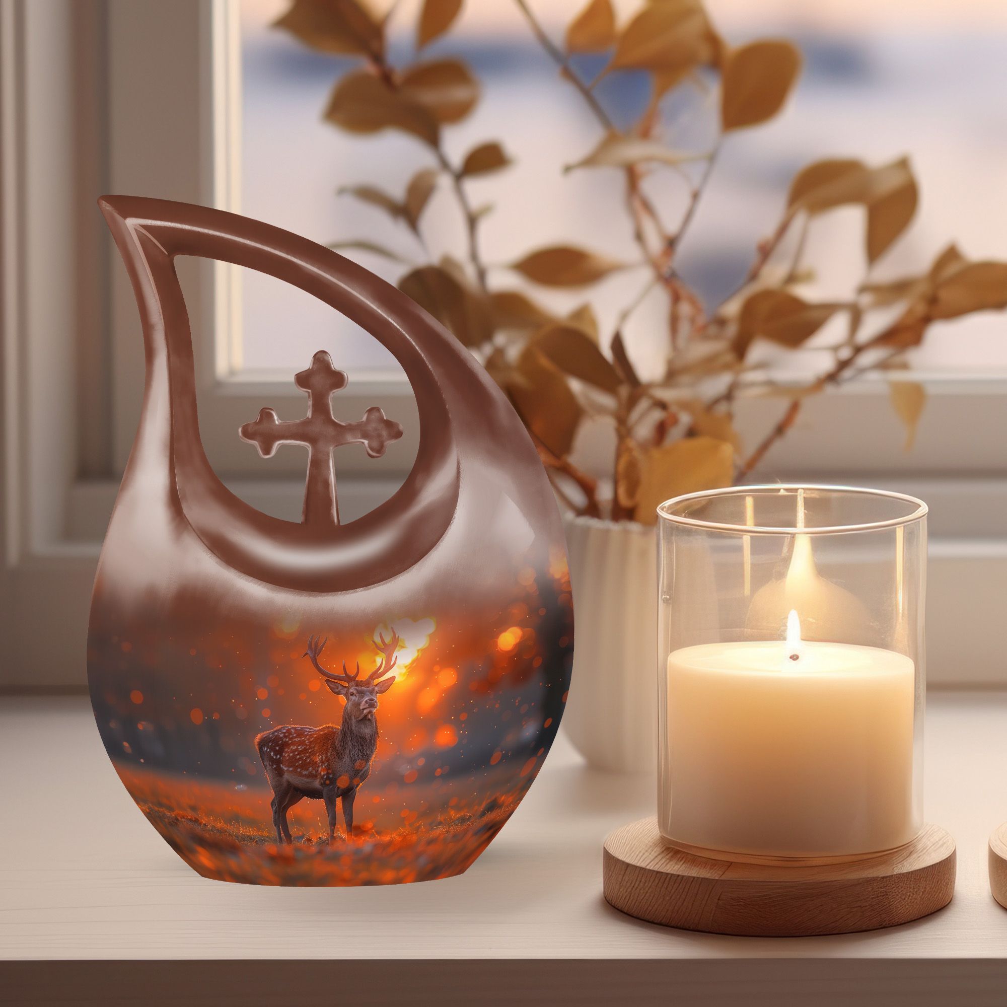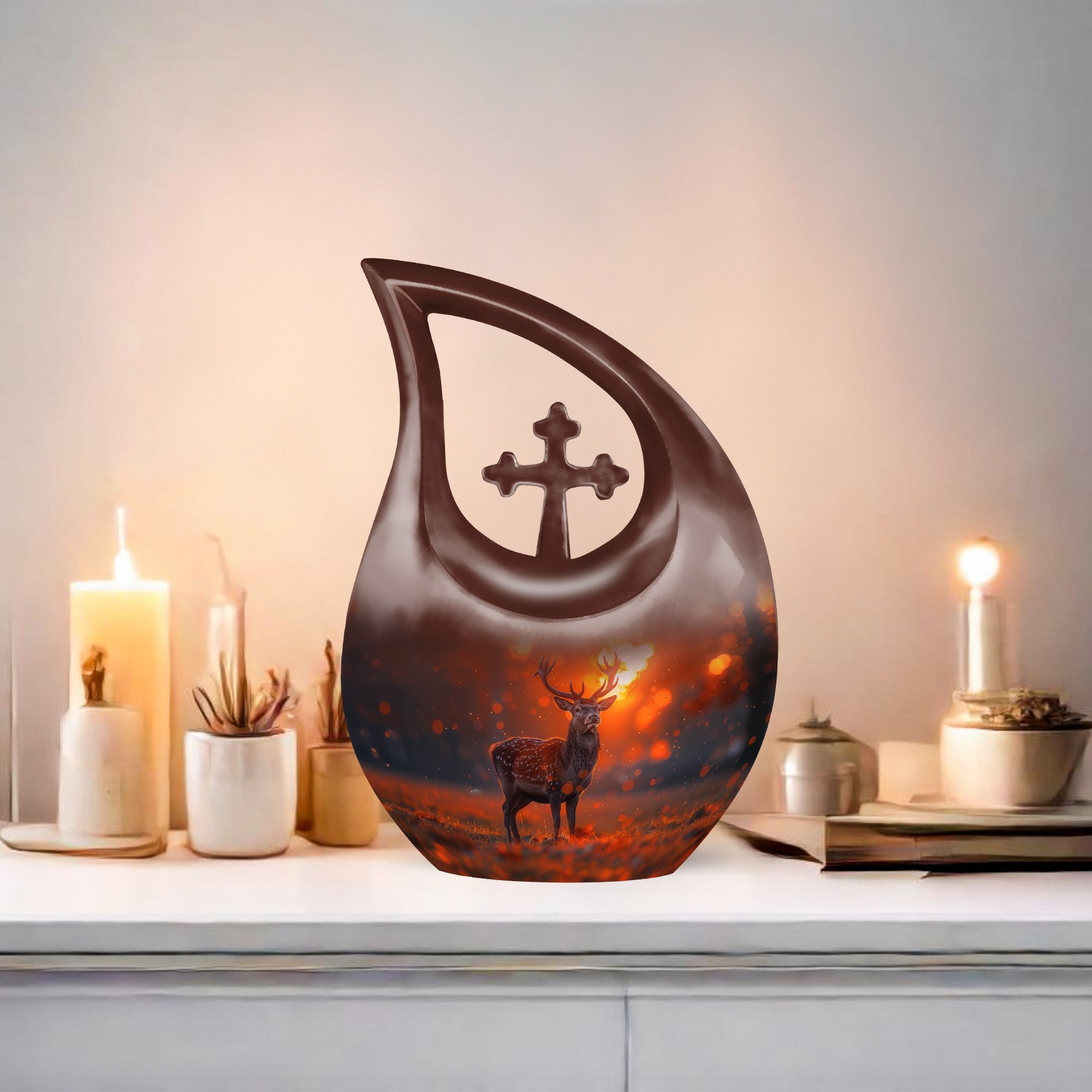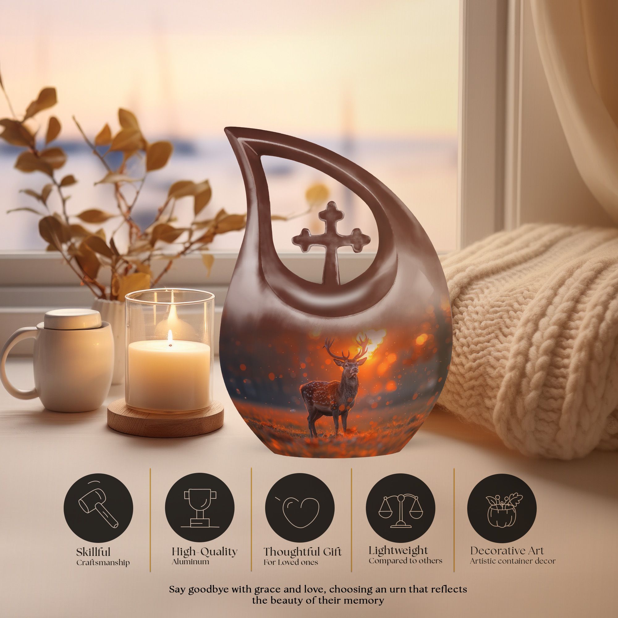 Your search for an intimate and respectful symbol of remembrance ends here with our aluminium Deer Urn. The beautifully crafted Cross-Drop design brings a sense of peaceful tranquillity. Perfect for adults and seniors, this Large Urn stands tall at 10 inches and holds up to 200 cubic inches, approximating the ashes of an individual weighing 200 lbs. The urn resonates with peace and has a weight of 3.3 pounds, ensuring stability. It comes complete with a velvet pouch that delicately enfolds the crucial content securely. Tommy’s Utterly Unique Urns offers an extraordinary way to keep your beloved's memories alive with our biodegradable urn, which can be customized with engraved names, making this memorial even more personal. It beautifully accommodates the ceremony supplies required during these poignant times. Please note, the 'Deer' theme signifies nobility, renewal, and creation, so as you explore the keepsake urns for human ashes or small urns for human ashes, remember, our urns for cremation ashes offer a respectful tribute and an elegant resting place. Purple in wildlife signifies richness and royalty, making the Purple Urn a premium choice in memorial urns.