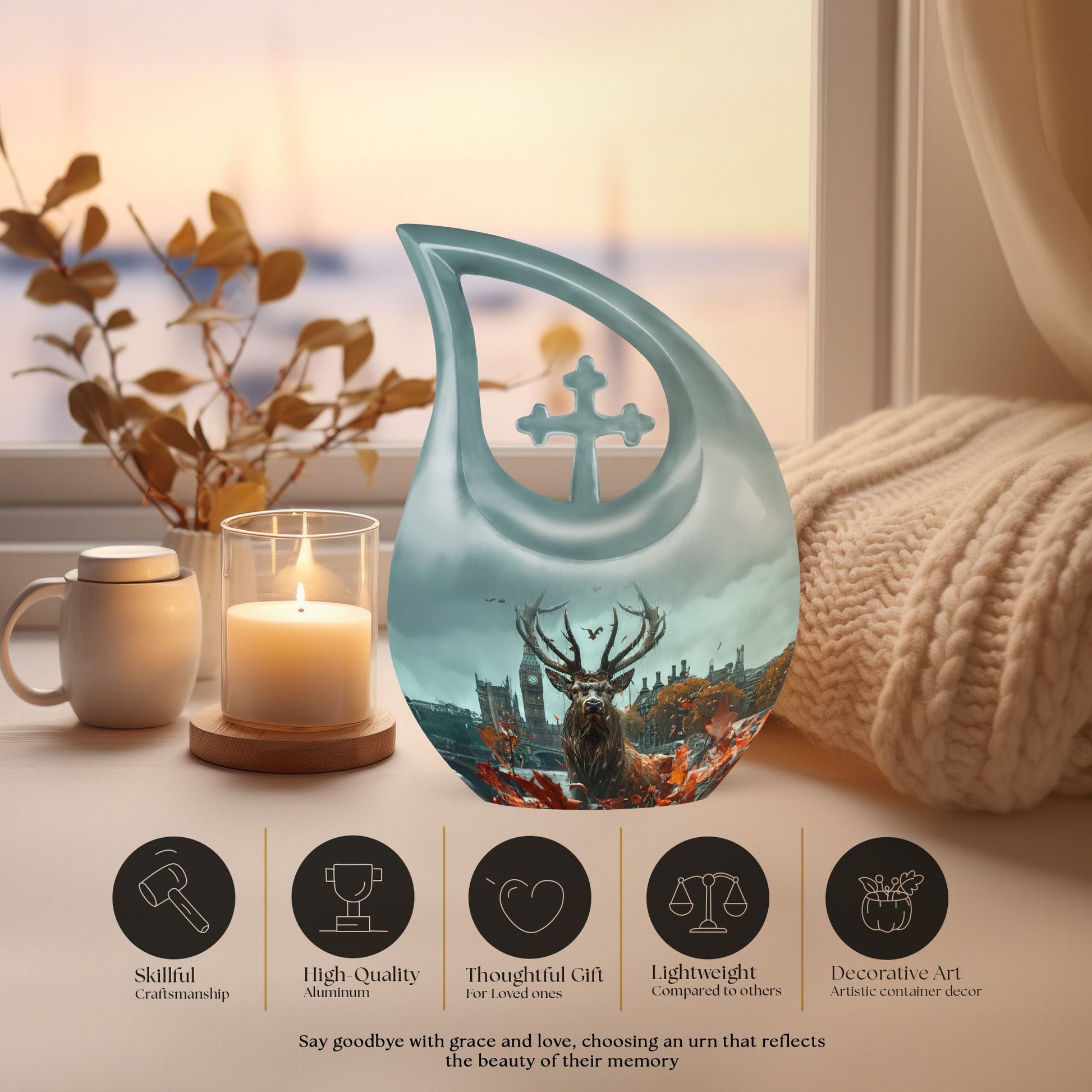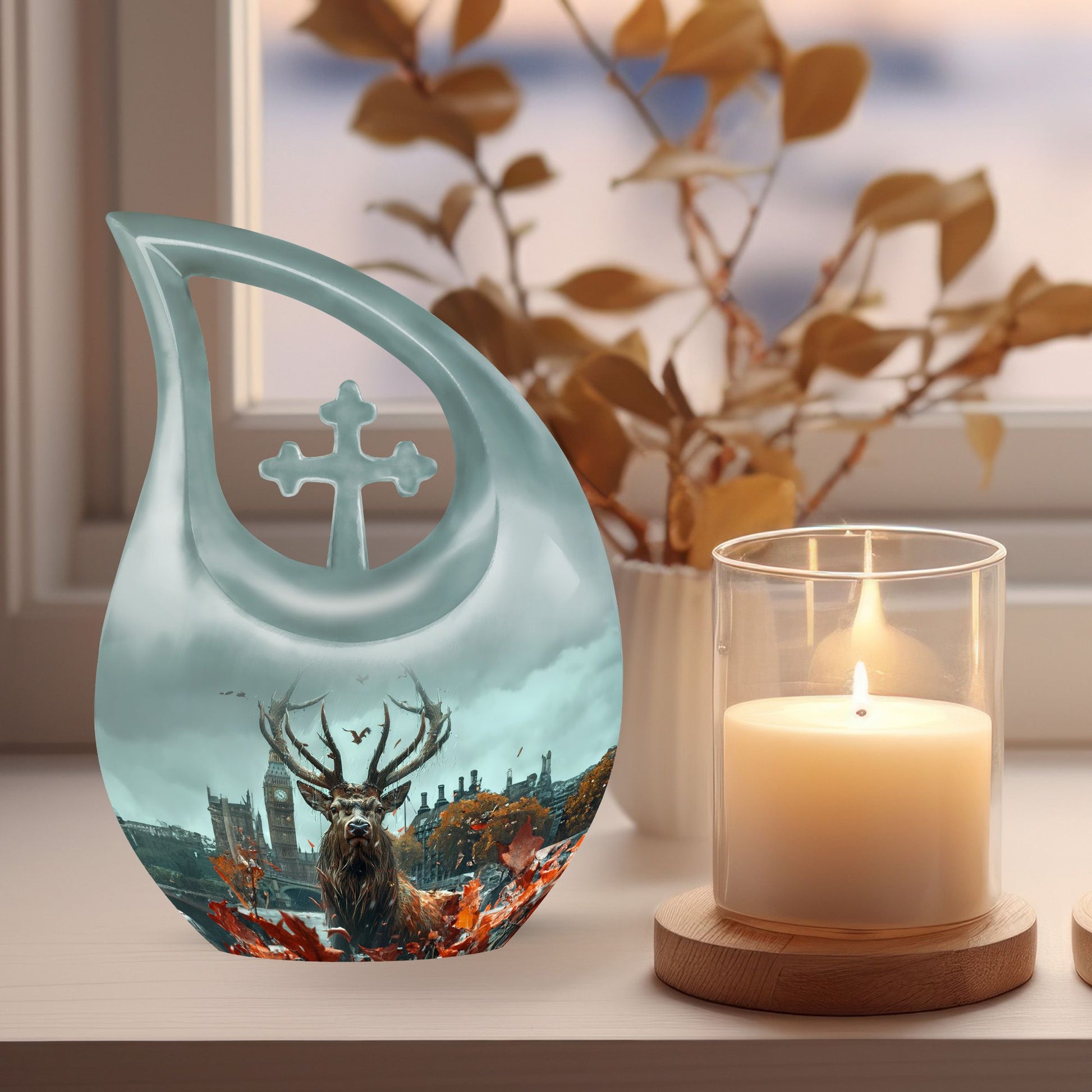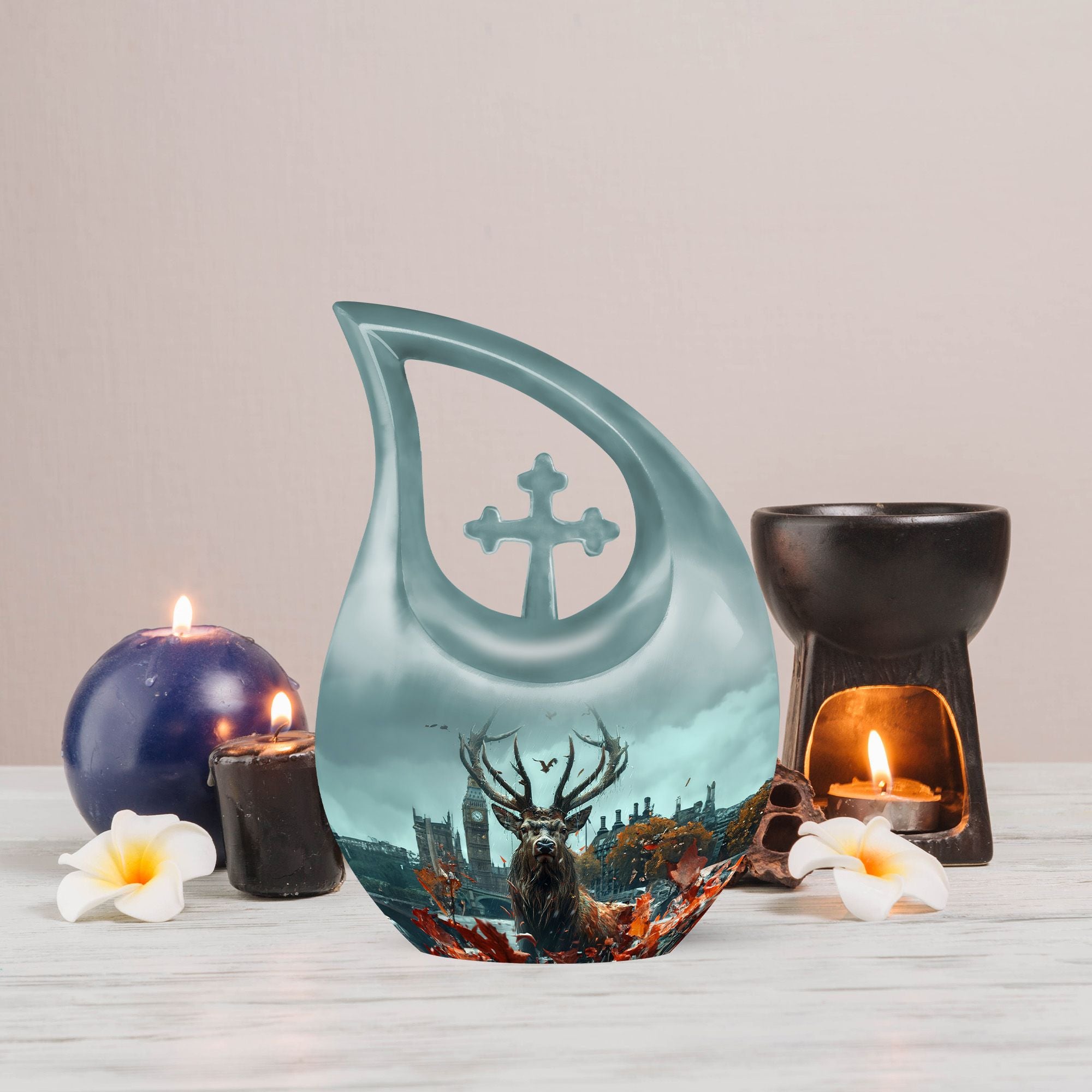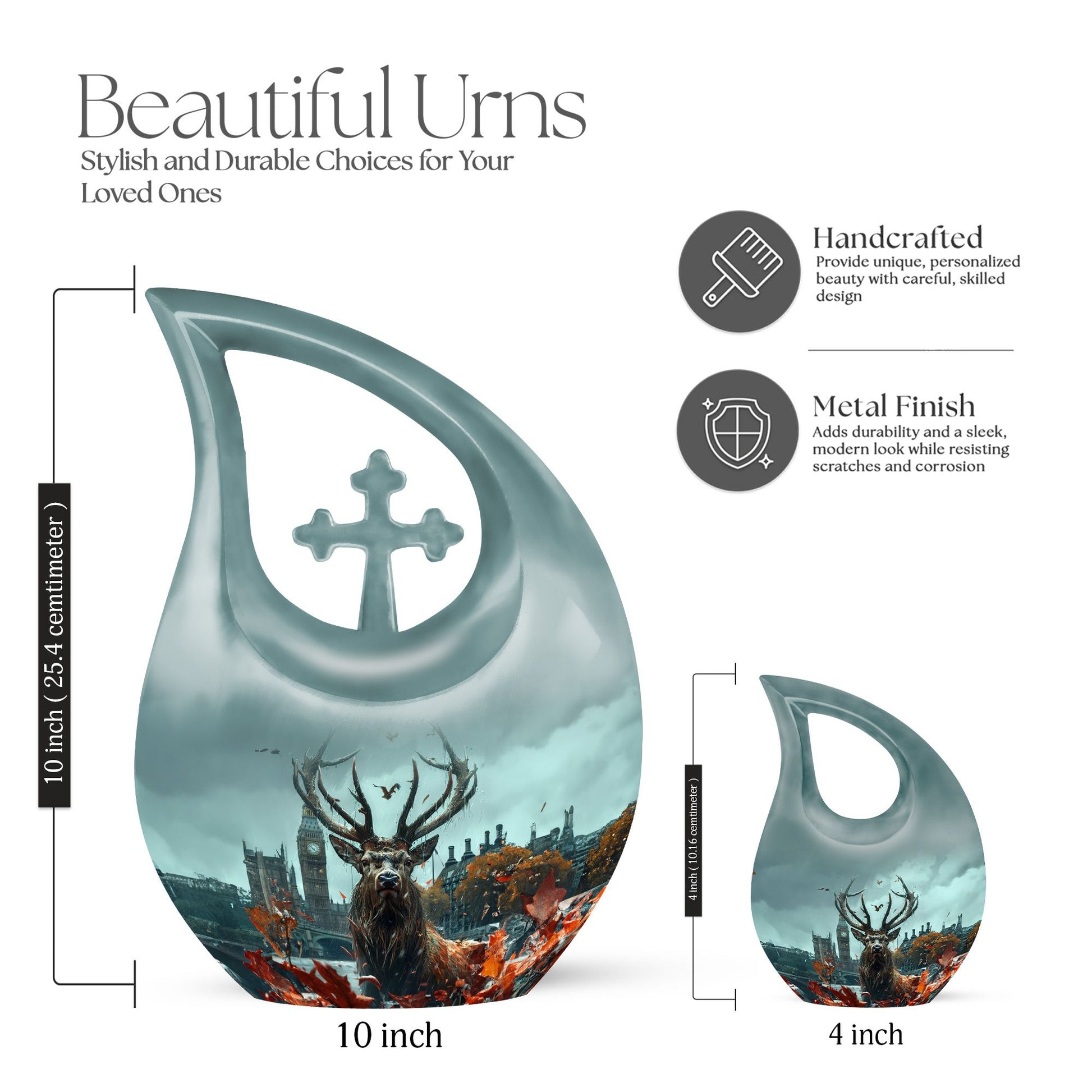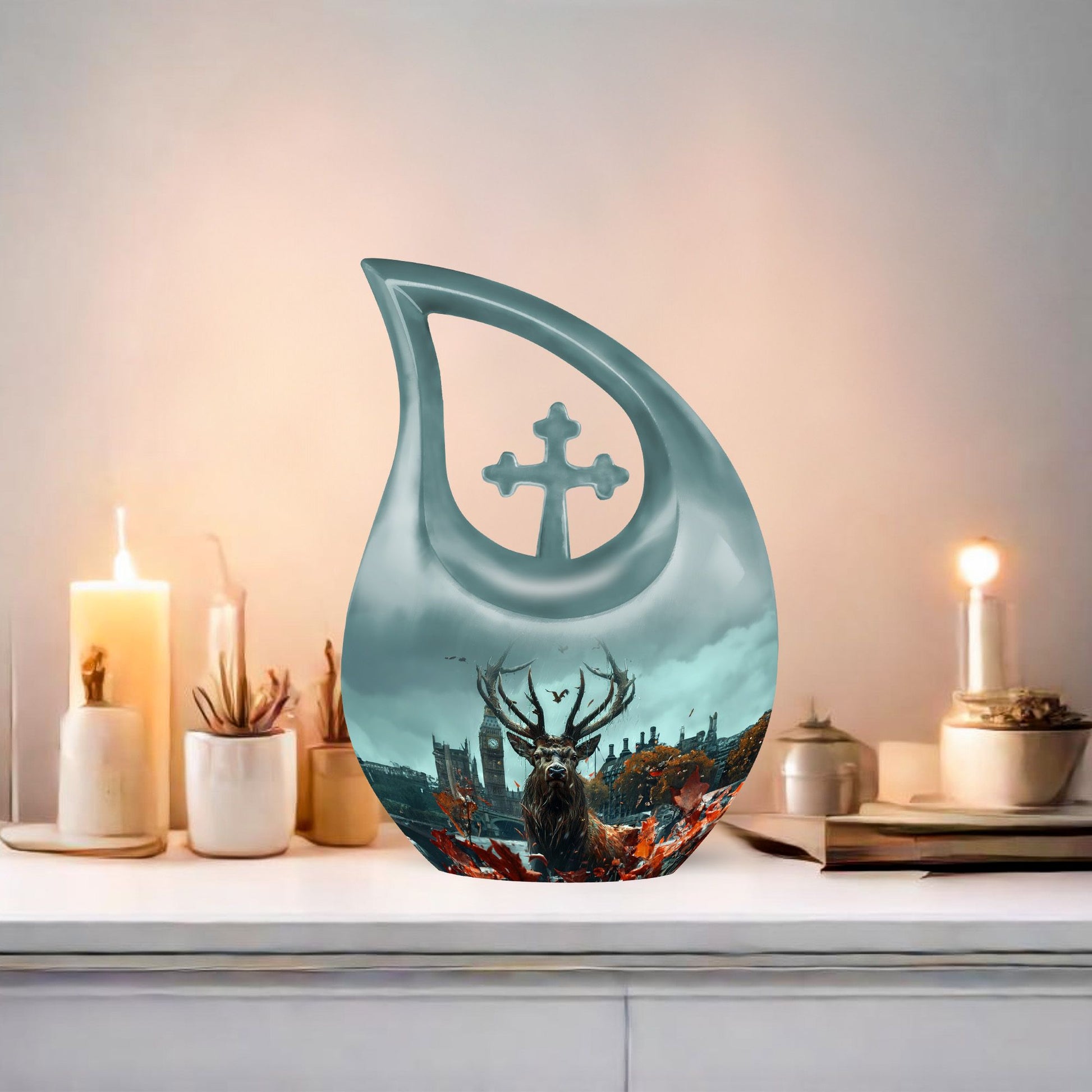 Discover our unique, large-sized Deer Urn, a thoughtful tribute to honor your loved one's memory. This urn, weighing a comforting 3.3 pounds, stands tall and dignified at 10 inches, providing a capacity to hold 200 cubic inches of ashes. Meticulously crafted from resilient aluminium, this remarkable memorial piece stands the test of time, evoking a sense of enduring serenity. The accompanying velvet pouch ensures a secure containment of the ashes, further cementing the urn's value. Standing out is its 'Cross Drop' shape - a sincere nod to the spiritual sentiment carried by the urn and heightening its serene demeanor. Further, we offer you the ability to add a personal touch by engraving names to your liking - making this offering not only an affordable burial urn but also a distinctive one. Distinguished as one of the exceptional custom urns for ashes in the market, it is a wonderful blend of respectful solemnity and artistic elegance. Complement your memorial ceremonies with this unique symbol of remembrance.