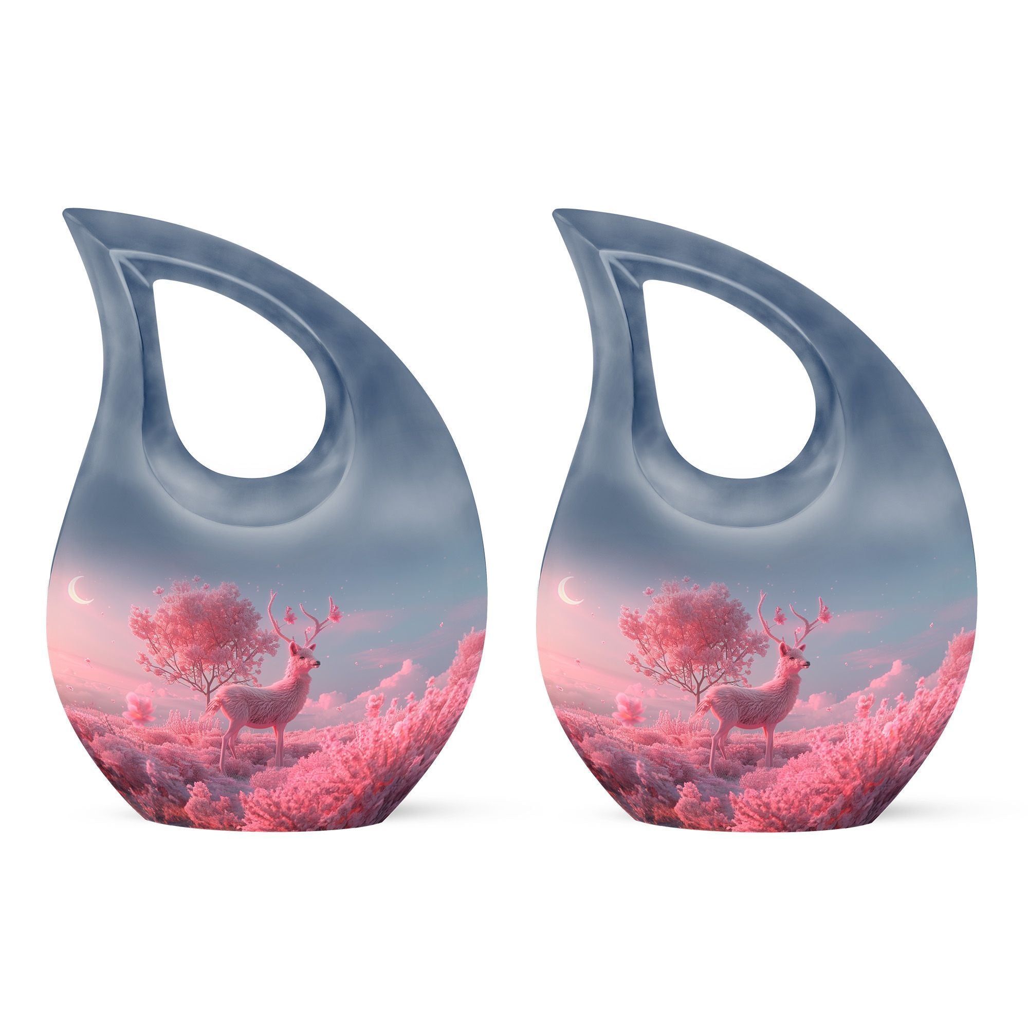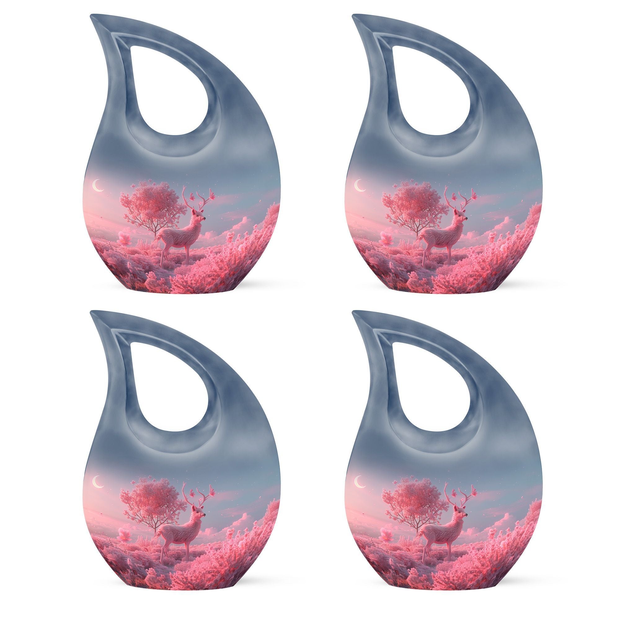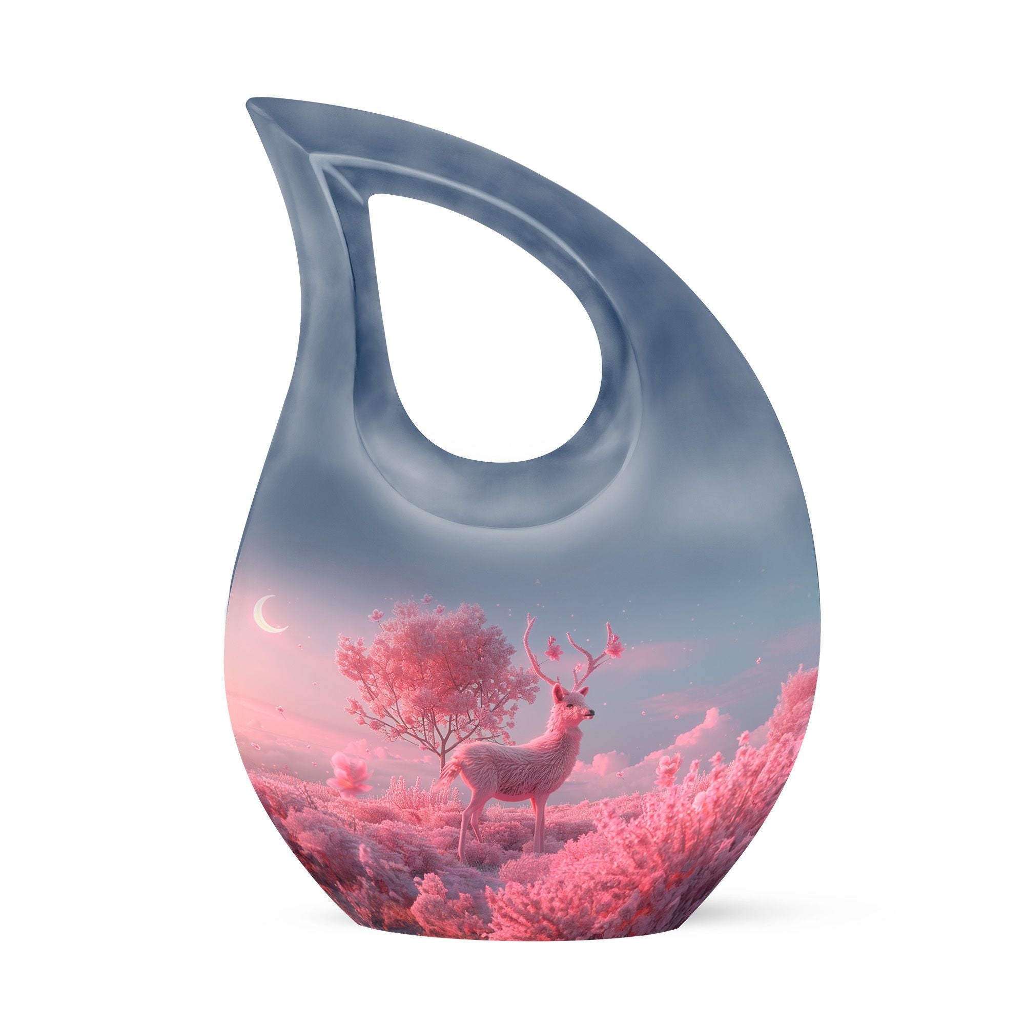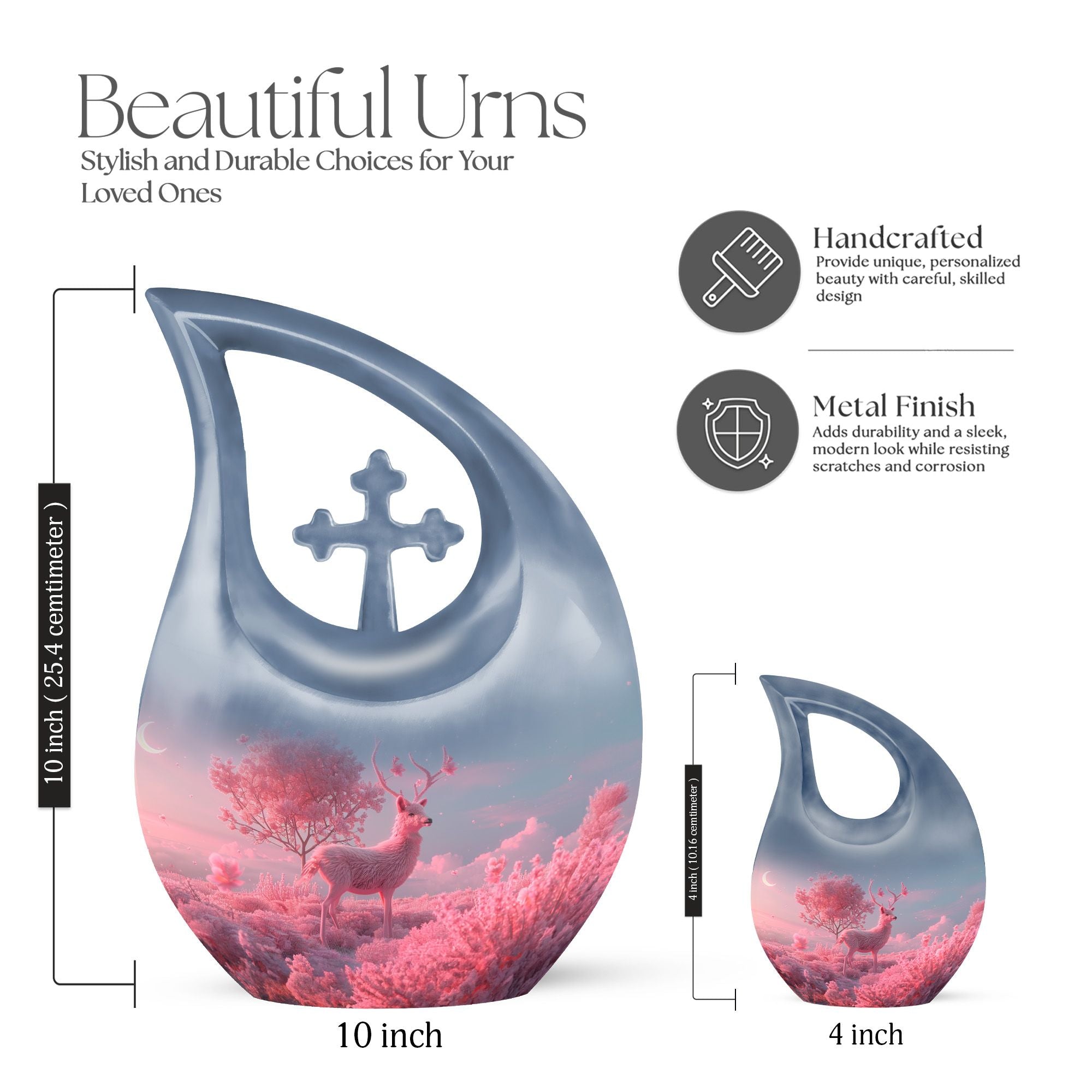 Experience the calming reassurance of a last loving tribute to your cherished one with our large Deer Urn. With a capacity of 200 cubic inches, this sizable urn for ashes provides a fitting remembrance to commemorate their life. Thoughtfully crafted from durable aluminium, it stands at 10 inches, beautifully displaying its classic Cross Drop motif. Its unique Deer theme brings an added touch of tranquility, evoking a heavenly aura. The urn comes with a velvet pouch for respectful containment of the ashes, and for an even deeper connection, you can personalize this memorial piece with engraved names. Weighing 3.3 pounds, its sturdy construction ensures its lasting presence as a beacon of loving memories. As a distinctive representation of memorial urns, the Deer Urn will provide a peaceful place for cherished memories to reside. An elegant remembrance piece in the lineup of urns for ashes, custom urns, and keepsake urns.