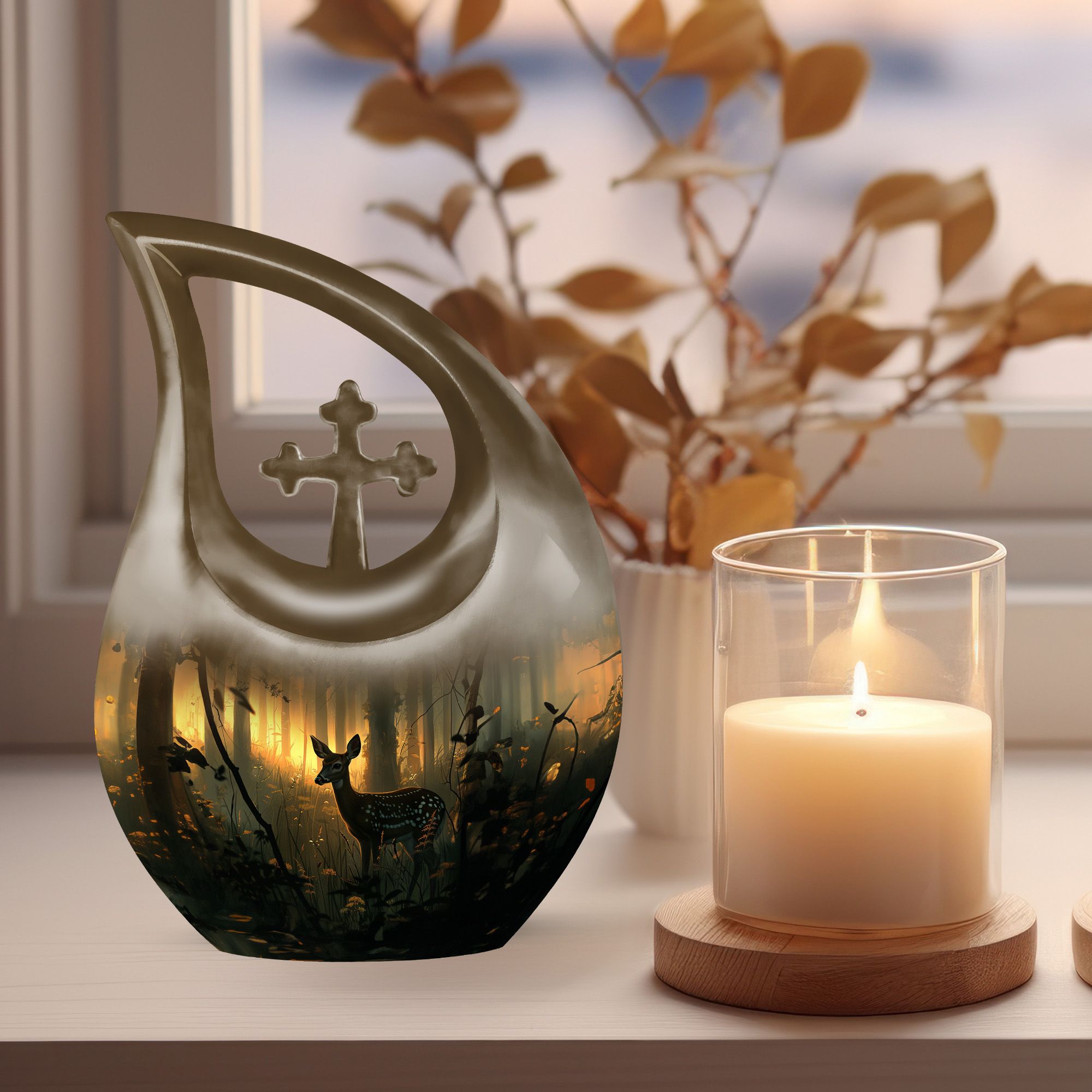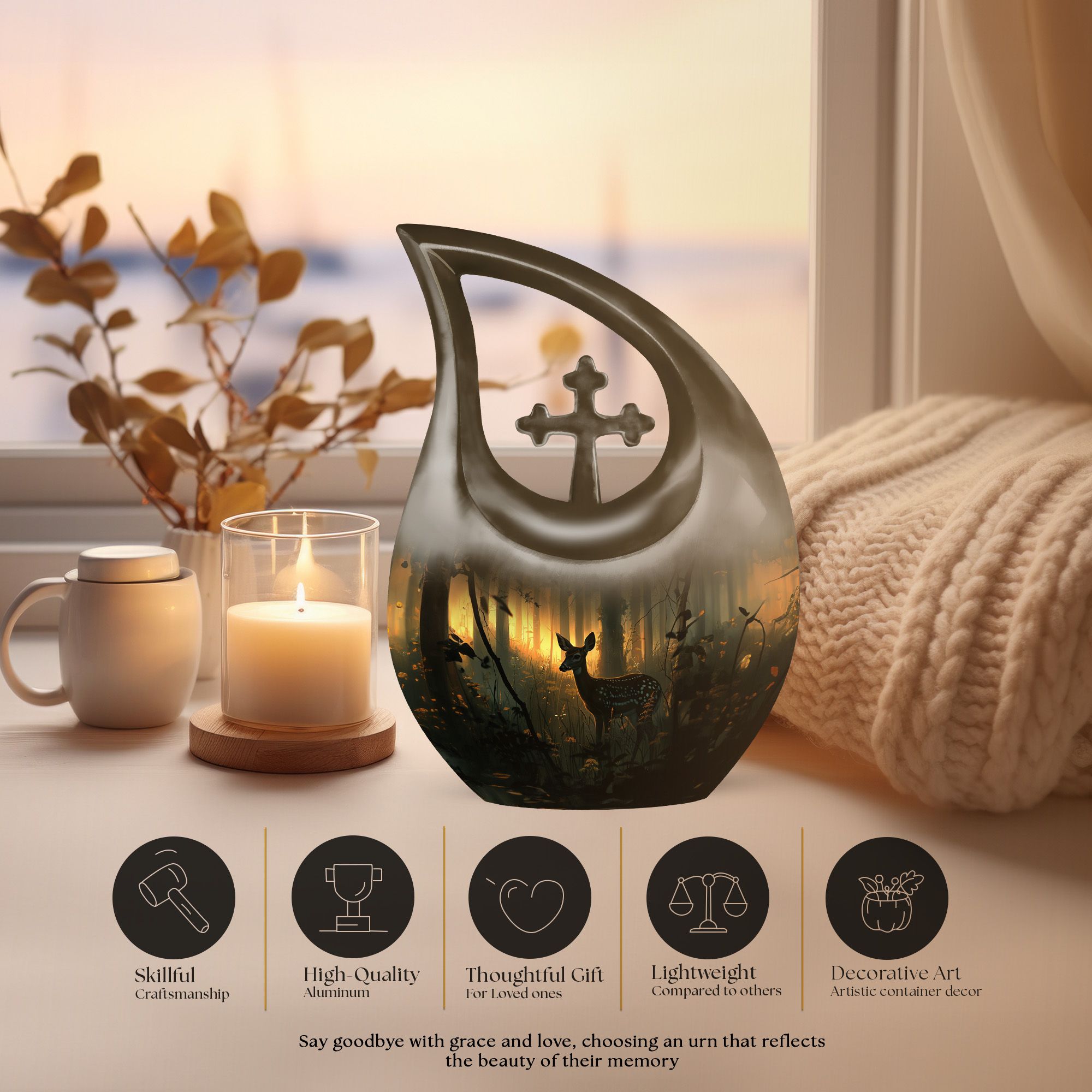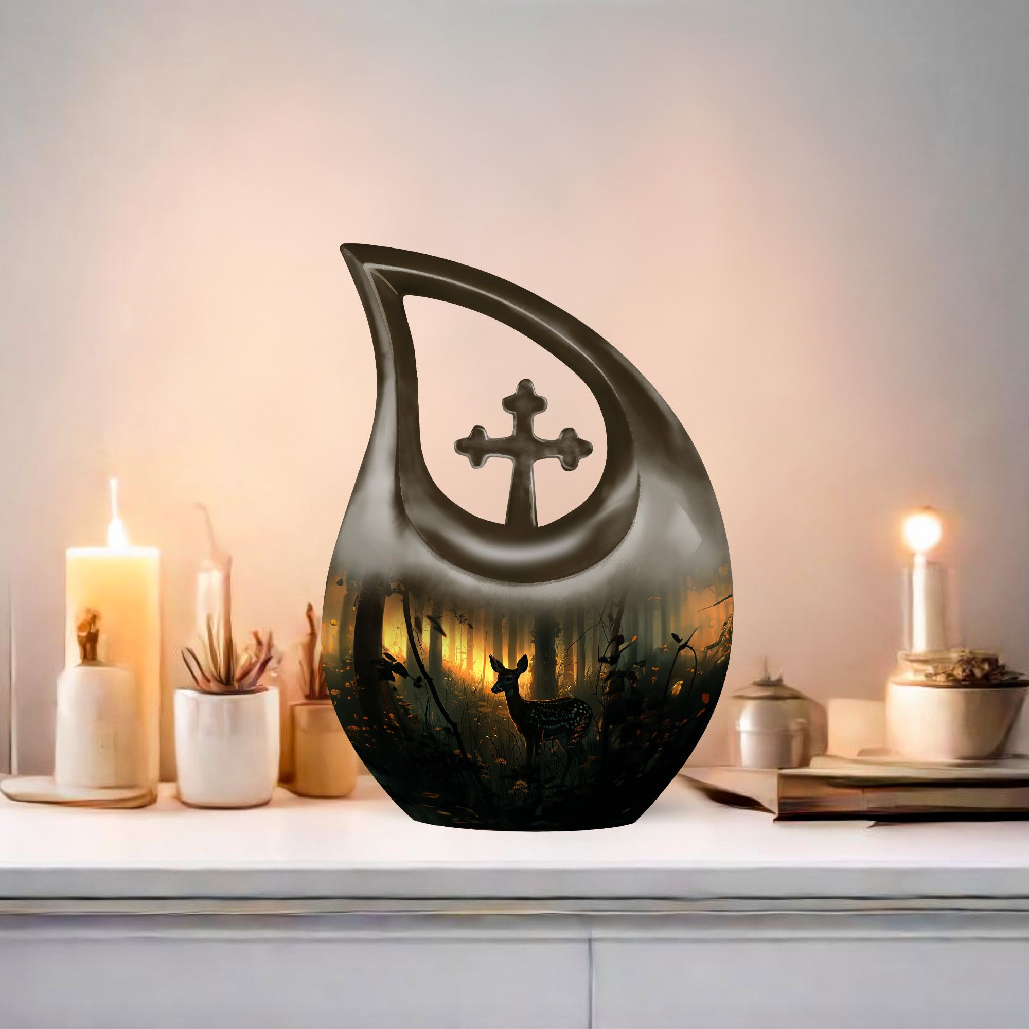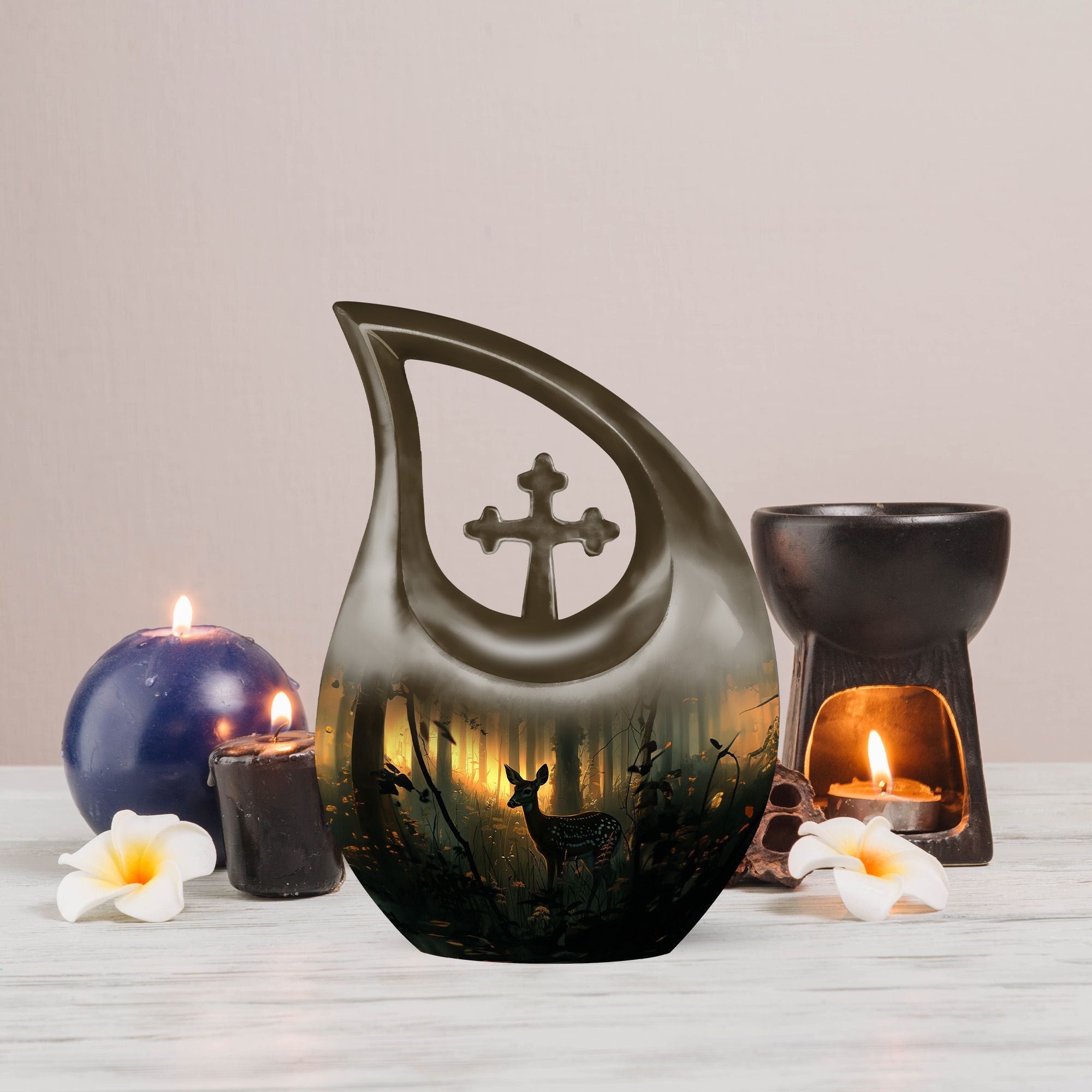This Deer Urn, rightfully proclaimed as one of the best urns for ashes, is an exemplary product in our range of memorial urns for those seeking a unique and gentle tribute. Crafted from durable aluminium material, it boasts a rare Cross Drop layout that does not perceive its design, ensuring the urn reflects a design of your choice. It stands at 10 inches tall and weighs a sturdy 3.3 pounds. The generous capacity of this keepsake can hold up to 200 cubic inches of ashes within. The Deer Urn comes along with a complimentary velvet pouch for a discreet and secure containment of ashes. The unique feature of the Urn remains in the customization option it provides -You are free to engrave names for personalization. Notably, our urns make ideal choices for large urns, cremation containers, cremation boxes, burial urns and more. Remember your loved ones in the manner they deserve.