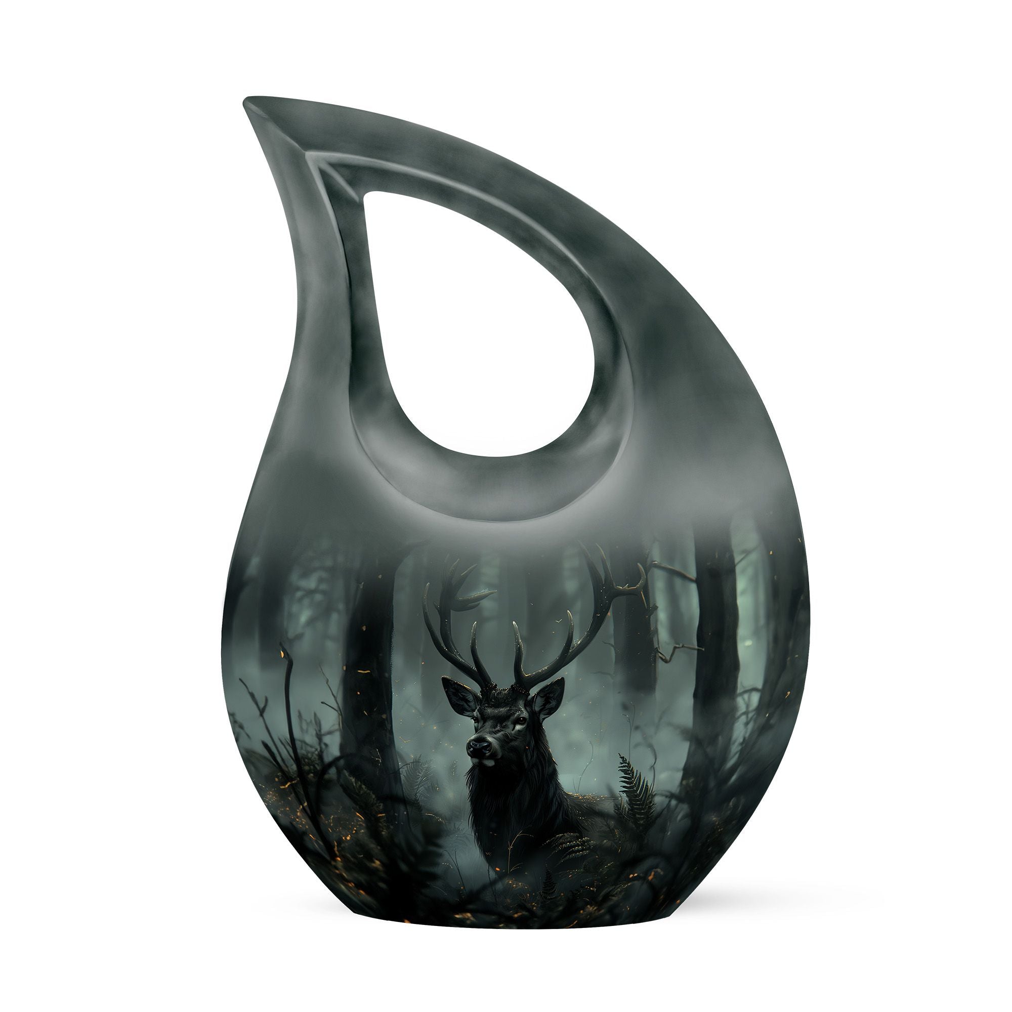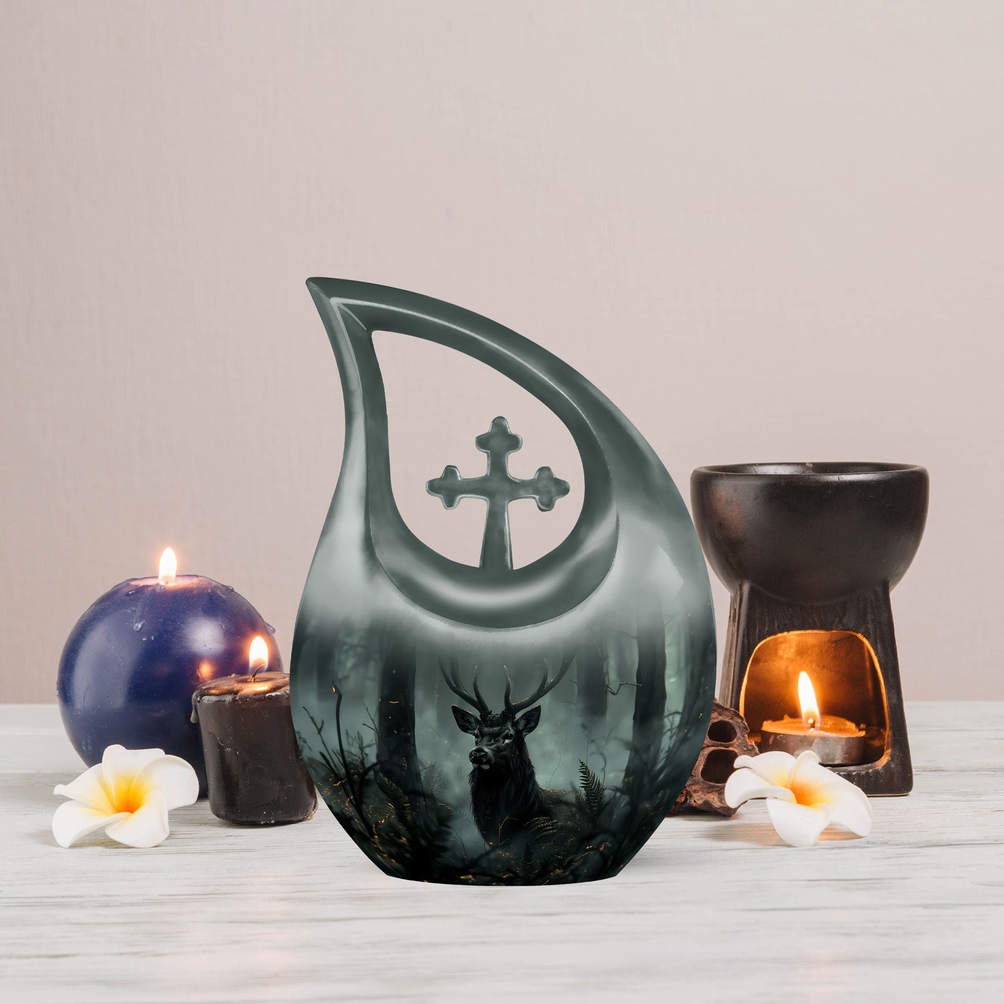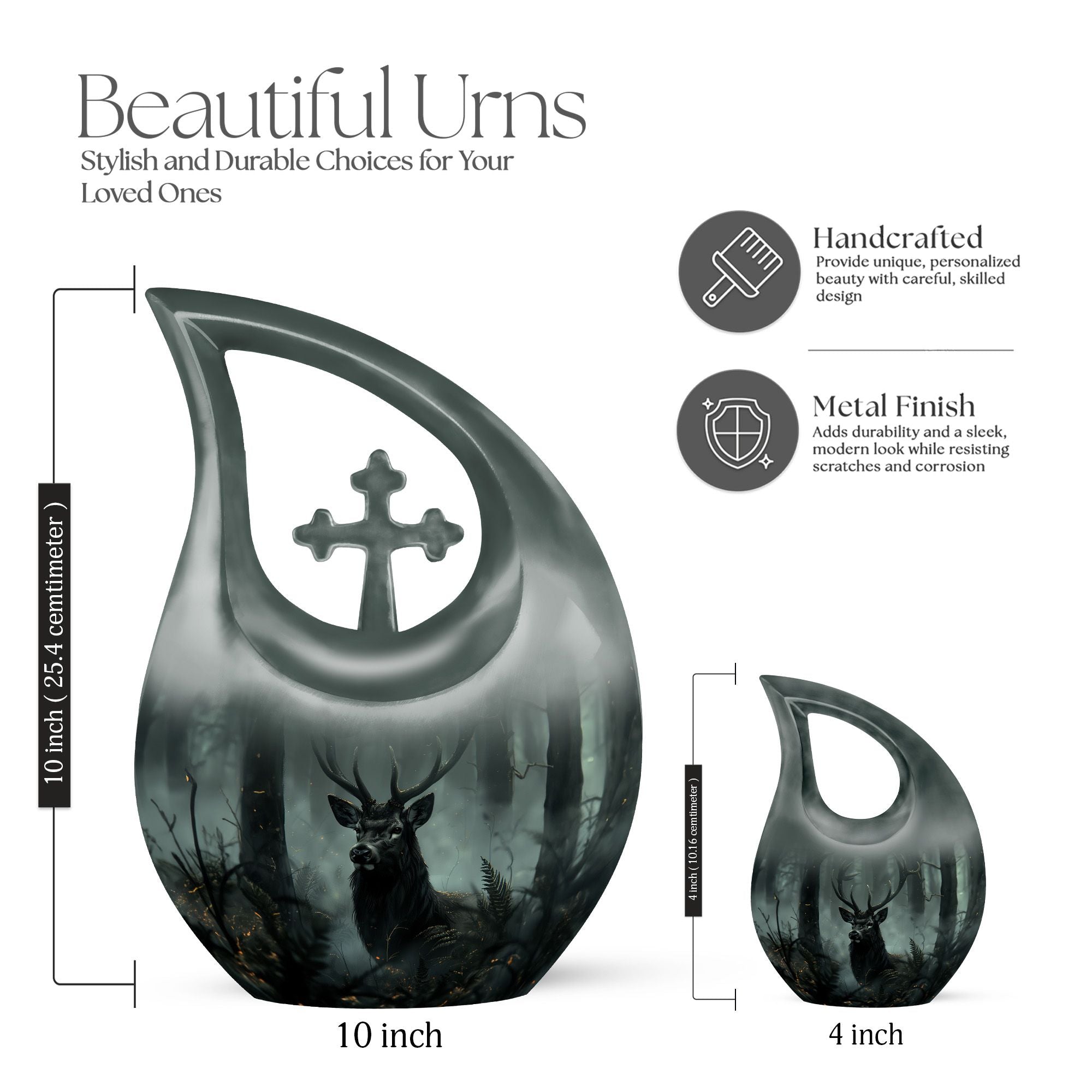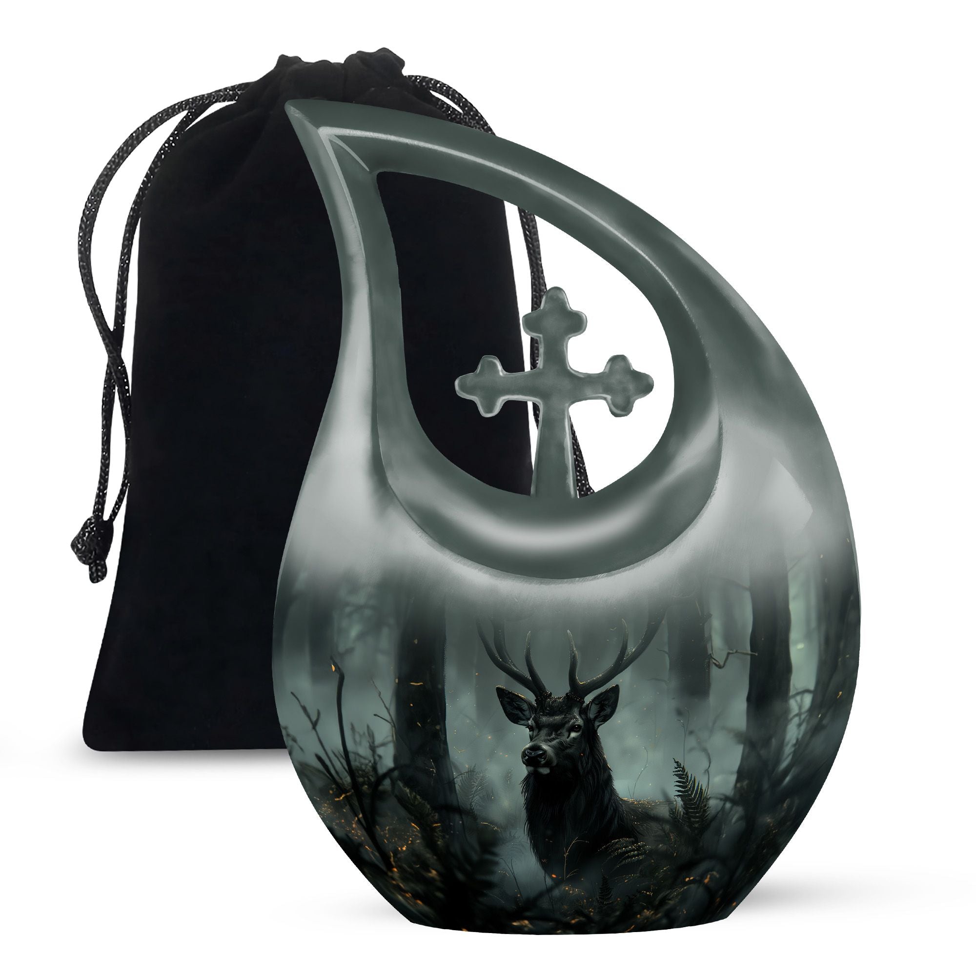Cherish and keep alive the memory of your loved ones with our Deer Urn, a dignified and respectful solution for cremation containers necessity. This large-scale urn expresses a theme of Deer, skillfully crafted from robust Aluminium, bearing a tasteful Cross Drop design. The dimensions stand at 10 inches in height, boasting an impressive weight of 3.3 pounds and a capacity of holding up to 200 cubic inches. For your convenience, each urn comes accompanied by a delicate velvet pouch, adept for the containment of ashes. Our offering extends beyond quality; we also provide the option to personalize your Deer Urn through the engraving of names, allowing you to create a unique tribute for your dearly departed. Among our selection, you will undeniably find our Deer Urn to rival as one of the best urns for ashes. The line between memorial urns and art blurs with the significant craftsmanship involved in creating this beautiful cremation box. Experience this brilliant merger of function, sentimentality, and design in our personalized urns for ashes today.