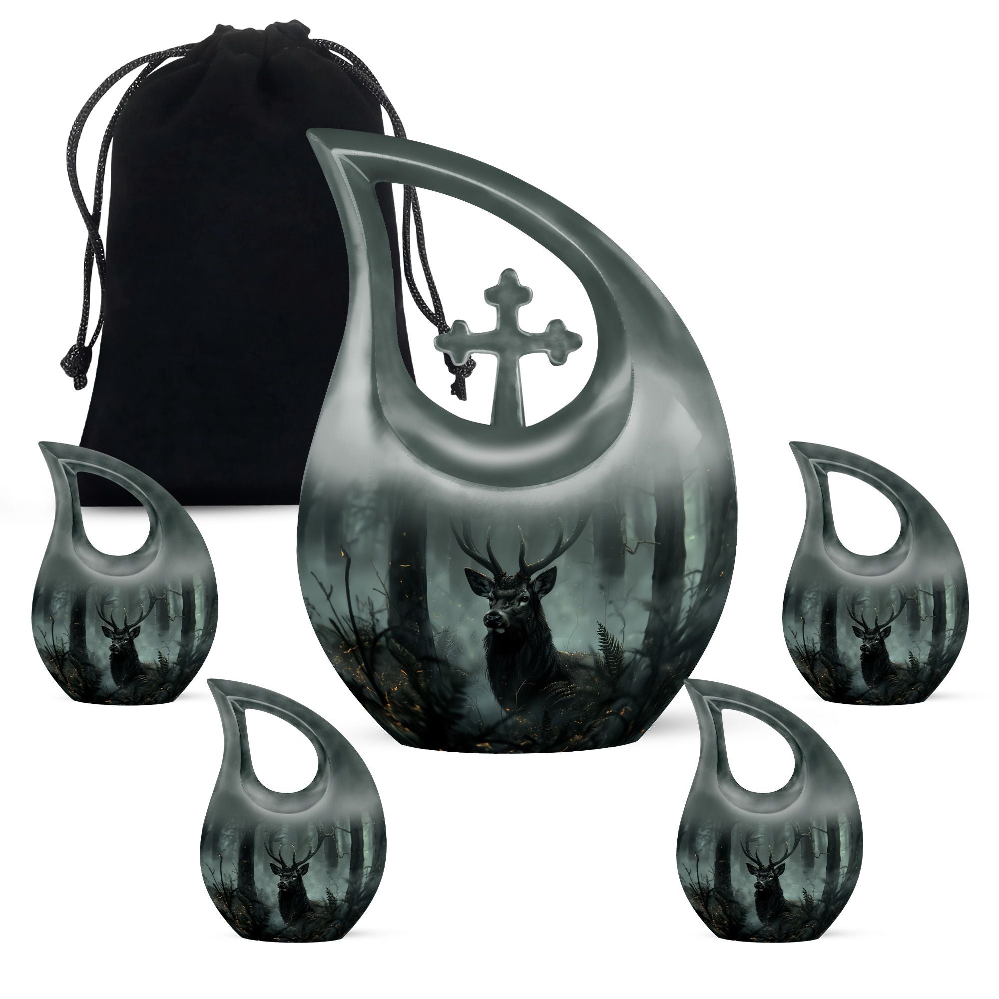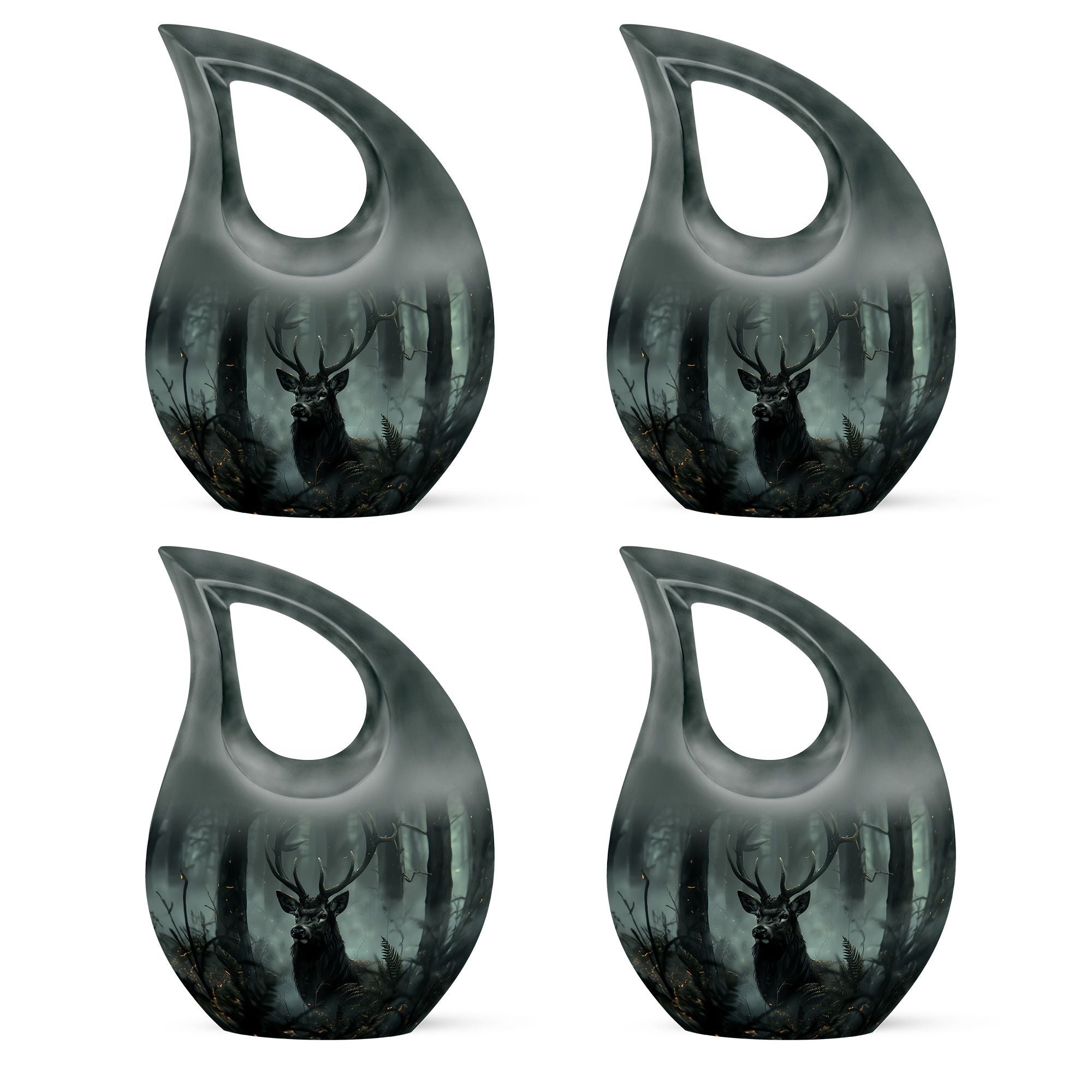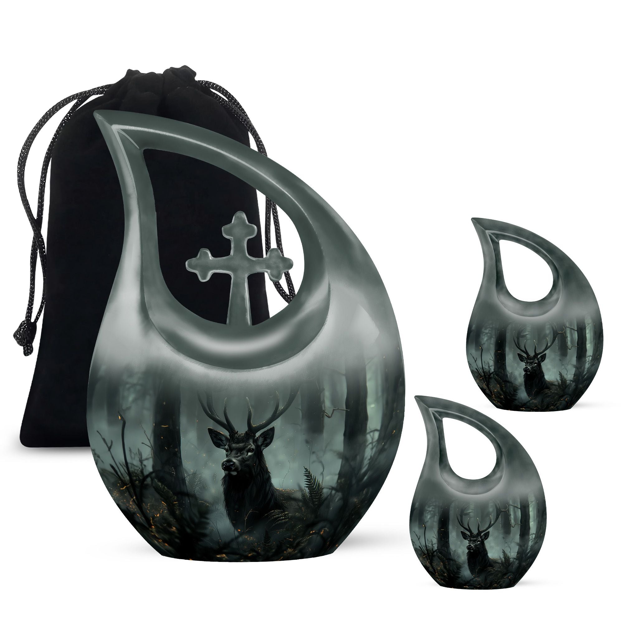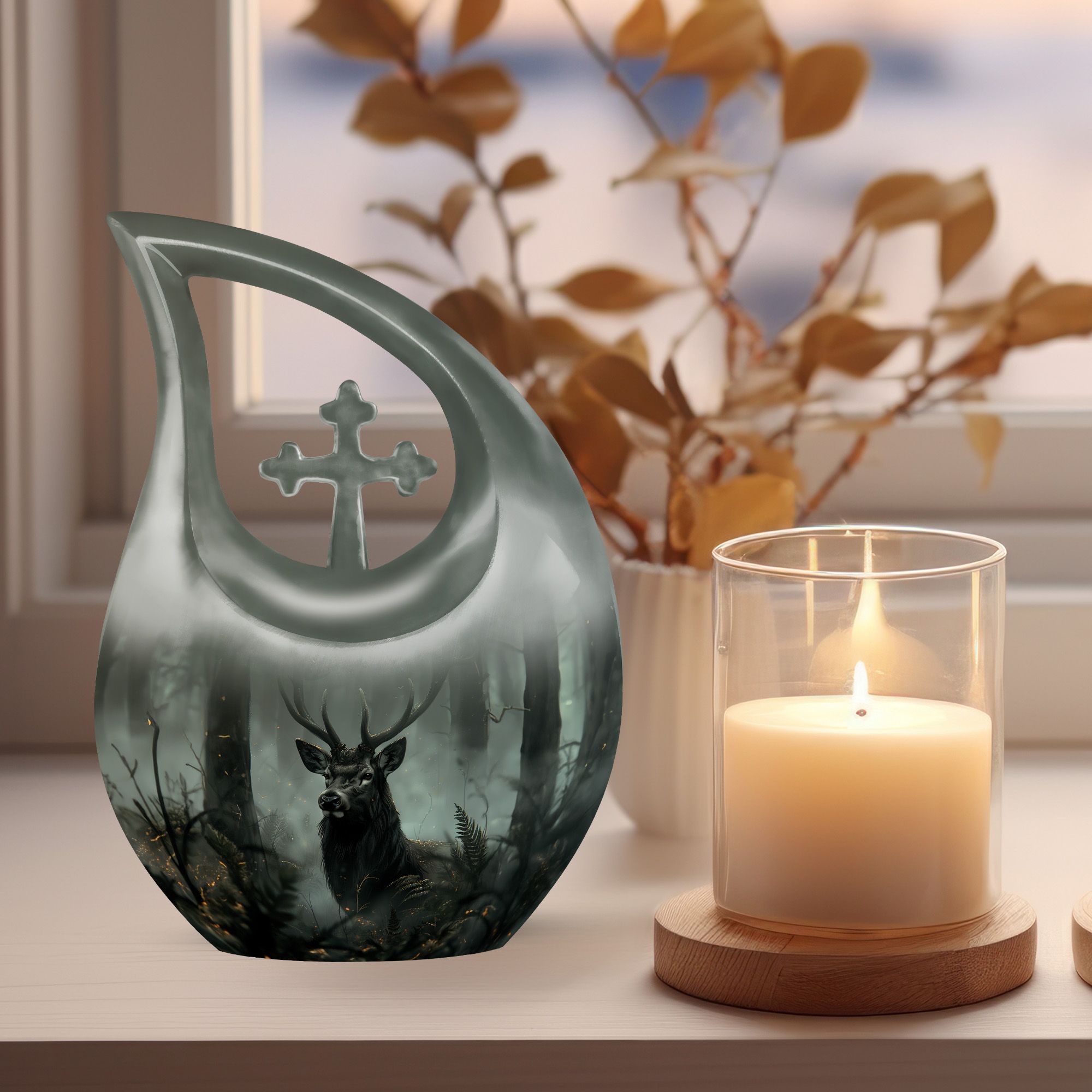 Cherish and keep alive the memory of your loved ones with our Deer Urn, a dignified and respectful solution for cremation containers necessity. This large-scale urn expresses a theme of Deer, skillfully crafted from robust Aluminium, bearing a tasteful Cross Drop design. The dimensions stand at 10 inches in height, boasting an impressive weight of 3.3 pounds and a capacity of holding up to 200 cubic inches. For your convenience, each urn comes accompanied by a delicate velvet pouch, adept for the containment of ashes. Our offering extends beyond quality; we also provide the option to personalize your Deer Urn through the engraving of names, allowing you to create a unique tribute for your dearly departed. Among our selection, you will undeniably find our Deer Urn to rival as one of the best urns for ashes. The line between memorial urns and art blurs with the significant craftsmanship involved in creating this beautiful cremation box. Experience this brilliant merger of function, sentimentality, and design in our personalized urns for ashes today.