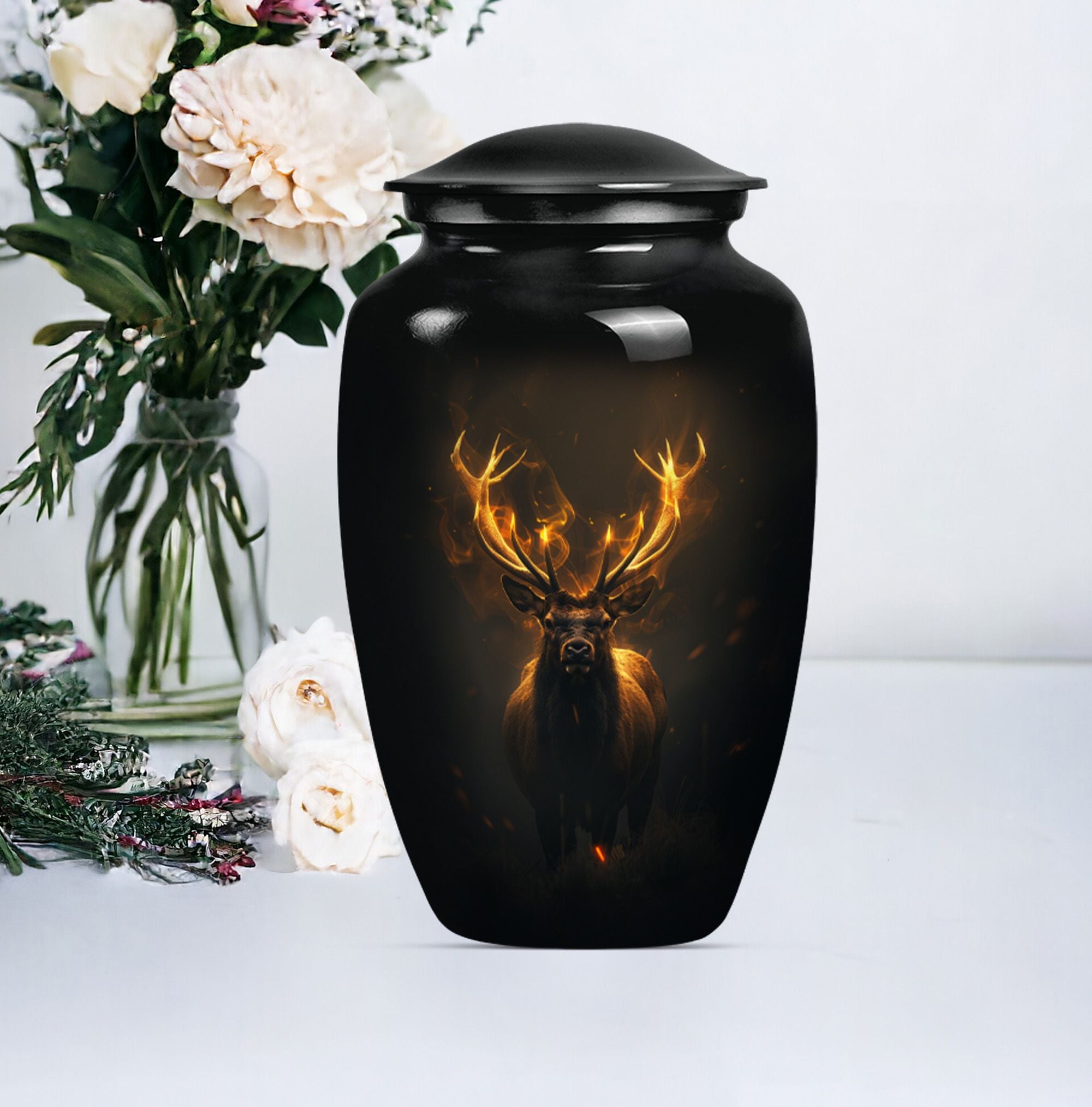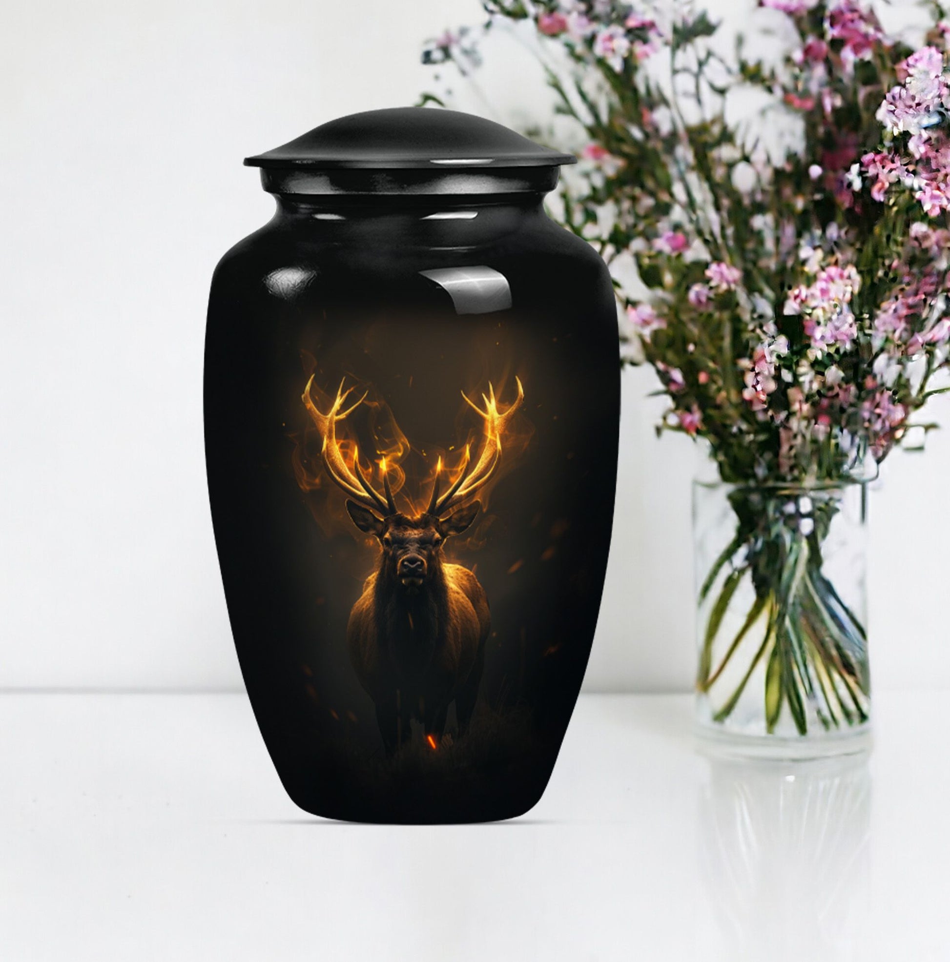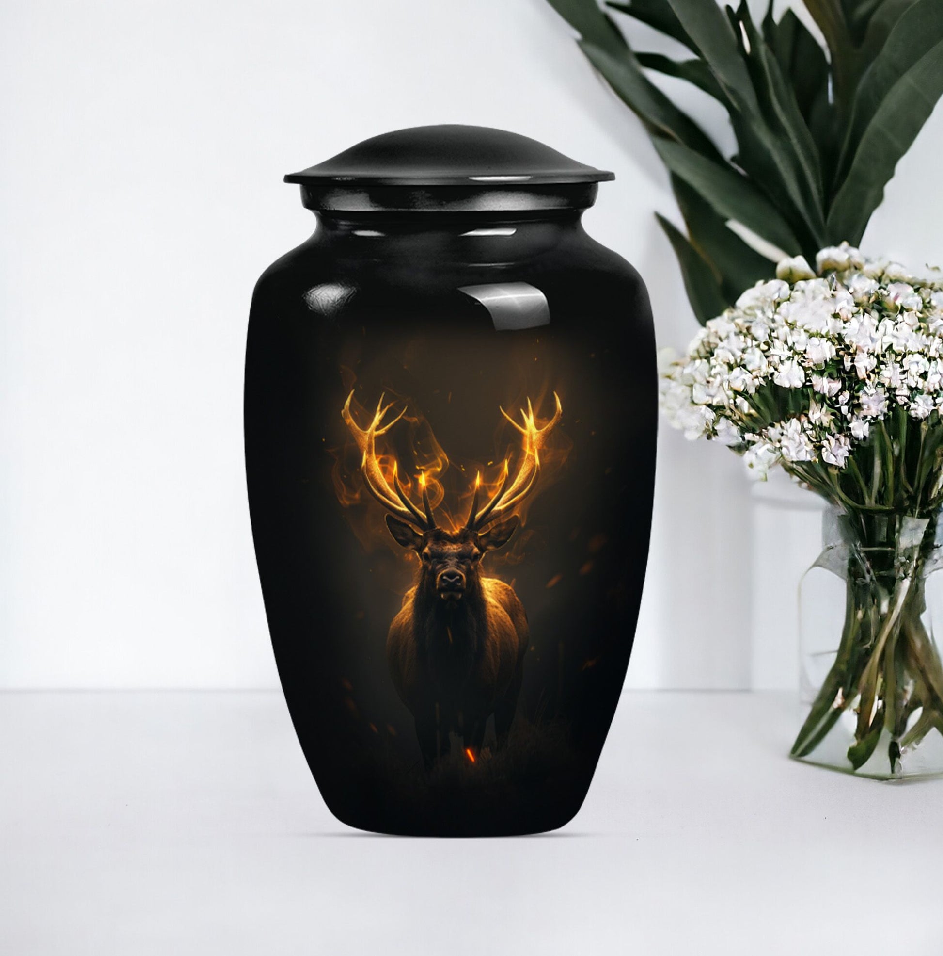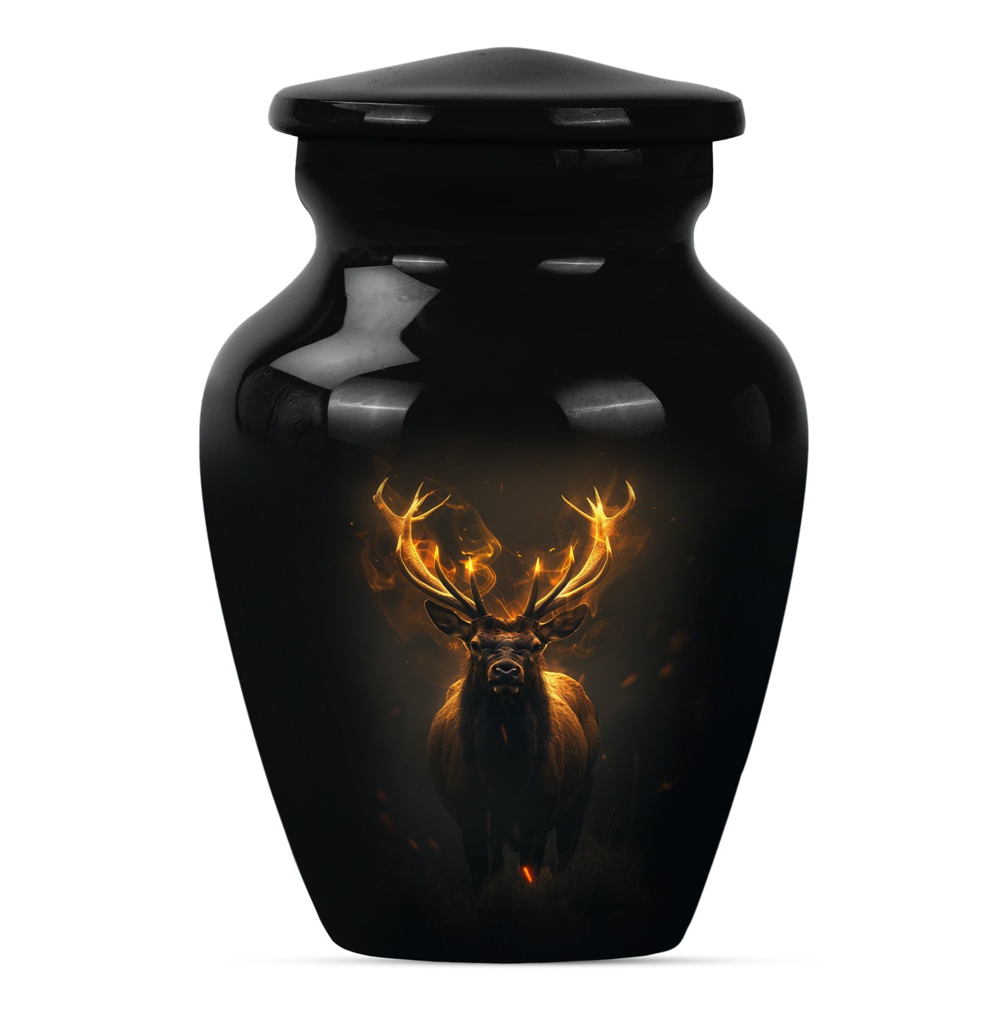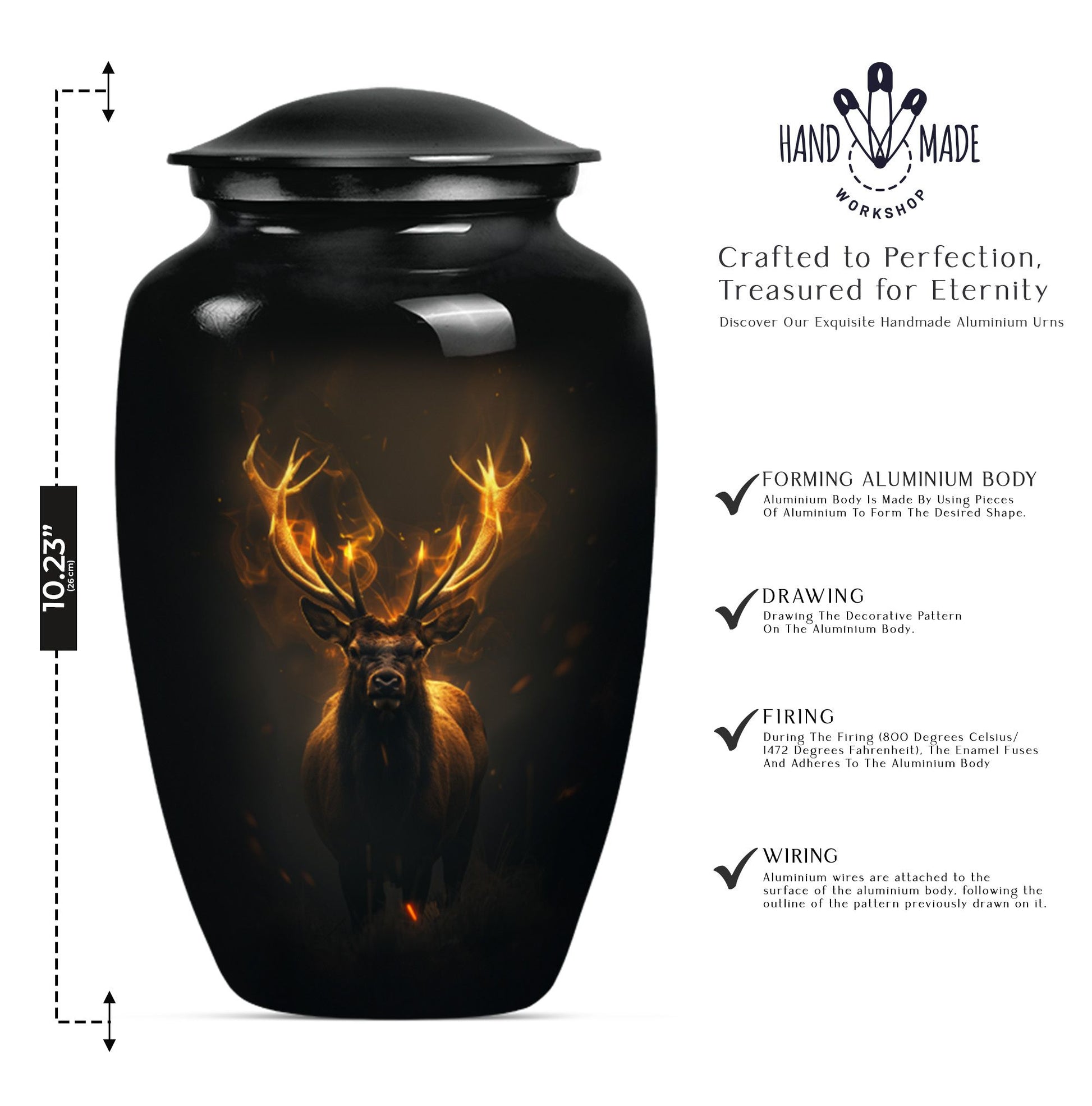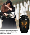 Immerse in the calming elegance of our Large Wolf Howling themed urn, an inviting memorial piece in your cherished parting rituals. Tailored from high-quality aluminium, this burial urn stands at a majestic 10-inch height; as it contains a generous capacity of 200 cubic inches. With a substantial weight of 3.3 pounds, this urn serves as a firm pedestal of treasured memories, resonating with the whisper of the wind's mournful cry, capturing the serene nature of a lone wolf's howling. Our package features an included velvet pouch designed to mindfully contain the precious ashes contained within. What differentiates our urn from the rest? Enjoy our customization features, add a personal touch, immortalize your beloved's name through our engraving service. This urn gracefully encapsulates key notions such as 'deer urn', 'burial urn for ashes adult', 'memorial adult urns', and 'cremation urns for dad'; embodying the gentle yet firm embrace of a lasting goodbye.