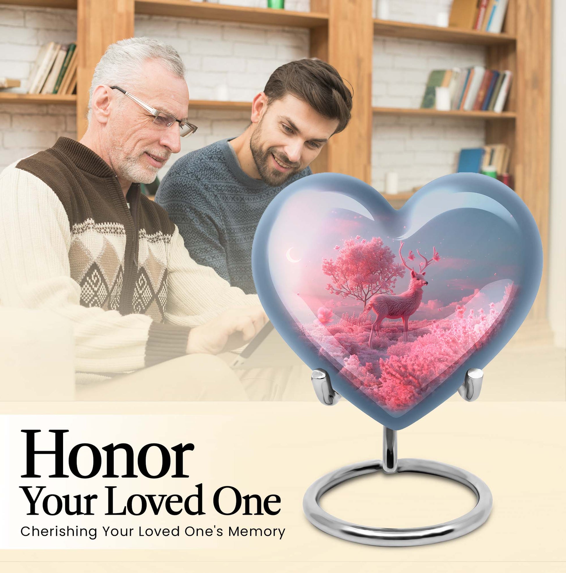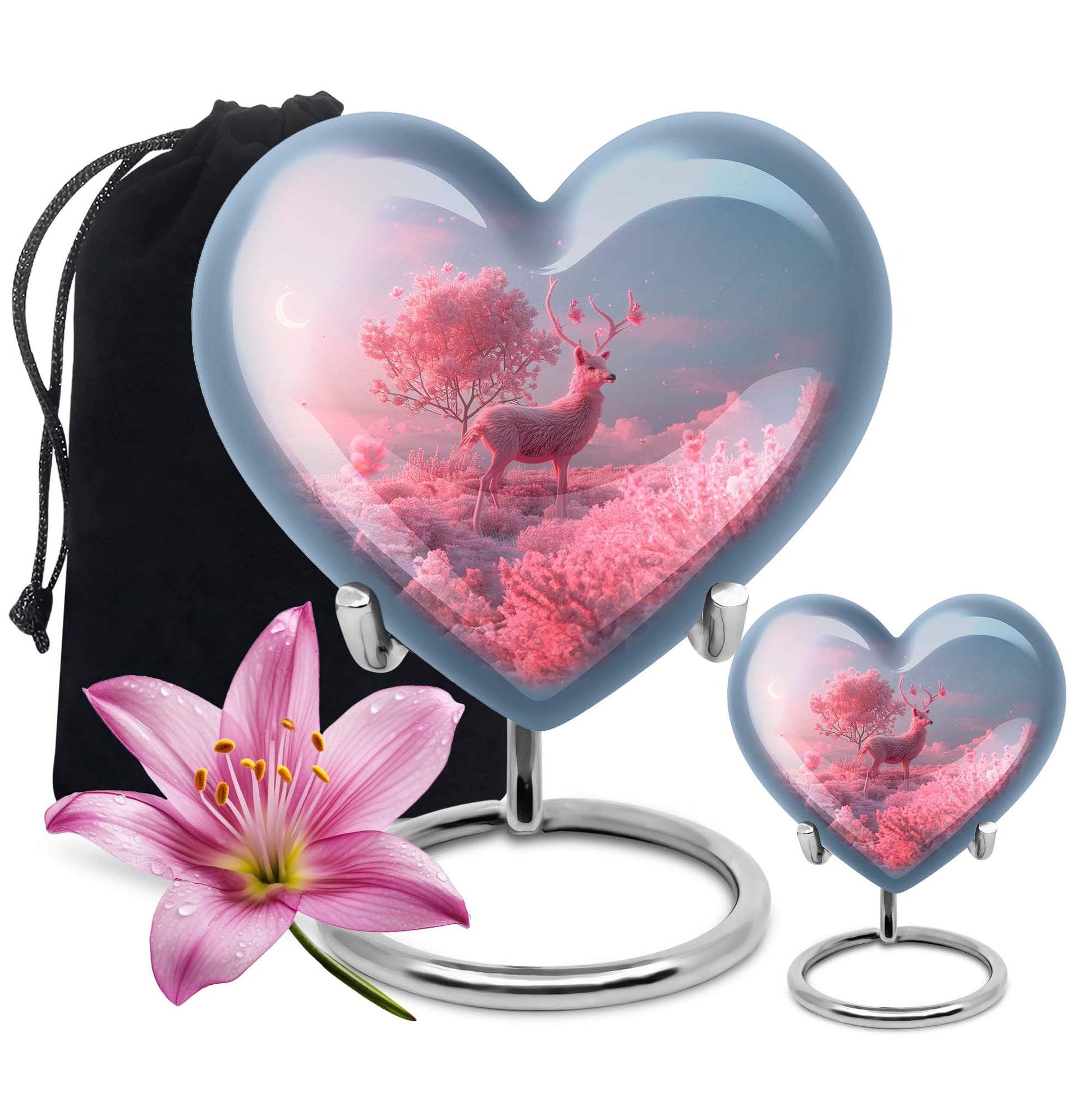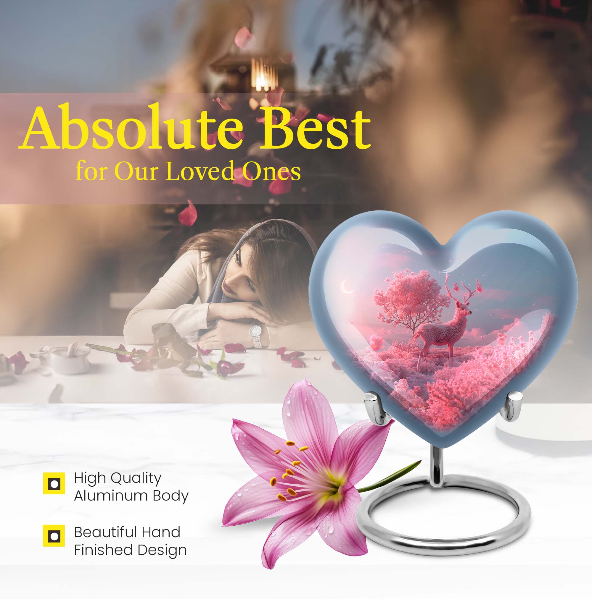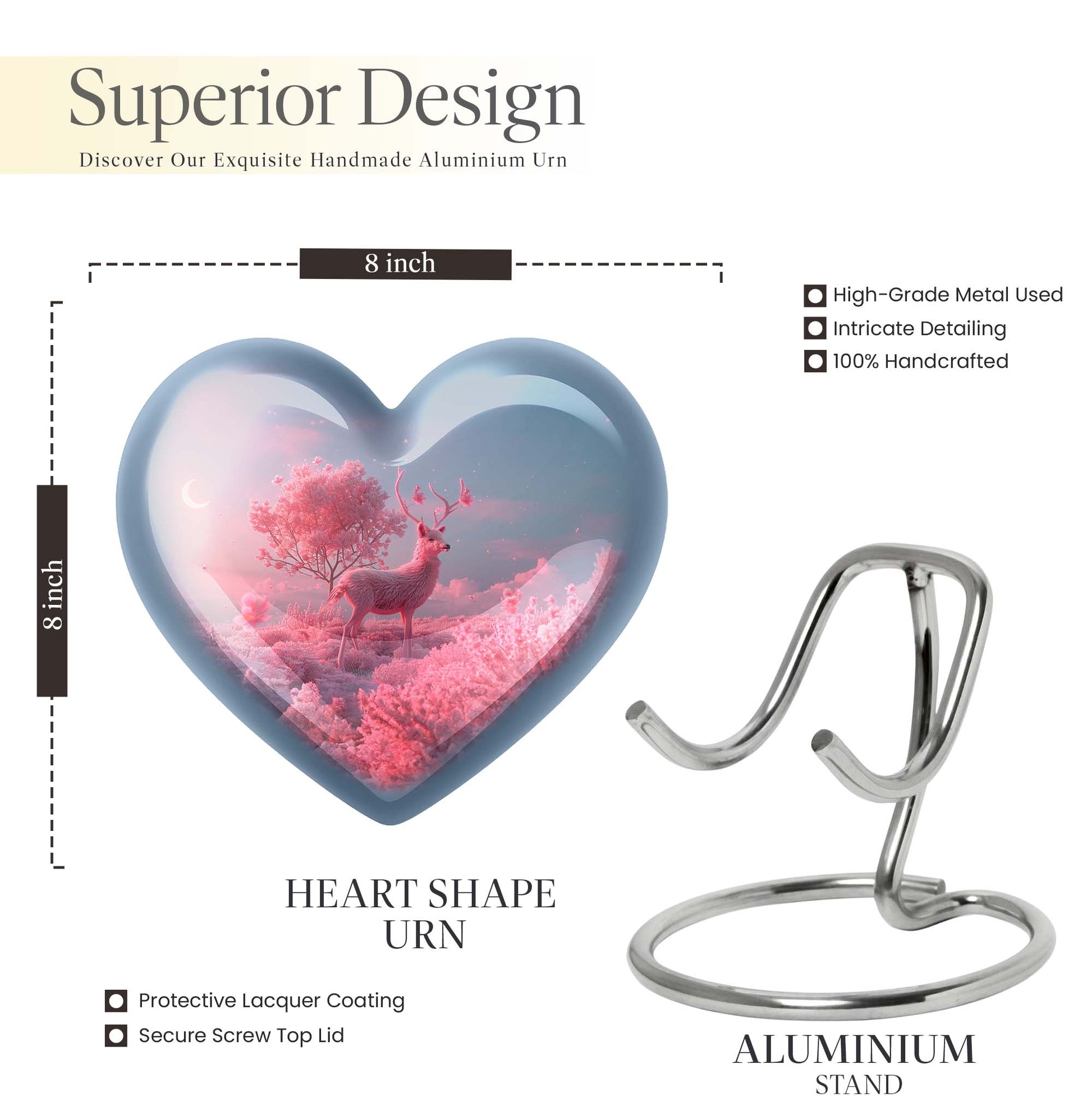 Our exquisite 10-inch Deer Urn, meticulously crafted from durable Aluminium, is carefully designed to provide a dignified and reverent memorial for your treasured adult male. Accommodating a substantial 200 cubic inches, this large urn seamlessly combines functionality with grace. Weighting only 3.3 pounds, it can be easily handled, adjusting subtly with your home decor. This gramophone-themed Heart Urn instills a unique sense of calm and quiet reflection. Our customization service allows for the personal engraving of names, ensuring your loved one's memory is forever etched on it. For additional convenience, your purchase includes a velvet pouch for the respectful containment of the ashes. The eternal spirit and music of the dearly departed are encapsulated in our funeral urns, promising a resonating remembrance. We combine aesthetic delicacy with practicality, allowing for an emotionally connective memorial urns ownership experience.