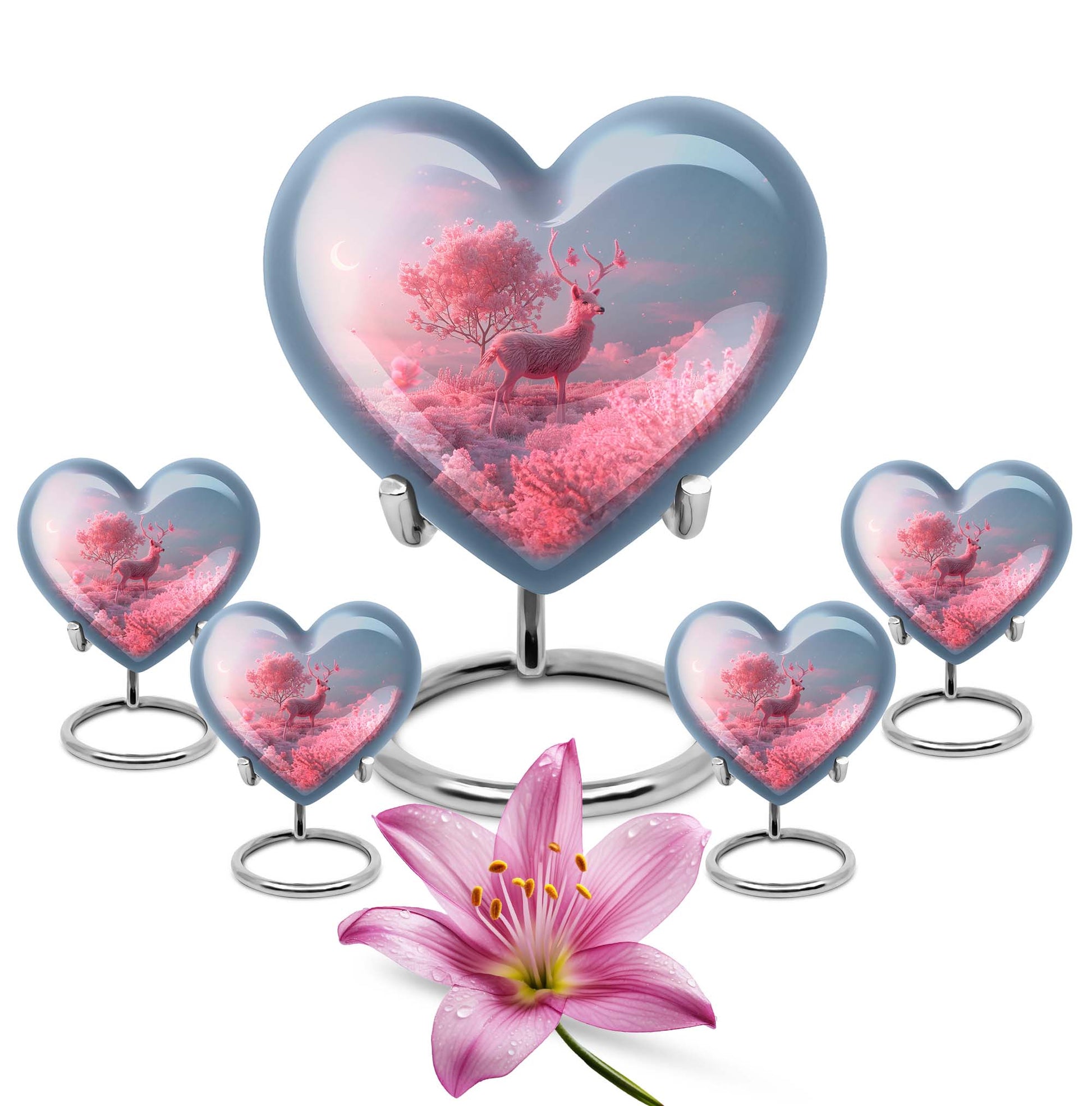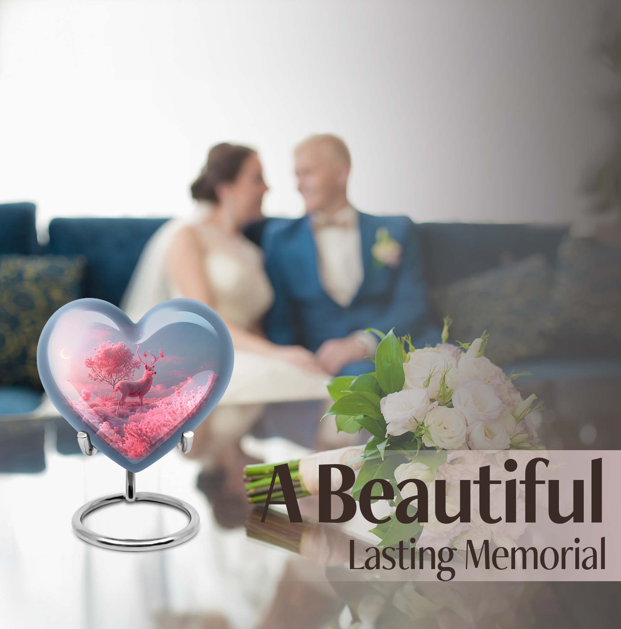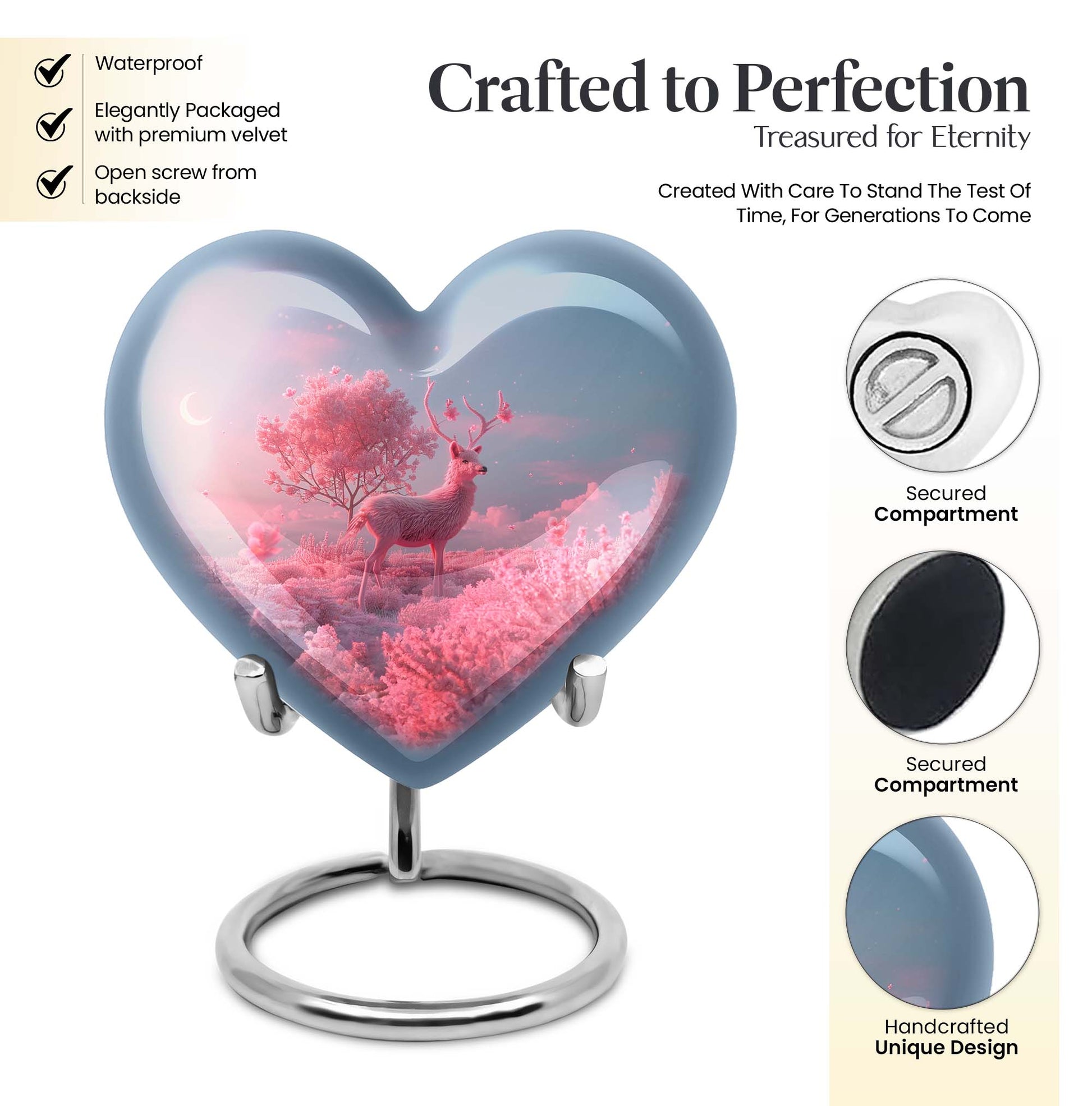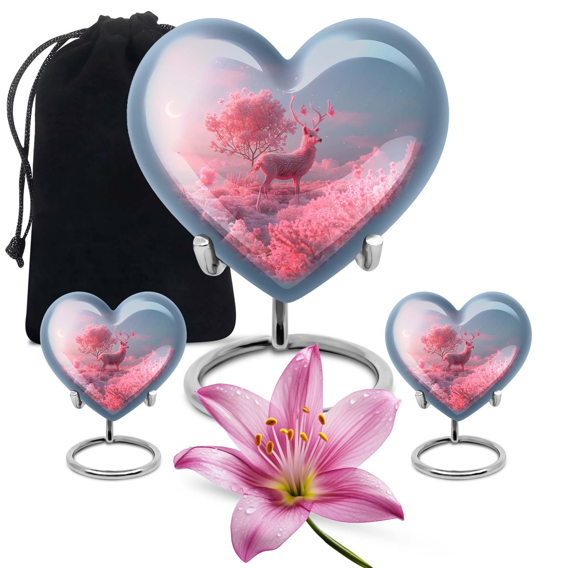 Our exquisite 10-inch Deer Urn, meticulously crafted from durable Aluminium, is carefully designed to provide a dignified and reverent memorial for your treasured adult male. Accommodating a substantial 200 cubic inches, this large urn seamlessly combines functionality with grace. Weighting only 3.3 pounds, it can be easily handled, adjusting subtly with your home decor. This gramophone-themed Heart Urn instills a unique sense of calm and quiet reflection. Our customization service allows for the personal engraving of names, ensuring your loved one's memory is forever etched on it. For additional convenience, your purchase includes a velvet pouch for the respectful containment of the ashes. The eternal spirit and music of the dearly departed are encapsulated in our funeral urns, promising a resonating remembrance. We combine aesthetic delicacy with practicality, allowing for an emotionally connective memorial urns ownership experience.