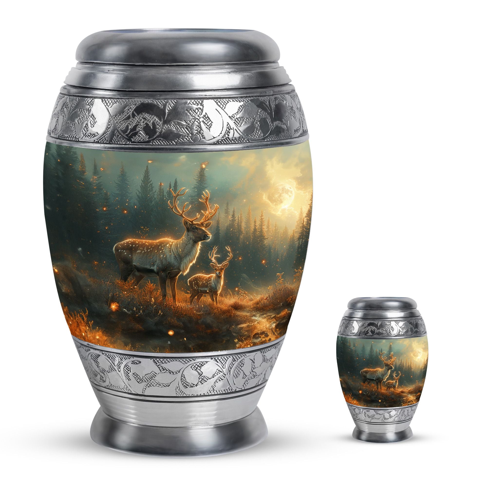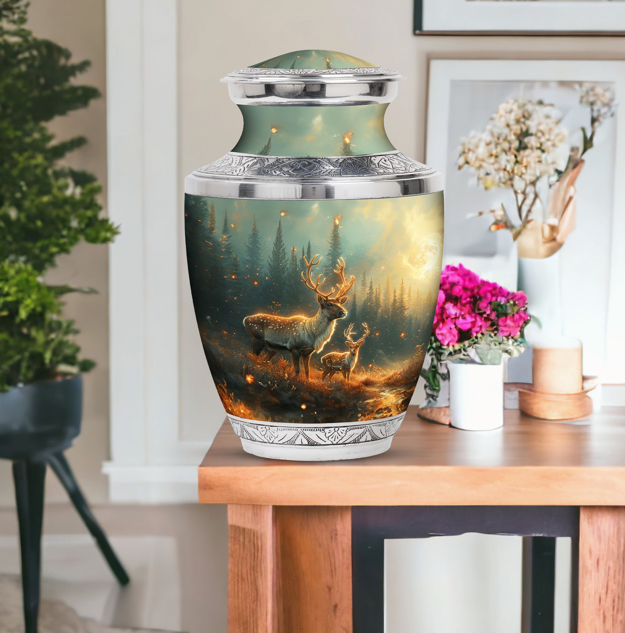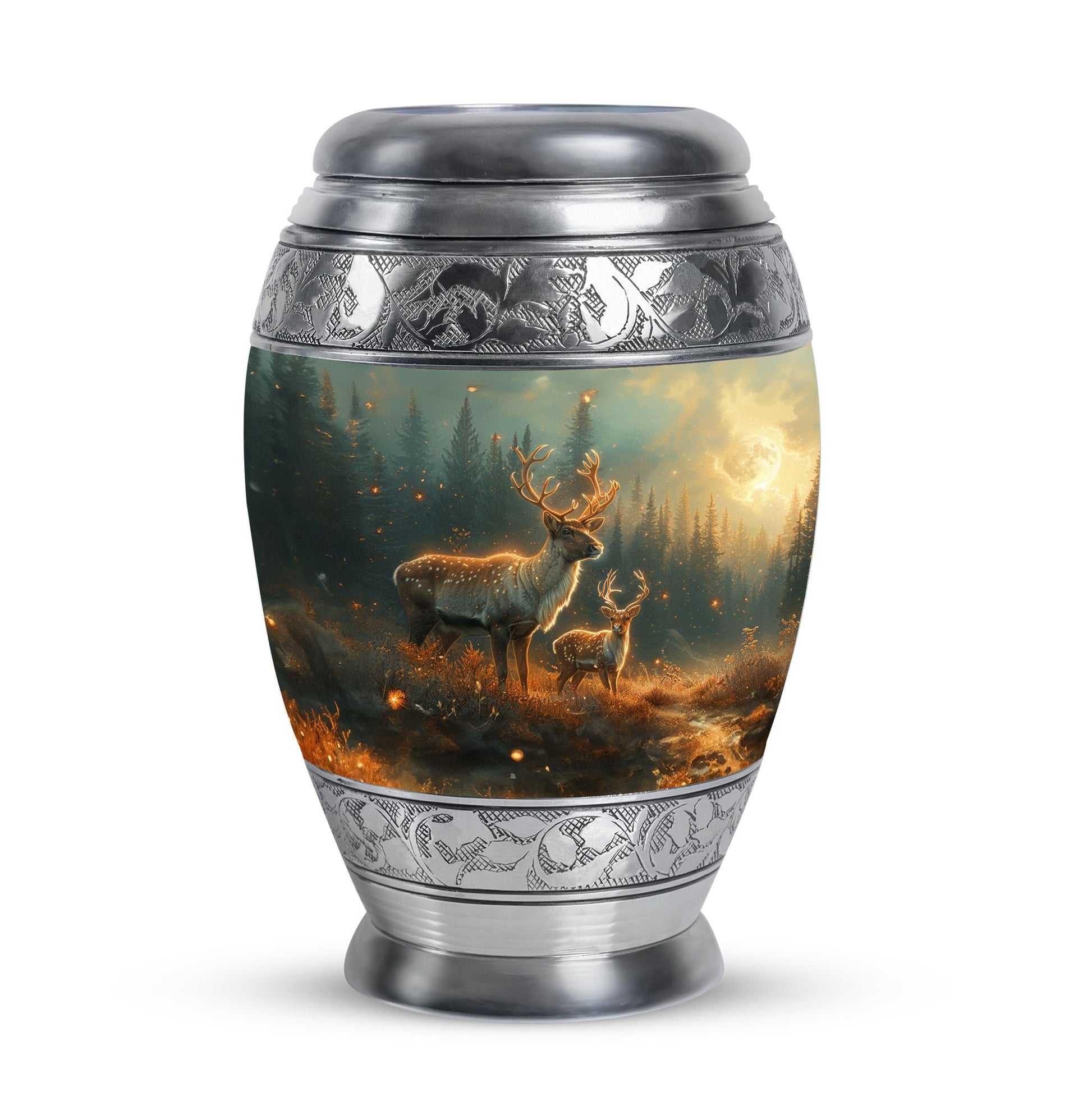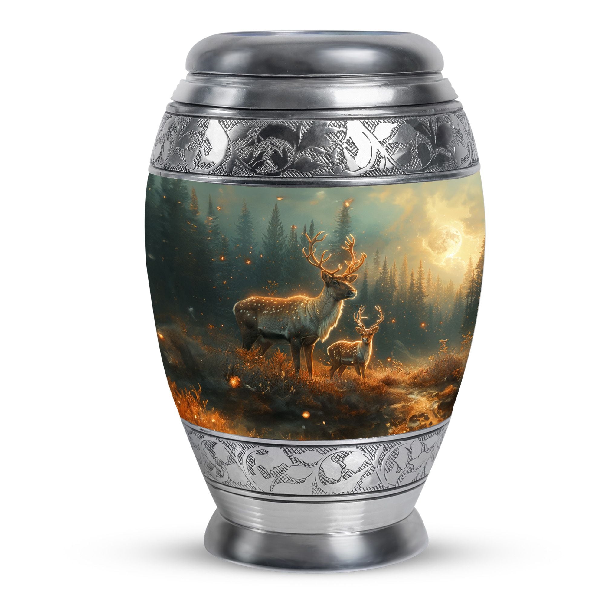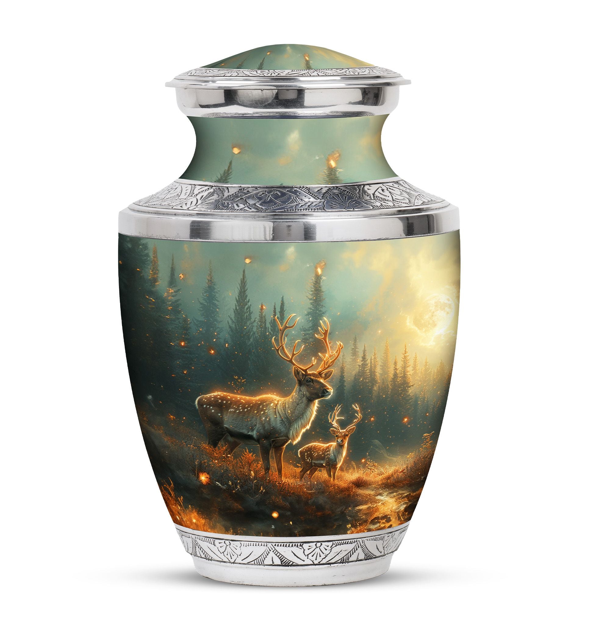 Crafted from durable aluminum, this large cremation urn features a detailed deer family motif, representing unity, love, and eternal protection. The elegant finish makes it a beautiful display piece while also being suitable as a burial urn. With its generous 200 cubic inch capacity, it is perfectly suited for urns for human ashes large adult, large urn for ashes for women, or adult large urns. A secure screw-top lid ensures the ashes are preserved safely. Personalization options make this large human ashes urn even more meaningful, allowing families to honor their loved one in a unique way.