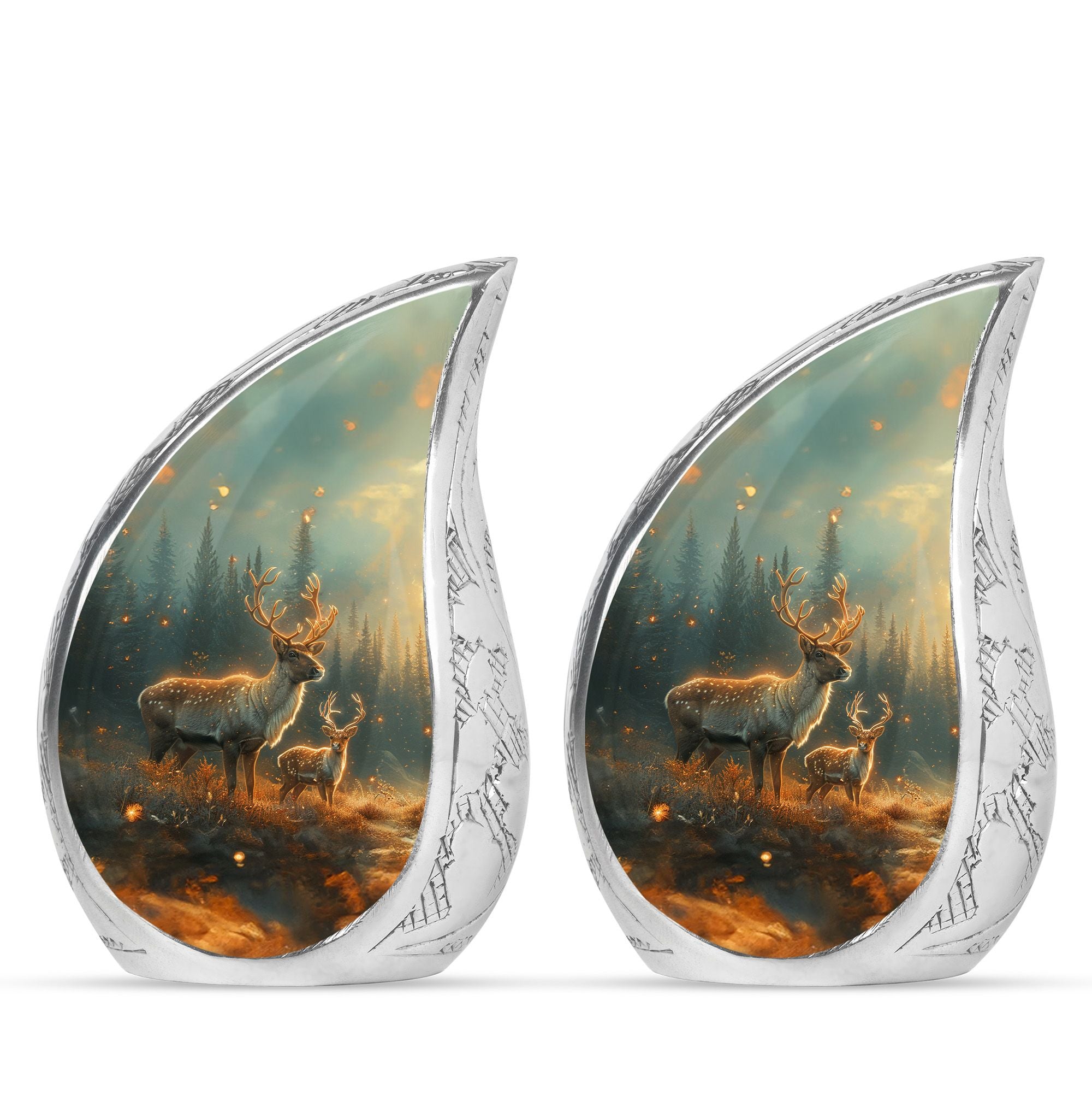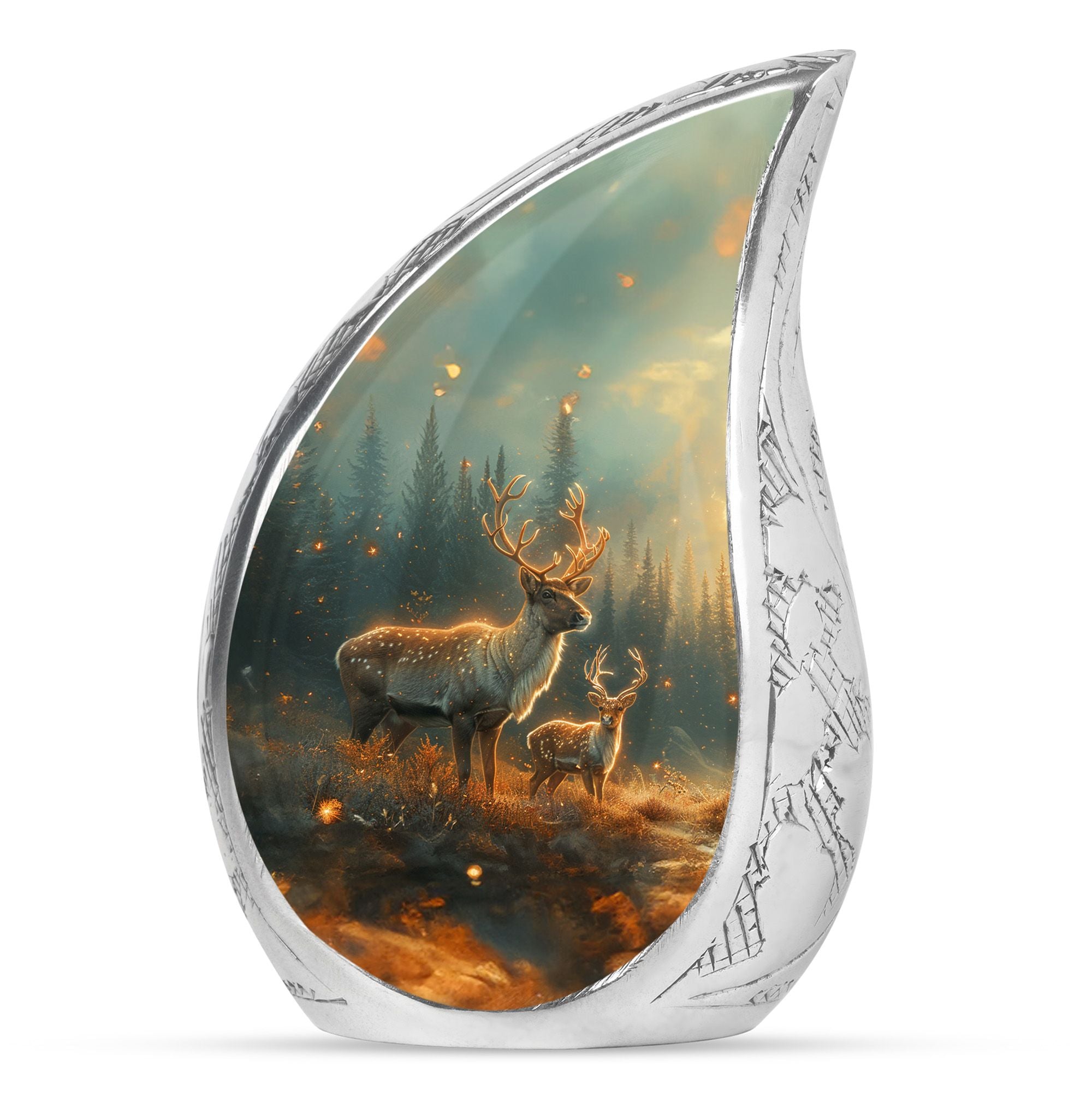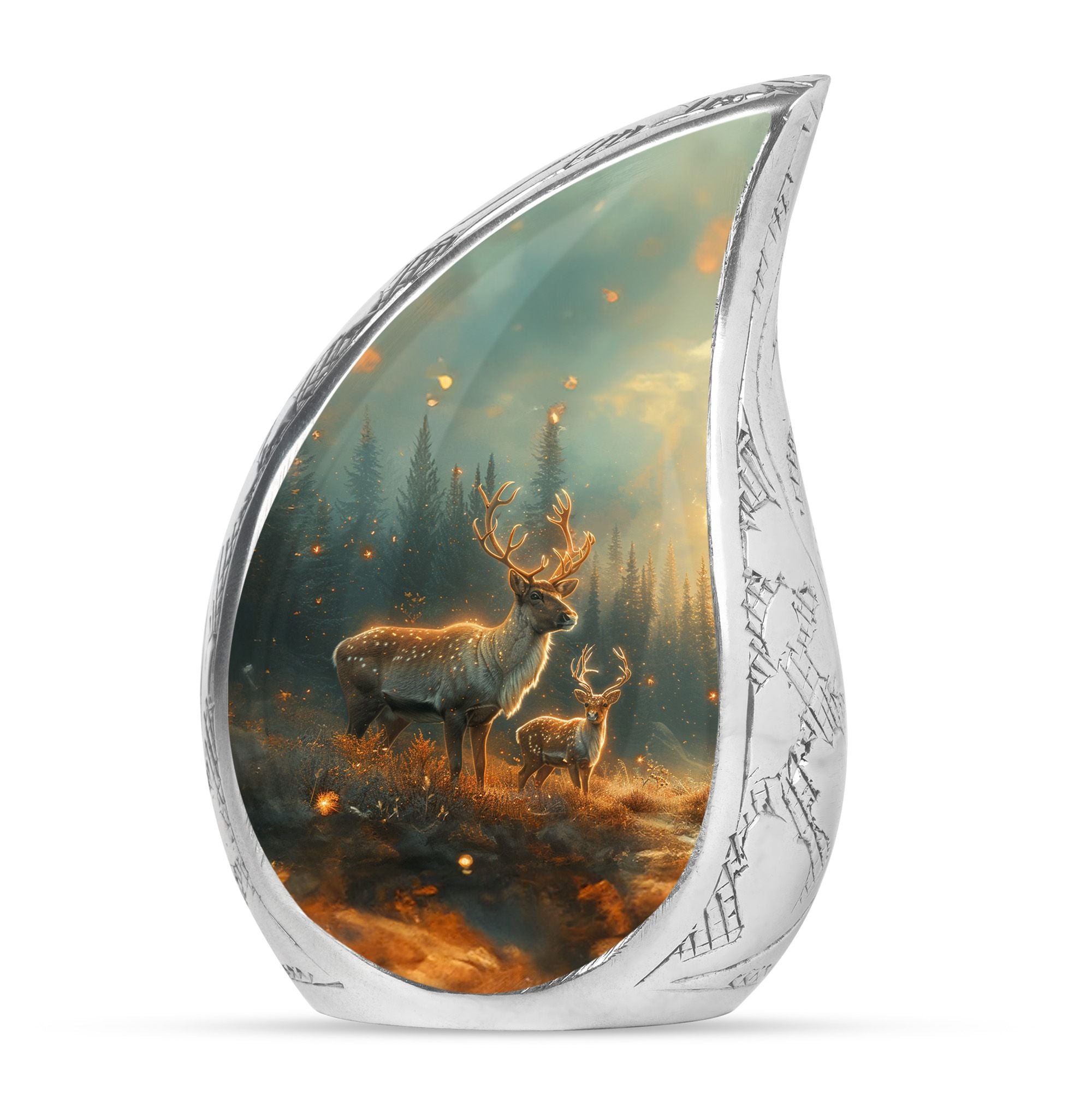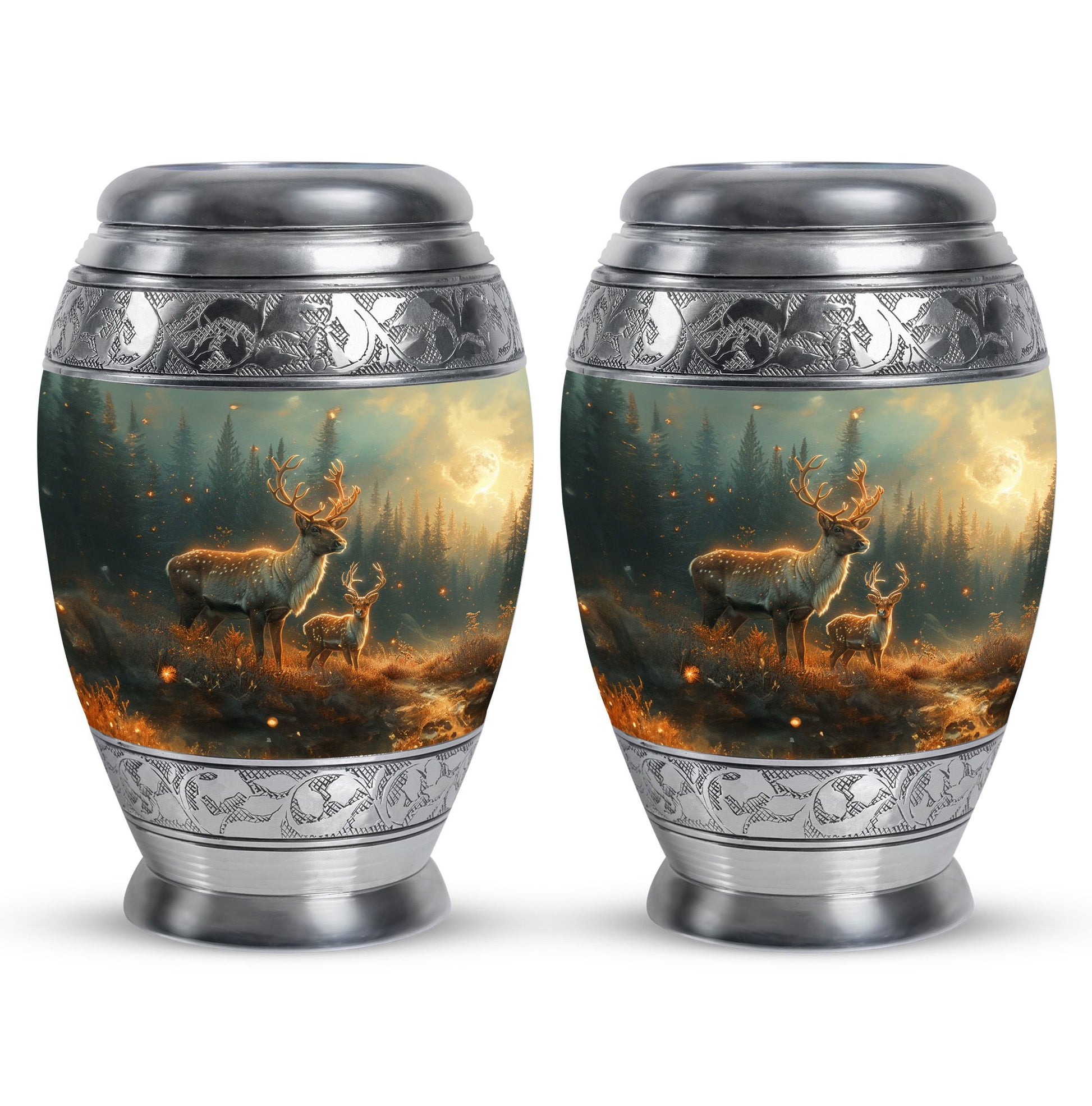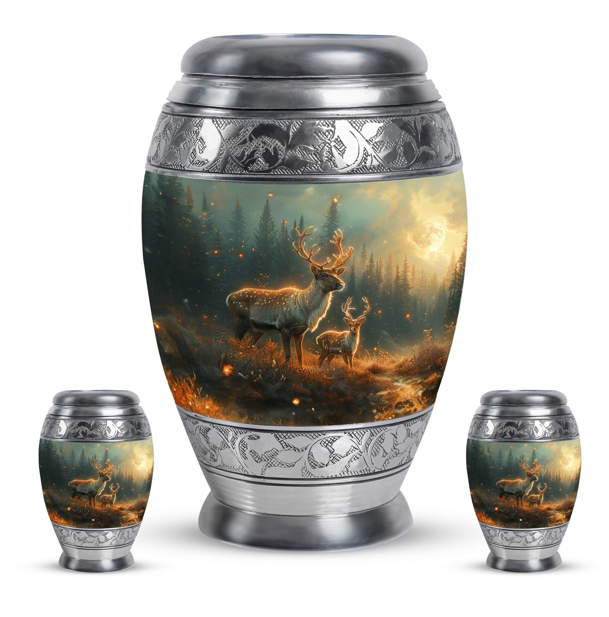 Crafted from durable aluminum, this large cremation urn features a detailed deer family motif, representing unity, love, and eternal protection. The elegant finish makes it a beautiful display piece while also being suitable as a burial urn. With its generous 200 cubic inch capacity, it is perfectly suited for urns for human ashes large adult, large urn for ashes for women, or adult large urns. A secure screw-top lid ensures the ashes are preserved safely. Personalization options make this large human ashes urn even more meaningful, allowing families to honor their loved one in a unique way.