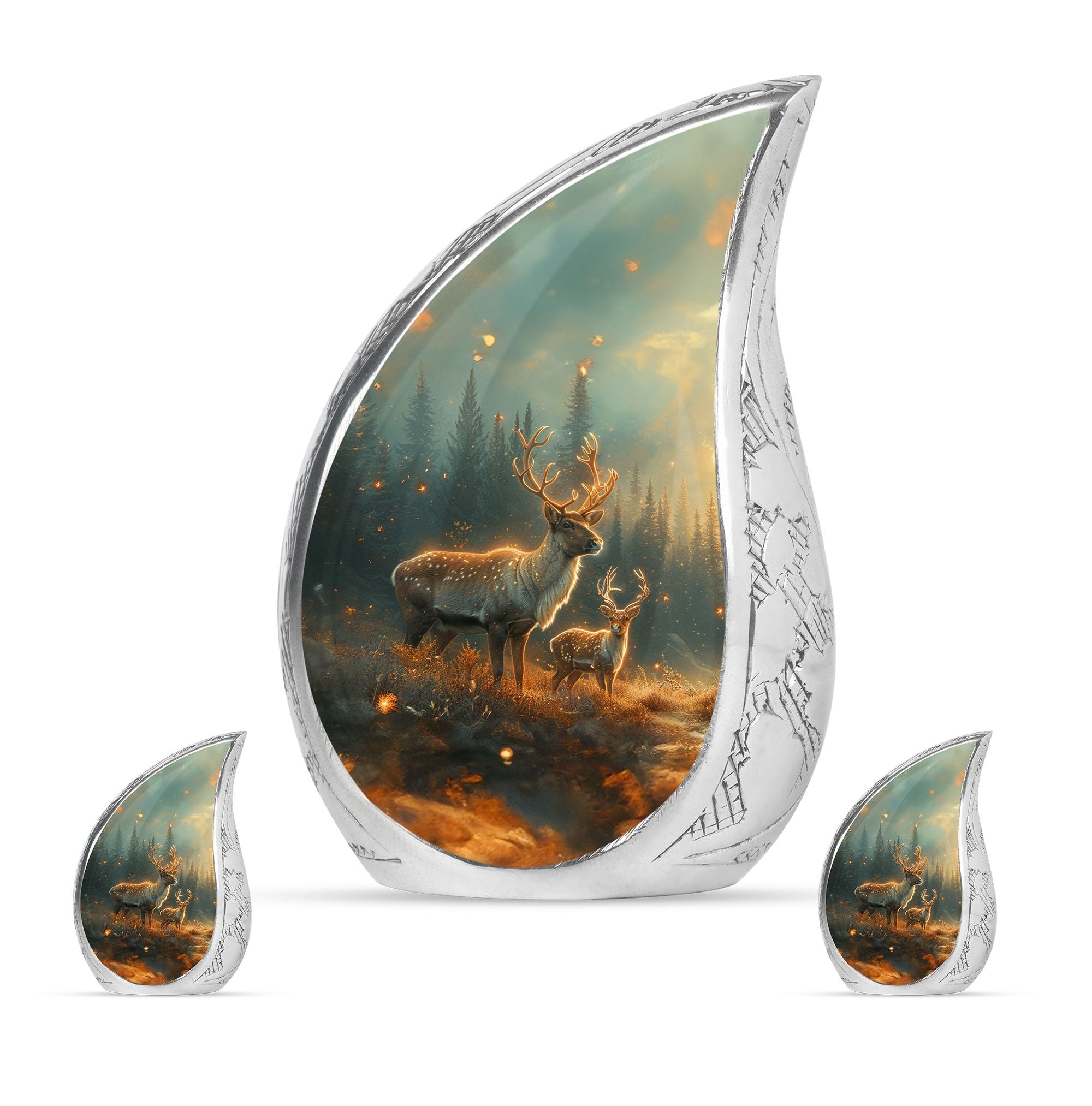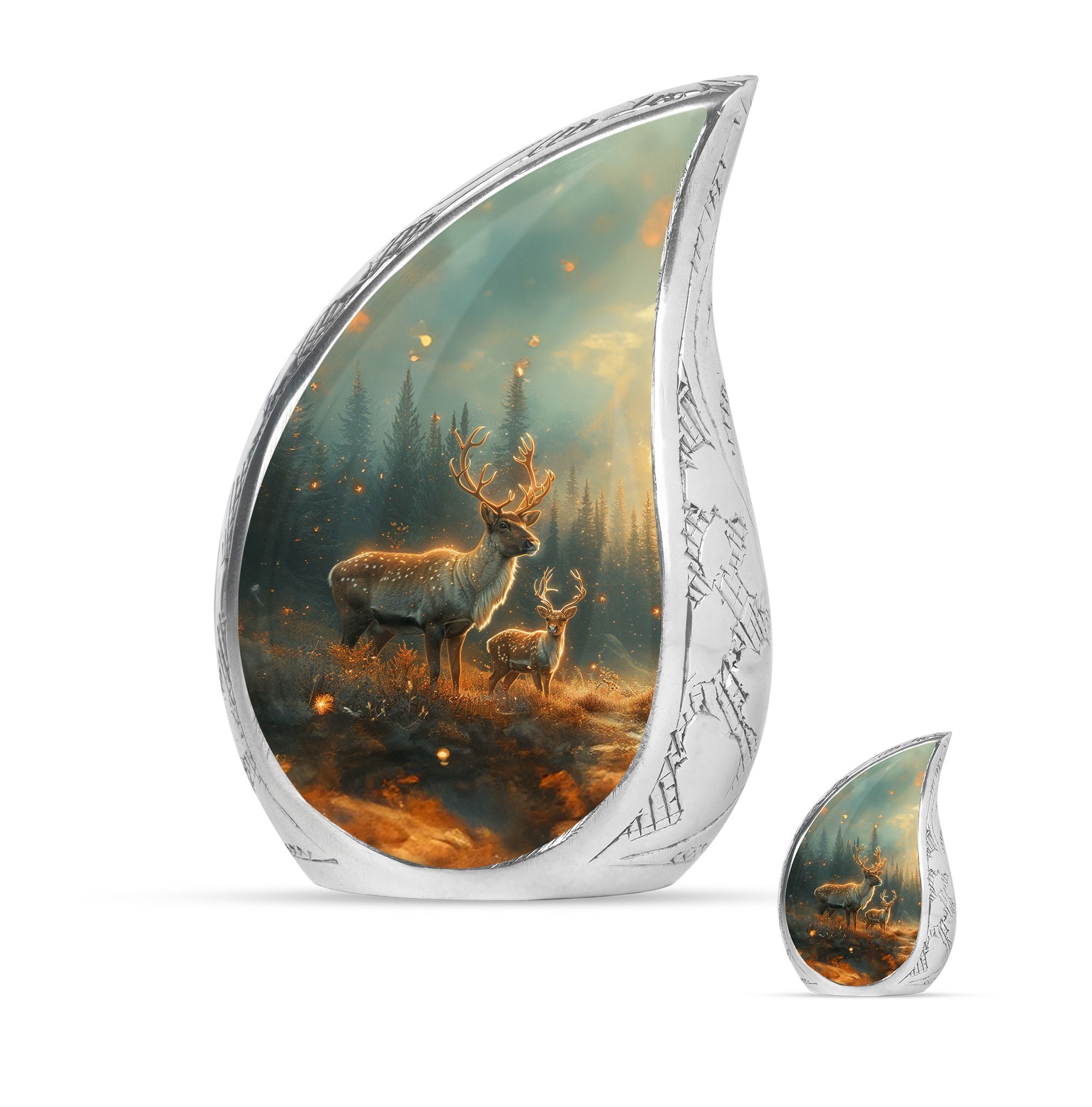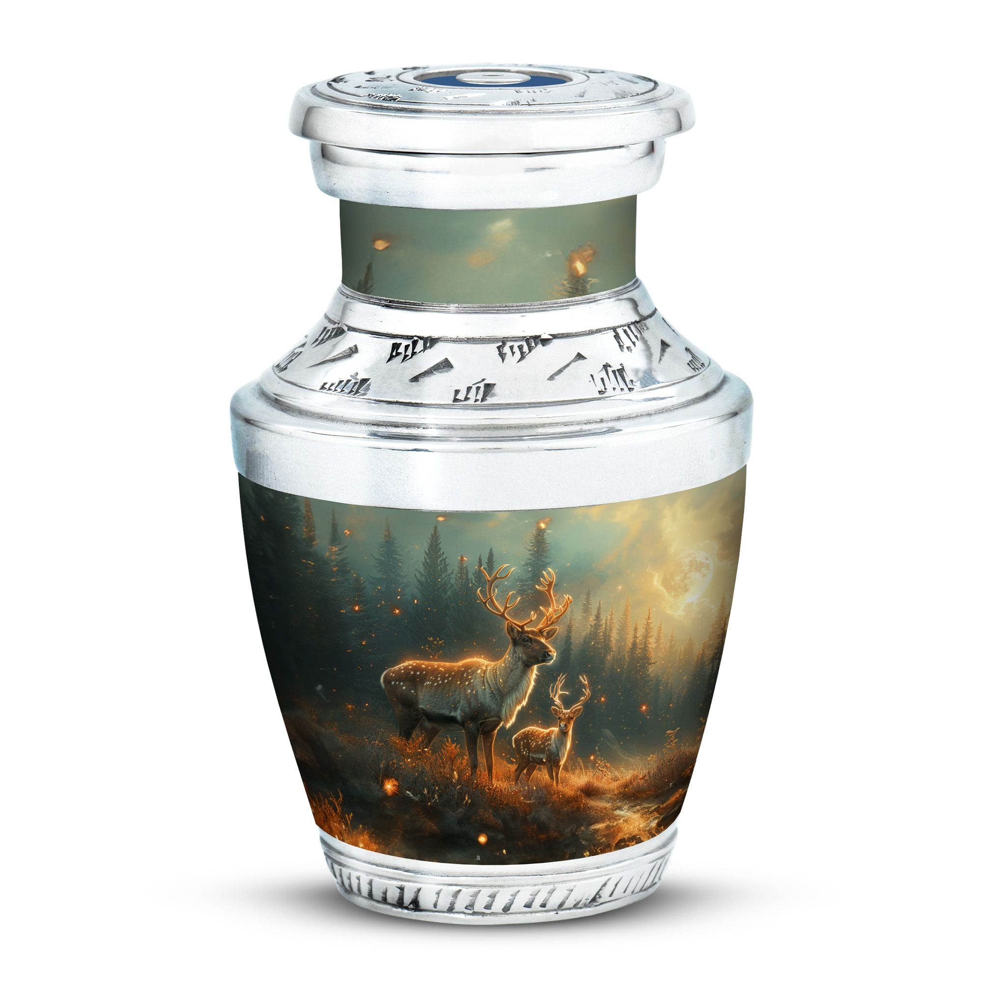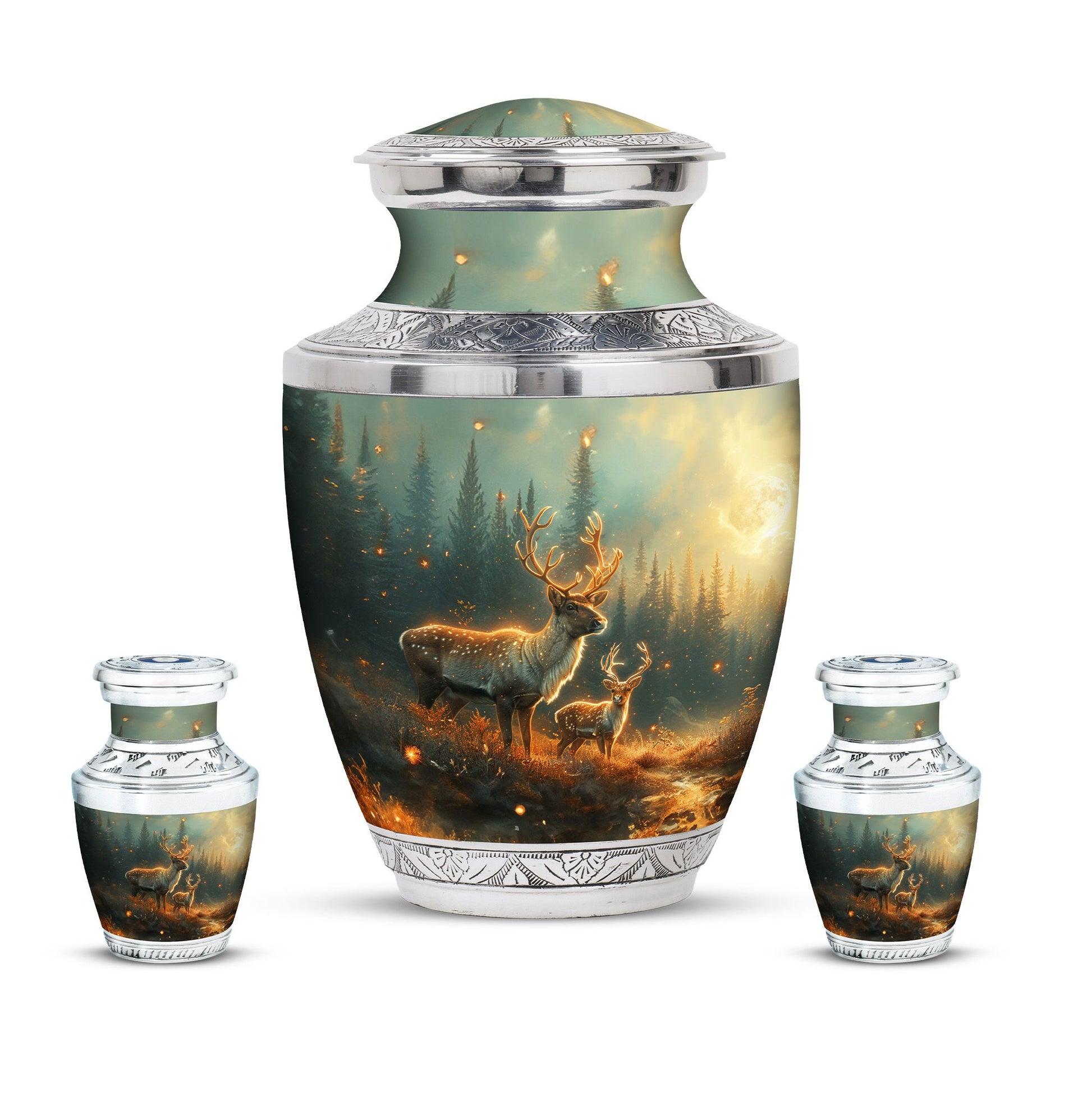 Crafted from durable aluminum, this large cremation urn features a detailed deer family motif, representing unity, love, and eternal protection. The elegant finish makes it a beautiful display piece while also being suitable as a burial urn. With its generous 200 cubic inch capacity, it is perfectly suited for urns for human ashes large adult, large urn for ashes for women, or adult large urns. A secure screw-top lid ensures the ashes are preserved safely. Personalization options make this large human ashes urn even more meaningful, allowing families to honor their loved one in a unique way.
