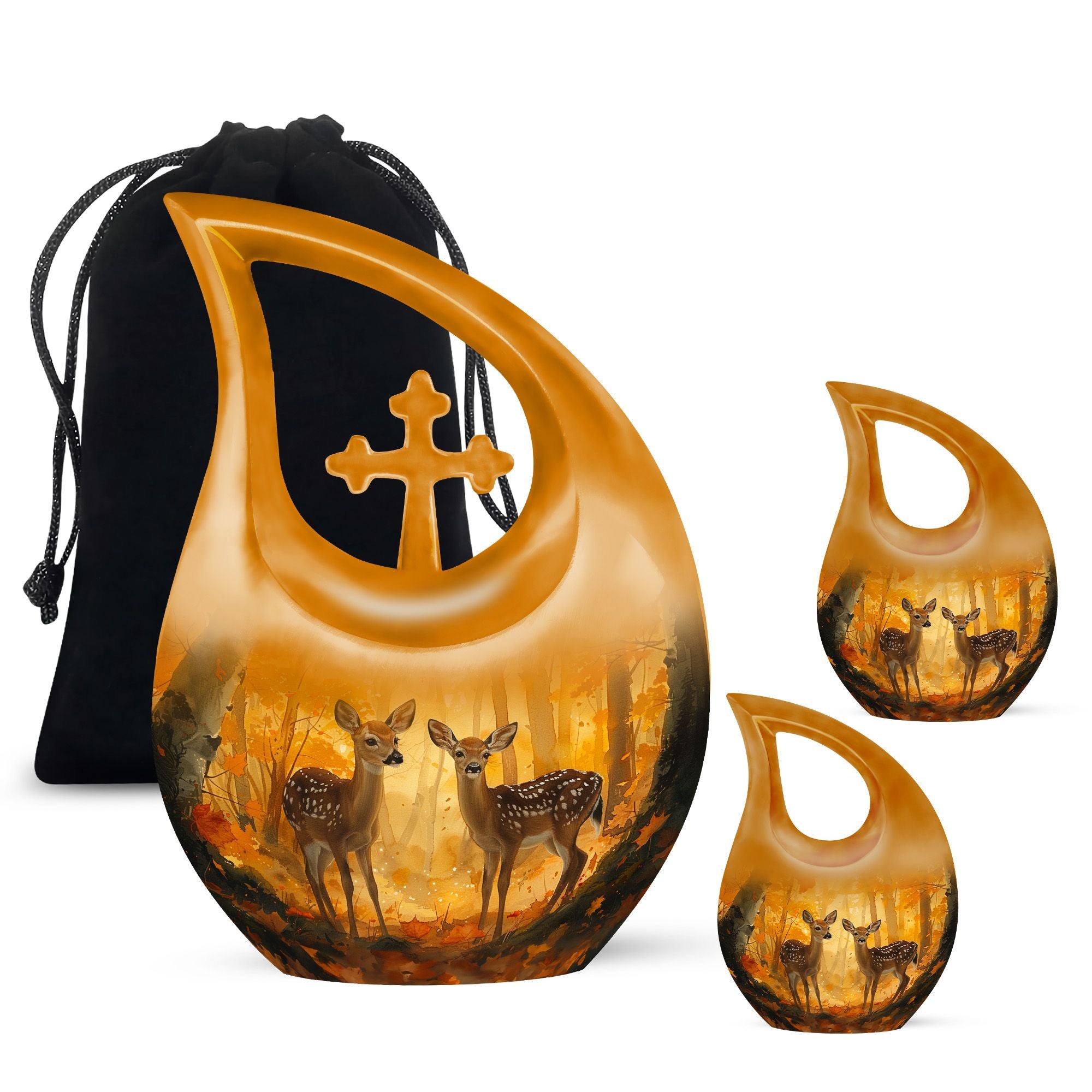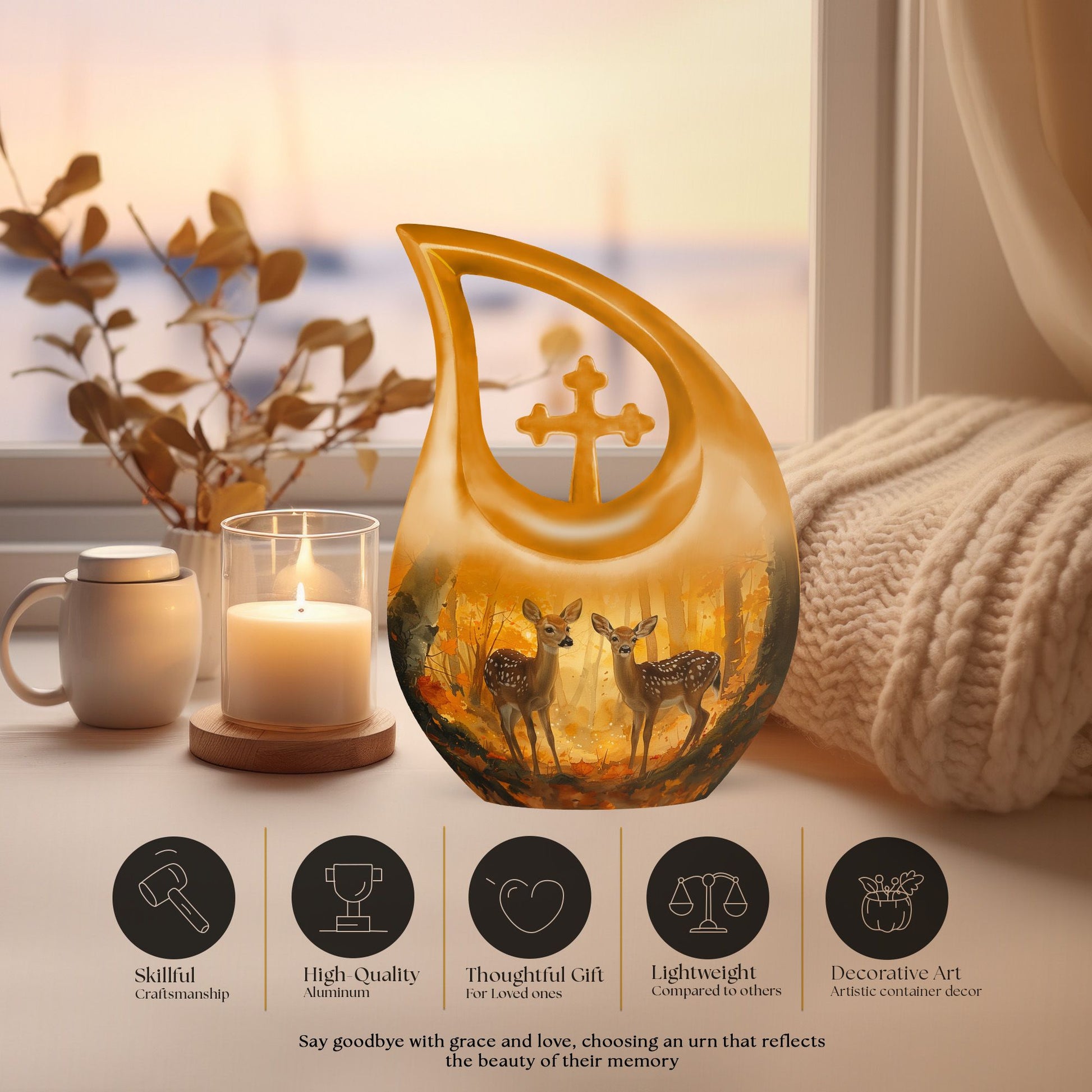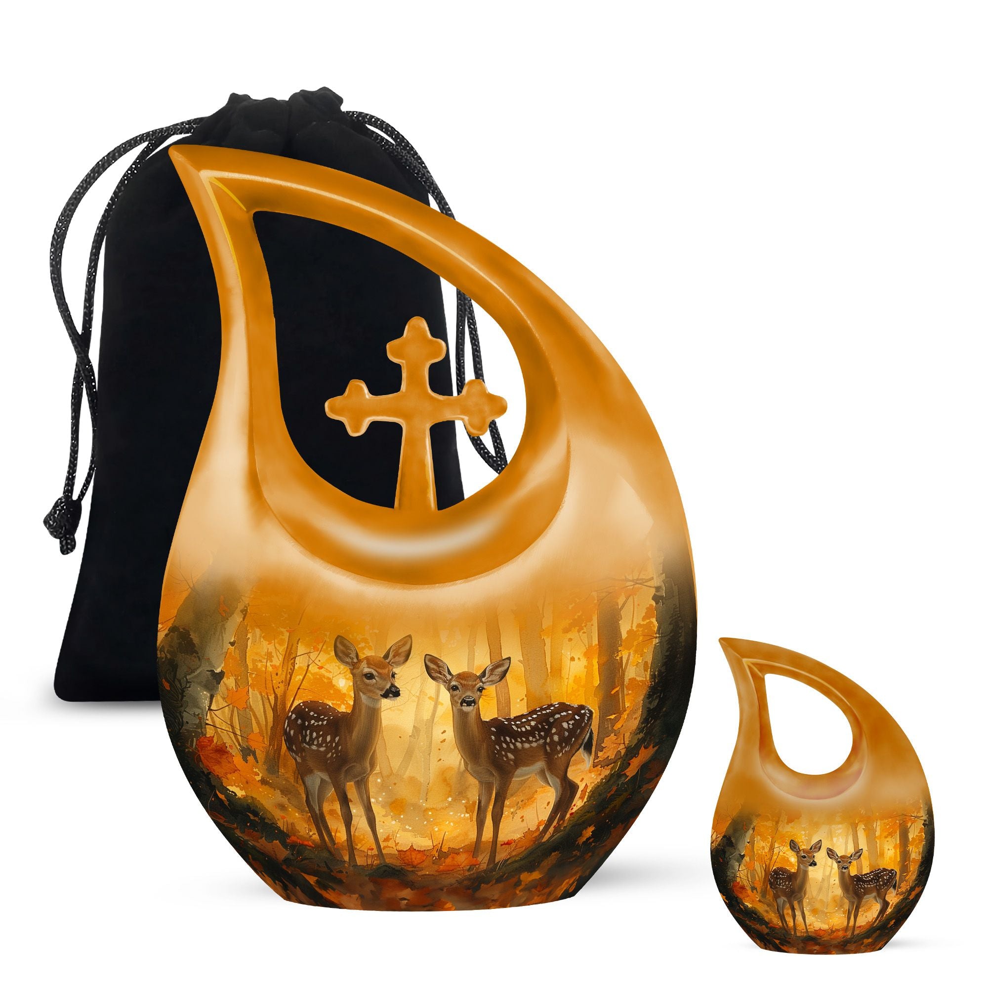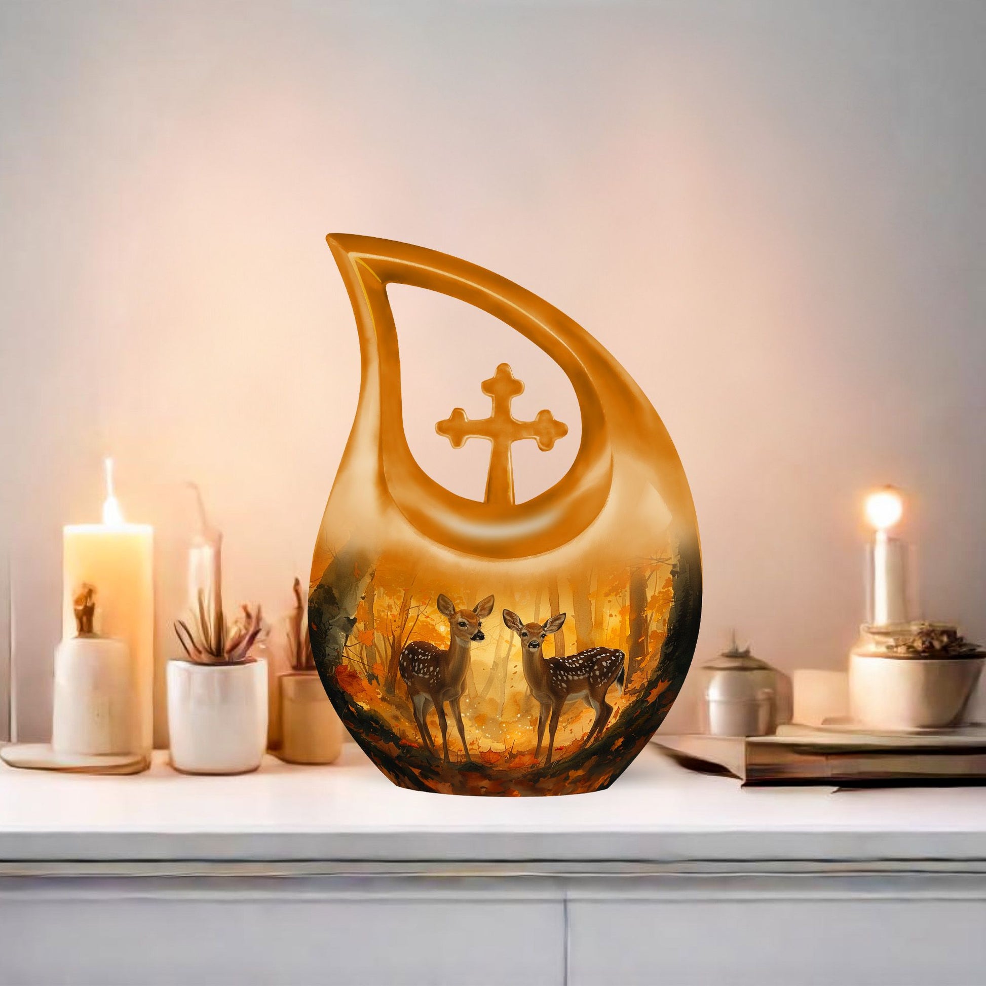 Elevate your memorial traditions with our distinguished Deer Family Urn, a magnificent vessel large enough to preserve precious memories. With a captivating 10-Inch Cross Drop design, our robust, garden-inspired urn boasts a substantial capacity of 200 cubic inches, perfect for safeguarding your loved ones' remains. Thoughtfully crafted from durable aluminium, the urn weighs 3.3 pounds, ensuring a solid structure for lasting beauty and honor. This masterpiece features a personalized touch by allowing the engraving of names, adding an element of warmth to this keepsake cremation urn. Your purchase ensures peace of mind with an included soft velvet pouch, designed for secure containment and protection of ashes. Honor your lost loved ones with this unique, expressive symbol of continued love and respect. Express your forever love and loss with this high-quality, personalized urn for human ashes.