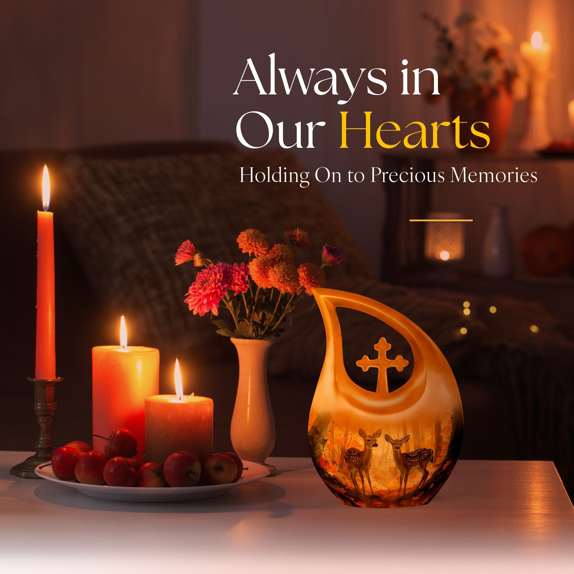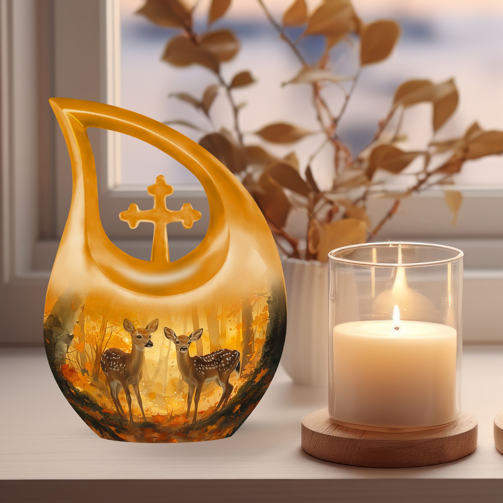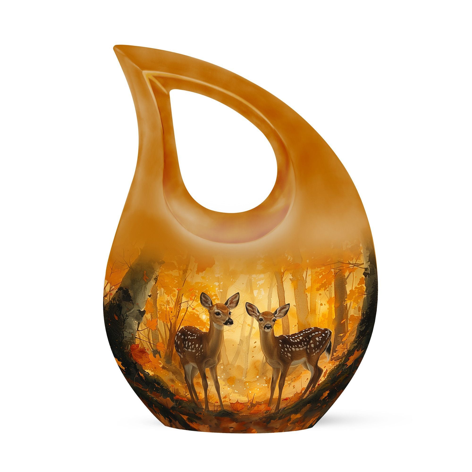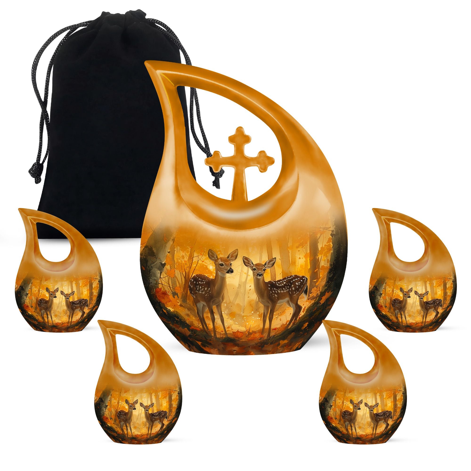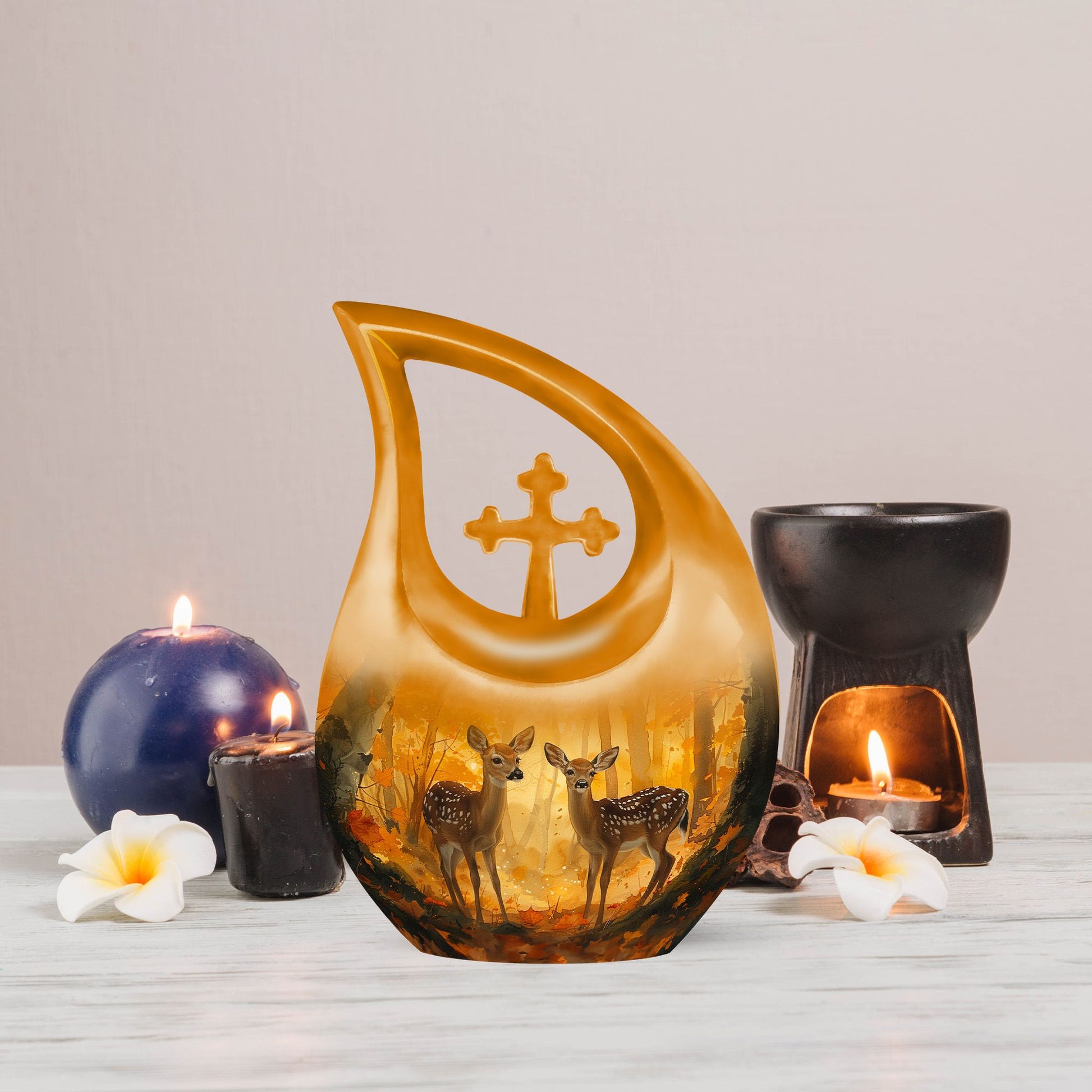 Elevate your memorial traditions with our distinguished Deer Family Urn, a magnificent vessel large enough to preserve precious memories. With a captivating 10-Inch Cross Drop design, our robust, garden-inspired urn boasts a substantial capacity of 200 cubic inches, perfect for safeguarding your loved ones' remains. Thoughtfully crafted from durable aluminium, the urn weighs 3.3 pounds, ensuring a solid structure for lasting beauty and honor. This masterpiece features a personalized touch by allowing the engraving of names, adding an element of warmth to this keepsake cremation urn. Your purchase ensures peace of mind with an included soft velvet pouch, designed for secure containment and protection of ashes. Honor your lost loved ones with this unique, expressive symbol of continued love and respect. Express your forever love and loss with this high-quality, personalized urn for human ashes.