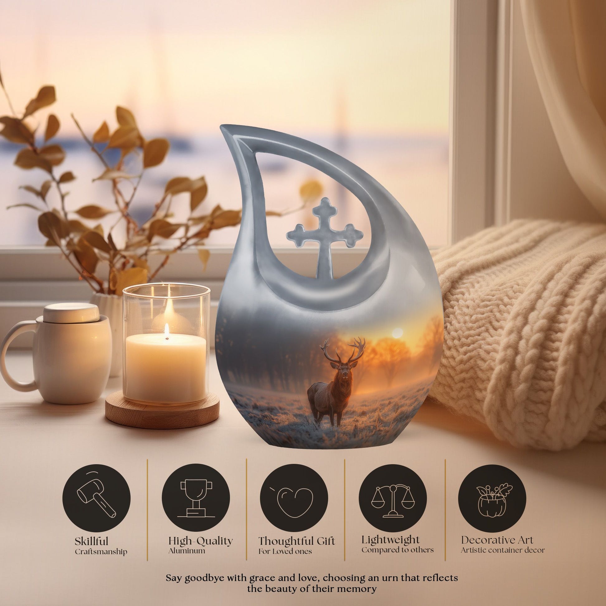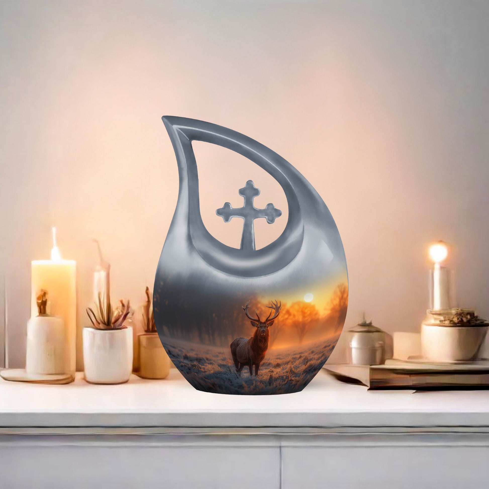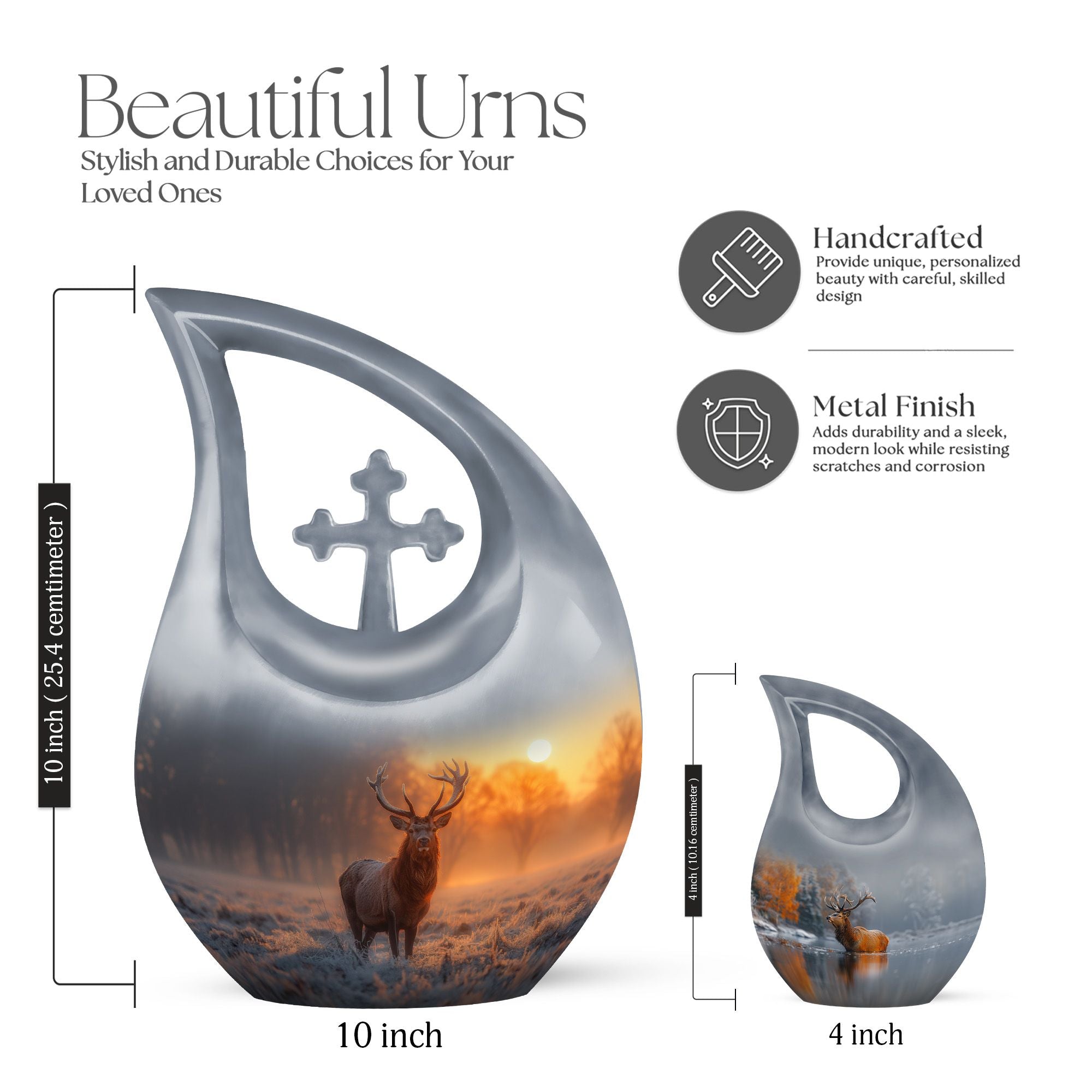 Discover the exquisite craftsmanship of our Deer Urn, a perfect restful place for your dear departed. This 10 Inch Aluminium Cremation Urn resonates with exceptional elegance, featuring an intricately etched Cross Drop design. Suitable for Large Urns types, it boasts a capacity of 200 cubic inches, signifying a commodious space. The Deer theme enlightens a reverential ambiance, making it a timeless tribute to a cherished life. Its robust weight of 3.3 pounds assures stability, and the provided velvet pouch carefully protects the sacred remains. One unique feature of this urn, which places it above regular Cremation Vaults, is the option to personalize with engraved names. Appropriately sized, standing 10 inches in height, it's more meaningful and aesthetic than the typical Urn For Mom or a simple Ashes Container. Trust this Deer Urn as a tasteful choice for memorial urns, with respect, dignity, and tranquility captured in its creation.