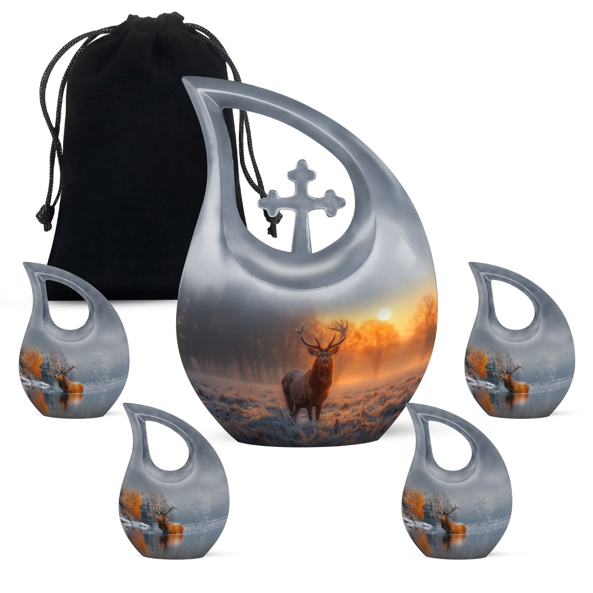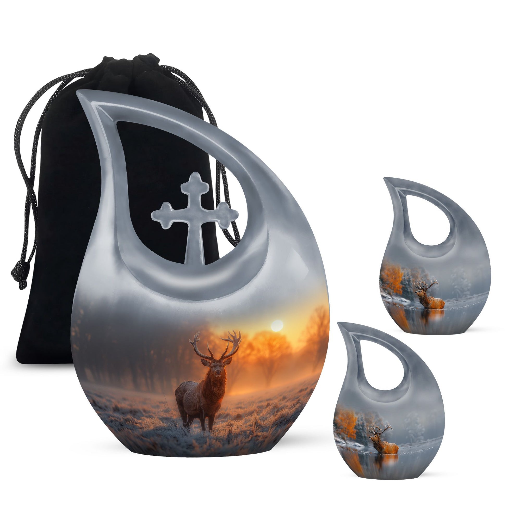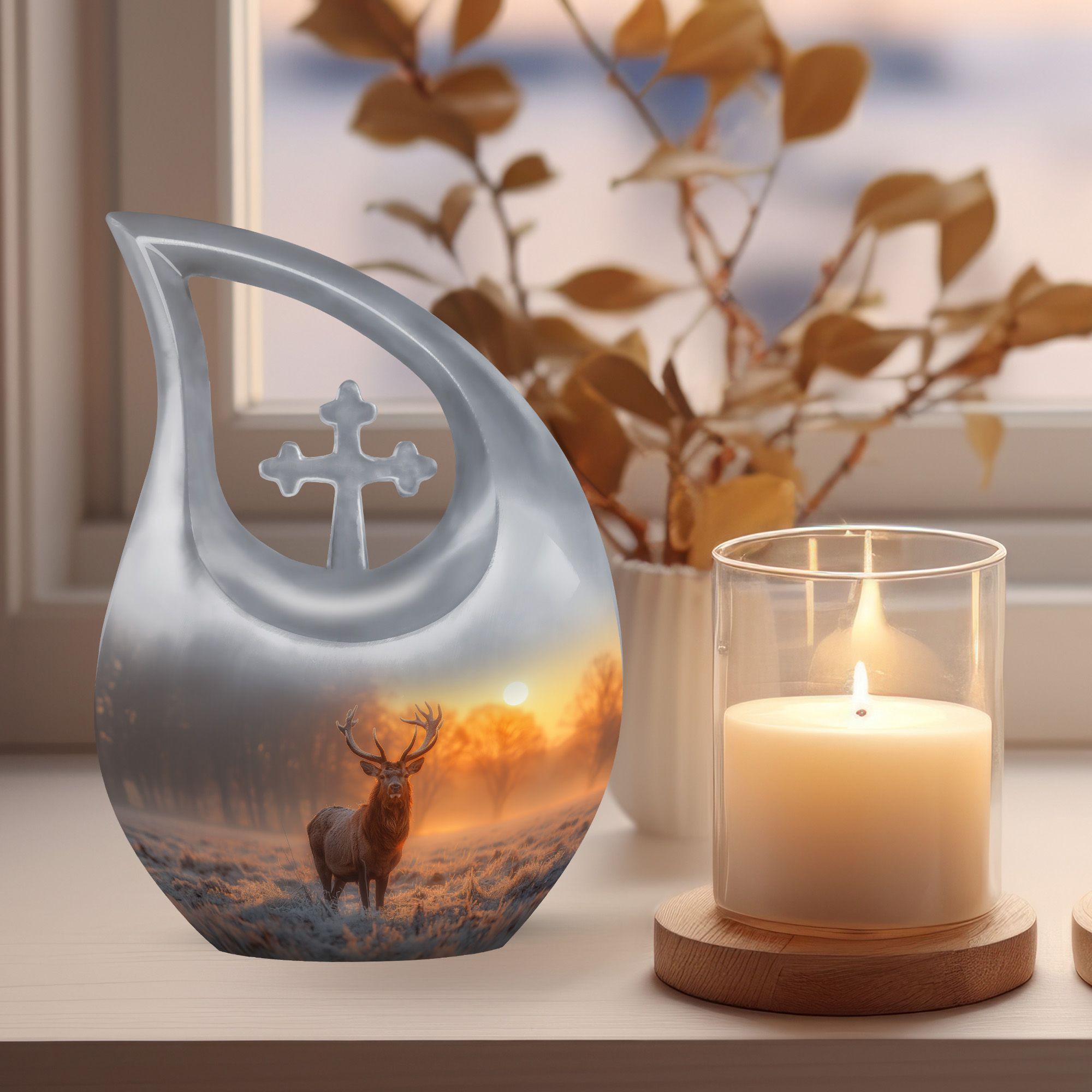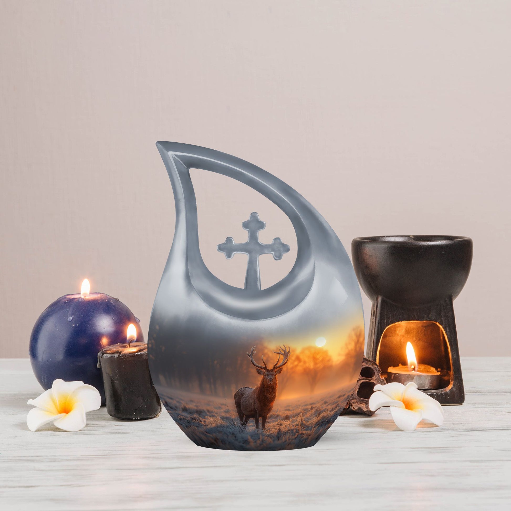 Discover the exquisite craftsmanship of our Deer Urn, a perfect restful place for your dear departed. This 10 Inch Aluminium Cremation Urn resonates with exceptional elegance, featuring an intricately etched Cross Drop design. Suitable for Large Urns types, it boasts a capacity of 200 cubic inches, signifying a commodious space. The Deer theme enlightens a reverential ambiance, making it a timeless tribute to a cherished life. Its robust weight of 3.3 pounds assures stability, and the provided velvet pouch carefully protects the sacred remains. One unique feature of this urn, which places it above regular Cremation Vaults, is the option to personalize with engraved names. Appropriately sized, standing 10 inches in height, it's more meaningful and aesthetic than the typical Urn For Mom or a simple Ashes Container. Trust this Deer Urn as a tasteful choice for memorial urns, with respect, dignity, and tranquility captured in its creation.