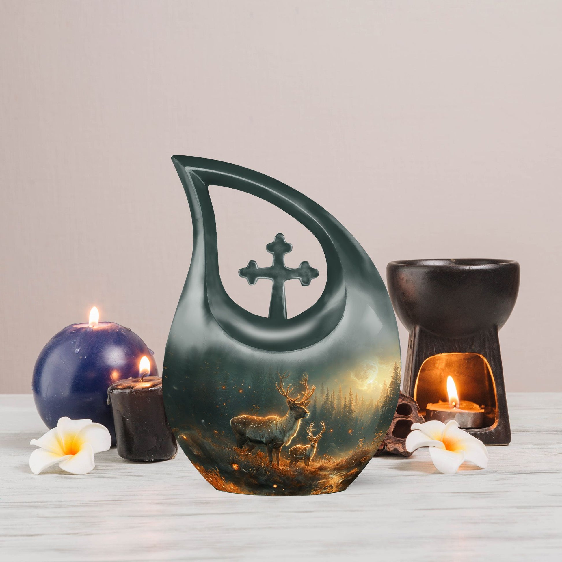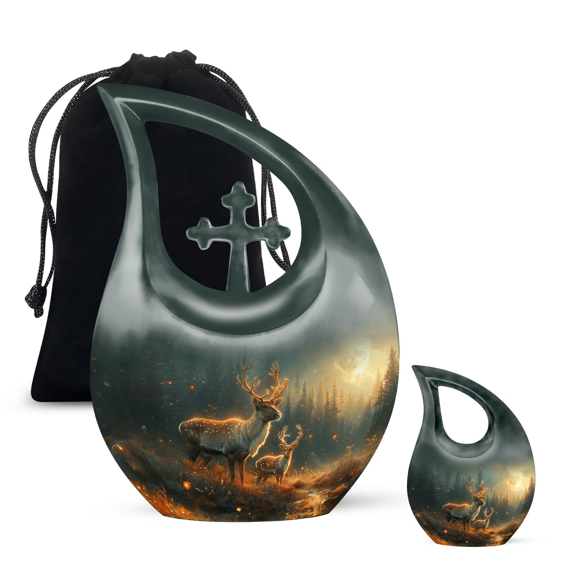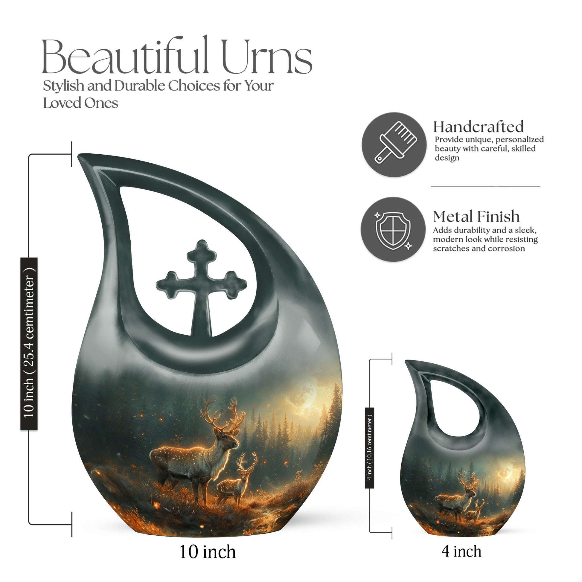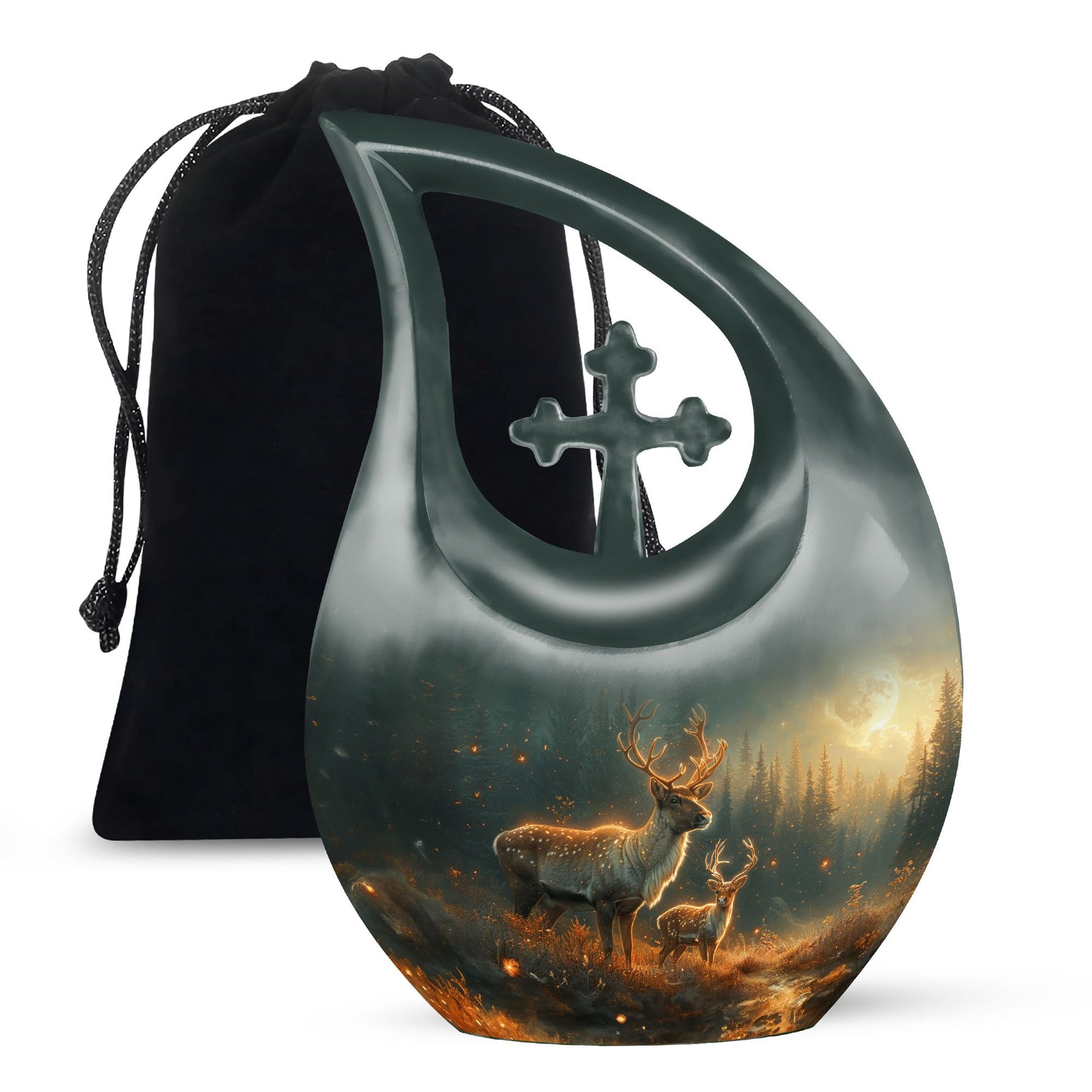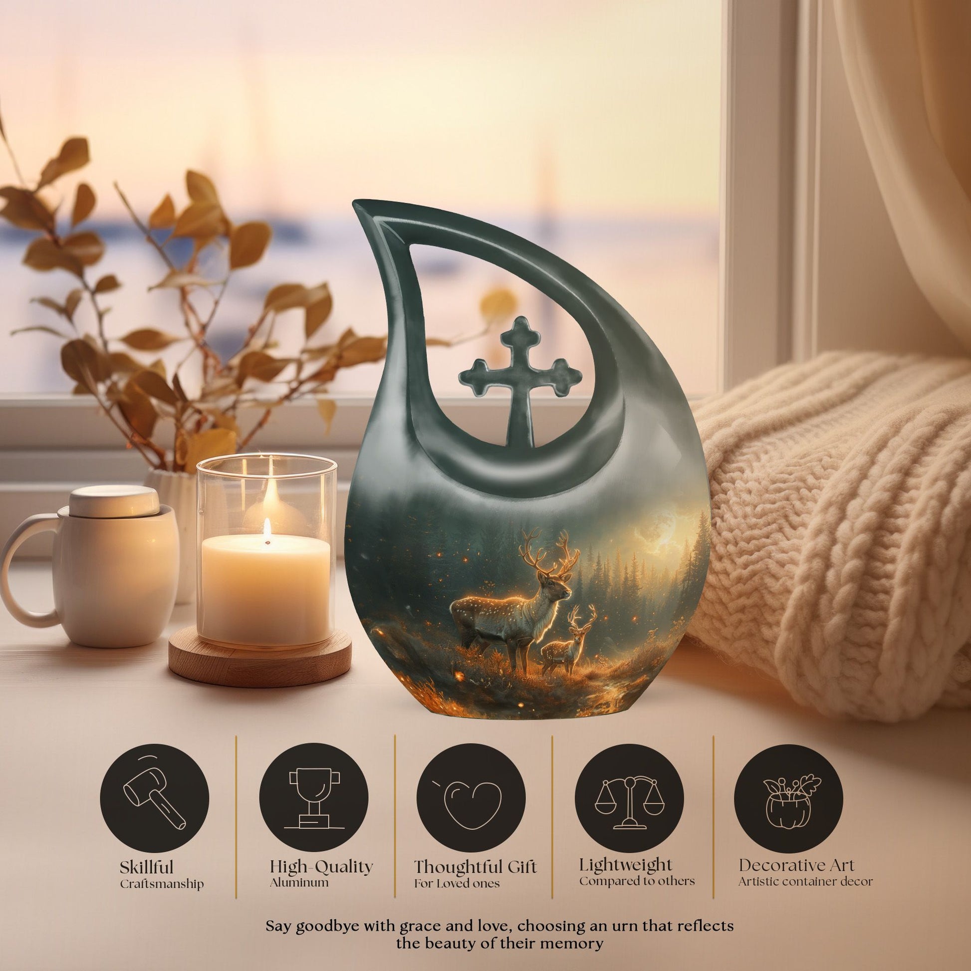 Capture the essence of your cherished one with this captivating Deer Family Urn. Crafted with care from robust aluminium, this Large Urn invites a sense of warmth and honor. It stands tall at a fitting 10 inches in height, with the capacity to comfortably hold up to 200 cubic inches of remains, making it an optimal Urns For Mom of substantial dimensions. Weighing a solid 3.3 pounds, it's symbol of enduring permanence. Its defining characteristic stands to be the unique 'Cross Drop' theme, a benevolent representation of your beloved's spirit. This urn comes with the heartwarming possibility to Personalize with engraved names, rendering it all the more special. Also included is a plush velvet pouch designed for the dignified containment of ashes. Whether you're looking for Cremation Vaults, an Ashes Container, or Urns With Love, this Deer Family Urn embodies an emblem of infinite love and respect, leading the charge in memorial urns of its class.