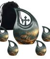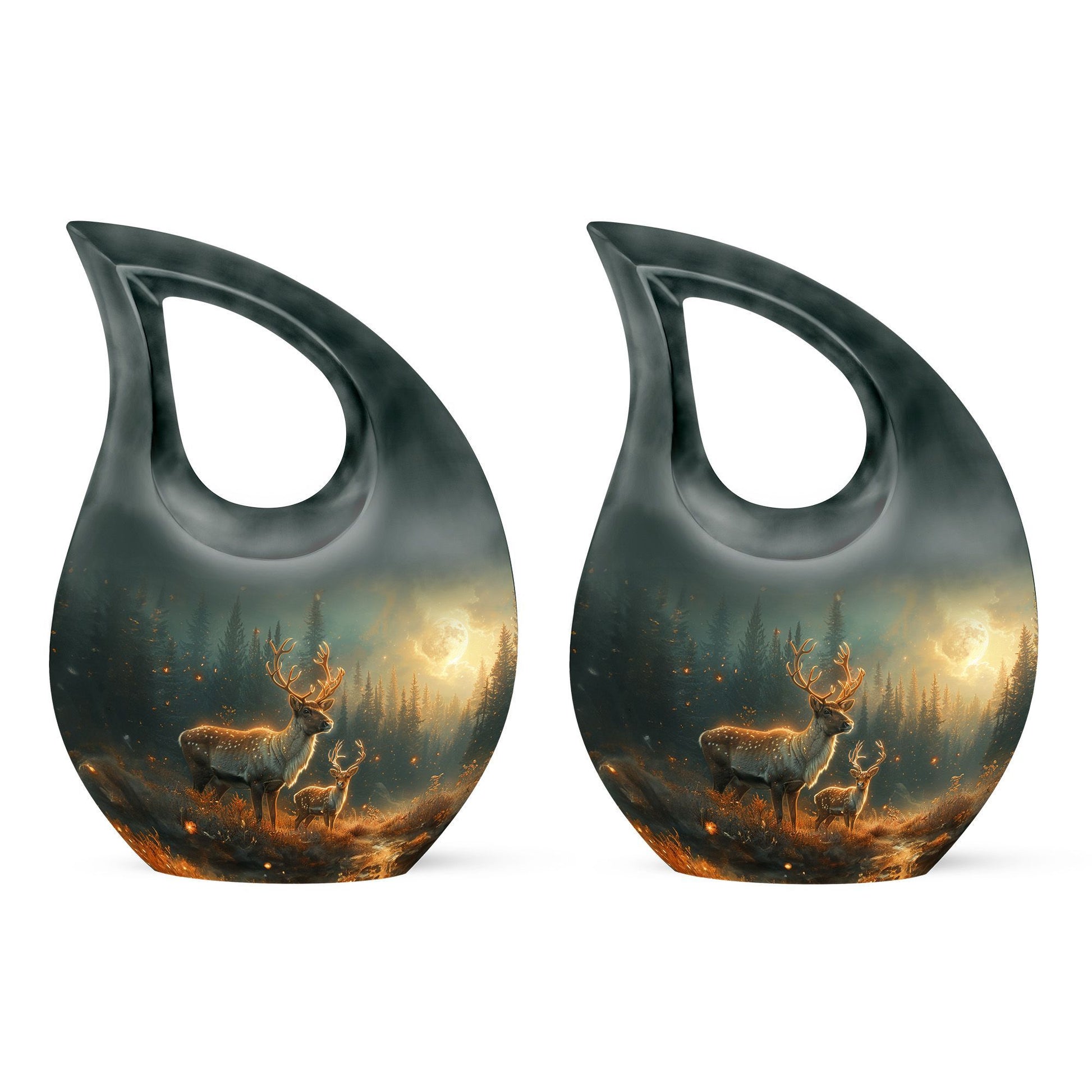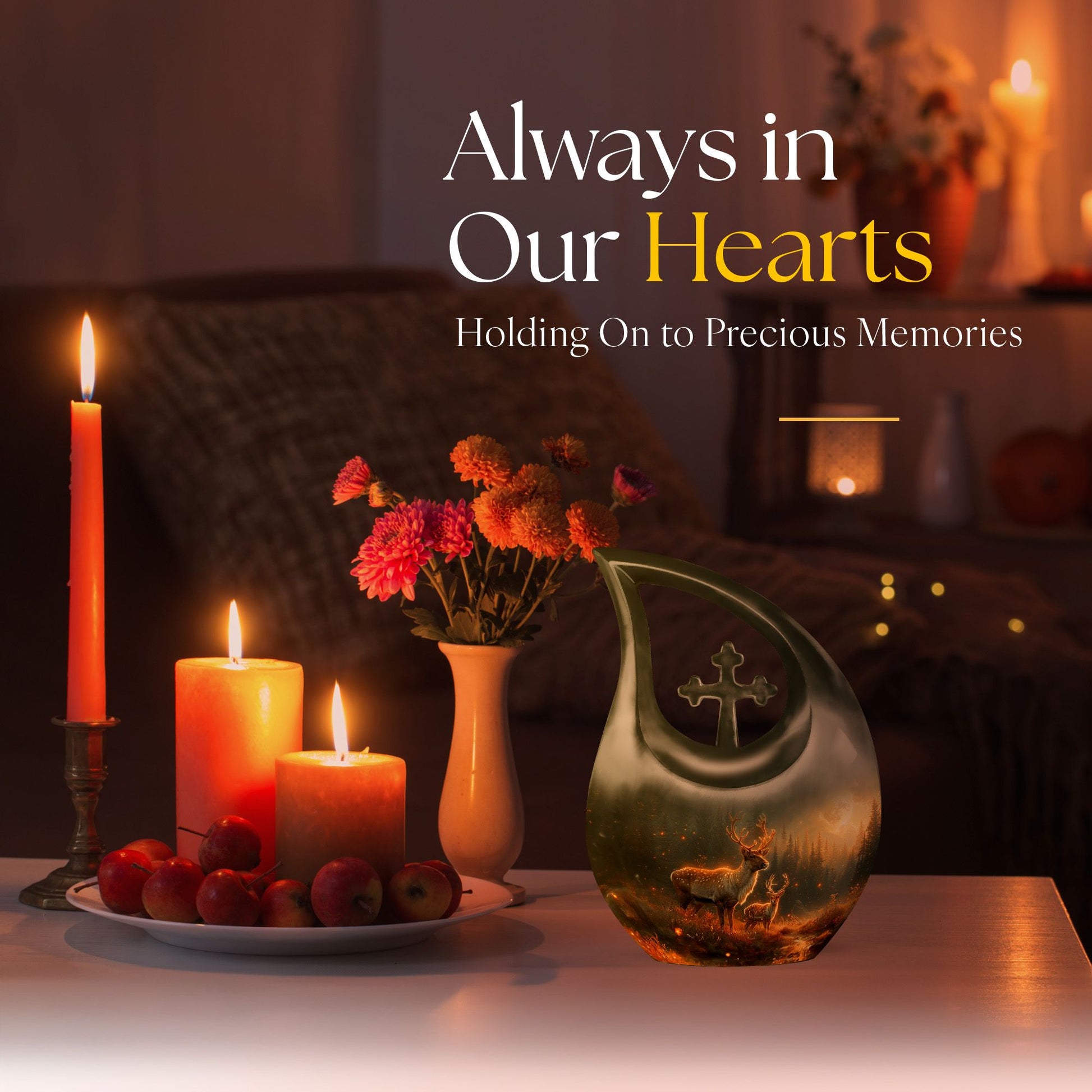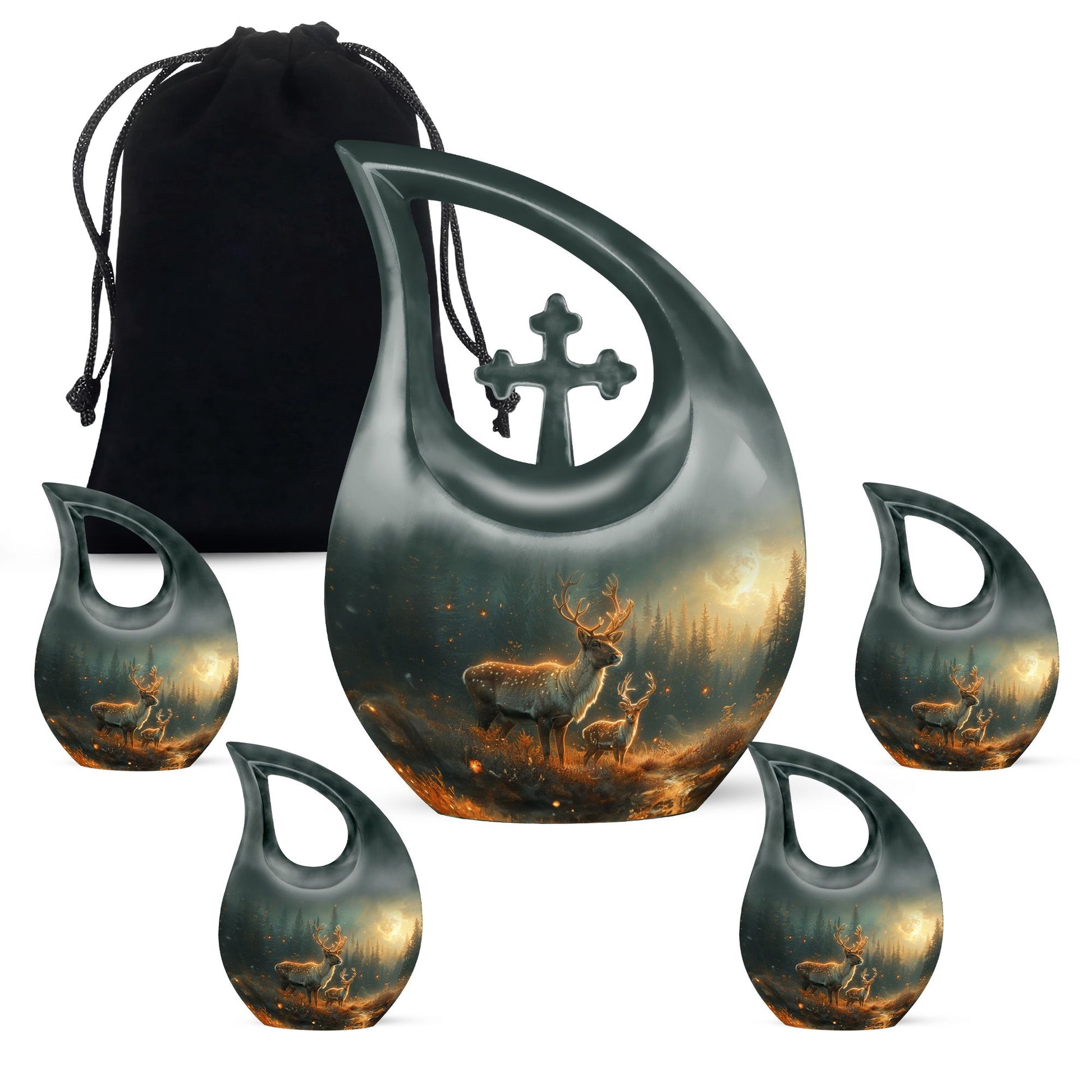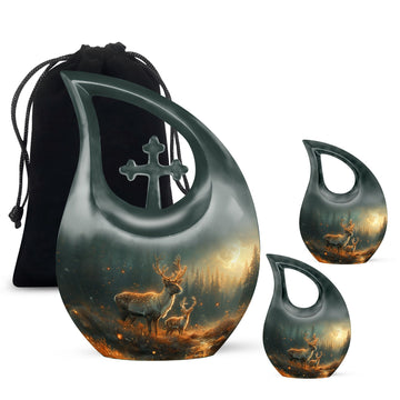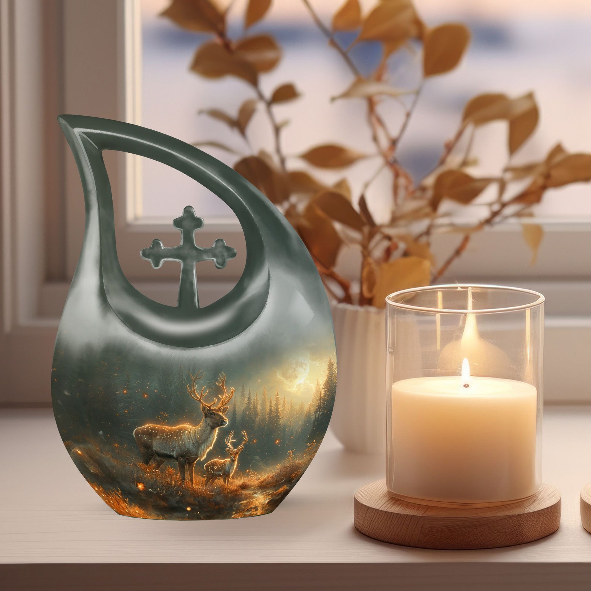 Capture the essence of your cherished one with this captivating Deer Family Urn. Crafted with care from robust aluminium, this Large Urn invites a sense of warmth and honor. It stands tall at a fitting 10 inches in height, with the capacity to comfortably hold up to 200 cubic inches of remains, making it an optimal Urns For Mom of substantial dimensions. Weighing a solid 3.3 pounds, it's symbol of enduring permanence. Its defining characteristic stands to be the unique 'Cross Drop' theme, a benevolent representation of your beloved's spirit. This urn comes with the heartwarming possibility to Personalize with engraved names, rendering it all the more special. Also included is a plush velvet pouch designed for the dignified containment of ashes. Whether you're looking for Cremation Vaults, an Ashes Container, or Urns With Love, this Deer Family Urn embodies an emblem of infinite love and respect, leading the charge in memorial urns of its class.