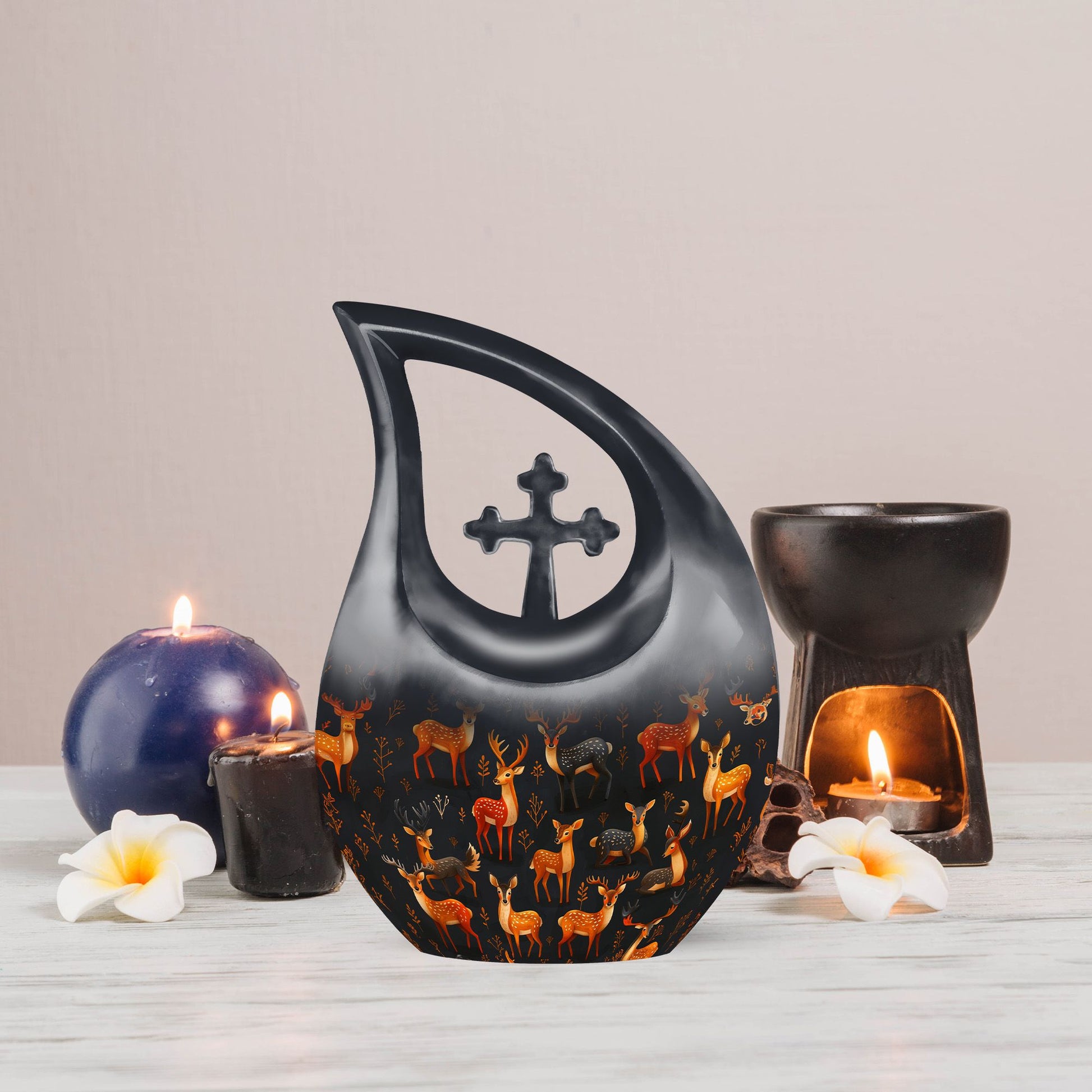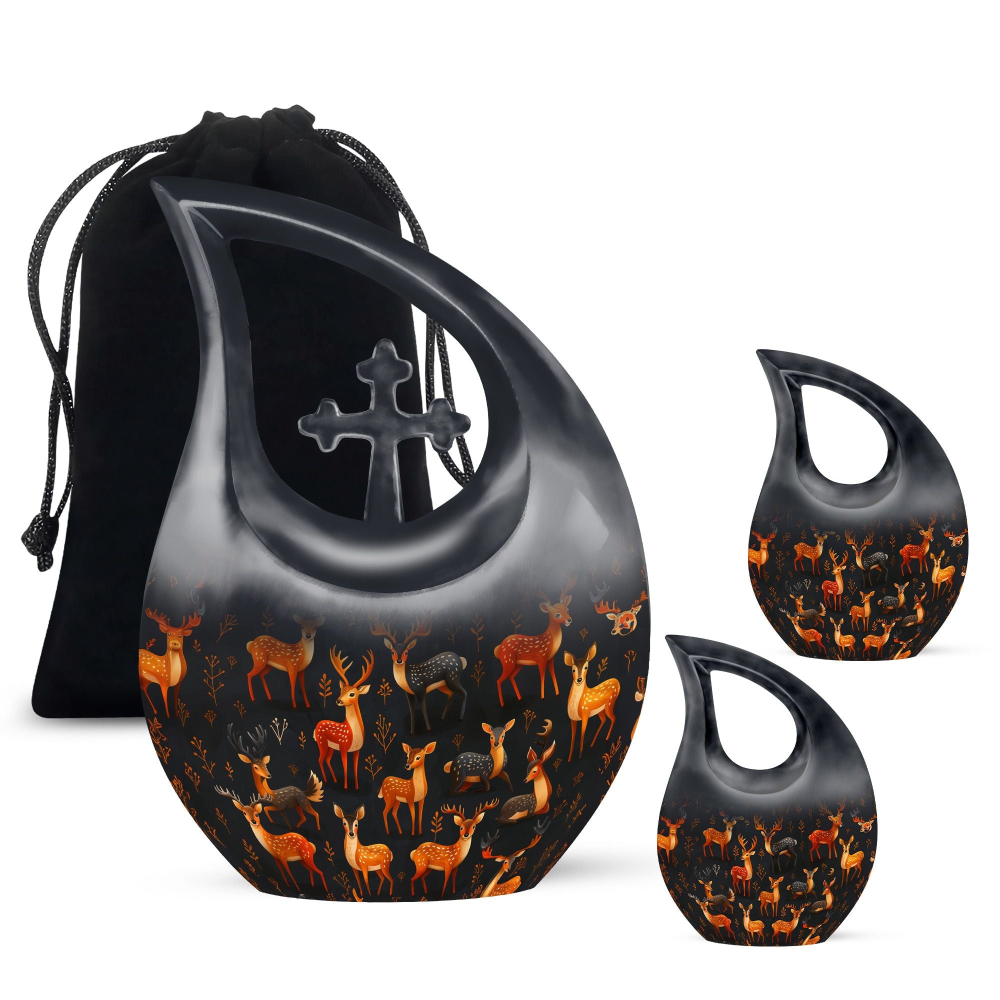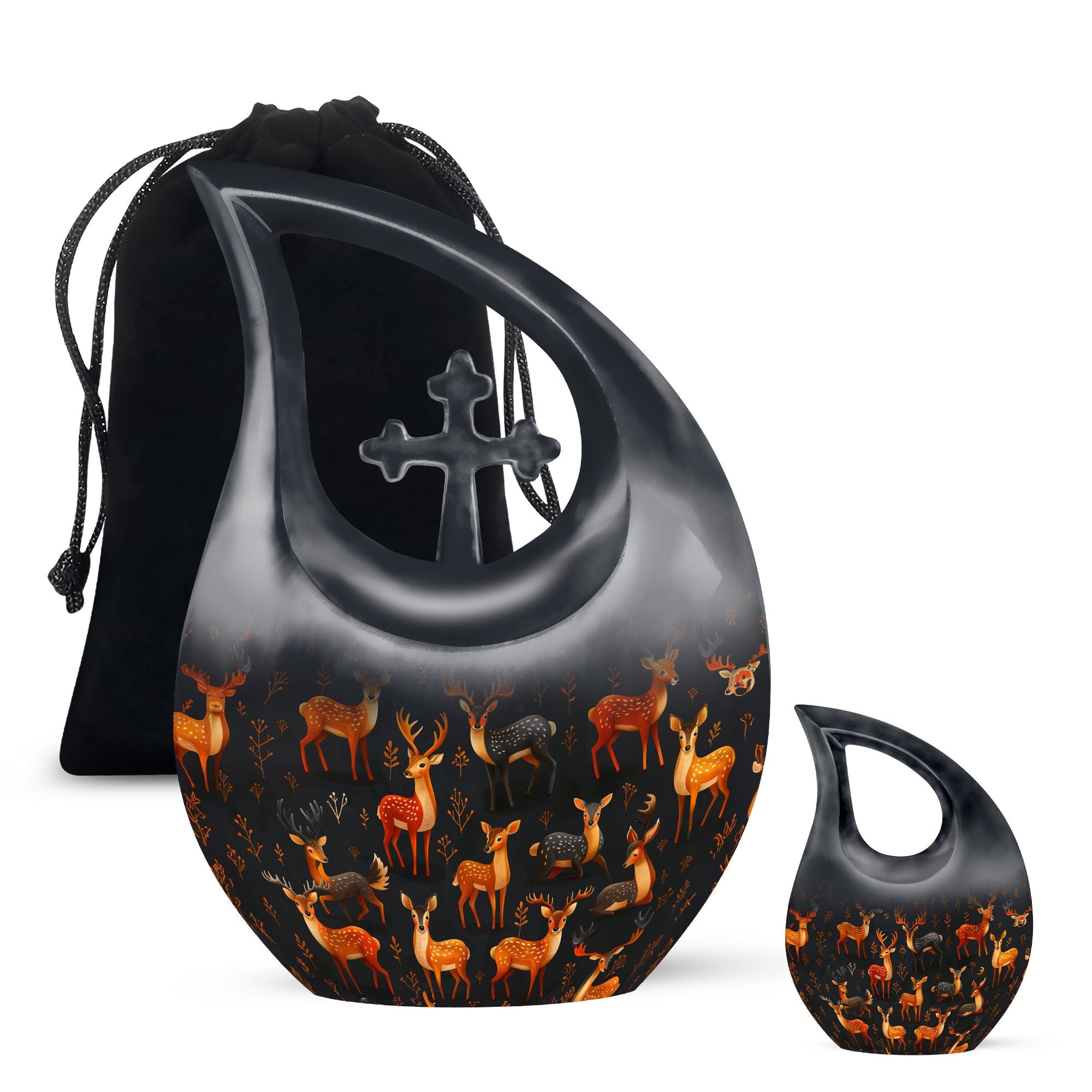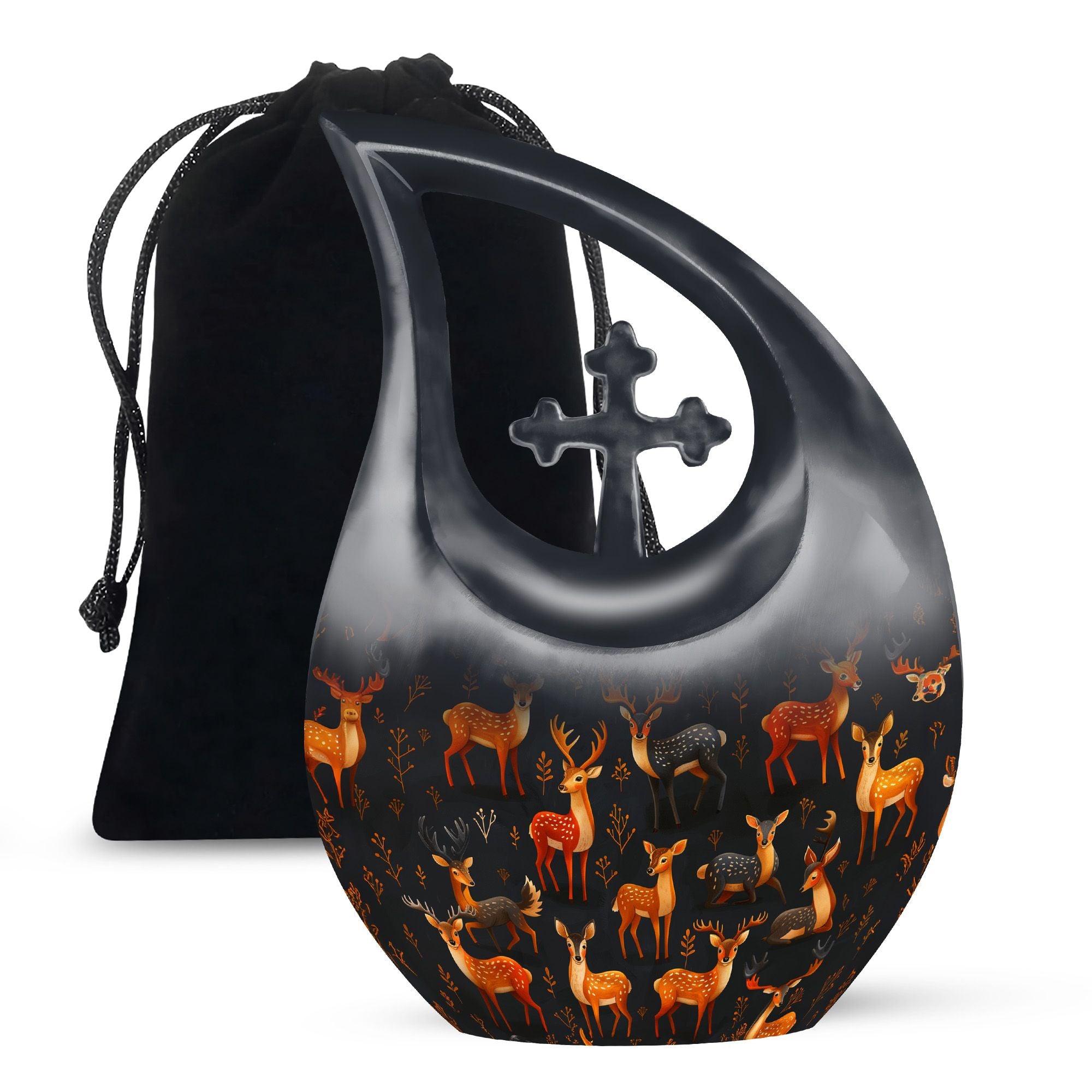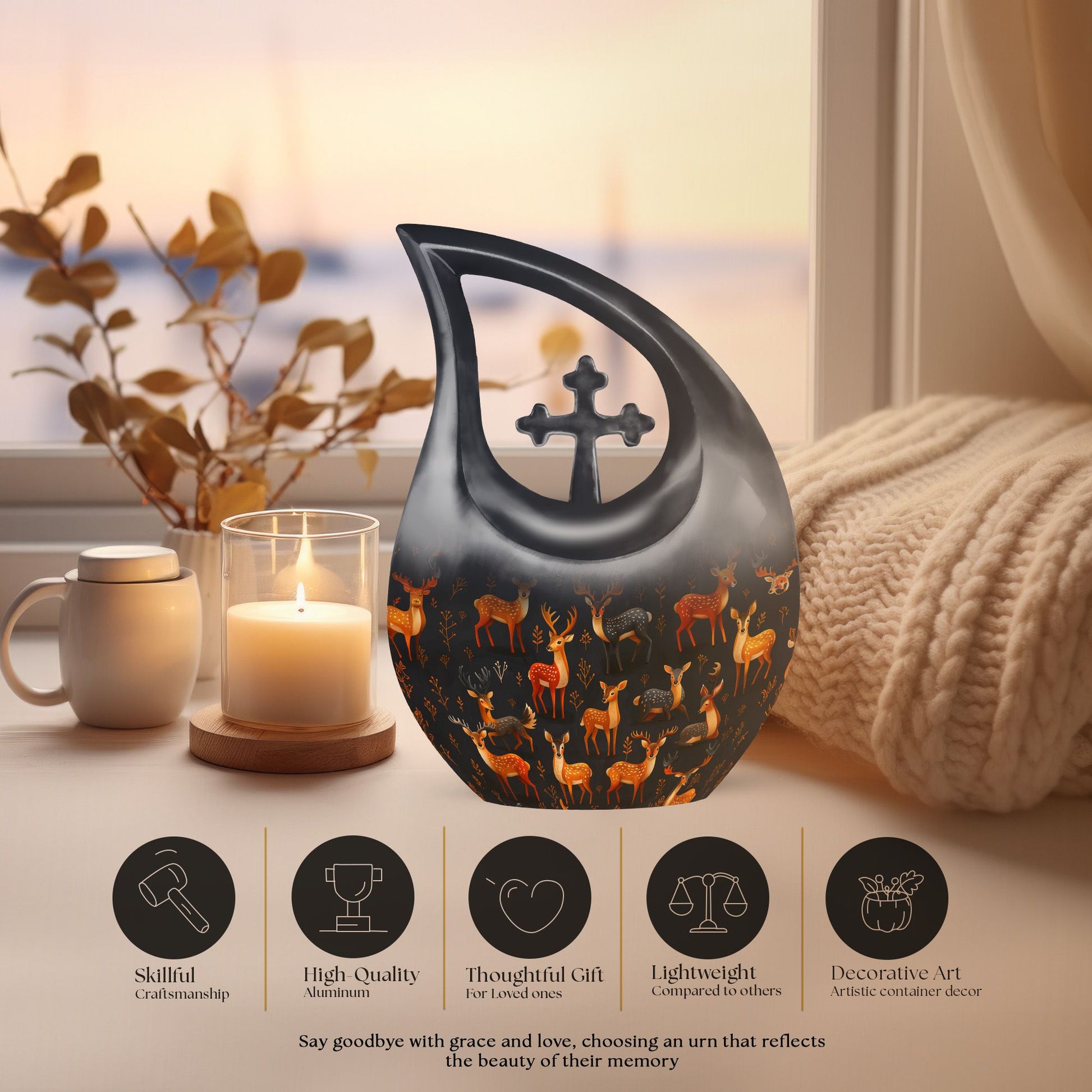 Presenting a poignant tribute to lost loved ones, our Deer Family Urn captivates with its sublime beauty. Crafted with care from high-quality aluminium, our 10-inch large urn weighs a solid 3.3 pounds and showcases a Cross Drop design. Its spacious interior has a capacity of 200 cubic inches, enough to respectfully hold the ashes of an adult. For convenient containment of ashes, a soft velvet pouch is included in the package. We offer the facility of engraving names on the urn to add a personalized touch to your remembrance. This elegantly designed urn serves perfectly as a memorial urn or burial urn for human ashes tracking the needs and search trends of our consumers. Our decorative urn, themed on the harmonious Deer Family, stands a class apart, radiating tranquility. Reflecting your love and emotion, this full-size urn indeed makes a cherished possession. Keywords: Deer Family Urn, Beautiful Urns, Decorative Urns, Memorial Urns, Burial Urns For Human Ashes, Full Size Urns For Human Ashes, Urn For Mom.