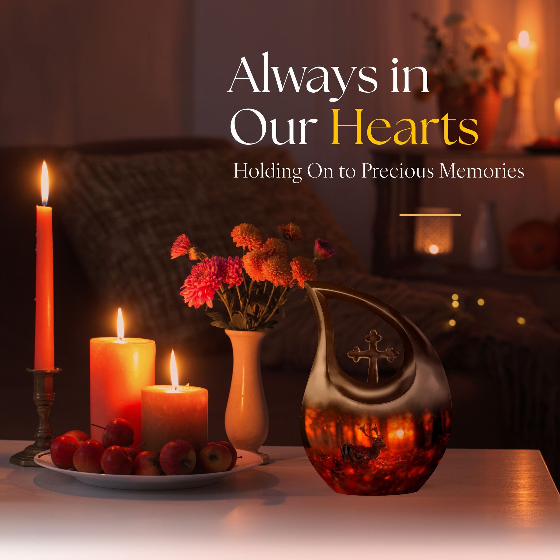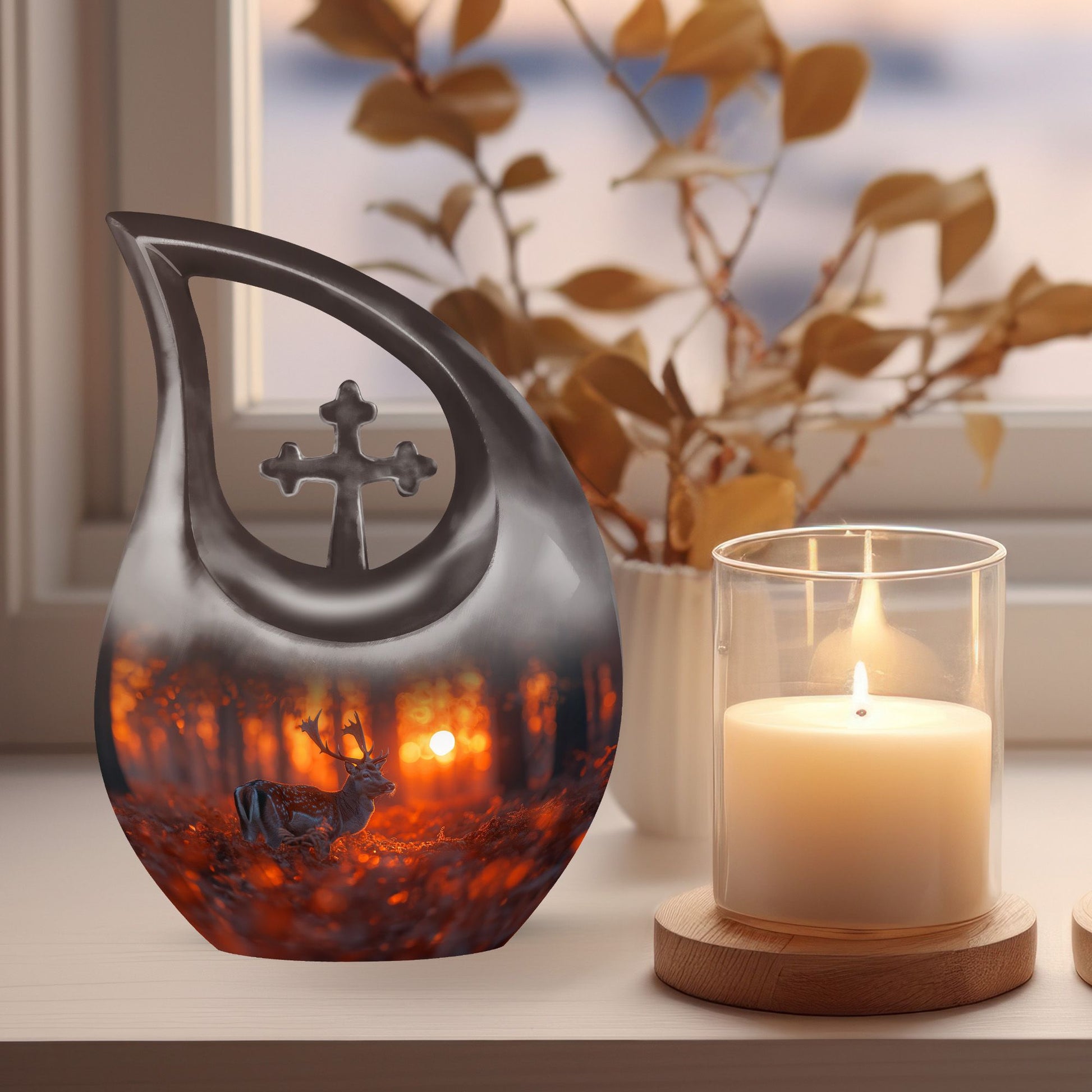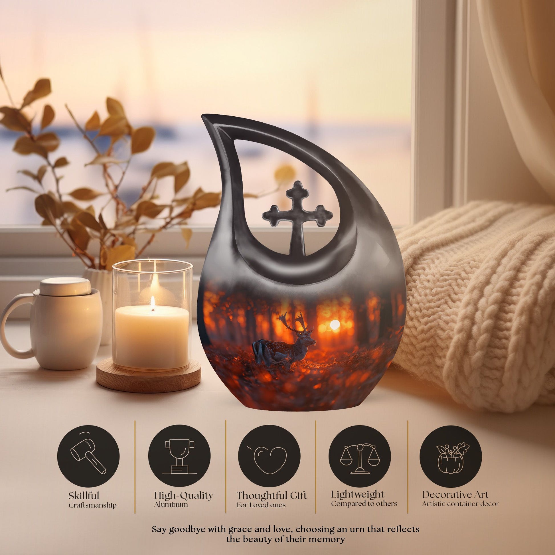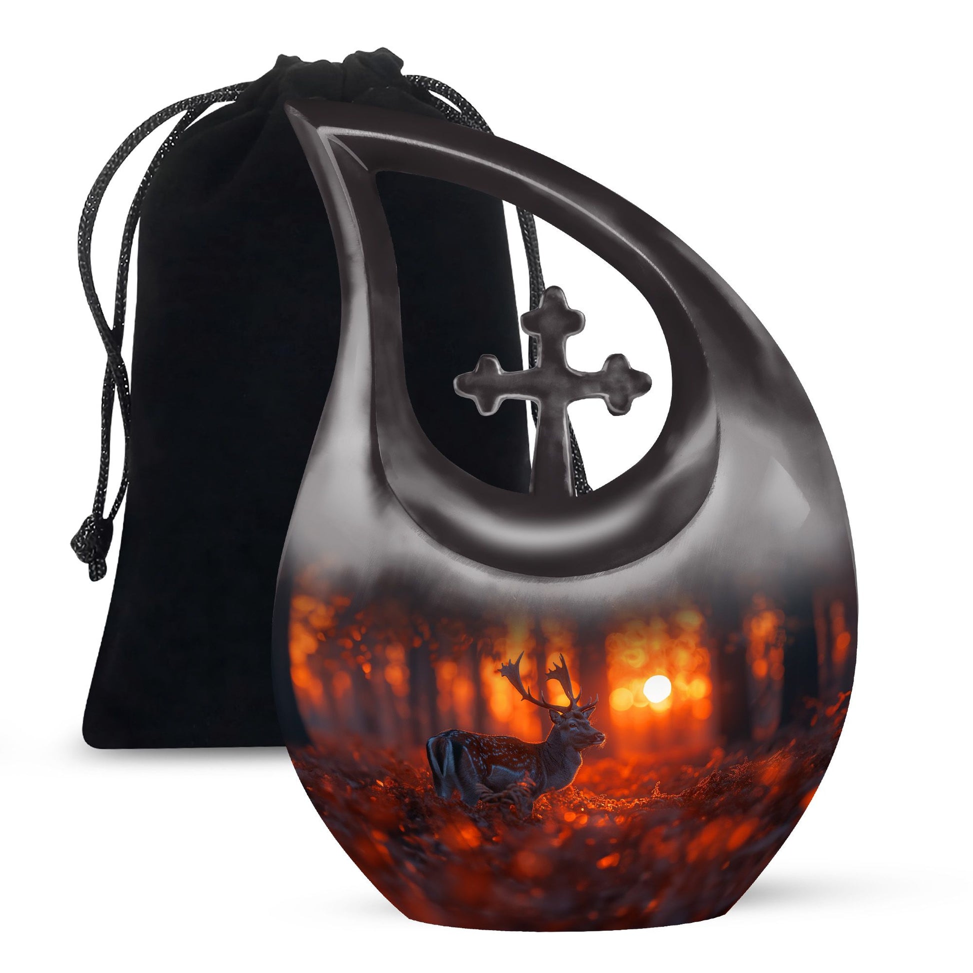 Experience an exemplary tribute to your departed loved one with our respected Deer Urn. These large urns, measuring 10 inches in their admirable stature, are the epitome of a respectful enclosure for human remains. Crafted delicately from durable aluminum, the urns come with an elite 'Cross Drop' theme enhancing the solemnity of their purpose. They possess a vast capacity of 200 cubic inches, accommodating ashes comprehensively. The Deer Urn weighs a versatile 3.3 pounds, ensuring manageability in handling and transportation. A complimentary velvet pouch accompanies each urn, enabling sophisticated containment of the ashes. Furthermore, we offer personalization through engraved names, making the tribute a unique and touching appreciation. Ideal for seniors and adults seeking heartwarming memorial ceremony supplies. The Deer Urn transcends the ordinary—becoming more than just a cremation urn—it becomes a cherished emblem of remembrance. Embracing keywords like 'Deer Urn', 'Urns For Human Remains', 'memorial urns', 'Cremation Urns For Burial', 'Cremation Urns For Sale', 'Butterfly Urns For Ashes', and 'Personalized Urns', this urn leaves an everlasting impression.