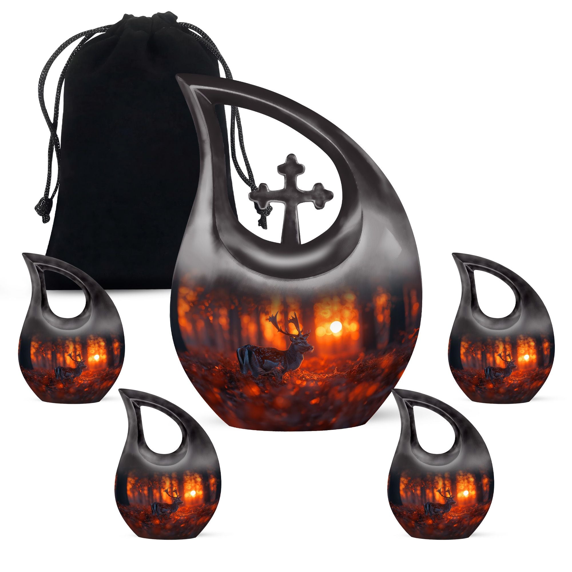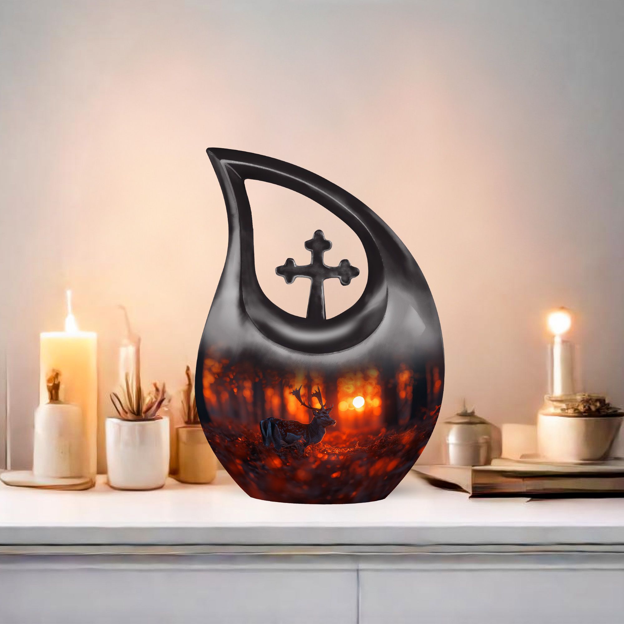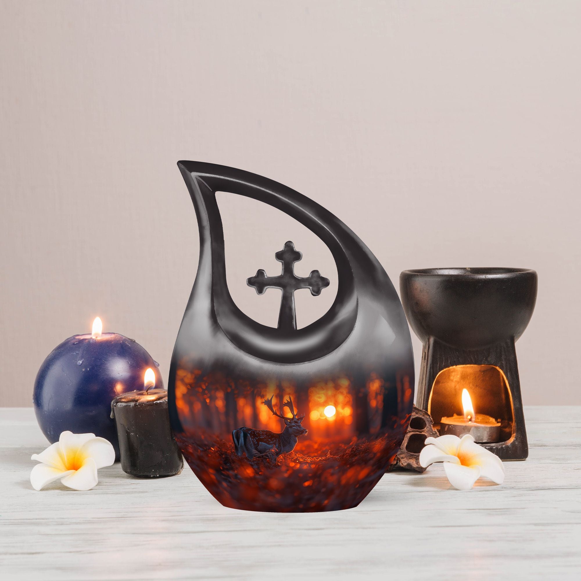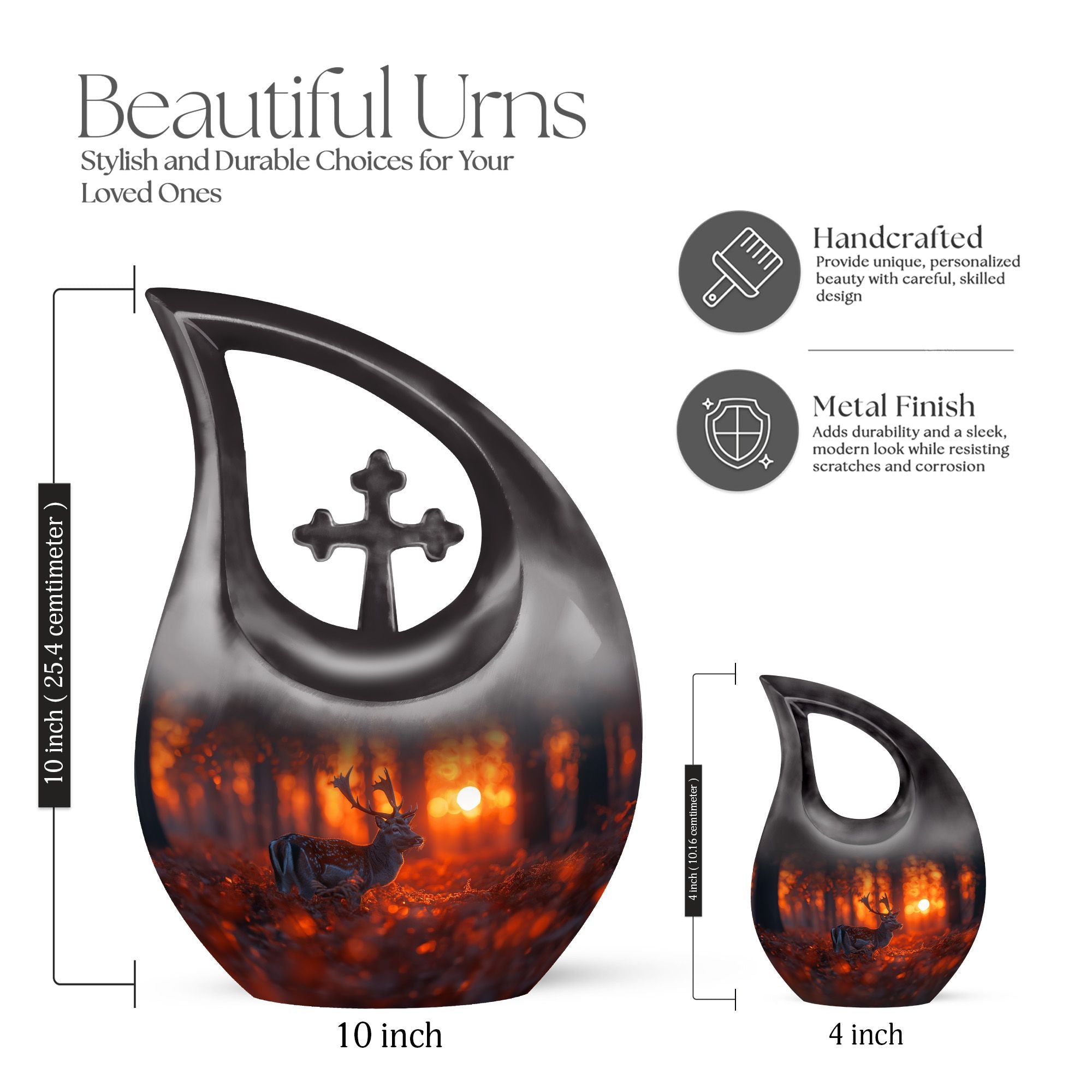Experience an exemplary tribute to your departed loved one with our respected Deer Urn. These large urns, measuring 10 inches in their admirable stature, are the epitome of a respectful enclosure for human remains. Crafted delicately from durable aluminum, the urns come with an elite 'Cross Drop' theme enhancing the solemnity of their purpose. They possess a vast capacity of 200 cubic inches, accommodating ashes comprehensively. The Deer Urn weighs a versatile 3.3 pounds, ensuring manageability in handling and transportation. A complimentary velvet pouch accompanies each urn, enabling sophisticated containment of the ashes. Furthermore, we offer personalization through engraved names, making the tribute a unique and touching appreciation. Ideal for seniors and adults seeking heartwarming memorial ceremony supplies. The Deer Urn transcends the ordinary—becoming more than just a cremation urn—it becomes a cherished emblem of remembrance. Embracing keywords like 'Deer Urn', 'Urns For Human Remains', 'memorial urns', 'Cremation Urns For Burial', 'Cremation Urns For Sale', 'Butterfly Urns For Ashes', and 'Personalized Urns', this urn leaves an everlasting impression.