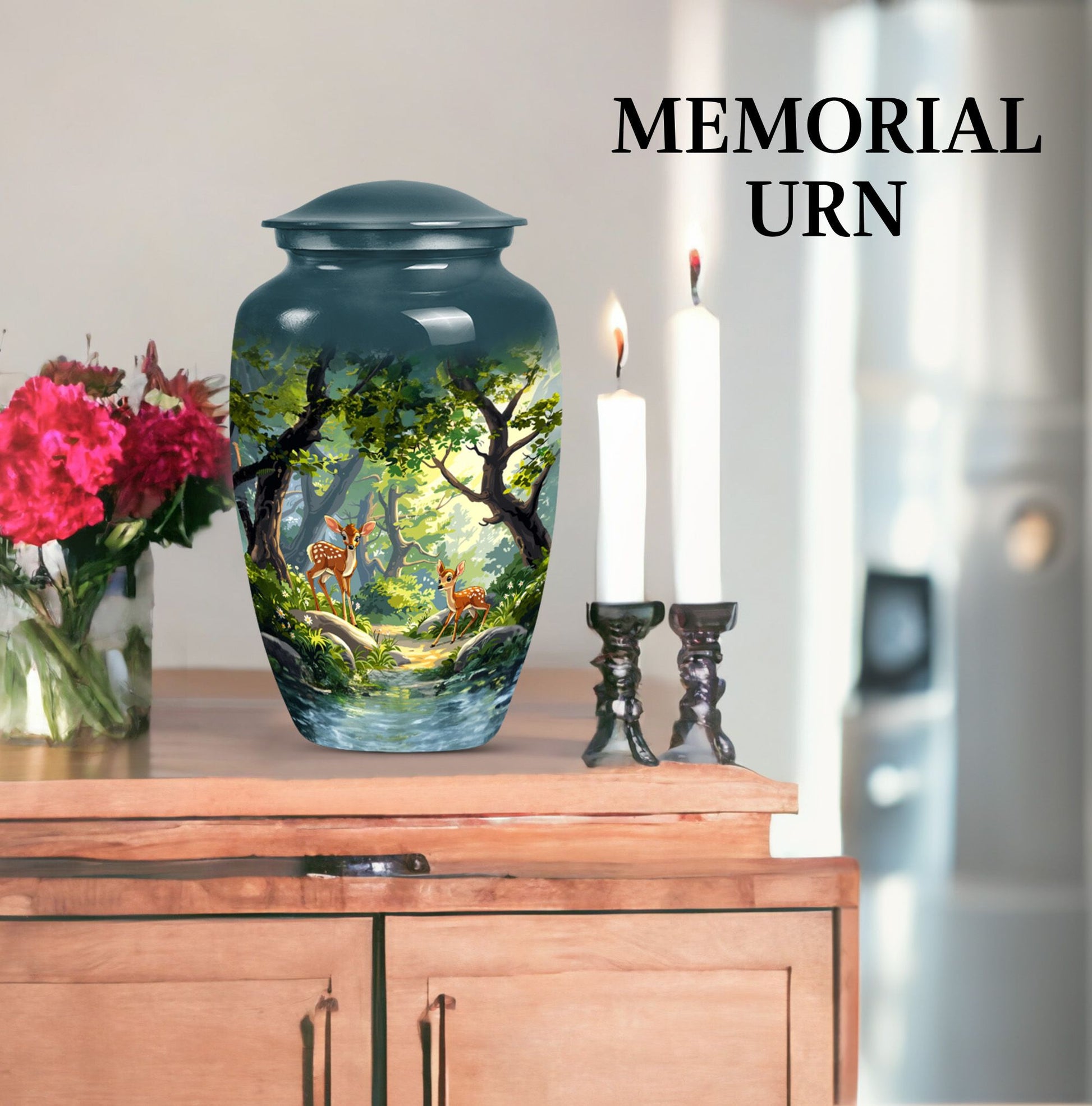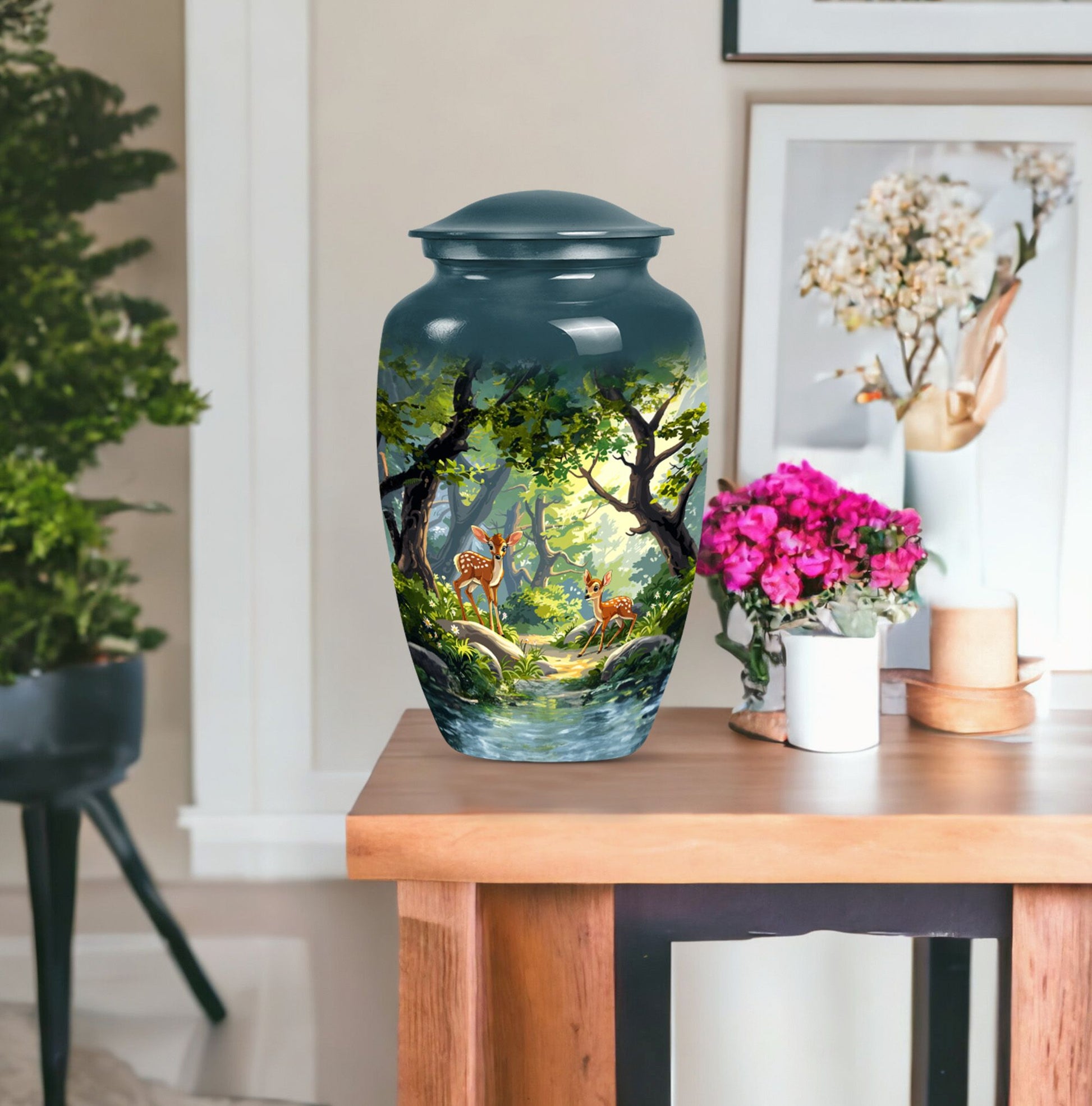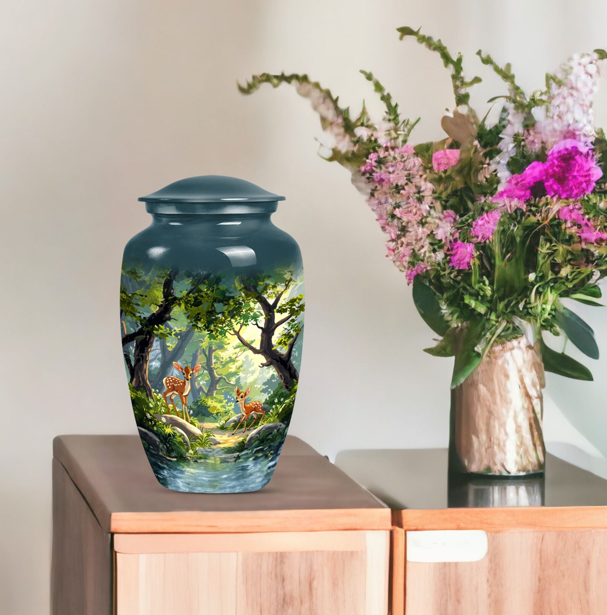 Discover a tasteful way to honor the memory of a loved one with the Classic 10 inch Gramophone Deer Urn. This large cremation urn, crafted from robust and lightweight aluminium, brings sophistication and lasting durability to any memorial ceremony. Painstaking care has been taken over every detail, from its weight of 3.3 pounds to its ideal capacity of 200 cubic inches, perfect for accommodating the needs of most adults. Personal touches matter - that's why we also offer you the opportunity to personalize this funeral urn with engraved names. The urn brings ease-of-use to the forefront with its plush velvet pouch for containment of ashes, adding a subtly dignified touch to the mourning process. This elegant adult cremation urn, ideal for men and women alike, is more than just a metal urn. It's the utter manifestation of reverence.