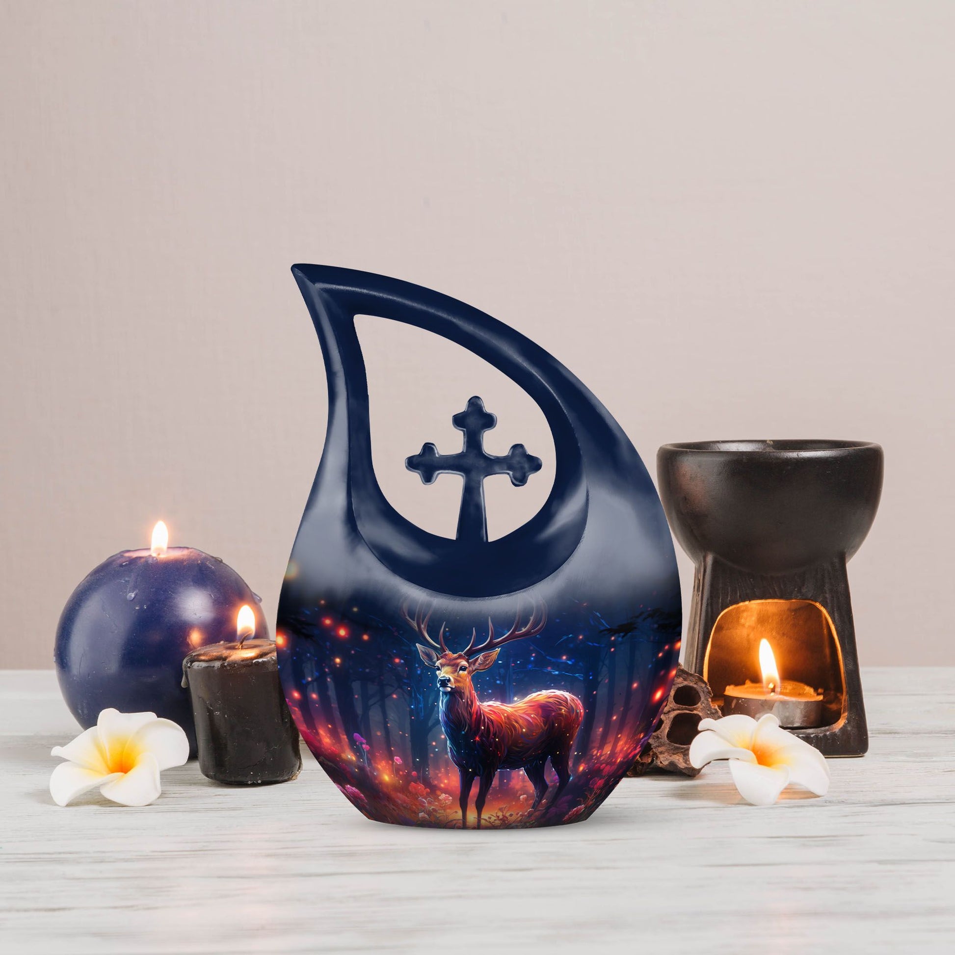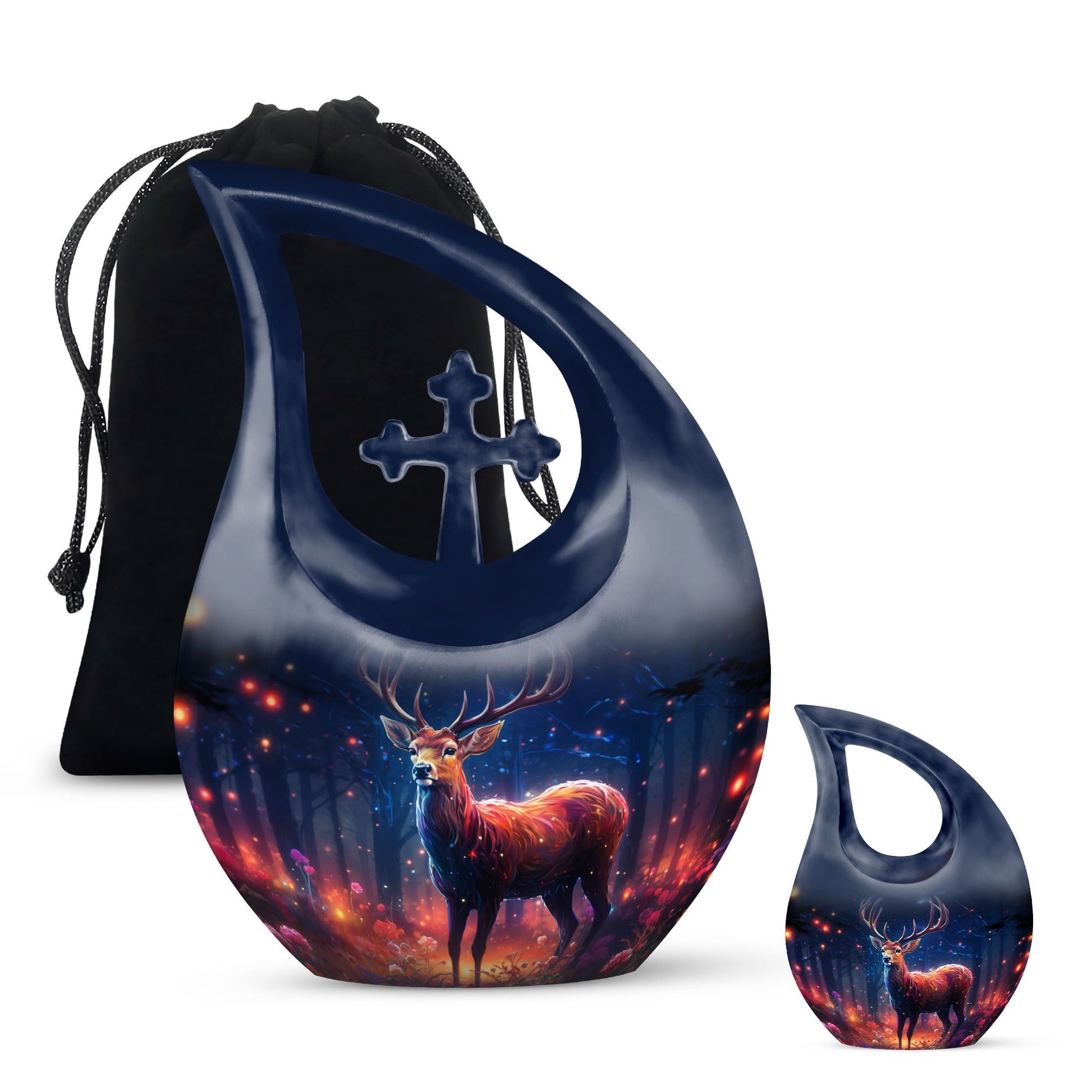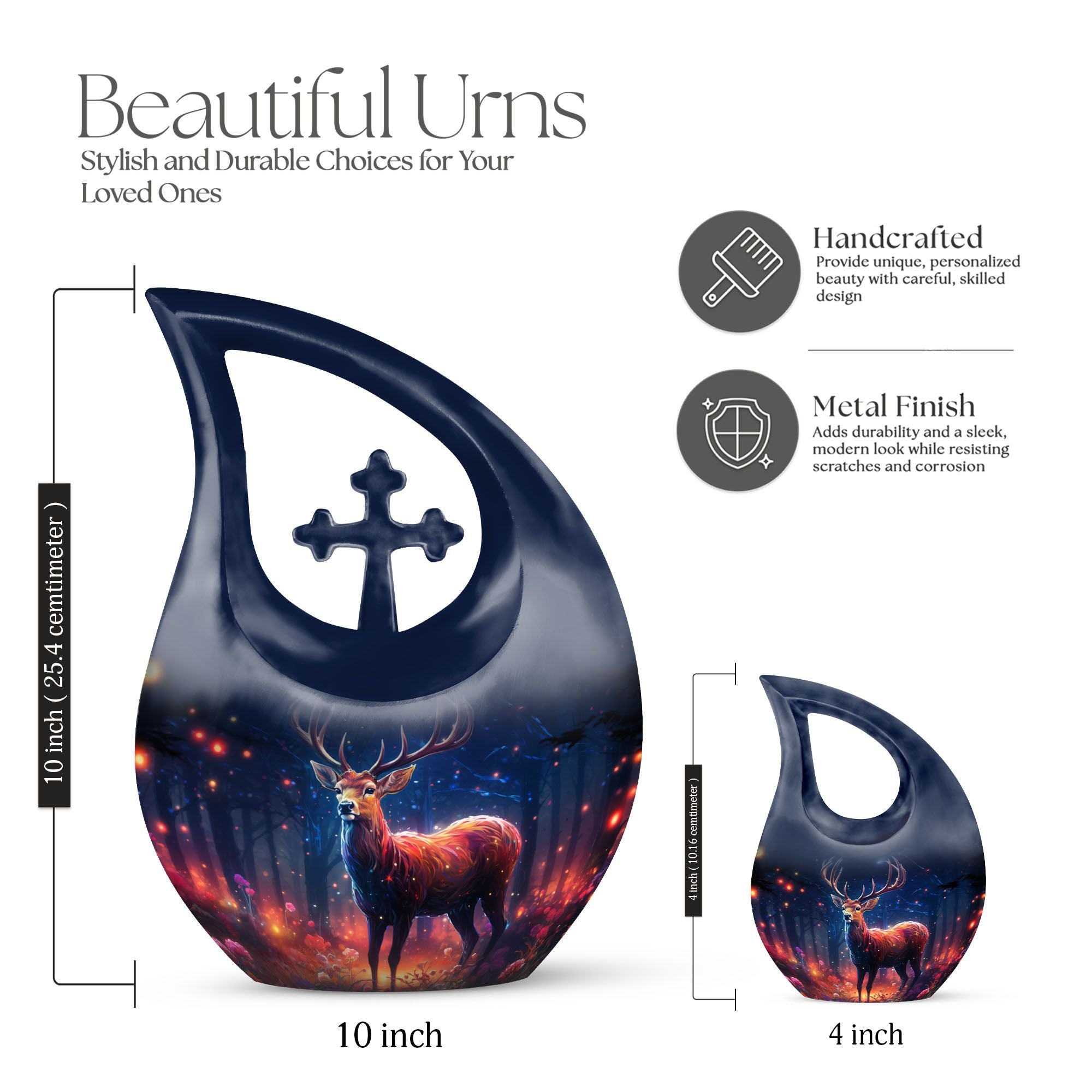 Experience a unique way of paying remembrance to your departed loved ones with our exclusive 10-inch Deer Urn. Delicately crafted from prime aluminium, this urn features a noble 'Cross Drop' design neatly complemented by a serene Deer theme. The urn offers an ample capacity of 200 cubic inches, making it suitable to preserve the ashes of adults and seniors alike. Weighing a solid 3.3 pounds and standing proudly at a height of 10 inches, this marble urn is designed for durability, offering a long-lasting memorial to your cherished one. For added convenience, each purchase comes with a plush velvet pouch, offering safe containment for the cremains. As a distinguished choice among cremation box for ashes, personalize your Deer Urn with engraved names, making it a heartfelt repository for your loved one's ashes keepsakes. This product emerges as a profound choice in 'Urns for Women's Ashes', reflecting the refined selection in 'Marble Urns For Sale'.