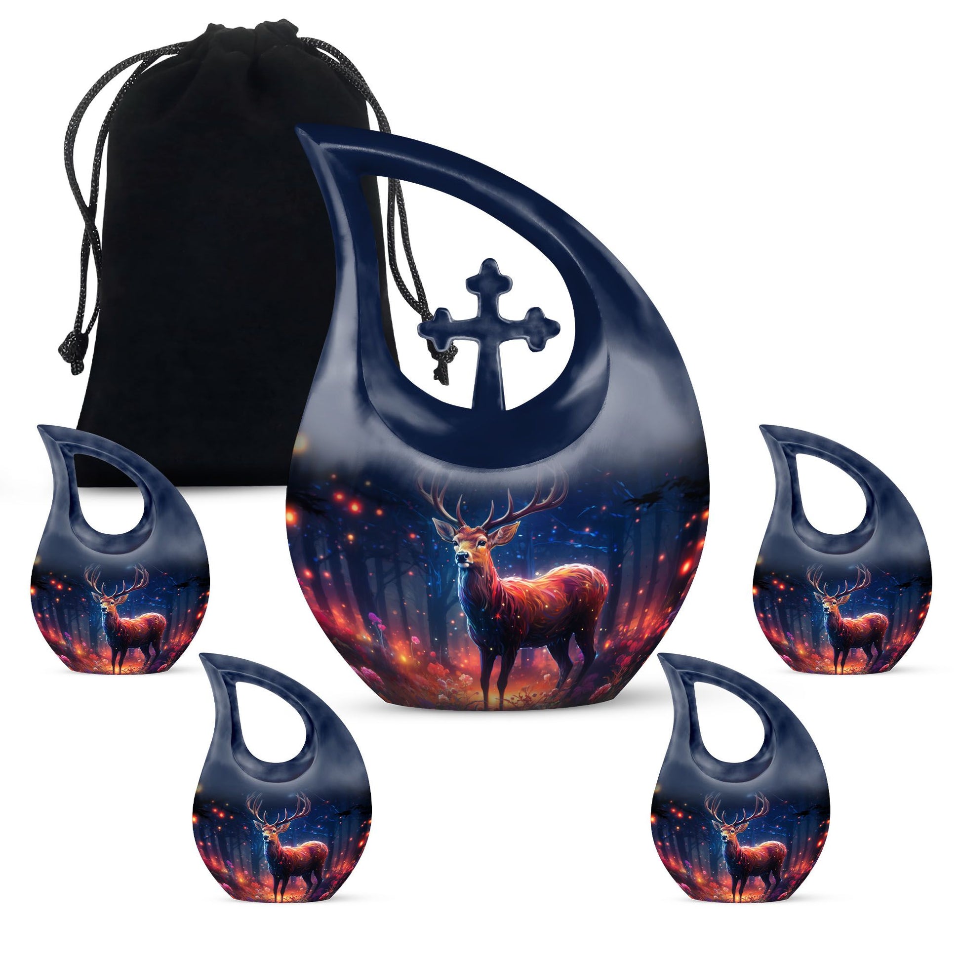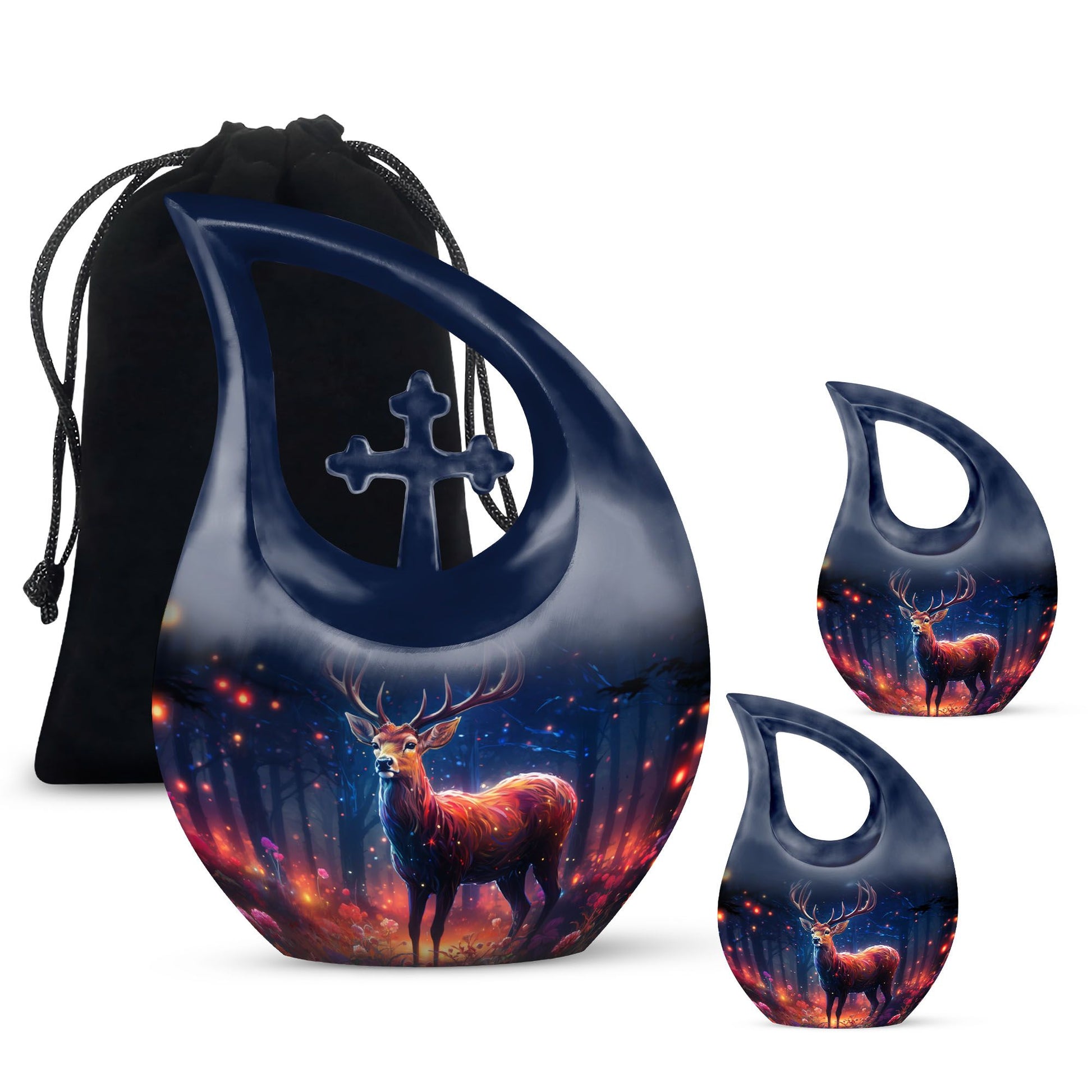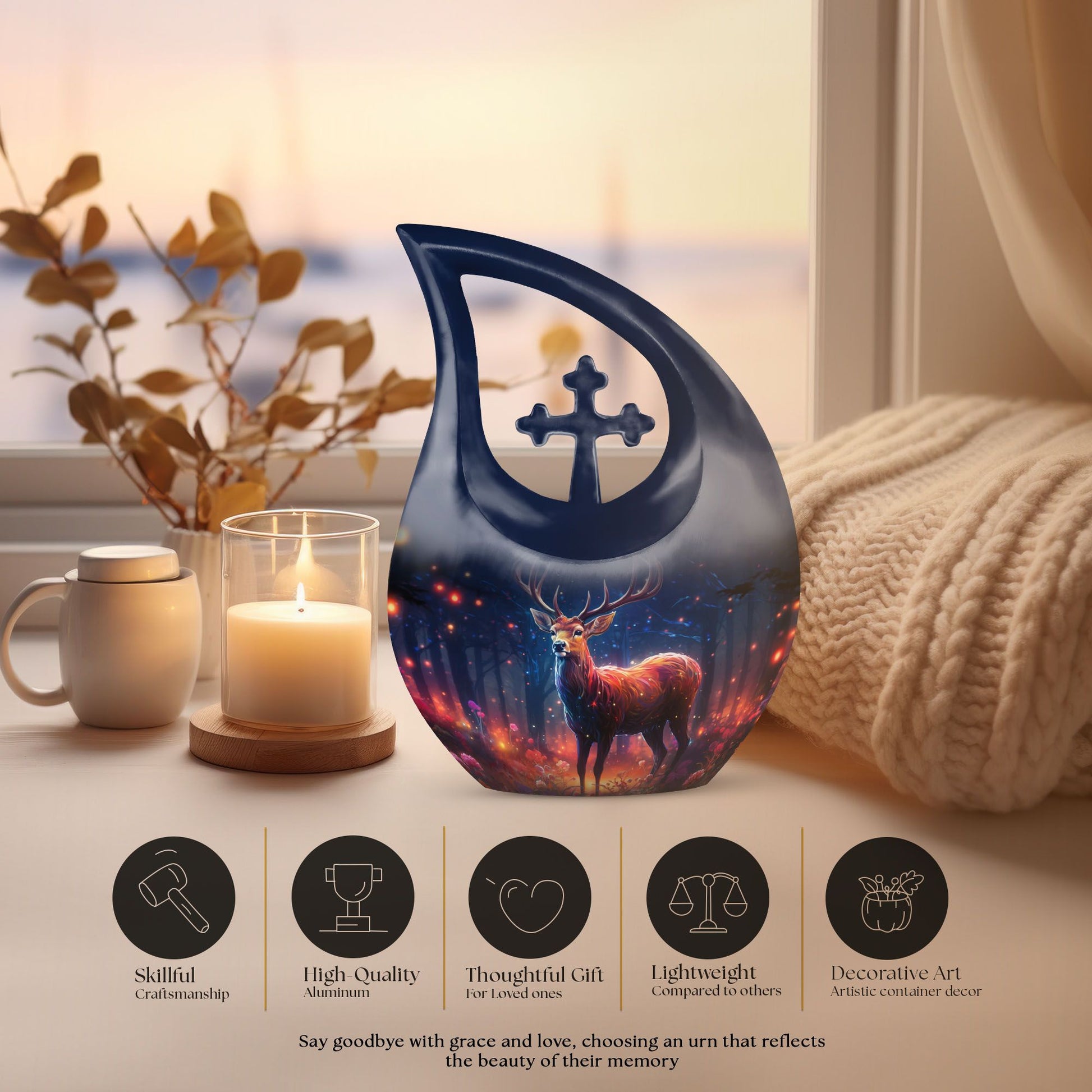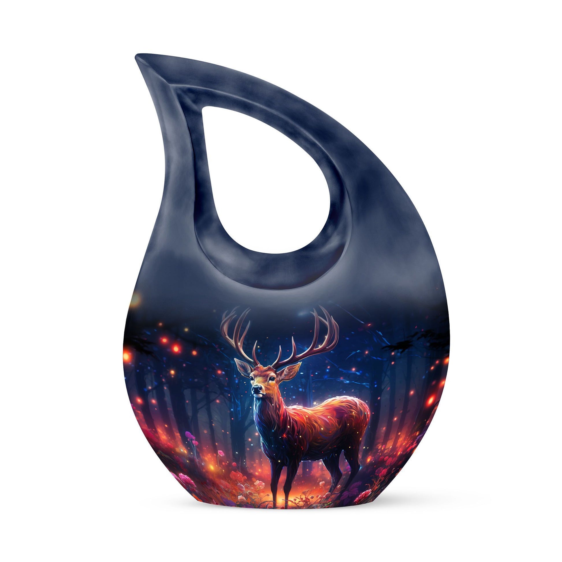 Experience a unique way of paying remembrance to your departed loved ones with our exclusive 10-inch Deer Urn. Delicately crafted from prime aluminium, this urn features a noble 'Cross Drop' design neatly complemented by a serene Deer theme. The urn offers an ample capacity of 200 cubic inches, making it suitable to preserve the ashes of adults and seniors alike. Weighing a solid 3.3 pounds and standing proudly at a height of 10 inches, this marble urn is designed for durability, offering a long-lasting memorial to your cherished one. For added convenience, each purchase comes with a plush velvet pouch, offering safe containment for the cremains. As a distinguished choice among cremation box for ashes, personalize your Deer Urn with engraved names, making it a heartfelt repository for your loved one's ashes keepsakes. This product emerges as a profound choice in 'Urns for Women's Ashes', reflecting the refined selection in 'Marble Urns For Sale'.