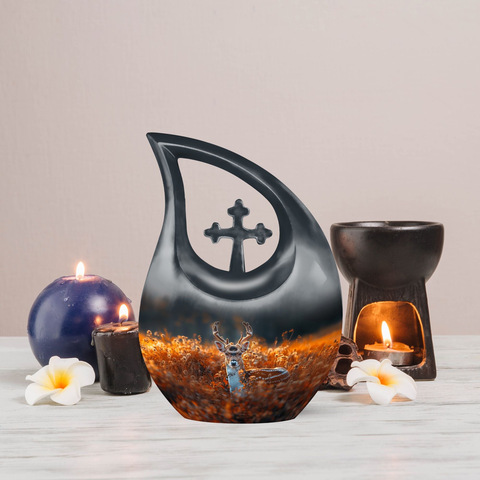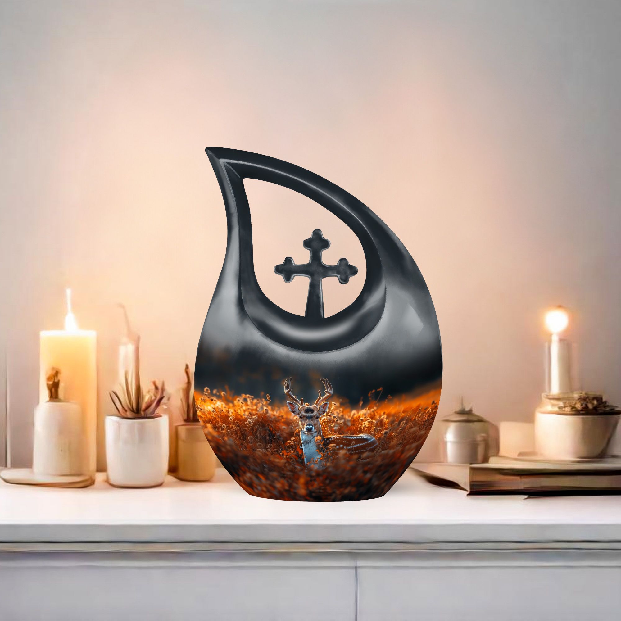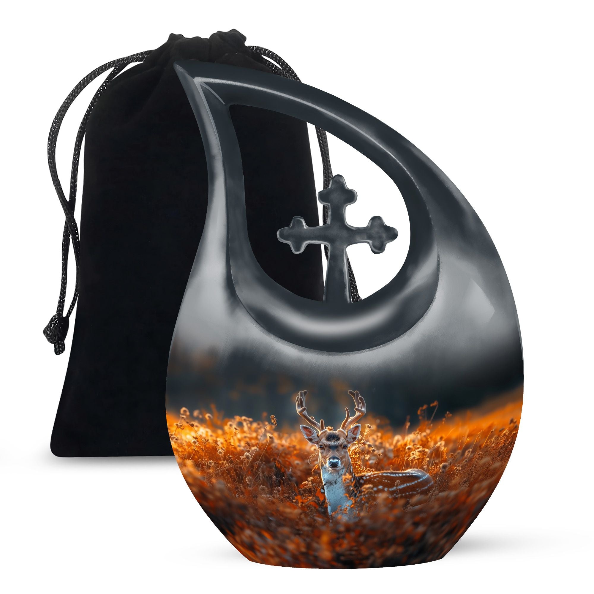 Honor the memory of your loved ones with this Deer Urn, intricately crafted to serve as a serene and majestic resting place. Meticulously constructed from high-quality Aluminium, this 10-inch Large Urn is not only durable but also has a capacity of 200 cubic inches, making it ideal for housing the ashes. Weighing a mere 3.3 pounds, this Cremation Urn is portable and easy to manage. Its detailed Cross Drop theme resonates with the noble spirit of a Deer, exuding tranquility and respect. The urn also includes a velvety pouch, providing a secure containment for the ashes. Furthermore, we offer the choice to make it more personal by allowing you to engrave names on it. Perfectly suitable for Burial, this Urn for Ashes is not only an affordable choice but also adds a touch of class to memorial ceremonies. This subtly elegant Deer Urn embodies a timeless tribute to your dearly departed.