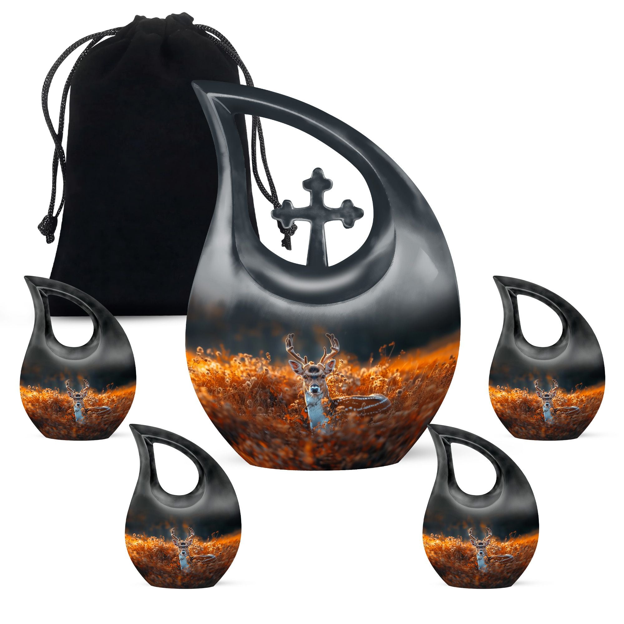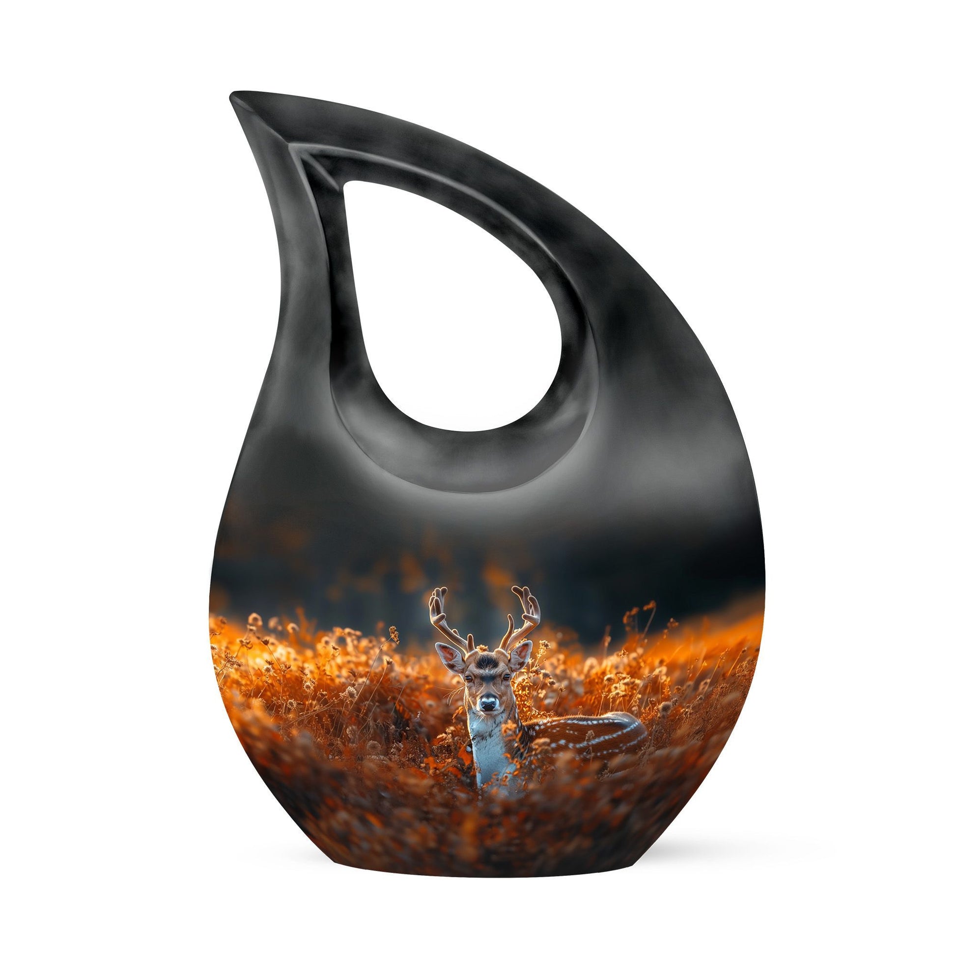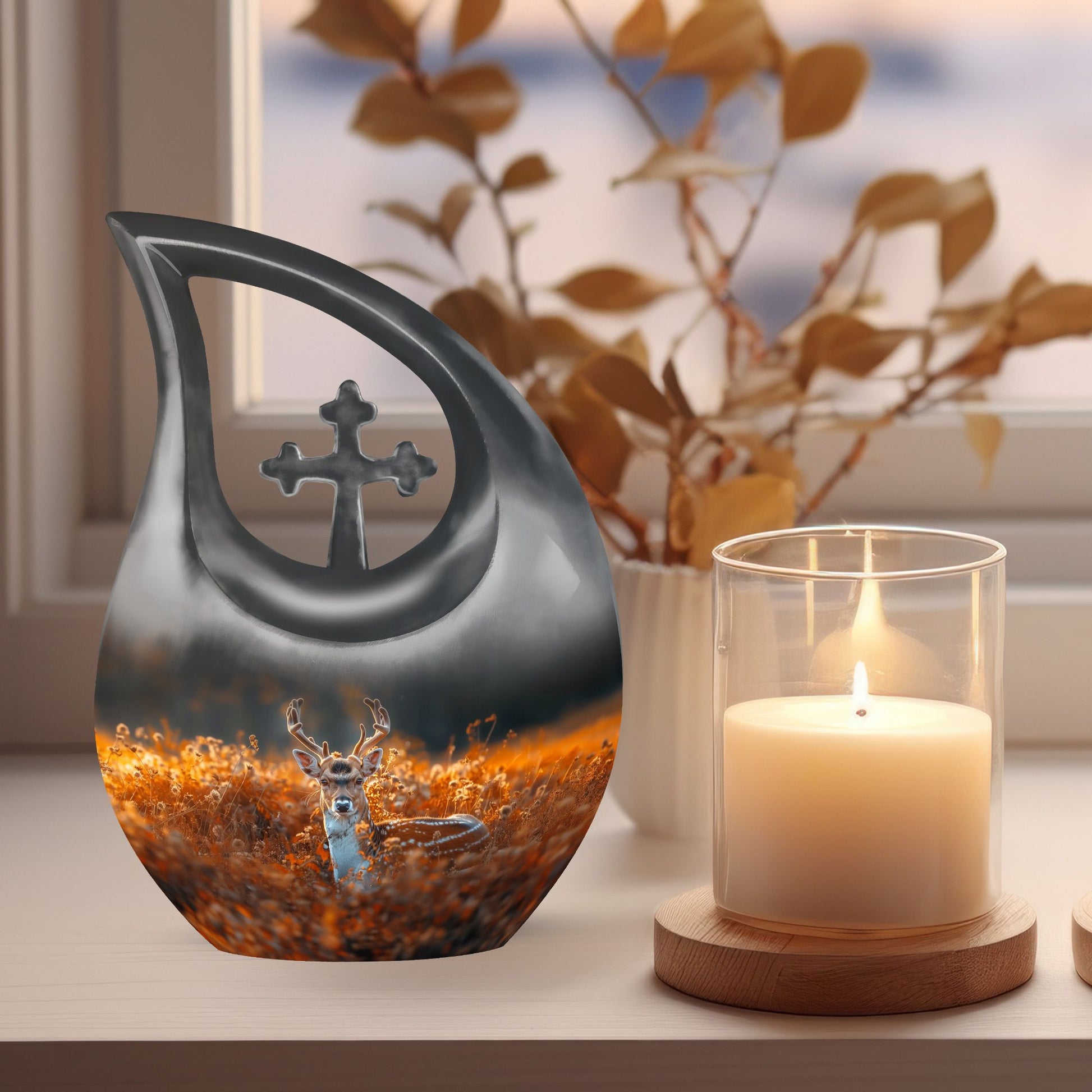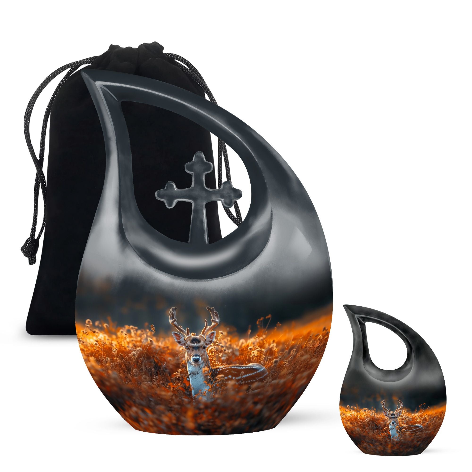 Honor the memory of your loved ones with this Deer Urn, intricately crafted to serve as a serene and majestic resting place. Meticulously constructed from high-quality Aluminium, this 10-inch Large Urn is not only durable but also has a capacity of 200 cubic inches, making it ideal for housing the ashes. Weighing a mere 3.3 pounds, this Cremation Urn is portable and easy to manage. Its detailed Cross Drop theme resonates with the noble spirit of a Deer, exuding tranquility and respect. The urn also includes a velvety pouch, providing a secure containment for the ashes. Furthermore, we offer the choice to make it more personal by allowing you to engrave names on it. Perfectly suitable for Burial, this Urn for Ashes is not only an affordable choice but also adds a touch of class to memorial ceremonies. This subtly elegant Deer Urn embodies a timeless tribute to your dearly departed.