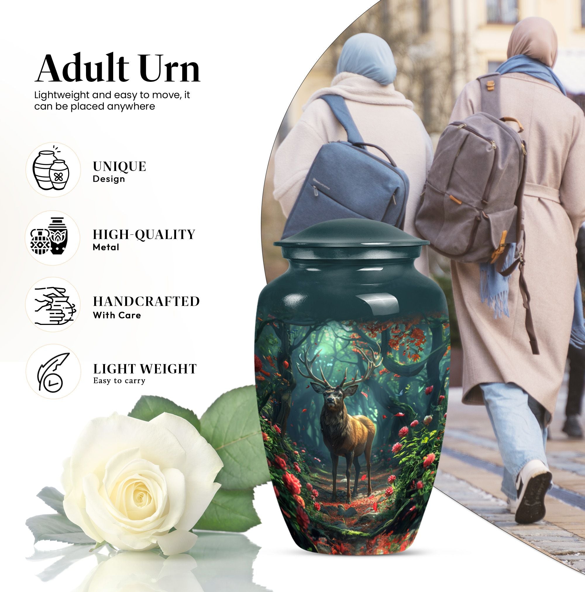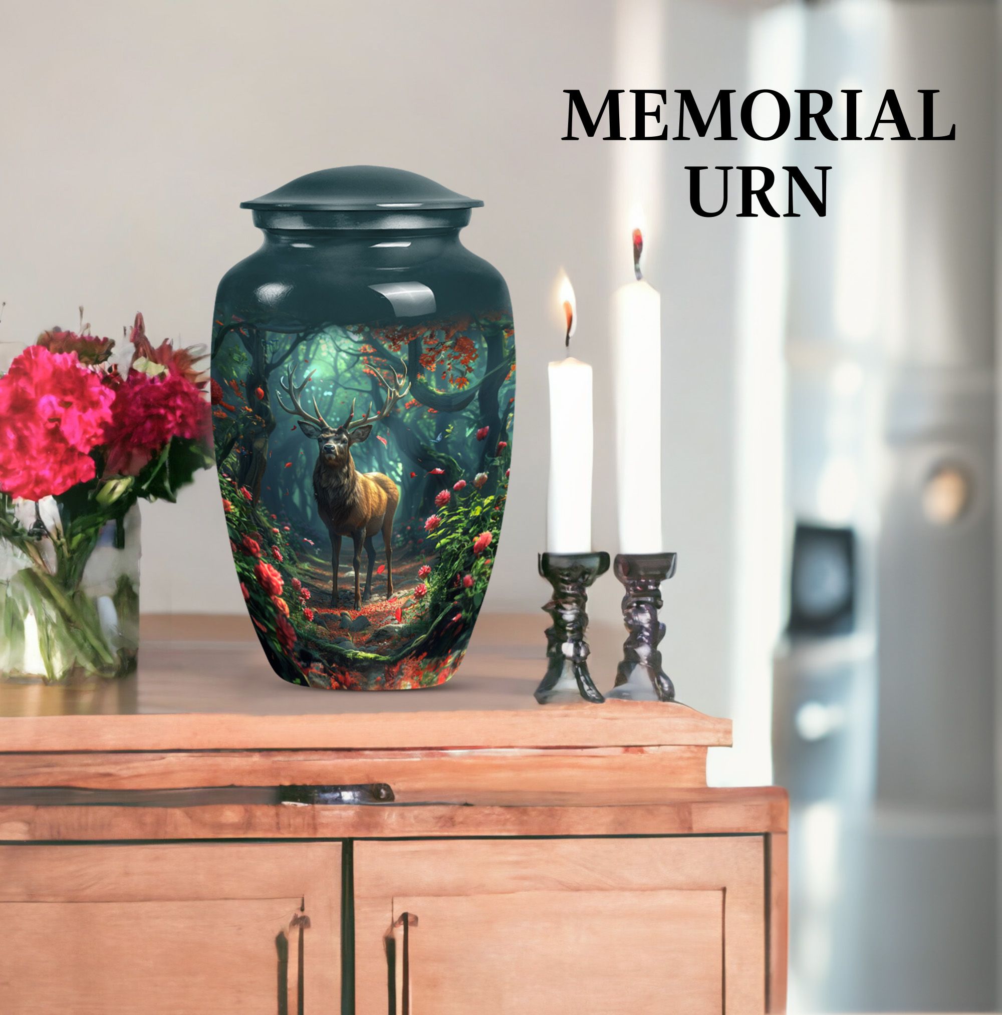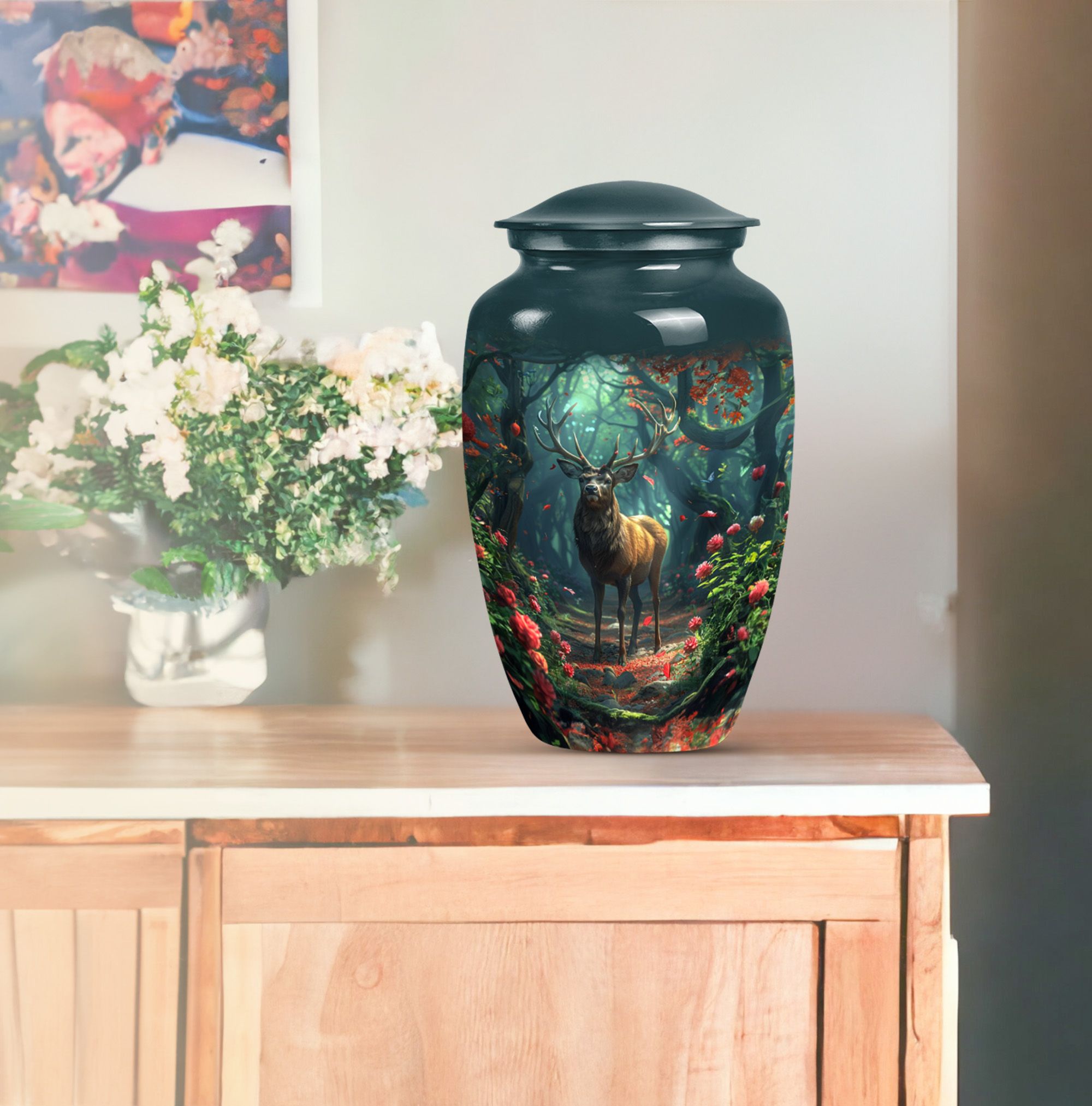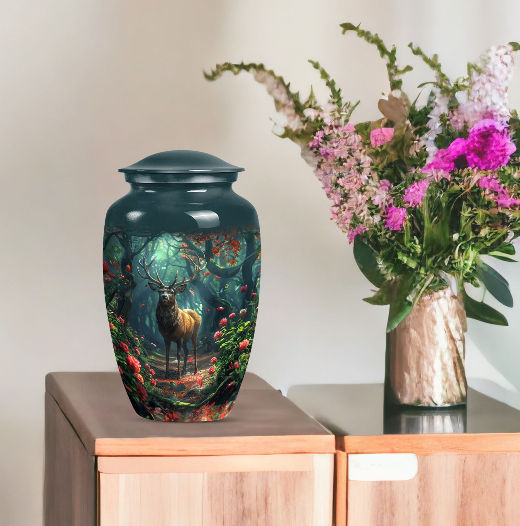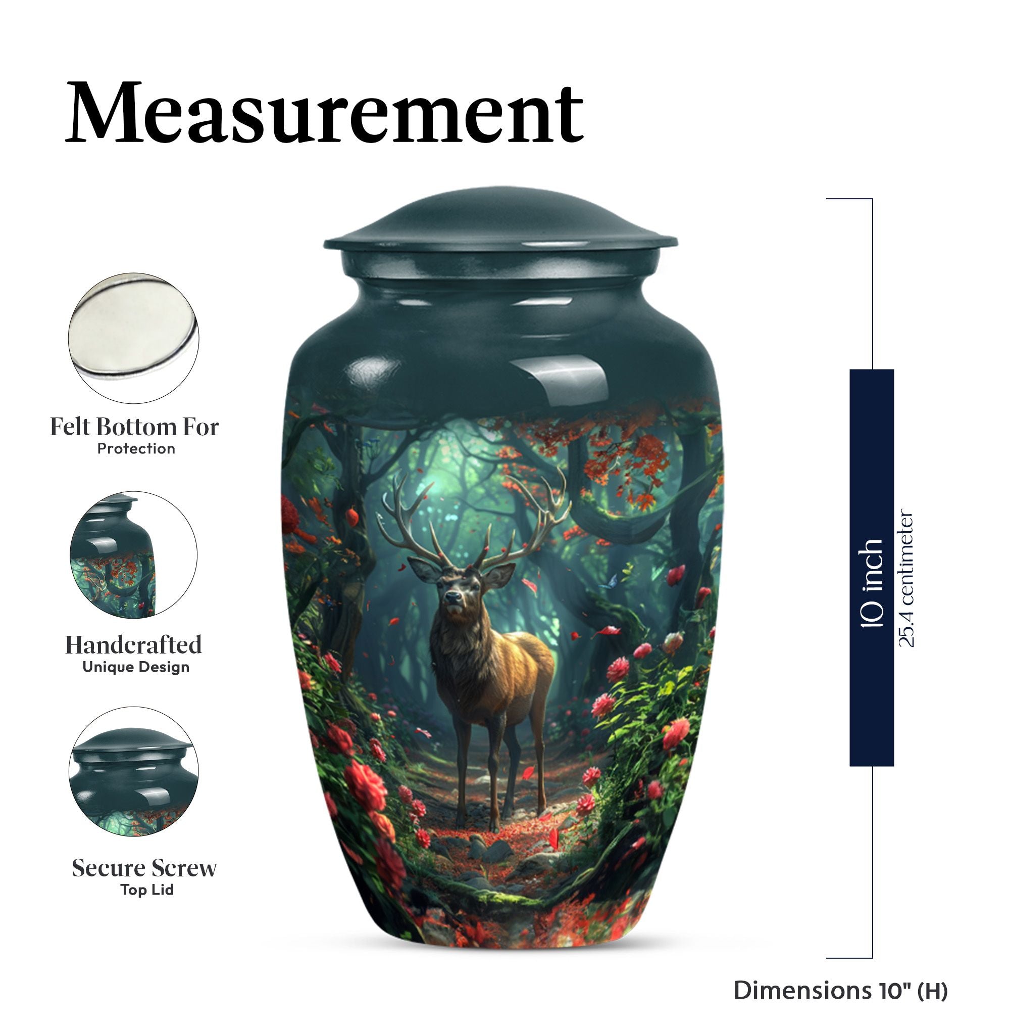 Cherish the memories of your loved ones with our beautiful and meticulously designed Deer Urn. With a capacity of 200 cubic inches, this 10-inch funeral burial urn is perfect to honor and remember your dear departed. Made from high-quality Aluminium, it features a traditional and symbolic Gramophone theme, representing a connection to the past we so dearly hold onto. Weighing at just 3.3 pounds, this large urn for human ashes is substantial enough to feel its presence. It accommodates customization, allowing you to personalize it with engraved names, adding another layer of unique significance. The cremation urn comes with a velvet pouch for a dignified containment of ashes, ensuring your loved one's remains a part of your life in a subtle, respectful way. Remember, this isn't just an urn; it's a token of love, a testament of lifetime memories. Acquire this memorial large urn as a humble dedication of serenity, respect, and everlasting love.