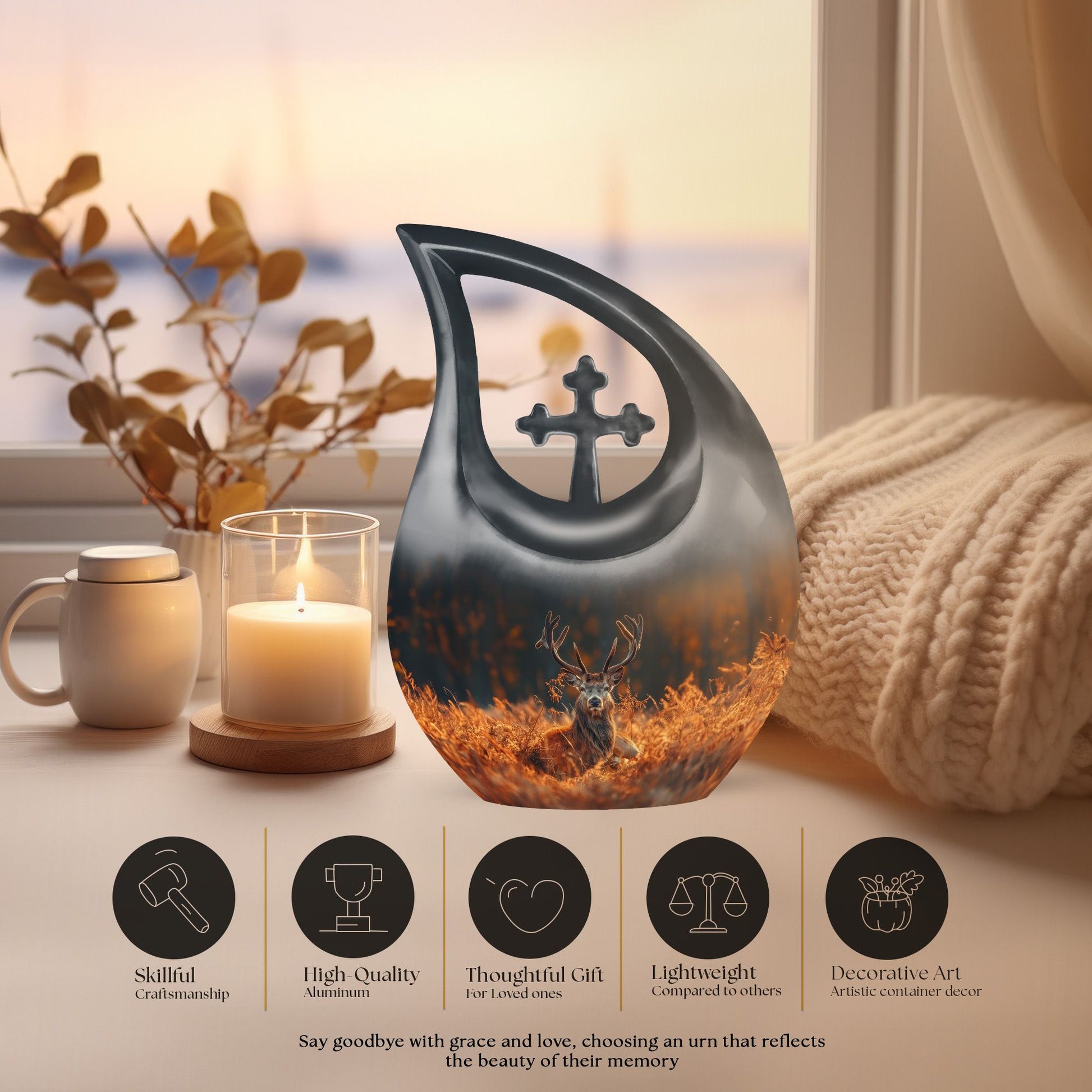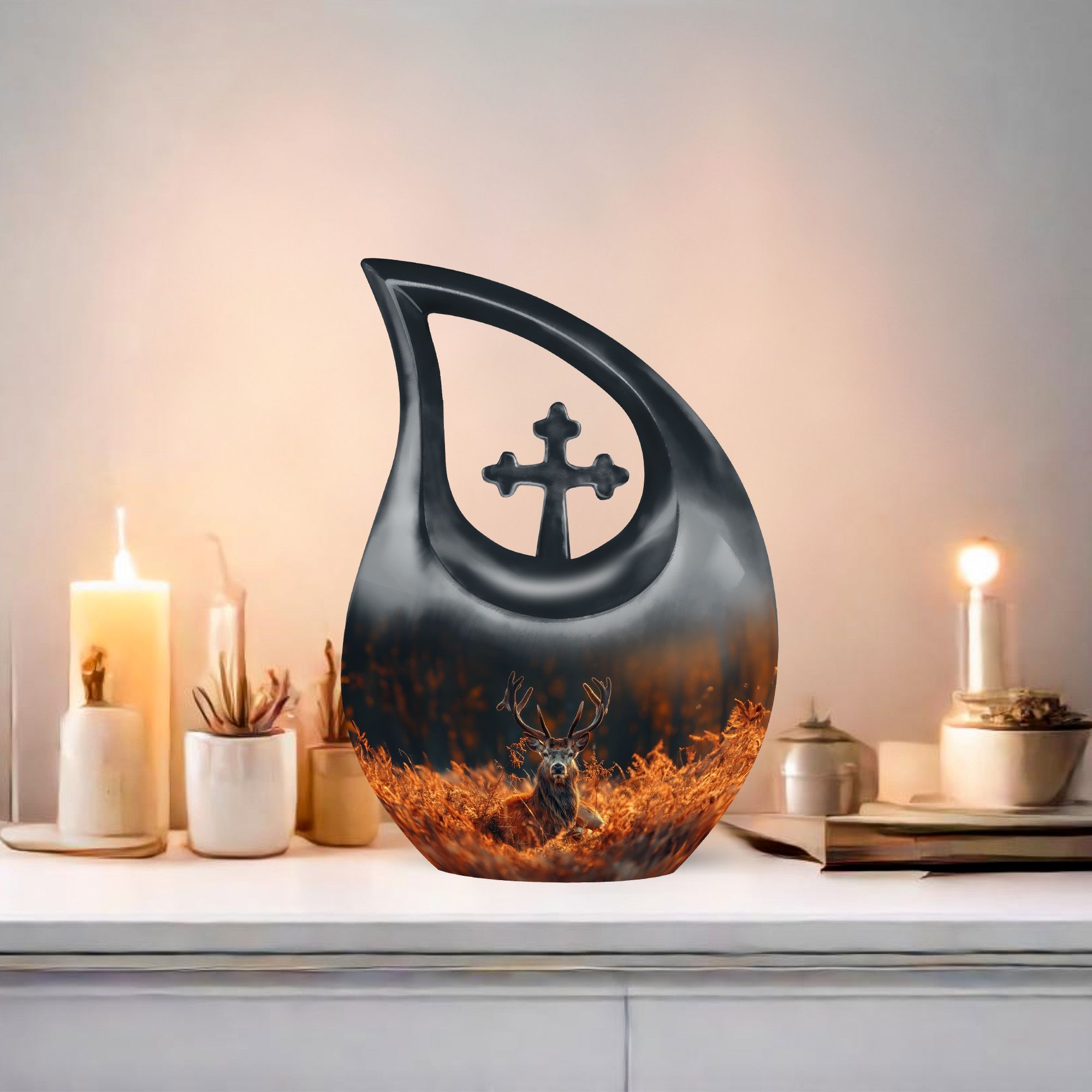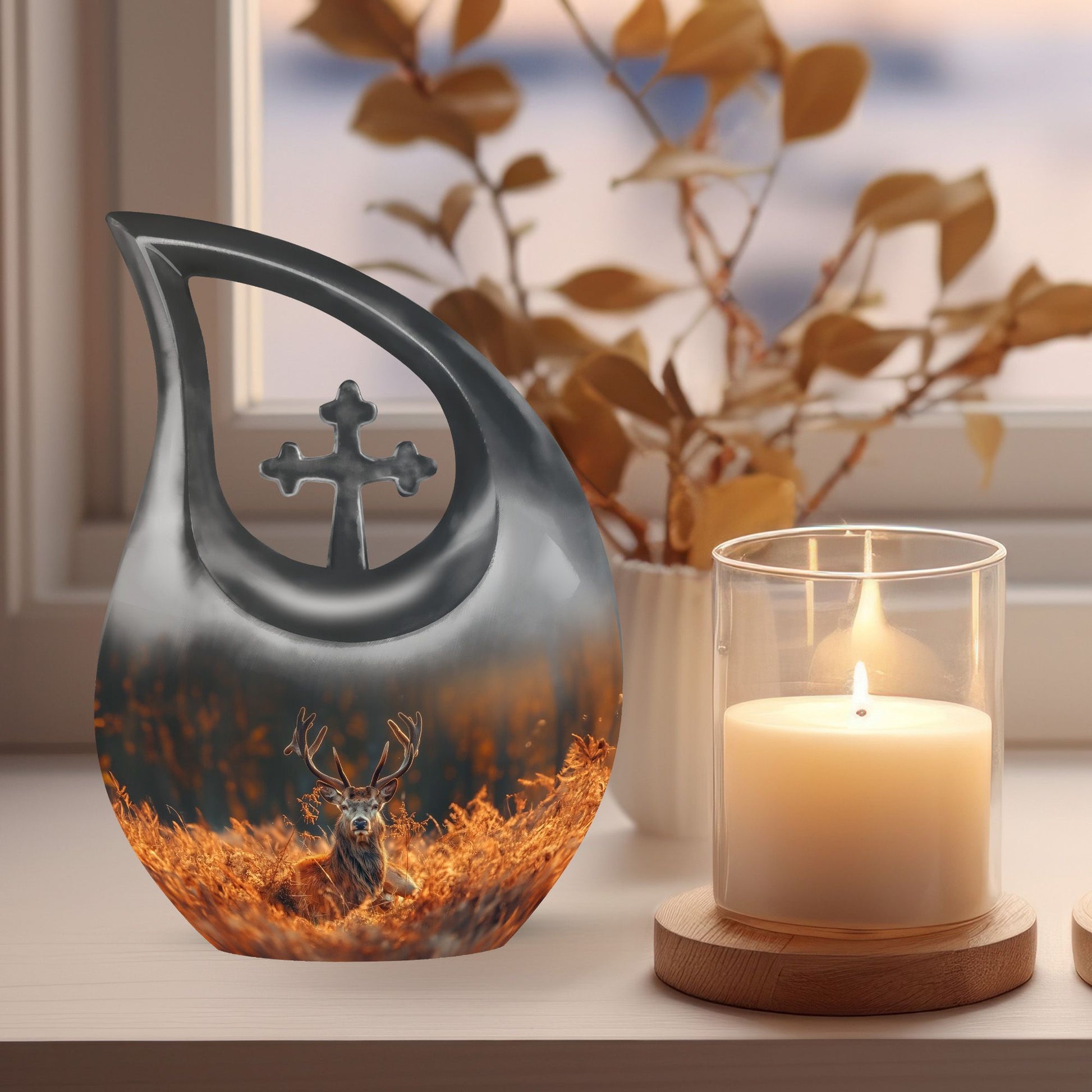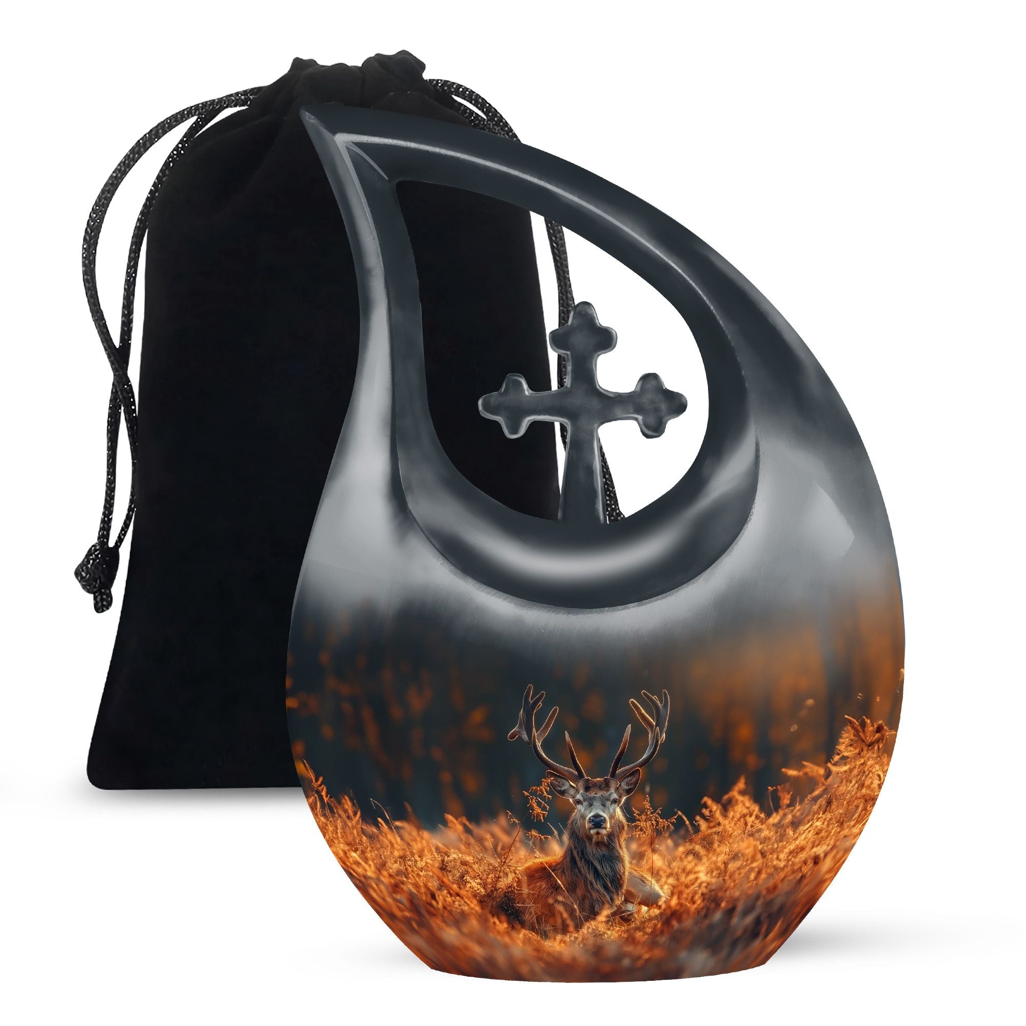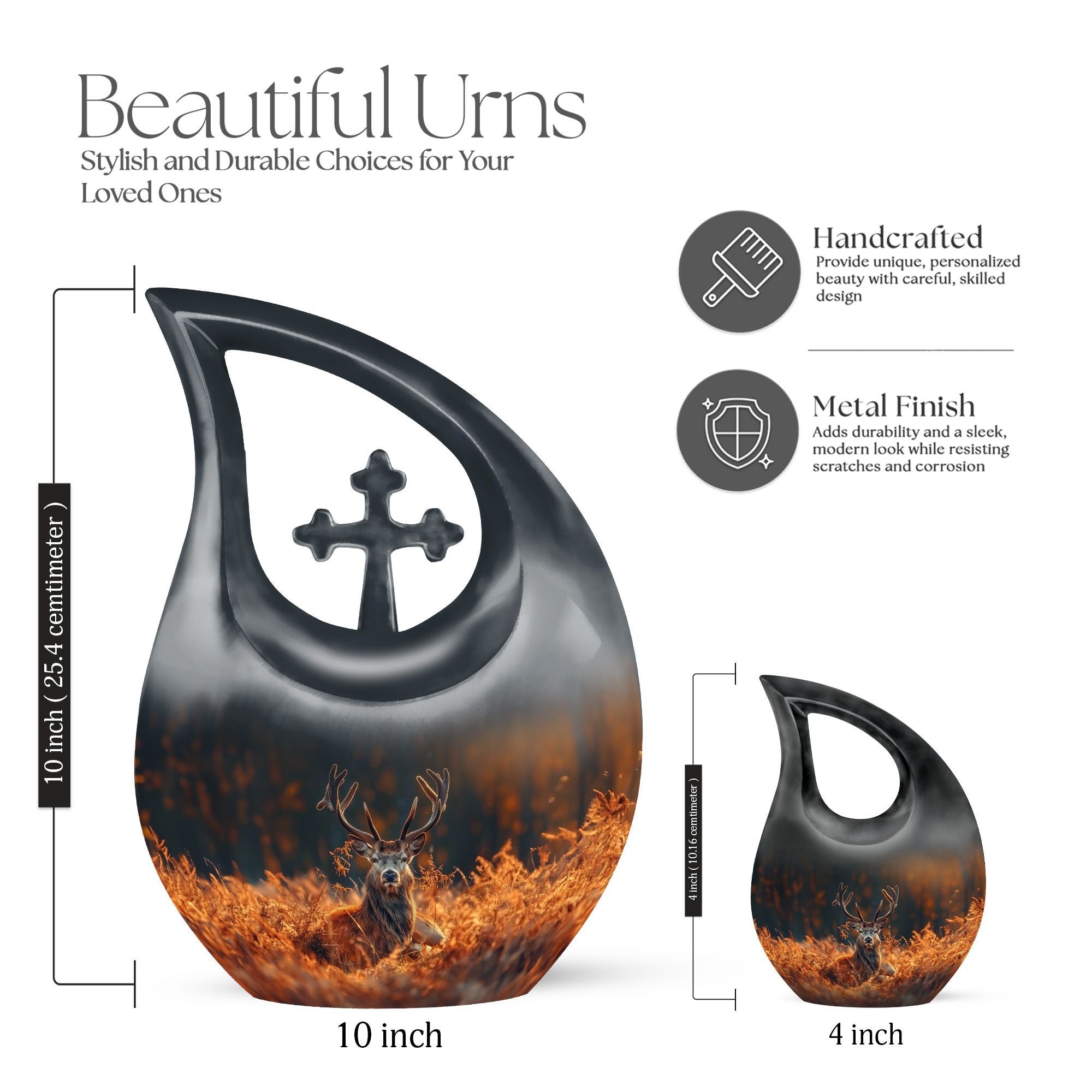 Celebrate the memory of your beloved with our uniquely themed 'Deer Urn.' As a beautiful testament to a life well-lived, these 'Urns For Human Ashes' evoke a sense of honor and reverence, perfect for any home or memorial ceremony. Measuring 10 inches in height, this 'Cross Drop' designed Urn can seamlessly store around 200 cubic inches of ashes. Crafted from robust Aluminium, the Urn weighs a comfortable 3.3 pounds and comes with a soft velvet pouch for secure containment. We also offer the option to personalize these 'Large Urns' with engraved names, adding an extra level of sentiment and respect to your memorial. Besides 'Deer Urn', explore our range of 'Pink Urns For Human Ashes', 'Urn For Mom', 'Butterfly Urns For Ashes', and 'Angel Urn' to find the one that best honors your precious memories.