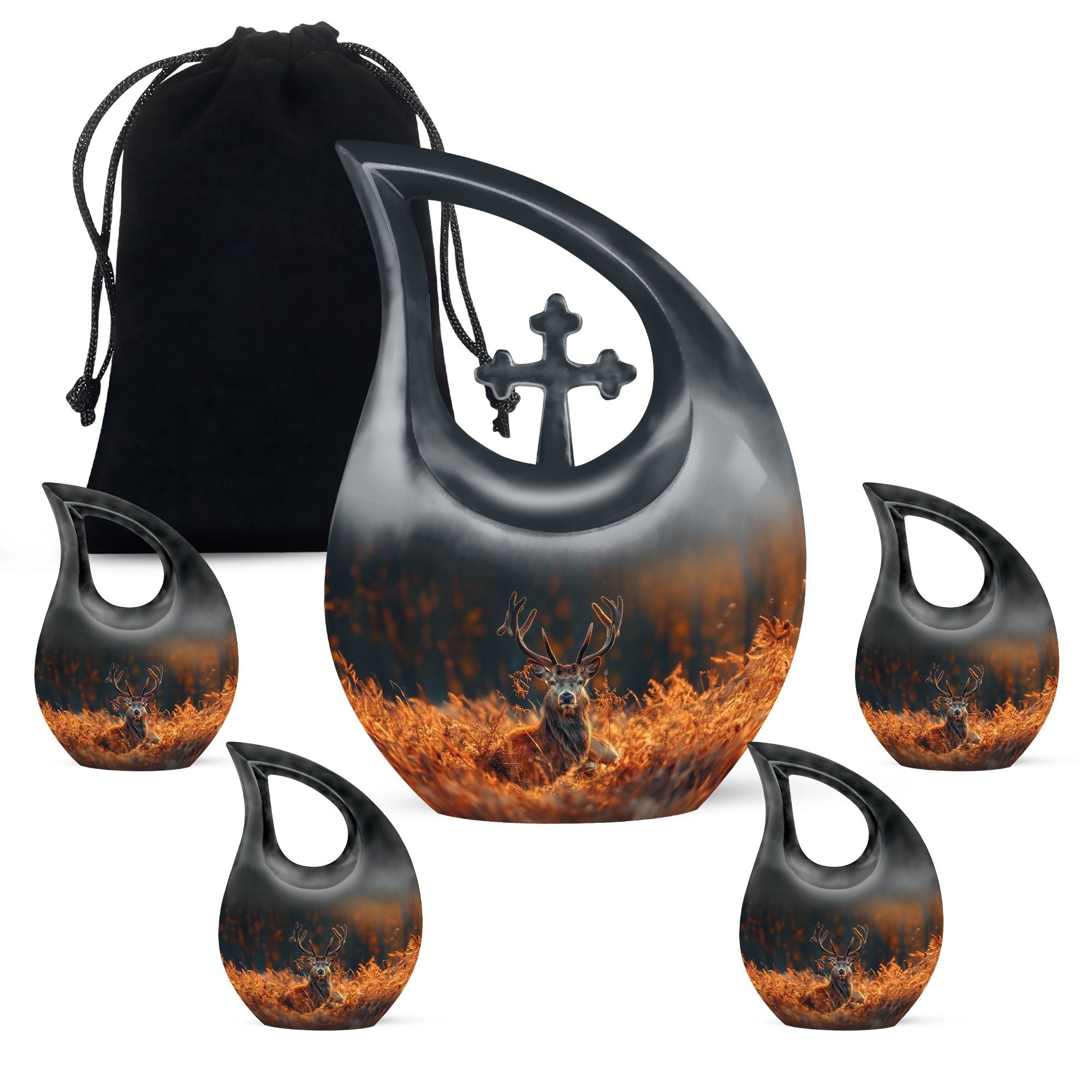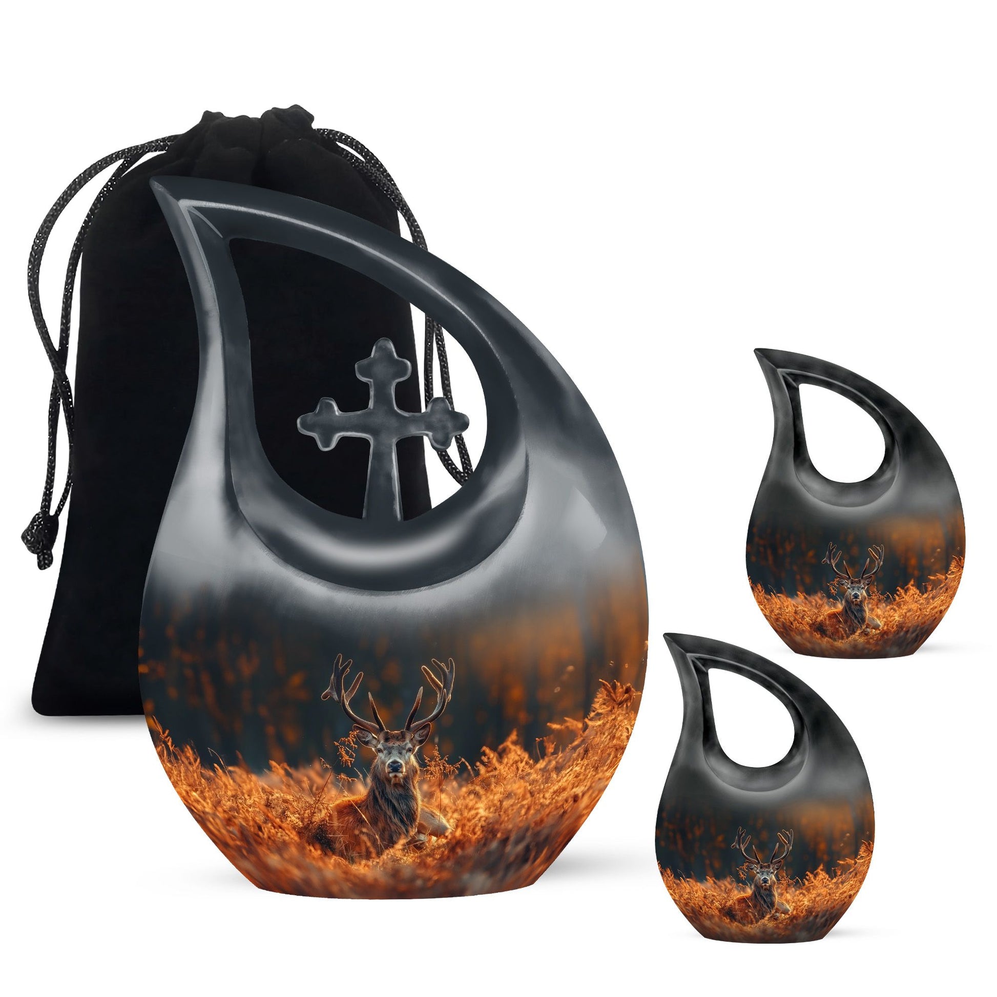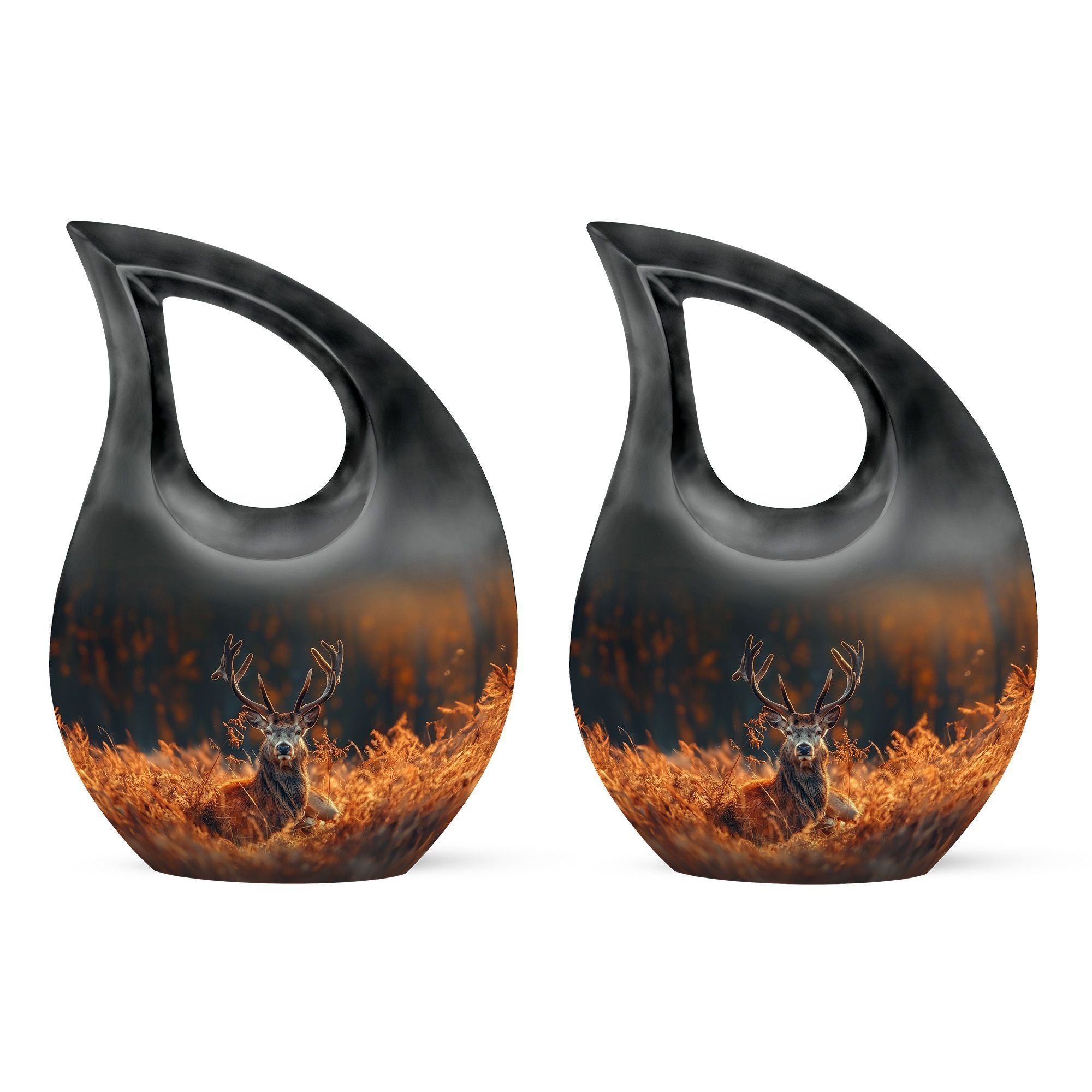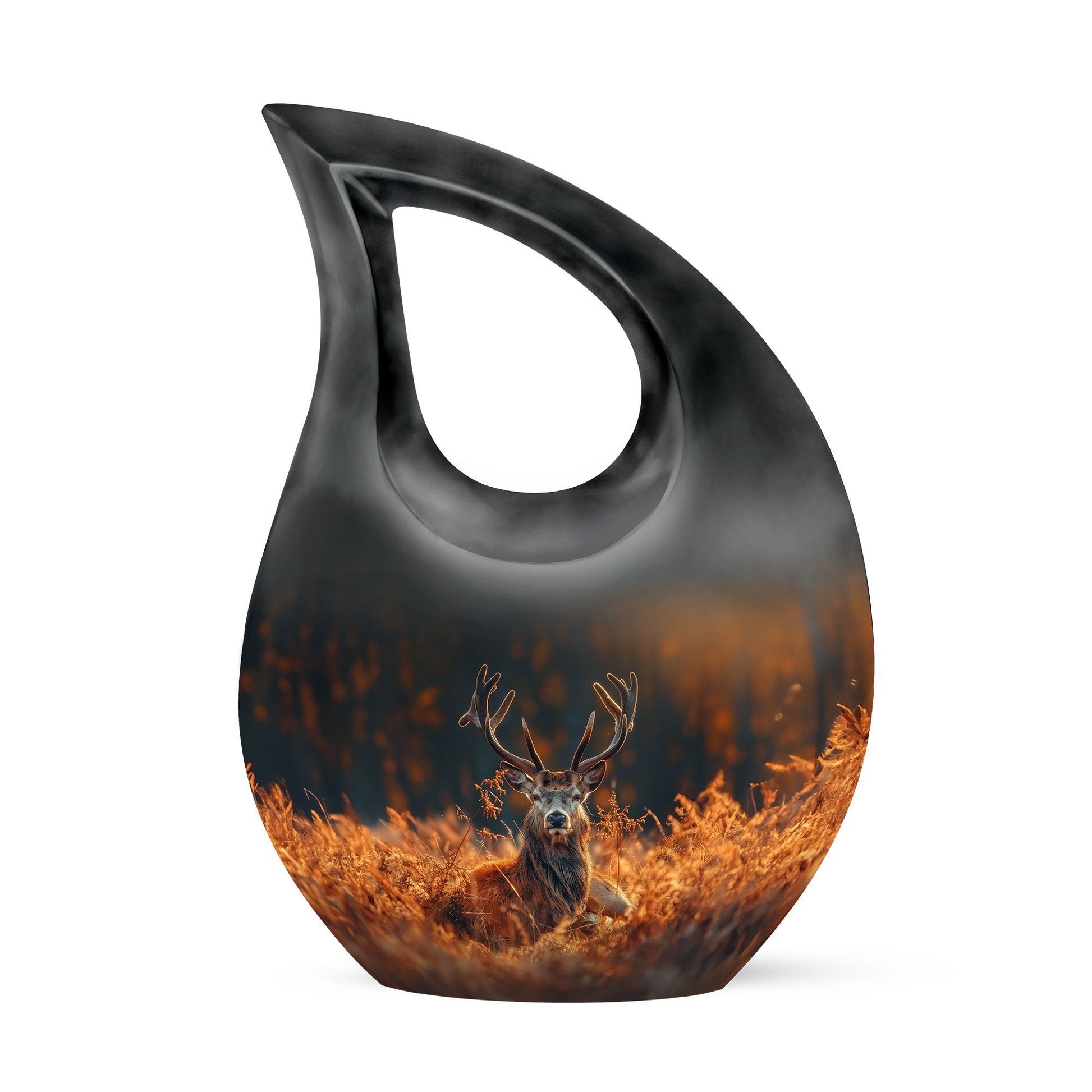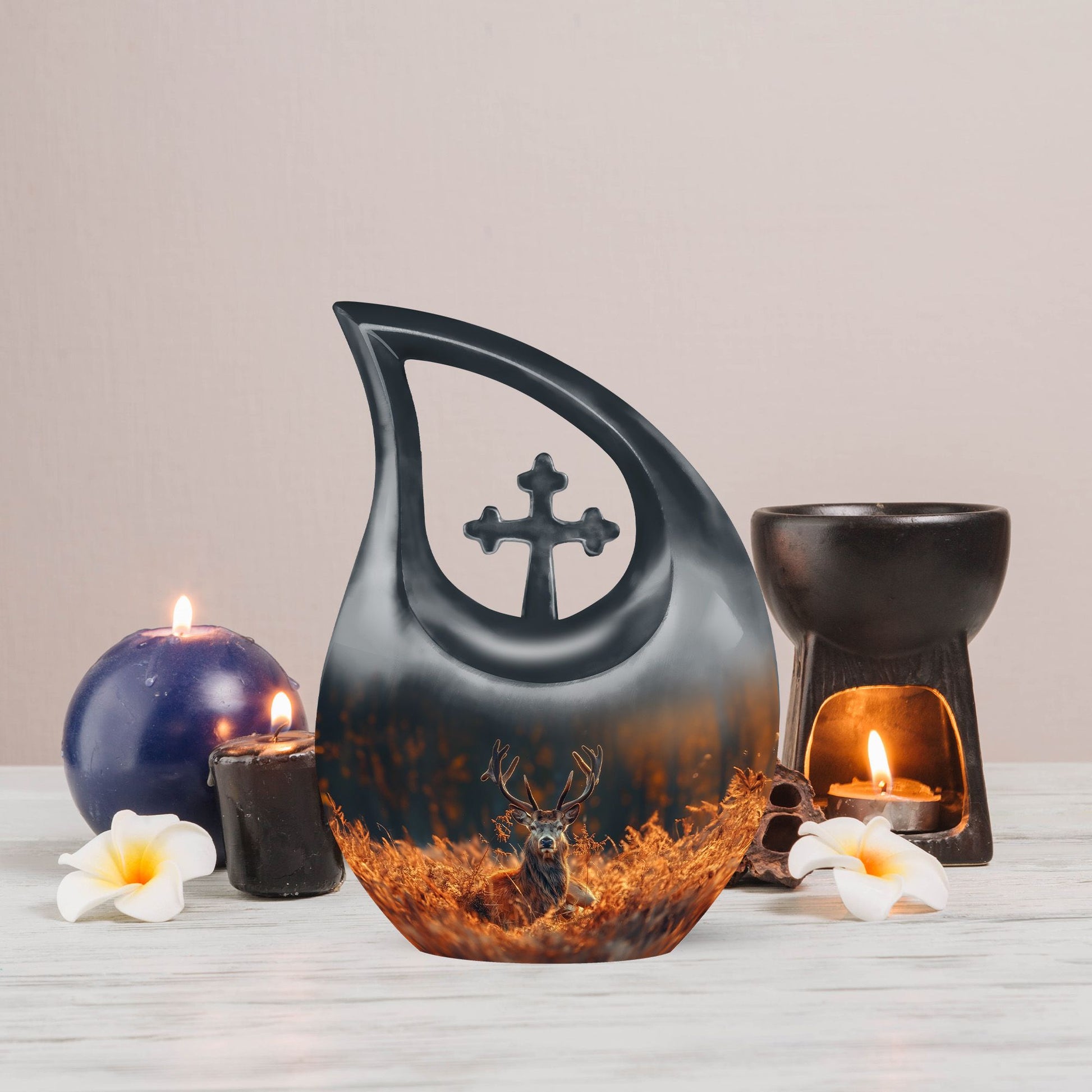 Celebrate the memory of your beloved with our uniquely themed 'Deer Urn.' As a beautiful testament to a life well-lived, these 'Urns For Human Ashes' evoke a sense of honor and reverence, perfect for any home or memorial ceremony. Measuring 10 inches in height, this 'Cross Drop' designed Urn can seamlessly store around 200 cubic inches of ashes. Crafted from robust Aluminium, the Urn weighs a comfortable 3.3 pounds and comes with a soft velvet pouch for secure containment. We also offer the option to personalize these 'Large Urns' with engraved names, adding an extra level of sentiment and respect to your memorial. Besides 'Deer Urn', explore our range of 'Pink Urns For Human Ashes', 'Urn For Mom', 'Butterfly Urns For Ashes', and 'Angel Urn' to find the one that best honors your precious memories.