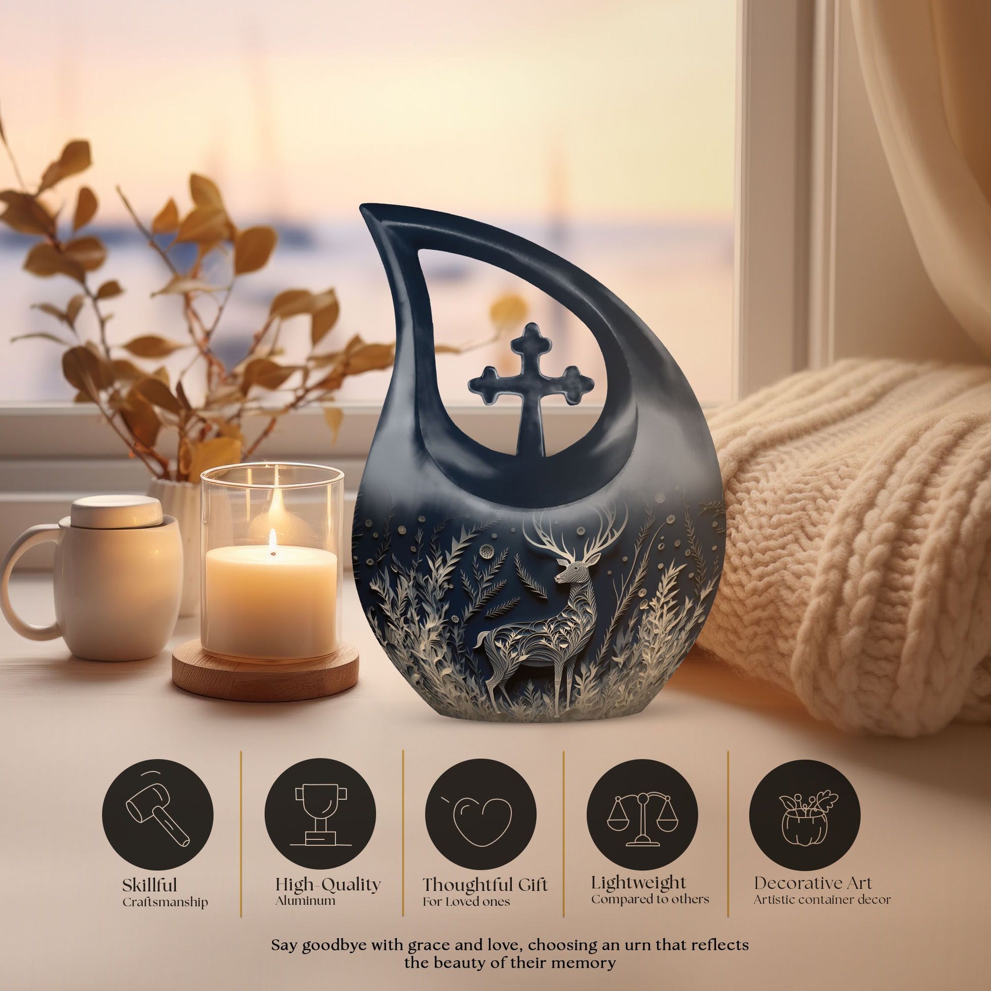 Crafted from premium metal, this urn for ashes adult male and urn for ashes adult female showcases exquisite artistry in a rich dark navy finish with a detailed deer motif. Its sleek silhouette and smooth texture make it an elegant centerpiece for home remembrance or ceremonial placement. The durable build ensures longevity, while the threaded lid provides a secure closure for cherished remains.