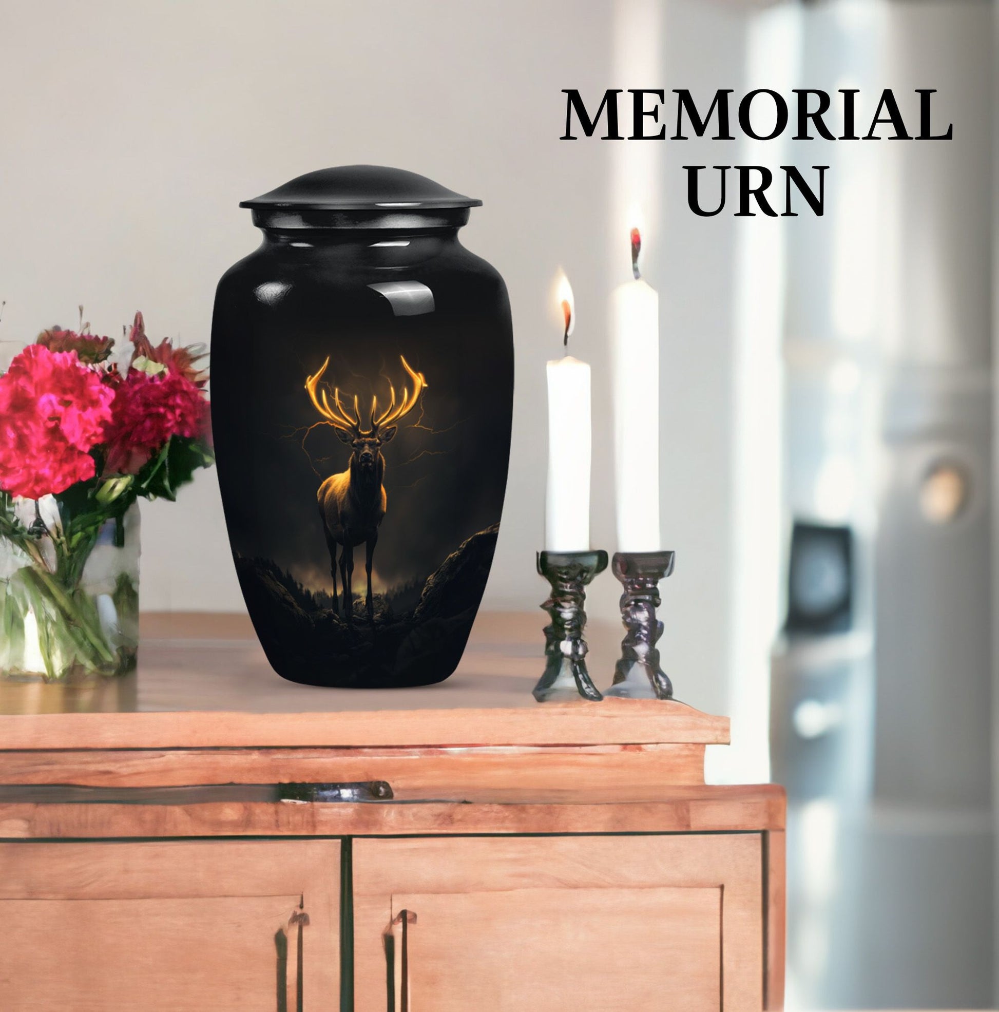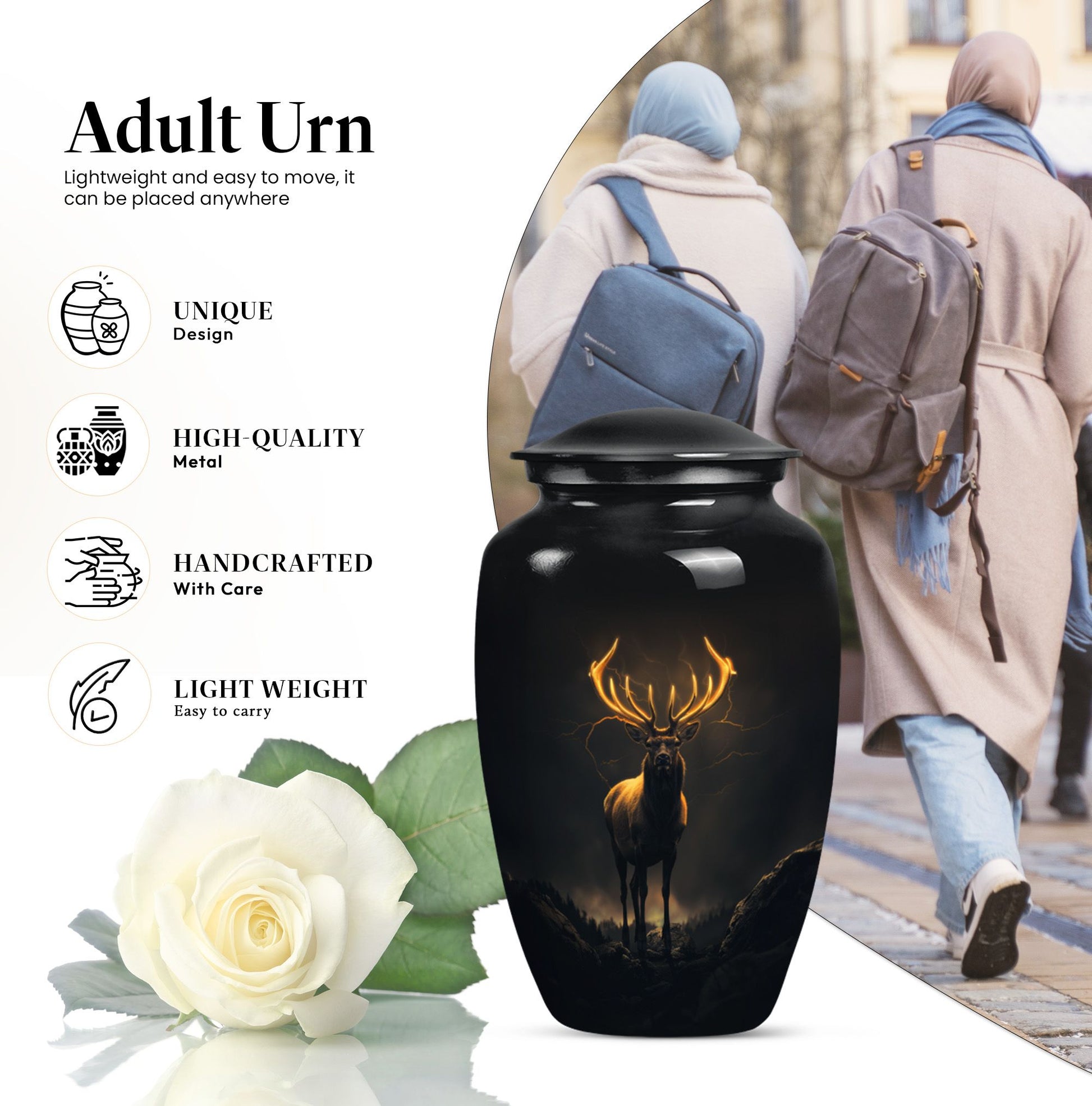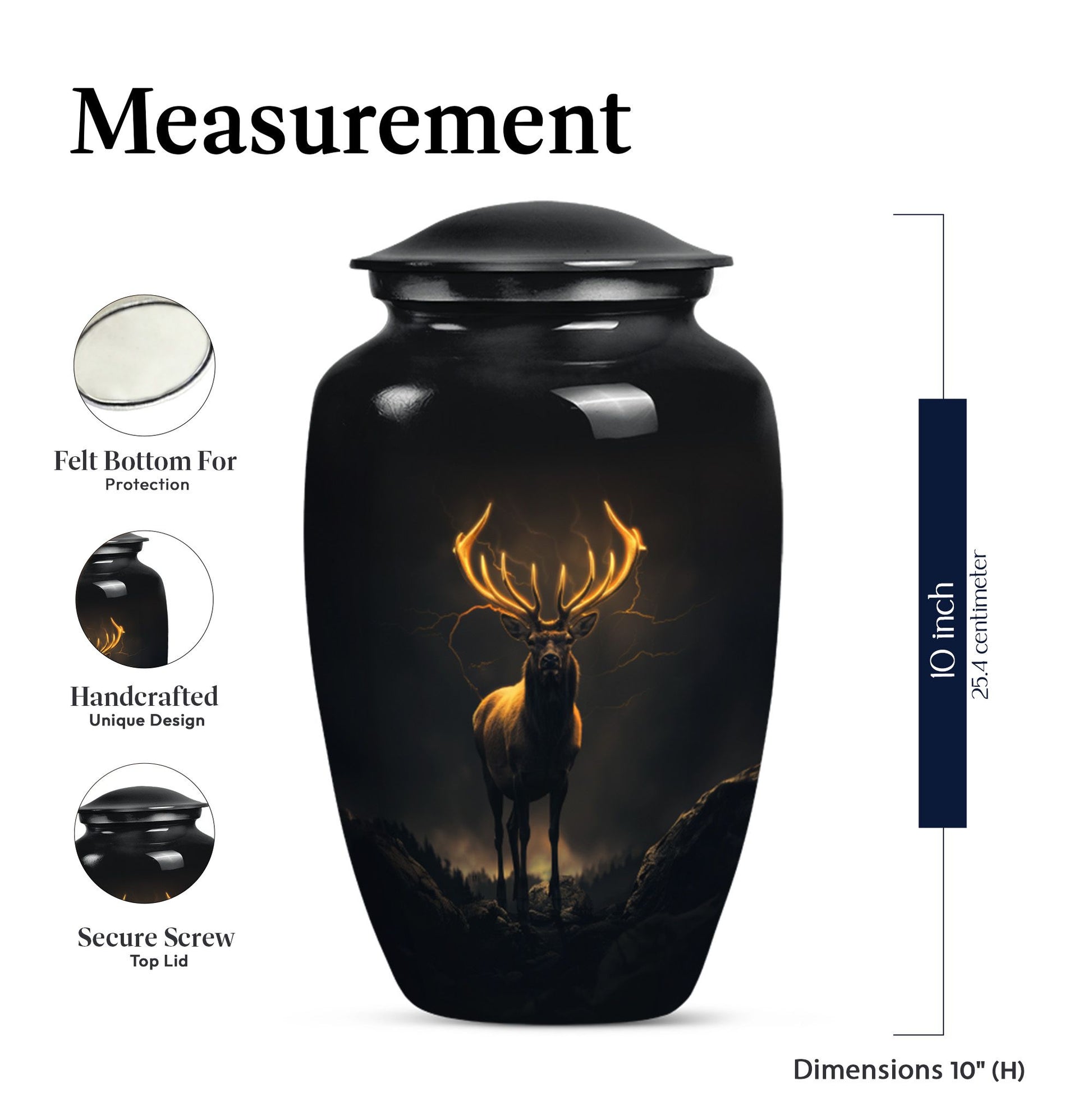 Embrace every memory with this enchanting gramophone-themed deer urn, a respectful and sentimental tribute to your loved one. Crafted from durable aluminium, this funeral urn is designed to hold the cremation ashes of an adult man, offering a capacity of 200 cubic inches. Its 10-inch stature and weight of 3.3 pounds ensure its prominence and stability in your memorial space. This large urn also provides a comforting touch with additional velvet pouch for an extra synthetic protective layer for the ashes. You can personalize it further by engraving names to make it truly unique and meaningful. Our cremation urn, synonymous with innovative modern urns, beautifully merges tradition and modernity. The high quality and graduation from standard metal urns for adult human ashes, make it a prime selection for those looking for unique urns for cremation ashes. Please note, design is considered a Classic Urn.
