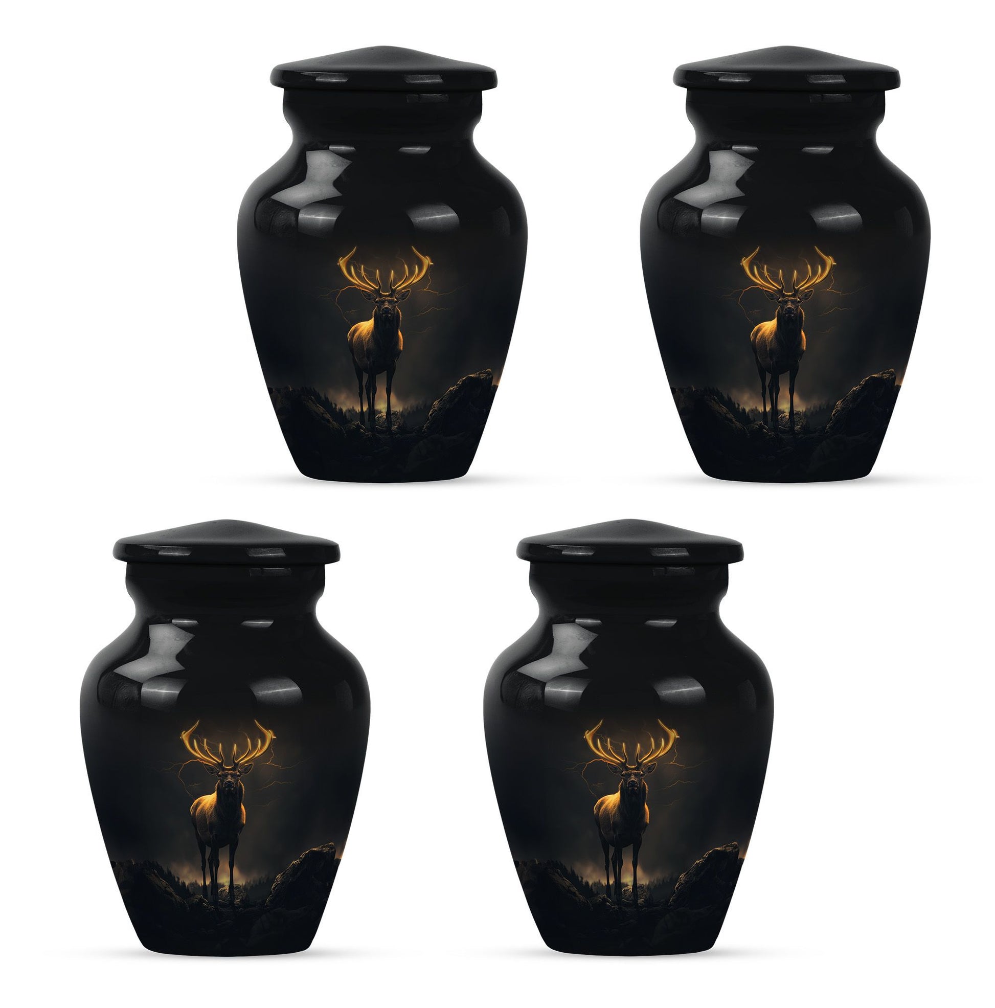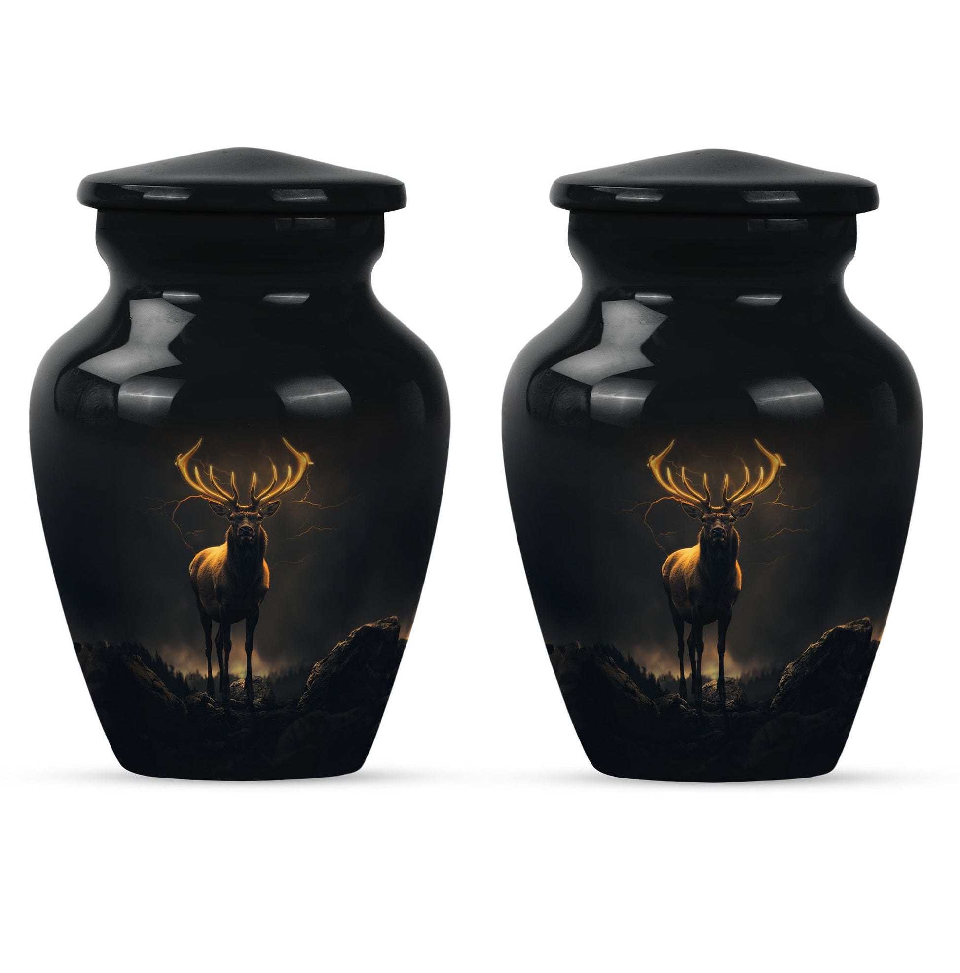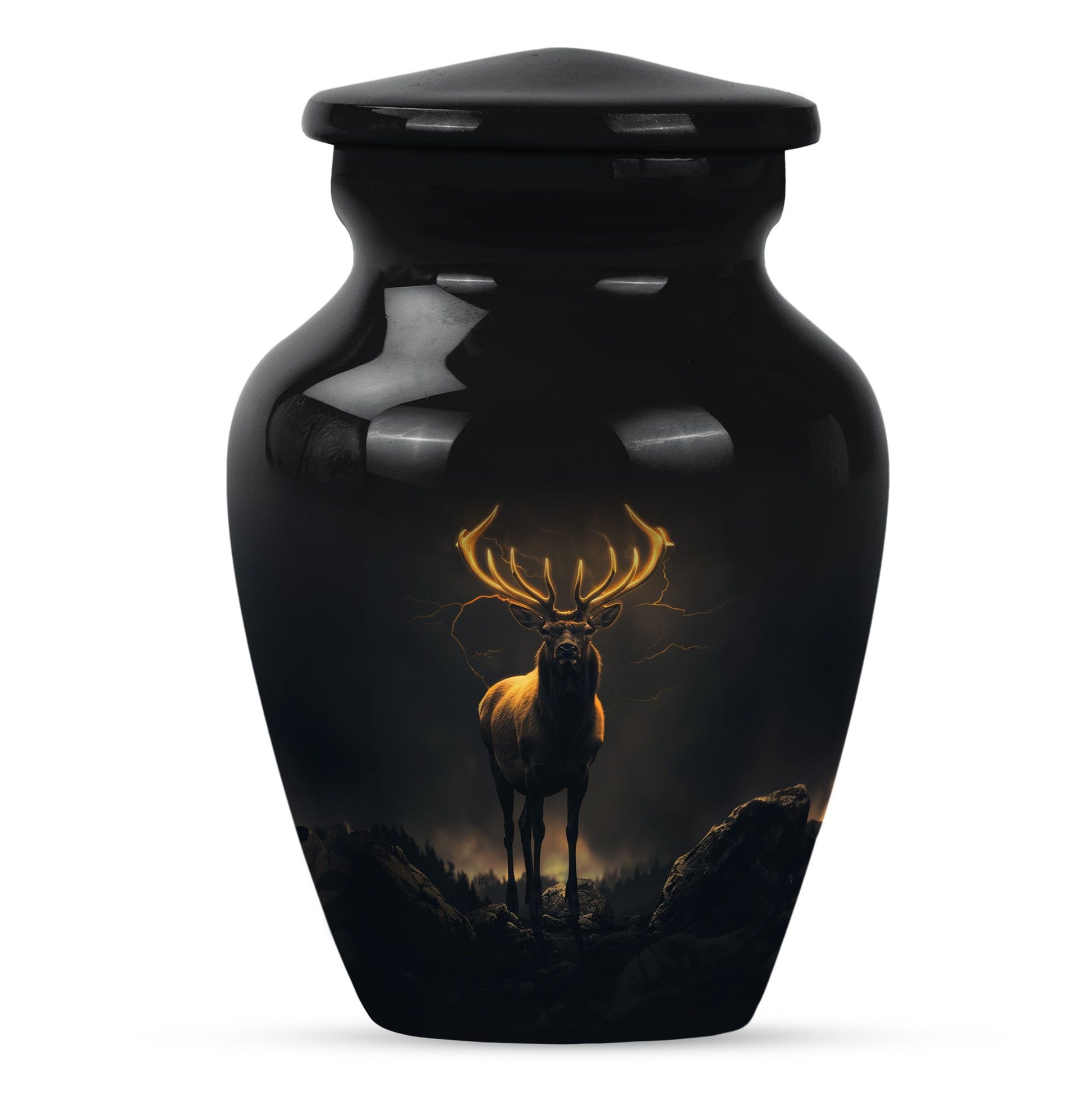 Embrace every memory with this enchanting gramophone-themed deer urn, a respectful and sentimental tribute to your loved one. Crafted from durable aluminium, this funeral urn is designed to hold the cremation ashes of an adult man, offering a capacity of 200 cubic inches. Its 10-inch stature and weight of 3.3 pounds ensure its prominence and stability in your memorial space. This large urn also provides a comforting touch with additional velvet pouch for an extra synthetic protective layer for the ashes. You can personalize it further by engraving names to make it truly unique and meaningful. Our cremation urn, synonymous with innovative modern urns, beautifully merges tradition and modernity. The high quality and graduation from standard metal urns for adult human ashes, make it a prime selection for those looking for unique urns for cremation ashes. Please note, design is considered a Classic Urn.